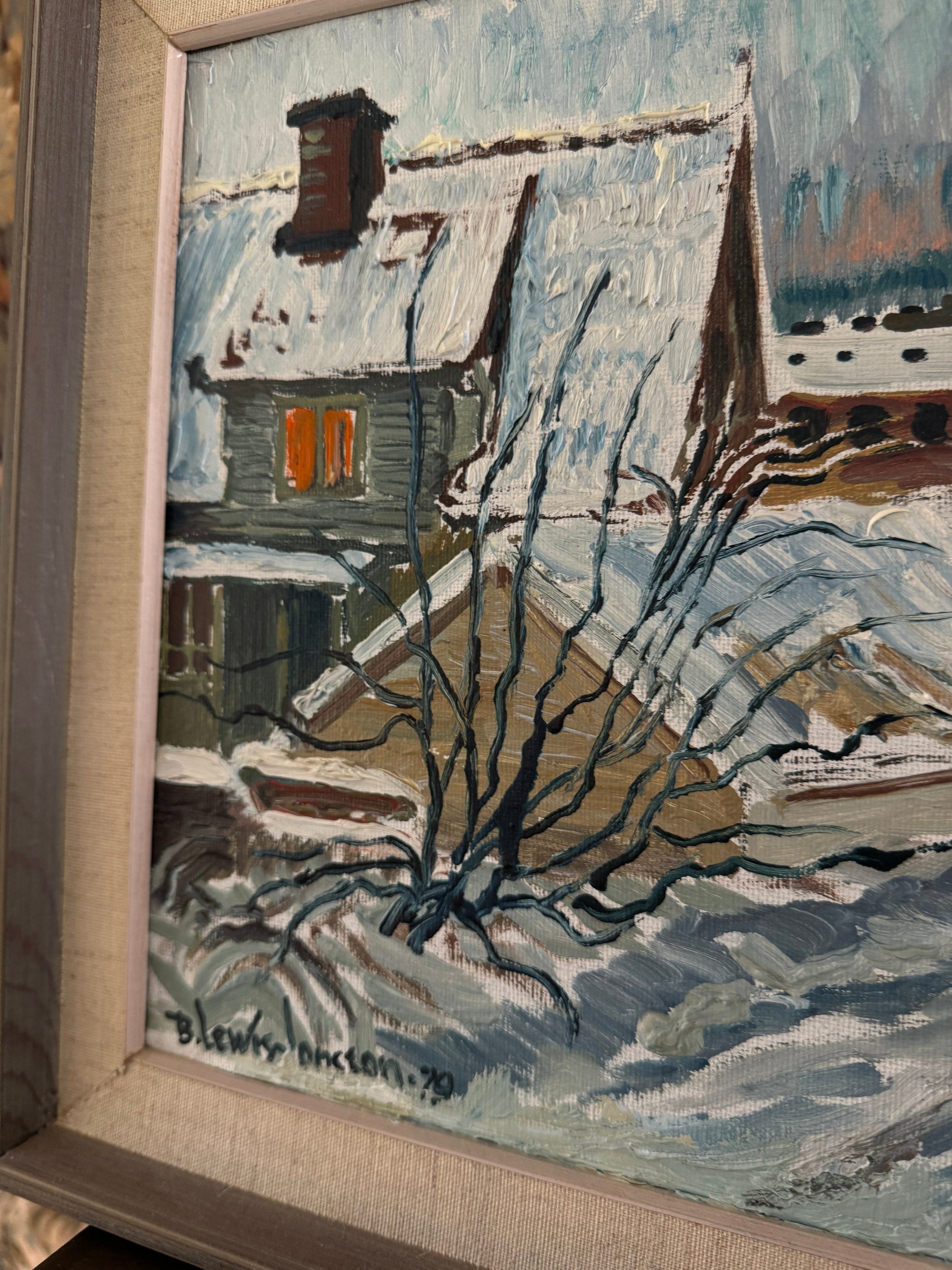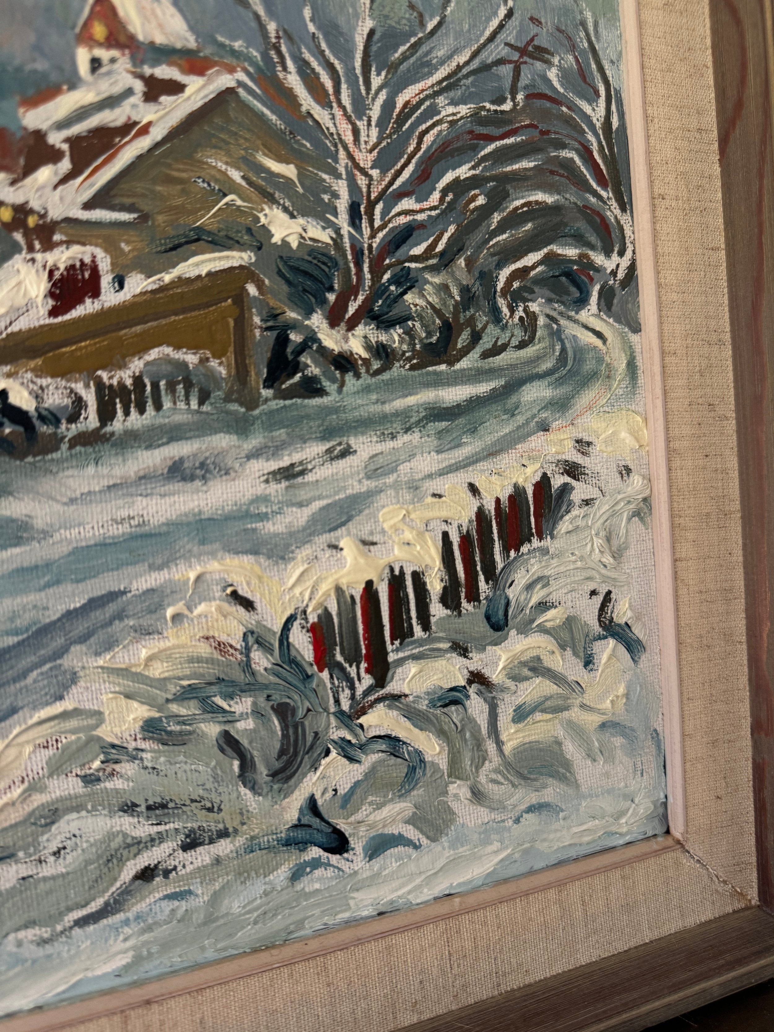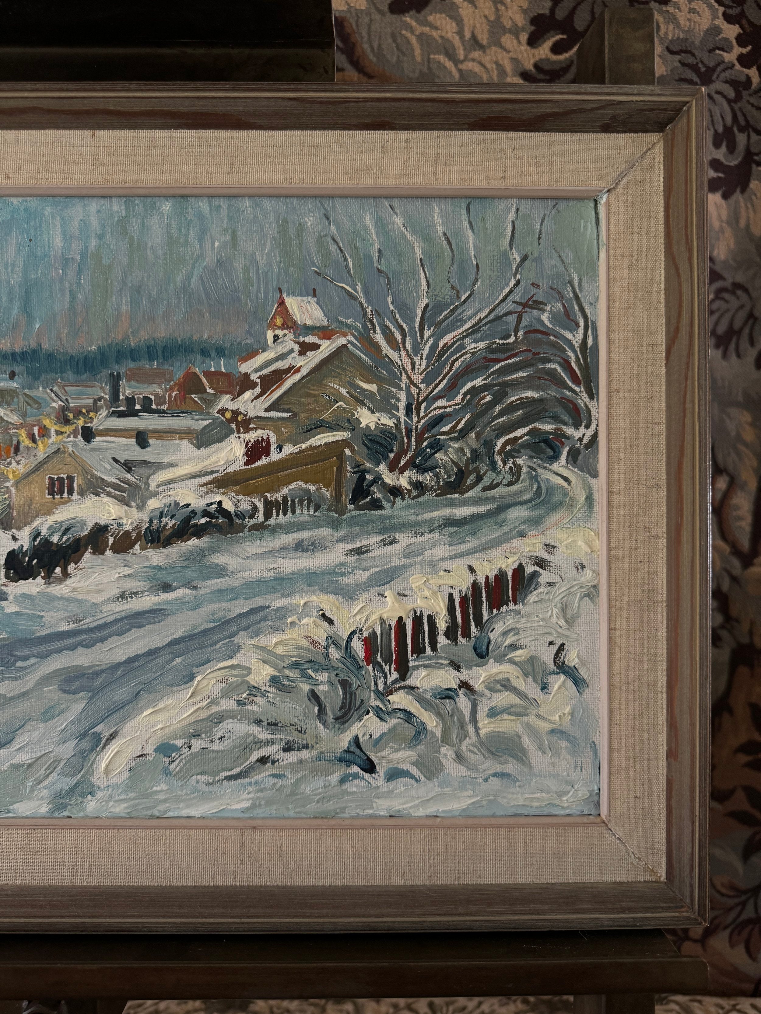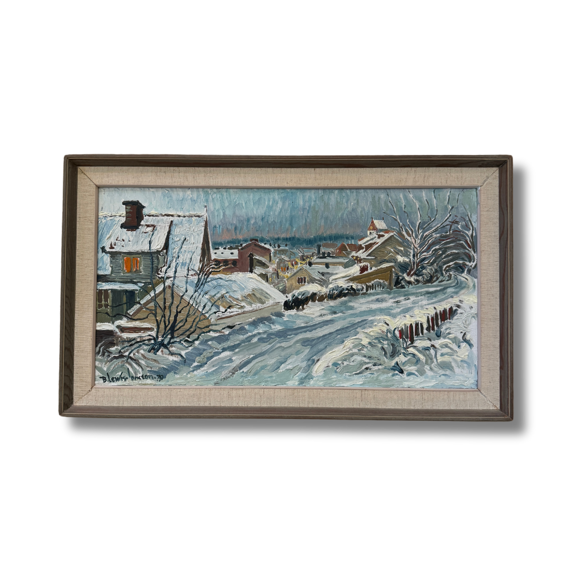 This vibrant Swedish oil on board from 1979 offers a lively depiction of a snow-covered village, bursting with winter charm. The scene is filled with dynamic movement as winding roads lead through the heart of the neighborhood, flanked by quaint houses with snow-laden roofs. Warm, golden light spills from the windows of a few homes, adding a welcoming contrast against the cool, icy blues and whites dominating the palette. The artist’s bold, textured brushstrokes capture the weight and texture of the snow, while the delicate detailing of bare trees and fences adds a layer of intimacy. It is surrounded by the original frame.