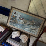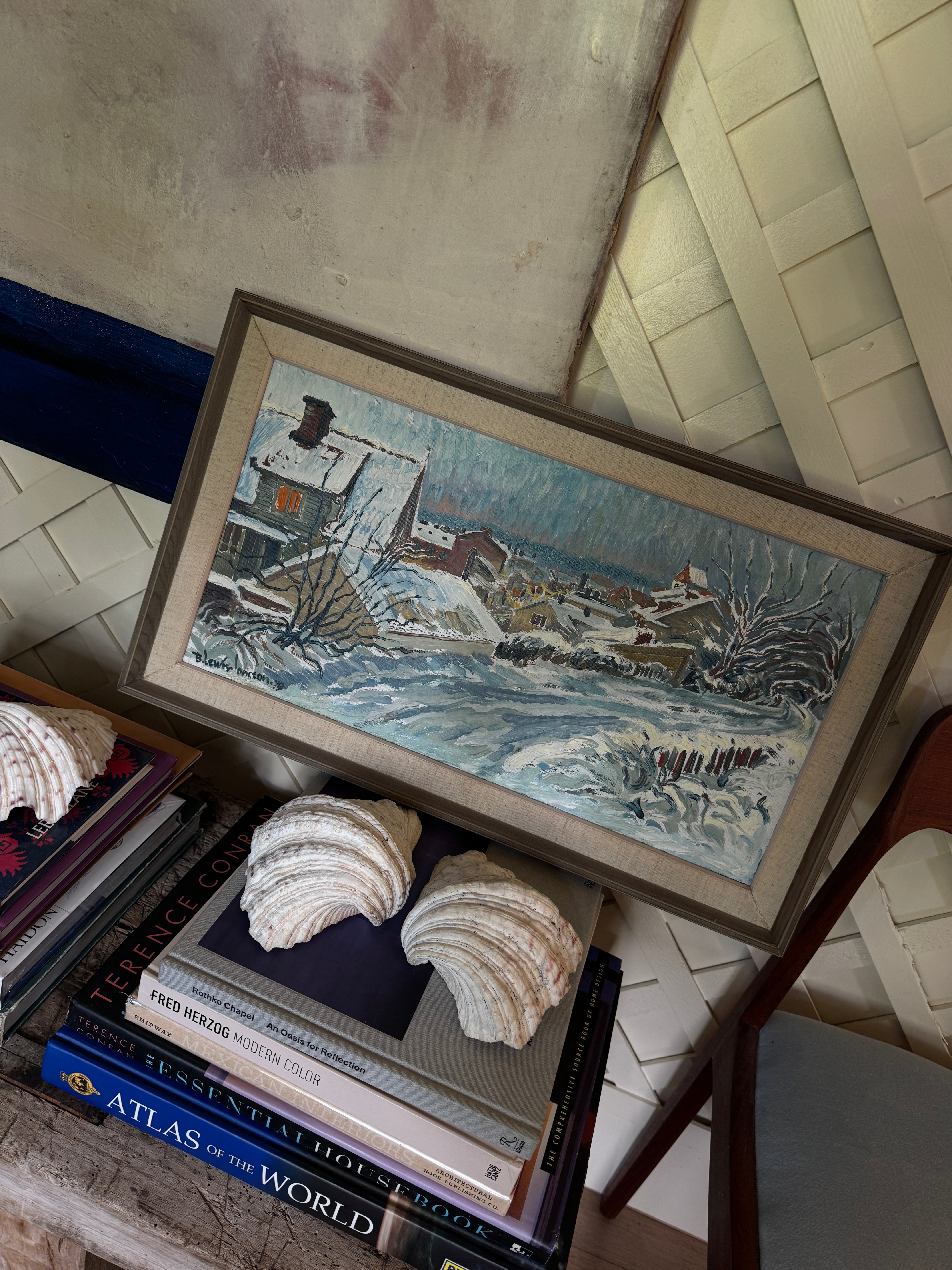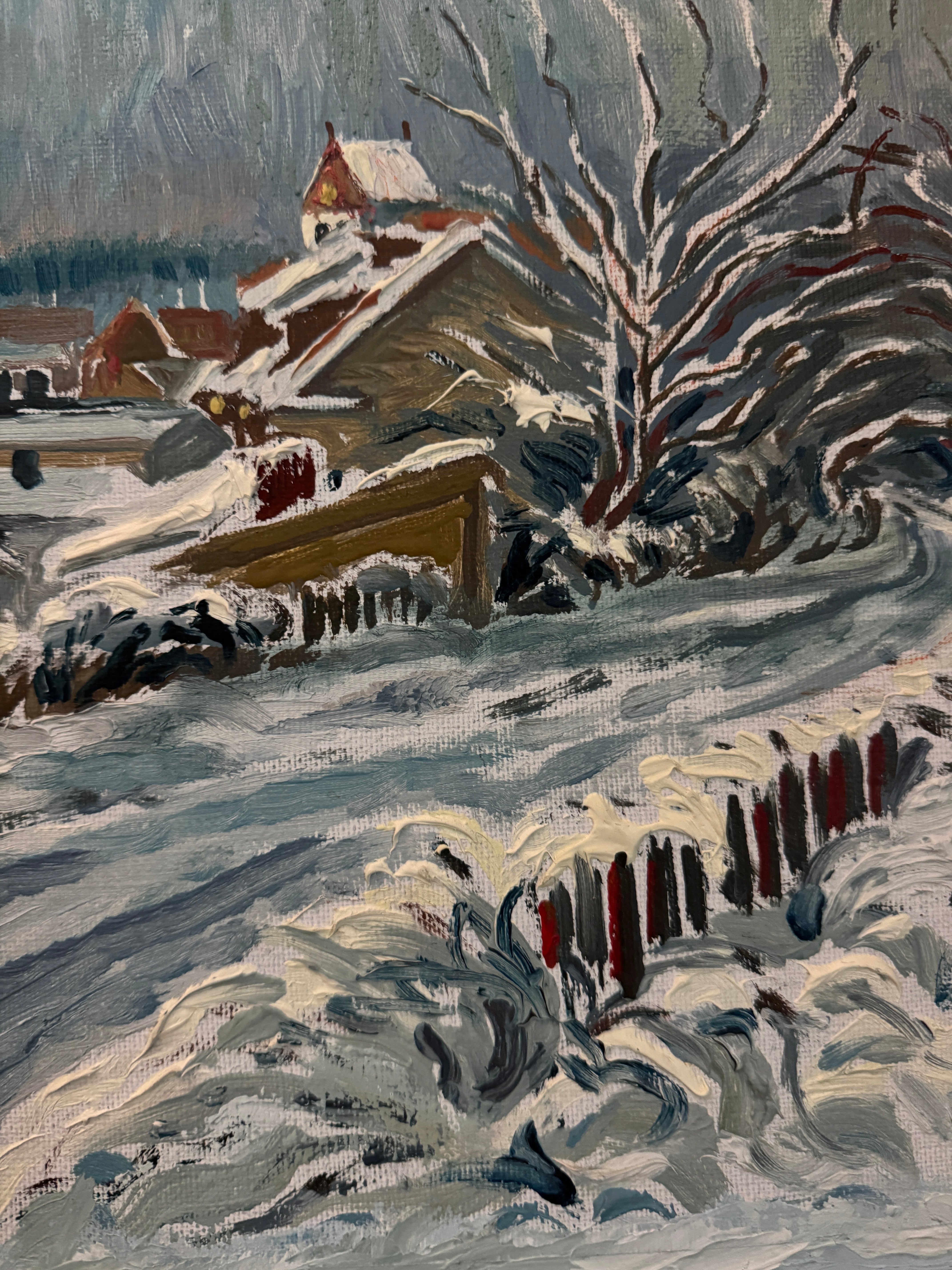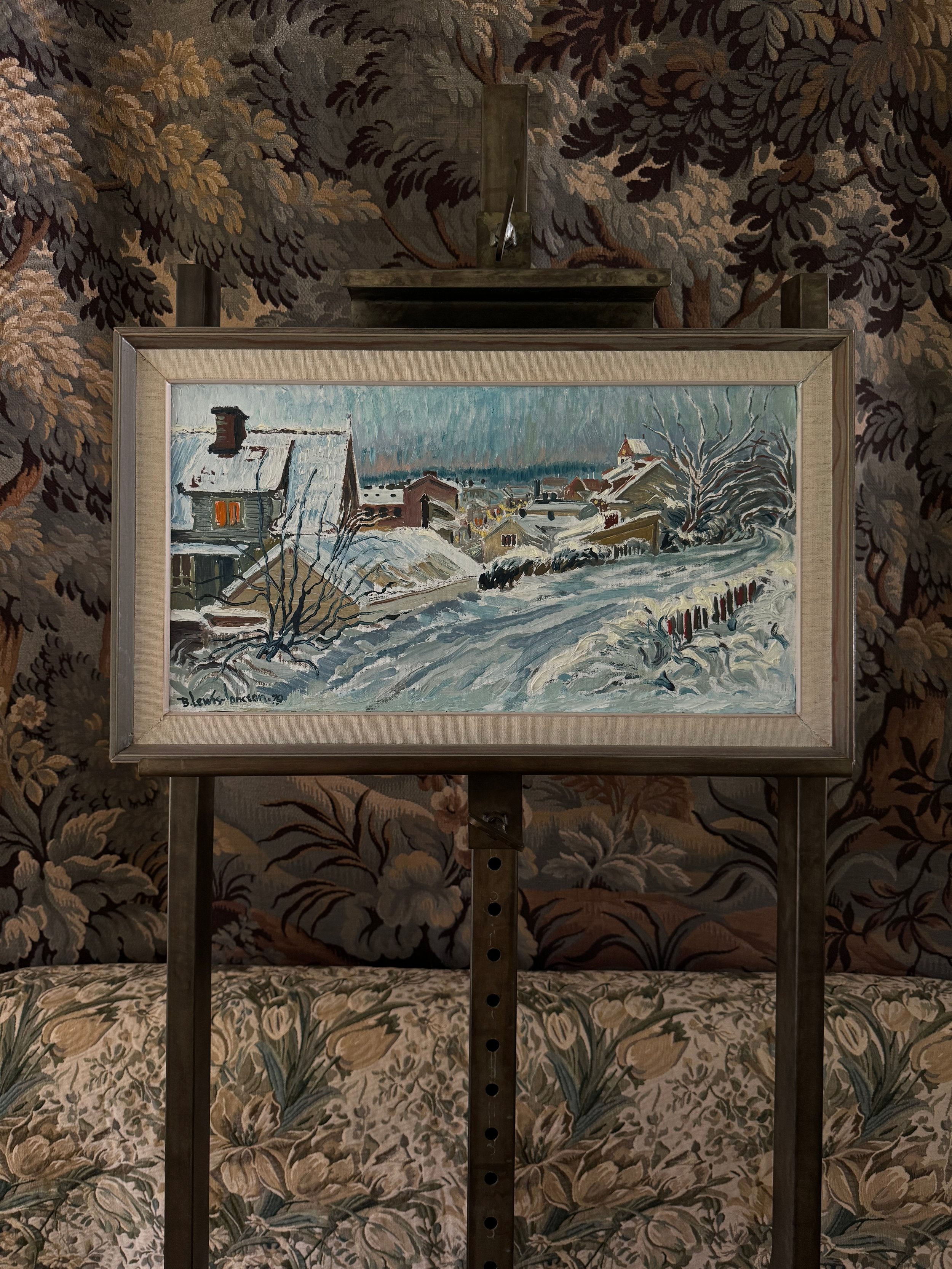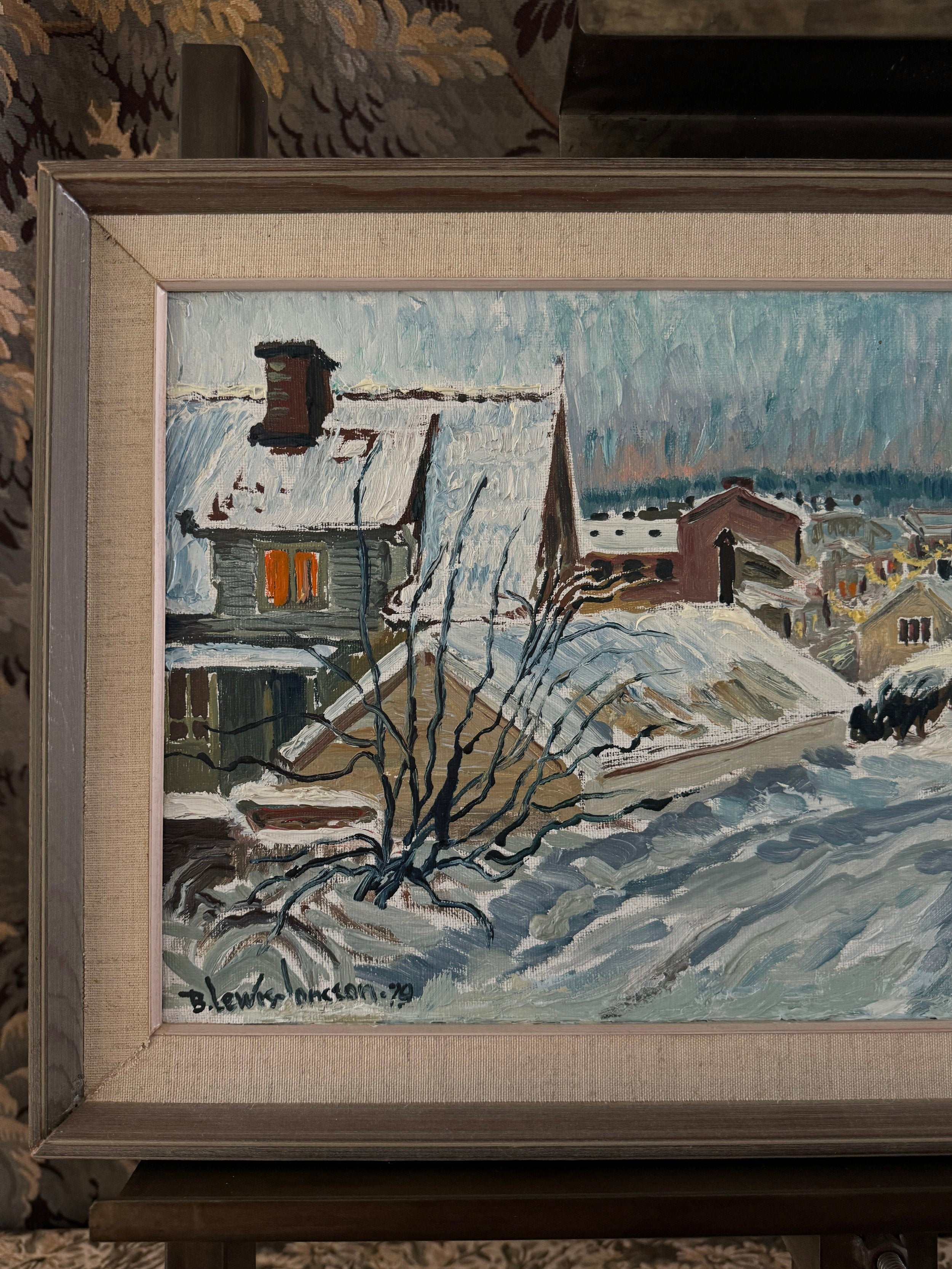 This vibrant Swedish oil on board from 1979 offers a lively depiction of a snow-covered village, bursting with winter charm. The scene is filled with dynamic movement as winding roads lead through the heart of the neighborhood, flanked by quaint houses with snow-laden roofs. Warm, golden light spills from the windows of a few homes, adding a welcoming contrast against the cool, icy blues and whites dominating the palette. The artist’s bold, textured brushstrokes capture the weight and texture of the snow, while the delicate detailing of bare trees and fences adds a layer of intimacy. It is surrounded by the original frame.