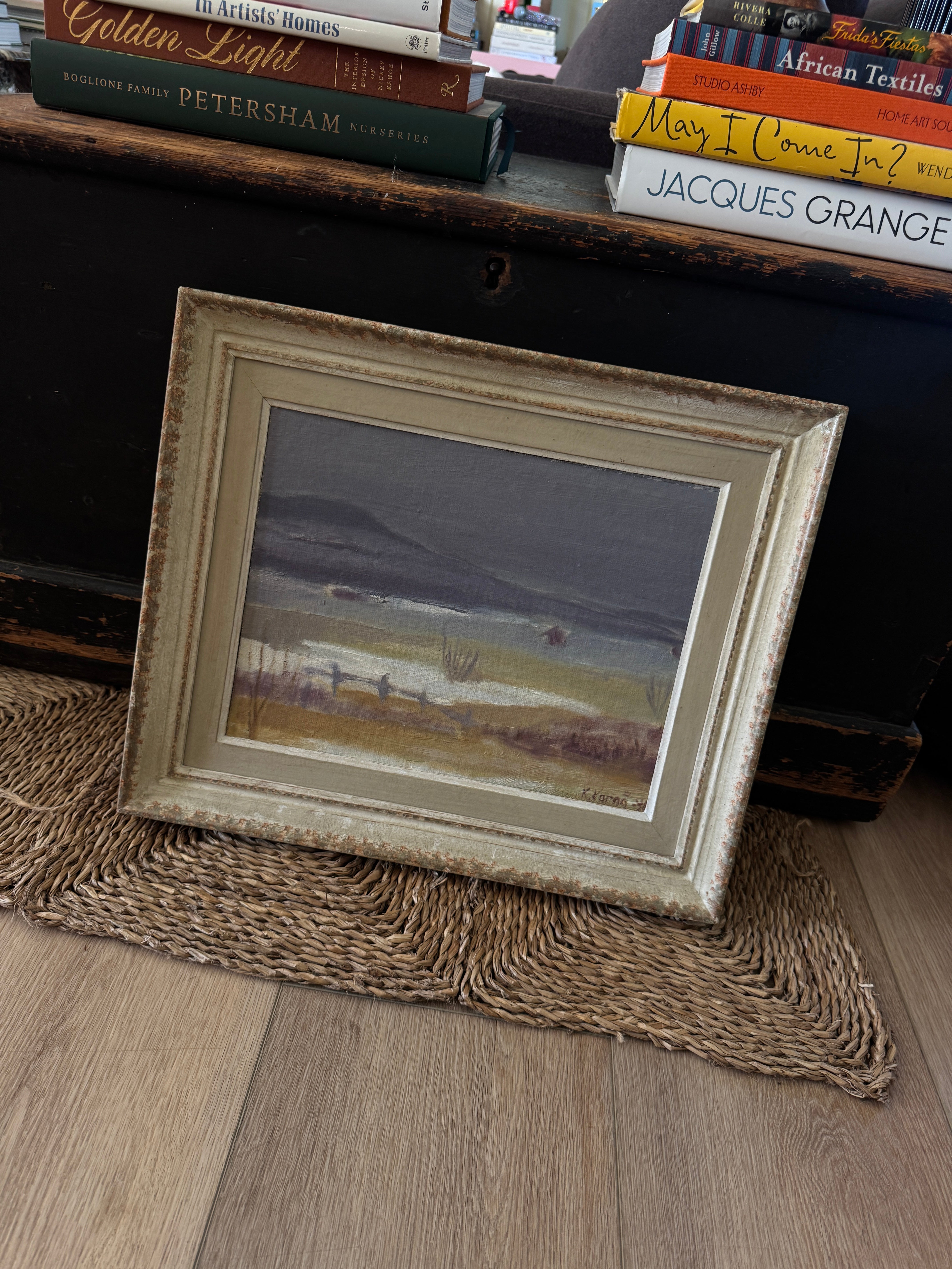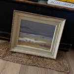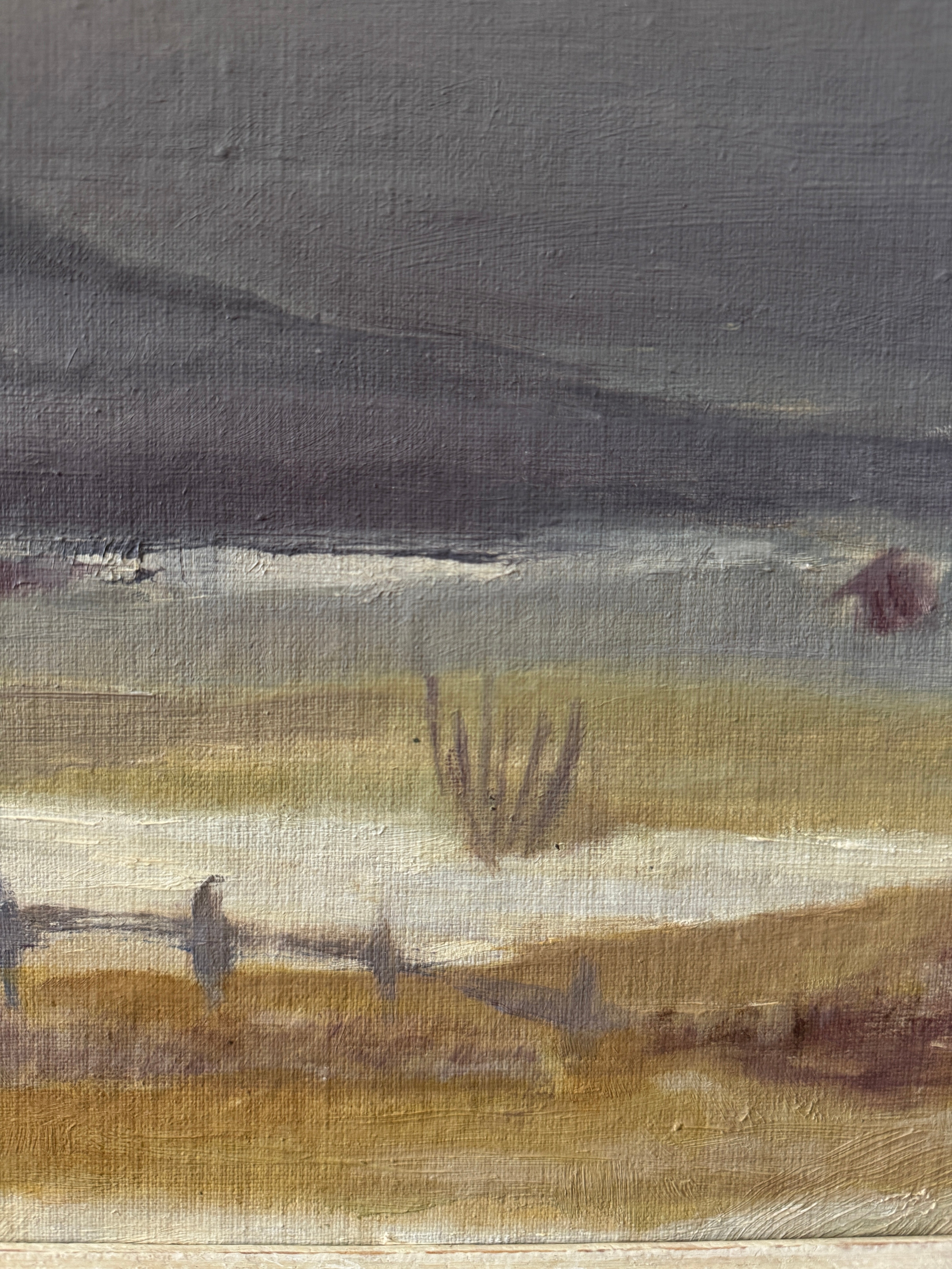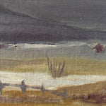This Swedish oil painting is a subtle, atmospheric portrayal of a misty landscape. The artist employs a muted, desaturated palette of soft greys, taupes, and blues to evoke the quiet stillness of a foggy day by the water. The low-lying marshes and gentle, rolling hills in the background, are barely visible through the haze. Delicate brushwork and a soft focus lend a dreamlike quality to the scene, suggesting the calm before or after a storm. It is surrounded by the original frame.