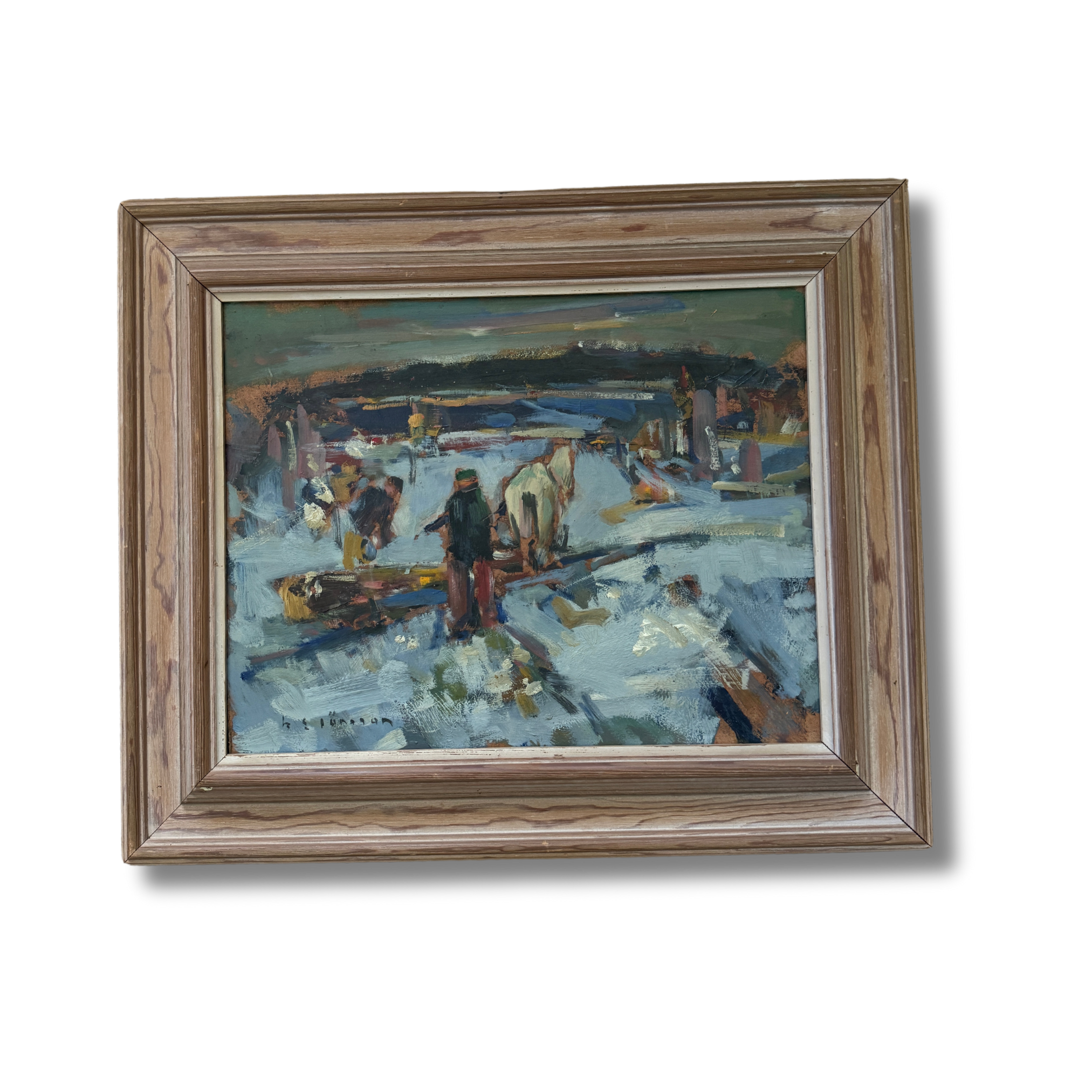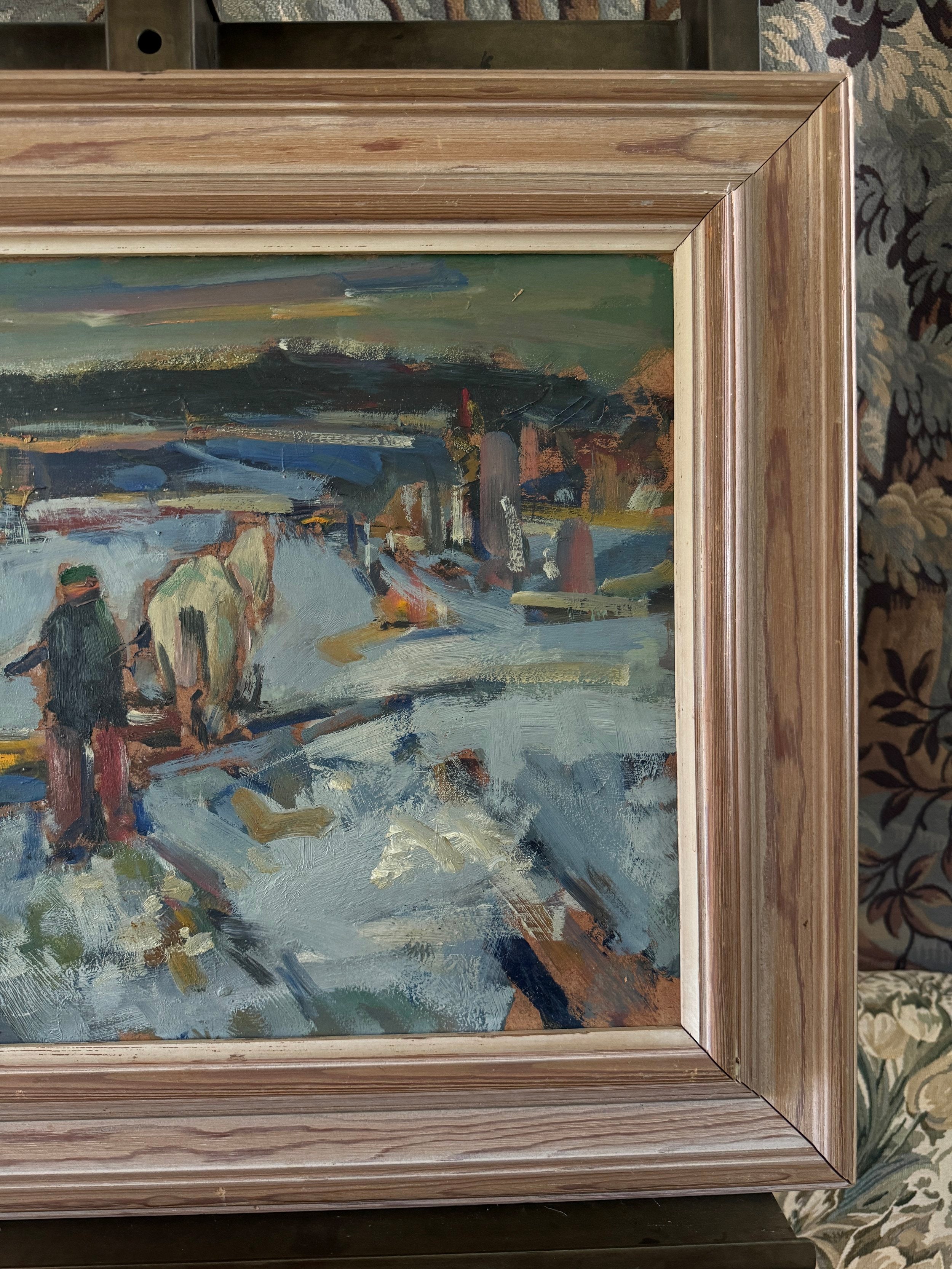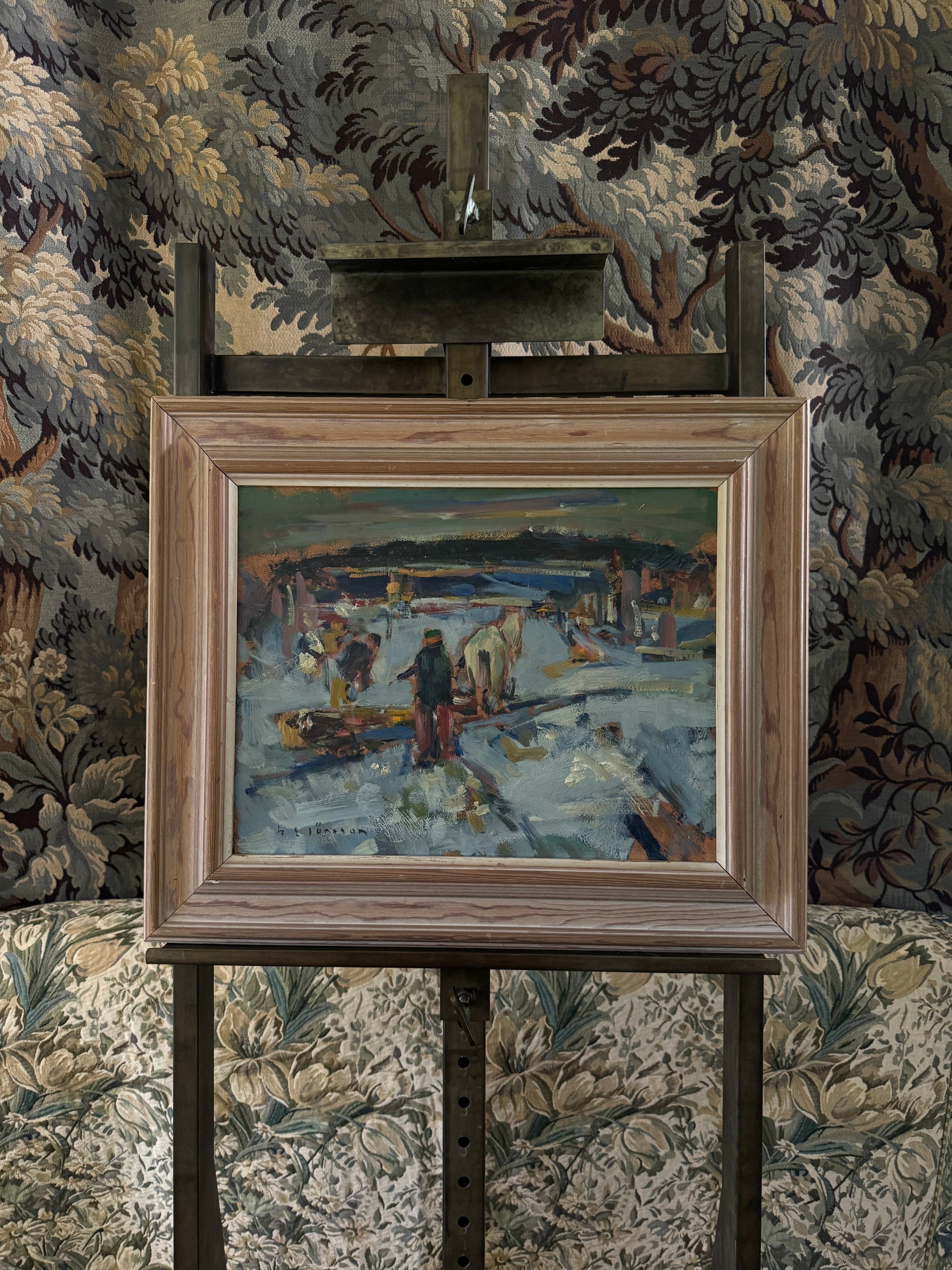 This expressive Swedish oil painting captures a bustling winter scene with a lively, almost chaotic energy. The composition features figures working in a snow-covered landscape, including a central figure guiding a horse-drawn sled. The artist employs loose, dynamic brushstrokes, using bold patches of color to convey movement and the busy activity of a winter's day. The palette is dominated by cool blues and whites, contrasted by earthy browns and vibrant splashes of red and yellow, bringing warmth to the otherwise chilly setting. The landscape recedes into the background with a hazy, grey horizon, suggesting a snowy, overcast day. The piece embodies the rhythm of rural life in winter, highlighting the labor and camaraderie of the season.