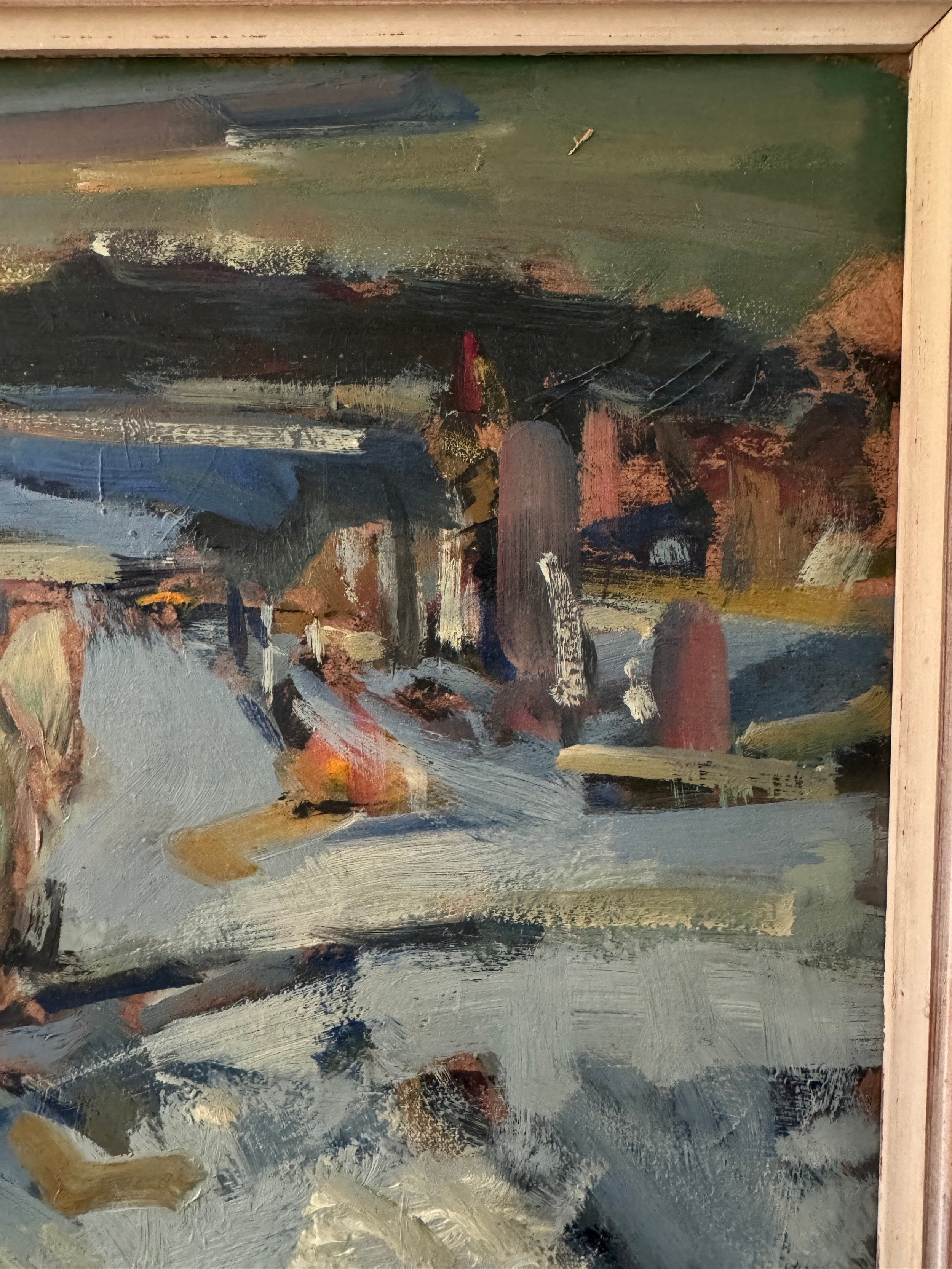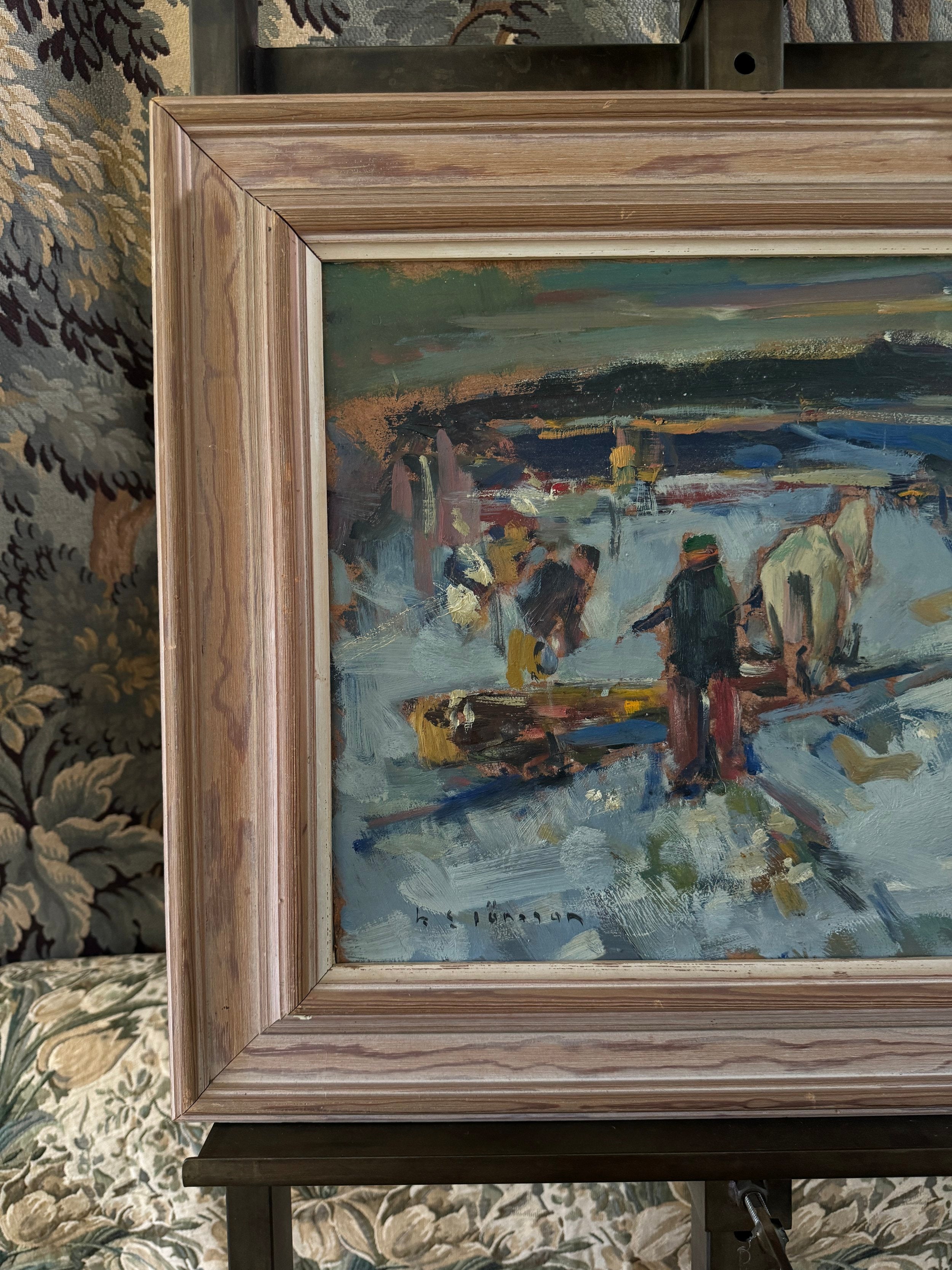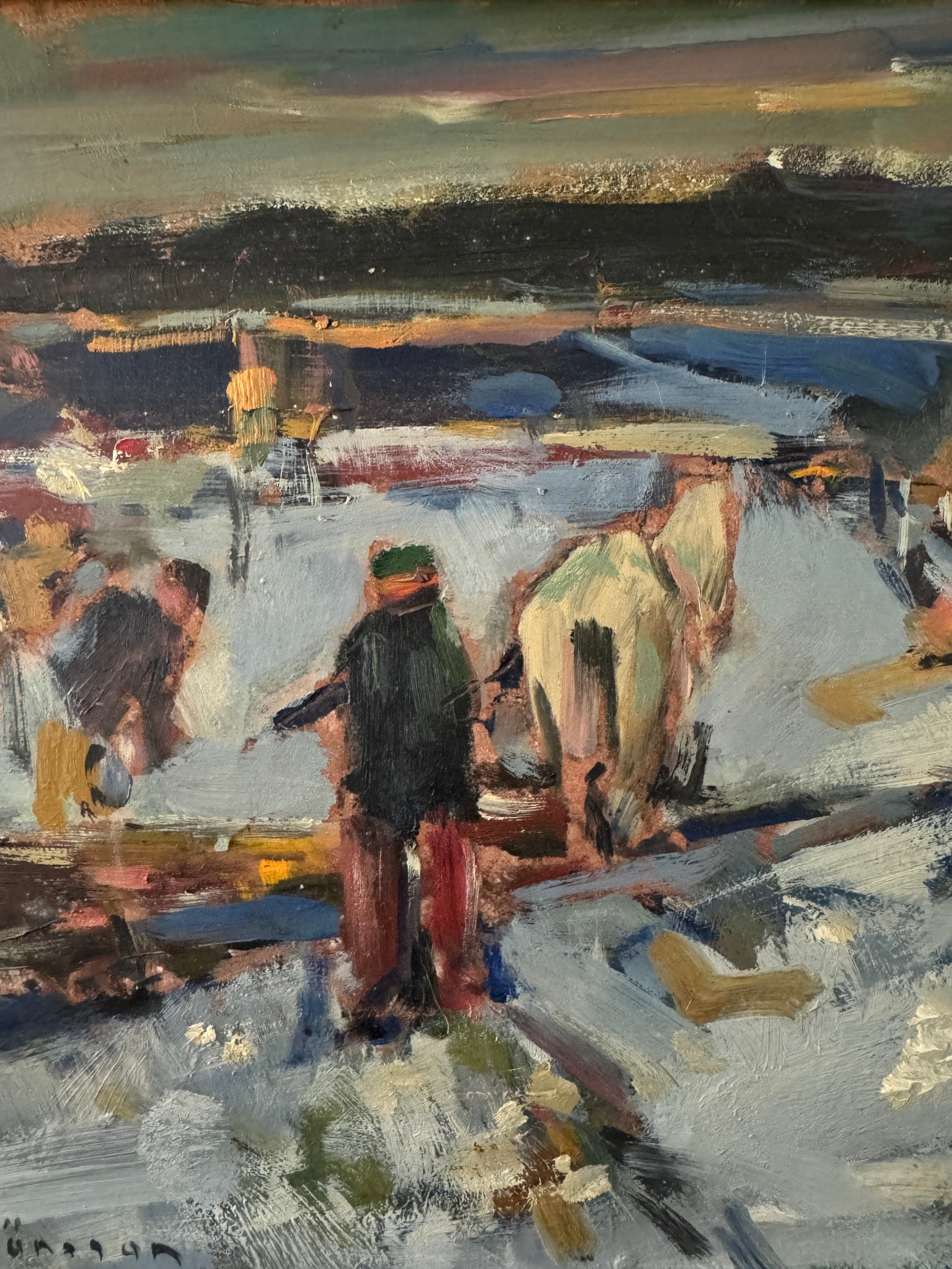 This expressive Swedish oil painting captures a bustling winter scene with a lively, almost chaotic energy. The composition features figures working in a snow-covered landscape, including a central figure guiding a horse-drawn sled. The artist employs loose, dynamic brushstrokes, using bold patches of color to convey movement and the busy activity of a winter's day. The palette is dominated by cool blues and whites, contrasted by earthy browns and vibrant splashes of red and yellow, bringing warmth to the otherwise chilly setting. The landscape recedes into the background with a hazy, grey horizon, suggesting a snowy, overcast day. The piece embodies the rhythm of rural life in winter, highlighting the labor and camaraderie of the season.