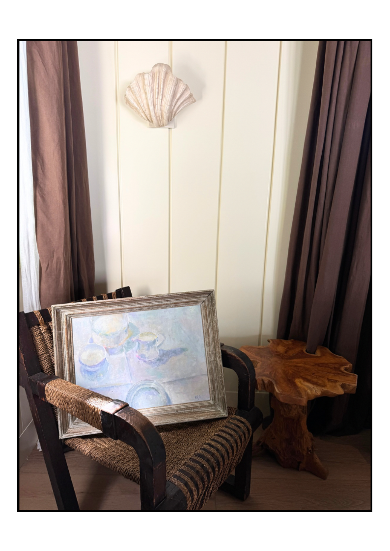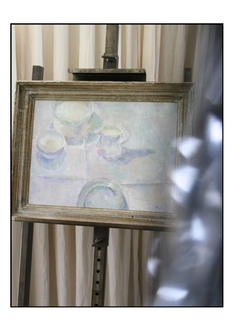 This oil on canvas transforms the simplest of table settings into a study of light and atmosphere. Bowls, a jug, and a plate are rendered in the softest palette of whites, silvers, and pale pastels, their forms dissolving gently into one another as though veiled in morning light. Subtle touches of rose, lavender, and lemon flicker across the surfaces, giving the work a shimmering quality that feels both ethereal and grounded. Framed in weathered wood, the piece captures a timeless elegance, an ode to restraint, intimacy, and the quiet beauty of everyday rituals.