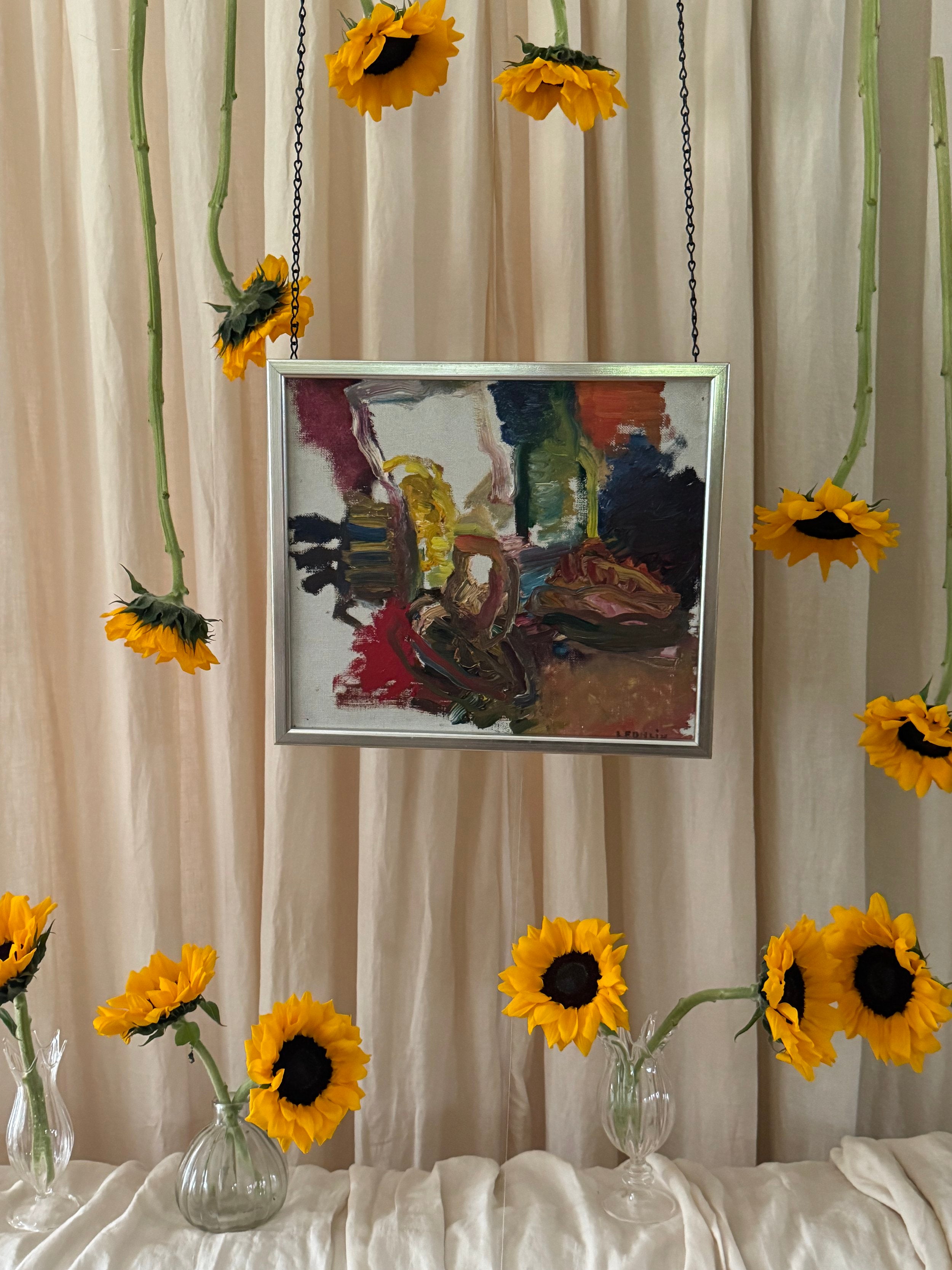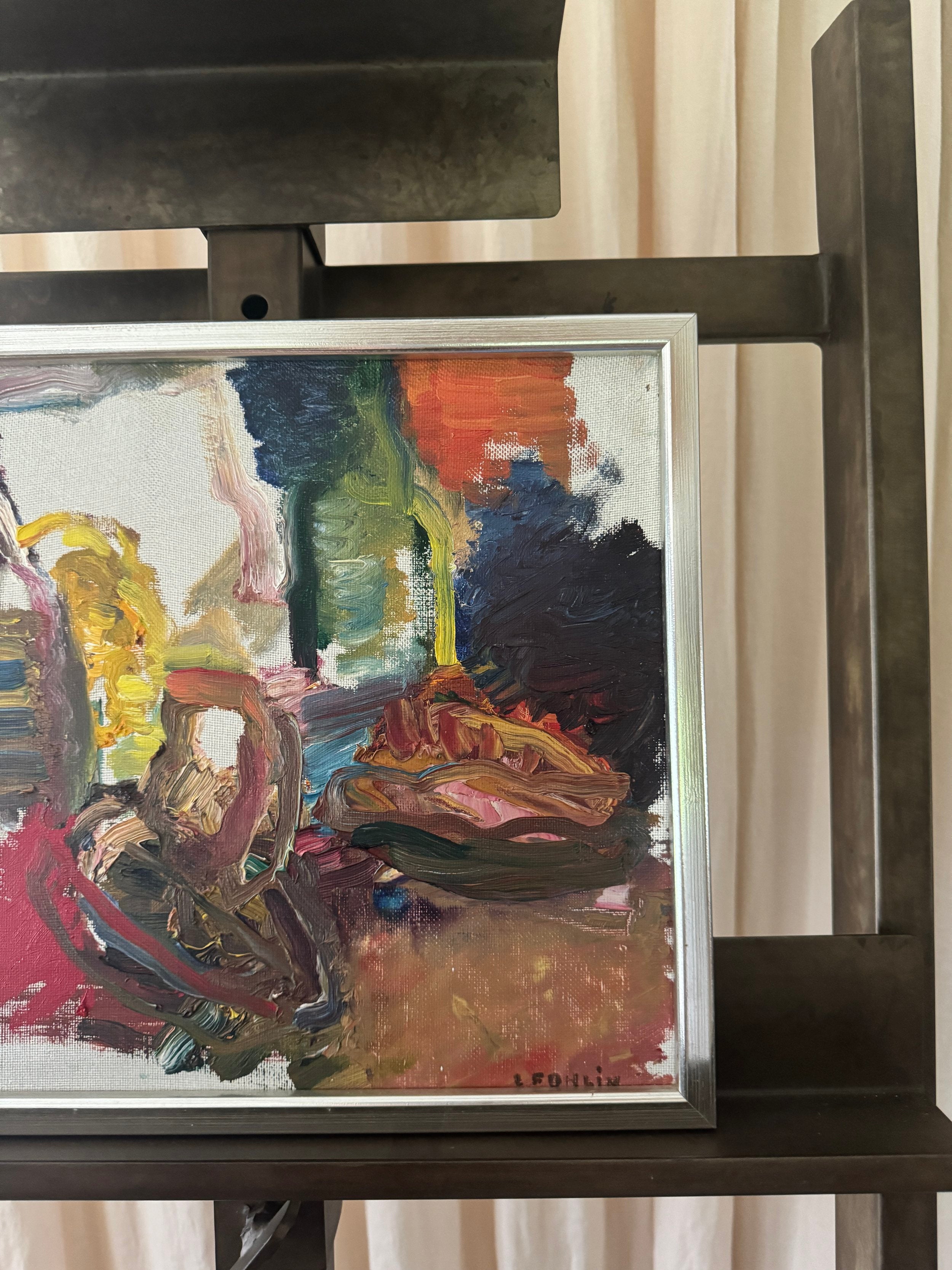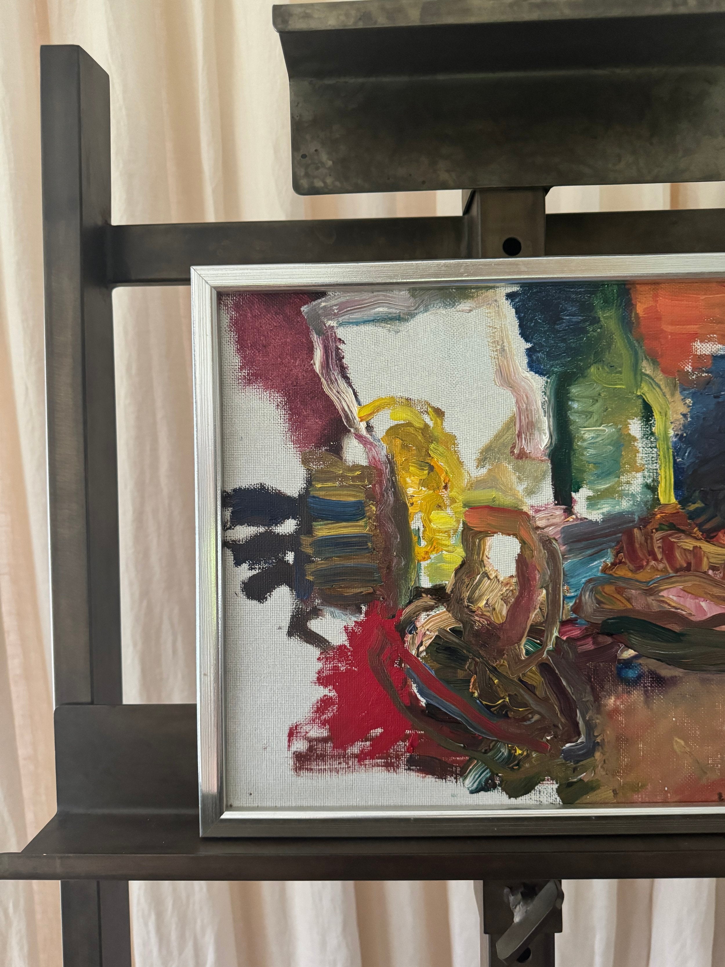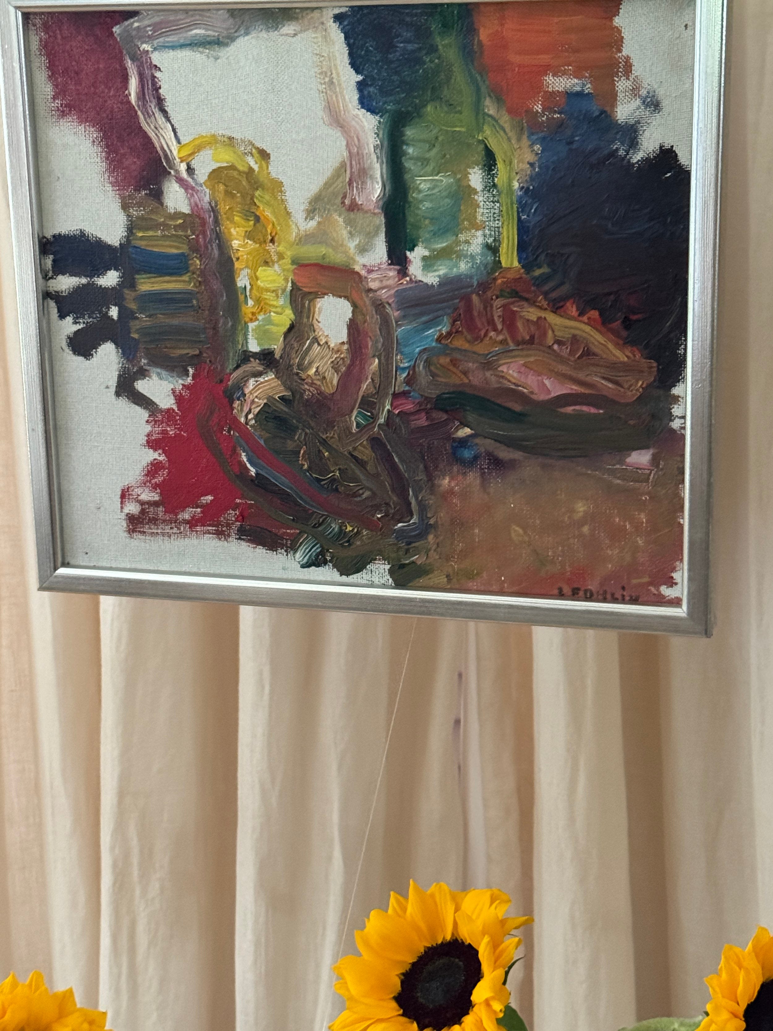 This Swedish midcentury oil painting captures a dynamic sense of movement through bold, impasto brushstrokes and a vibrant palette. The interplay of color feels instinctive and full of emotion, blending rich jewel tones with warm, earthy hues, creating a balanced yet captivating composition. Its abstract nature allows for endless interpretation, making it a perfect addition to a modern interior that values artistic expression. Framed in a minimalist border, the artwork maintains its visual punch while the clean lines of the frame let the brushwork truly shine. It’s an ideal piece for those who appreciate the intersection of Scandinavian design and bold artistic energy.