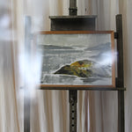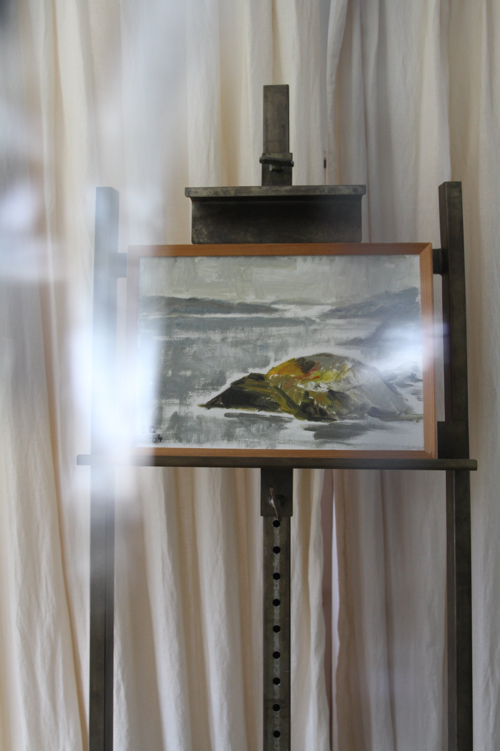 This quiet and unassuming midcentury Swedish oil from 1964 distills the landscape down to its most elemental mood...sea, stone, sky...rendered with restraint and confidence. A single rocky outcrop anchors the composition, its warm ochres and mossy greens pushing gently against a silvery-grey shoreline and misted horizon. The brushwork leans into the negative space with movement, allowing texture to do the emotional work: scraped paint suggests water in motion, while softened edges blur the boundary between land and air. There’s a sense of solitude here, almost meditative, as if the scene were painted from memory rather than observation.