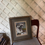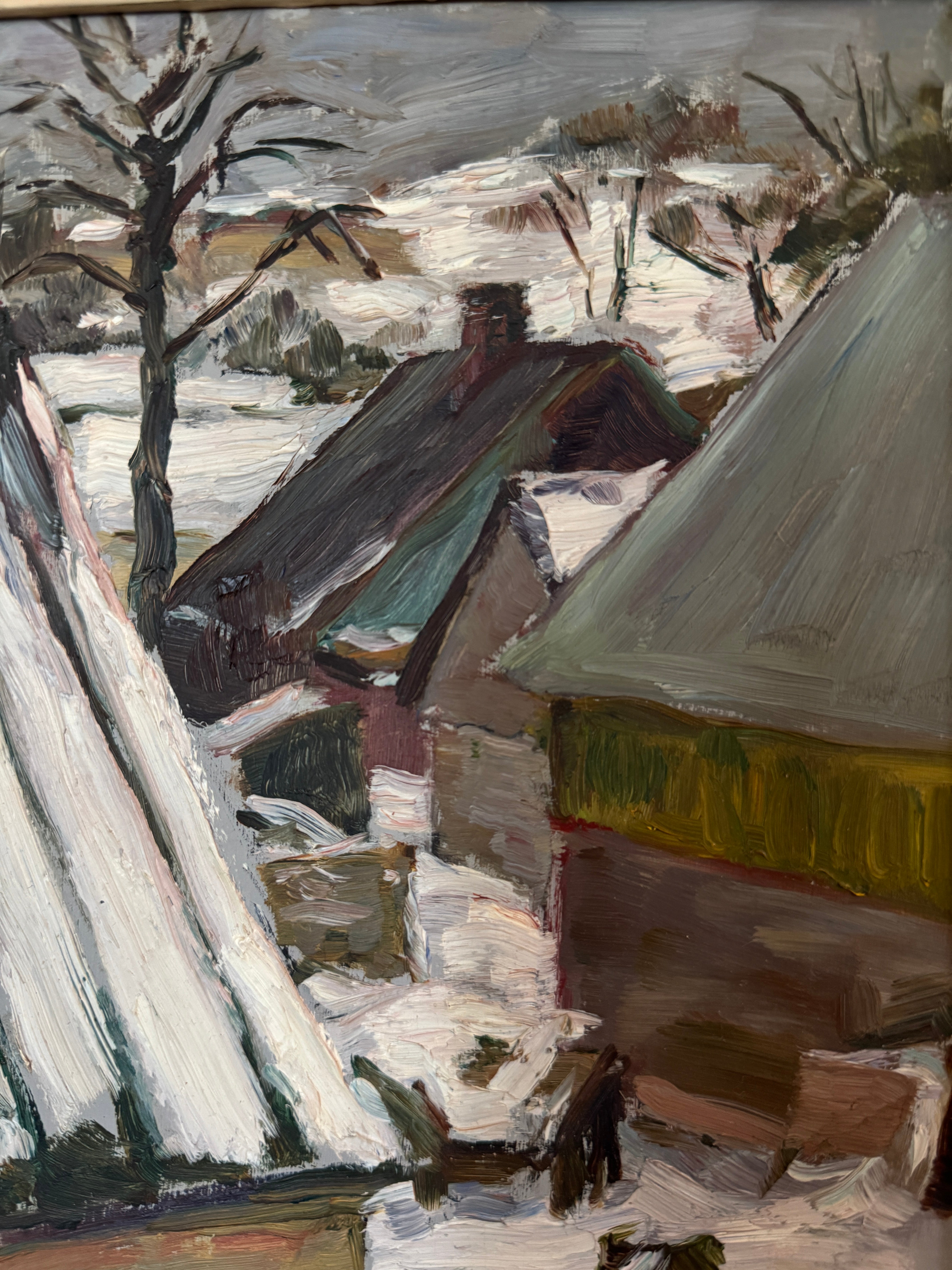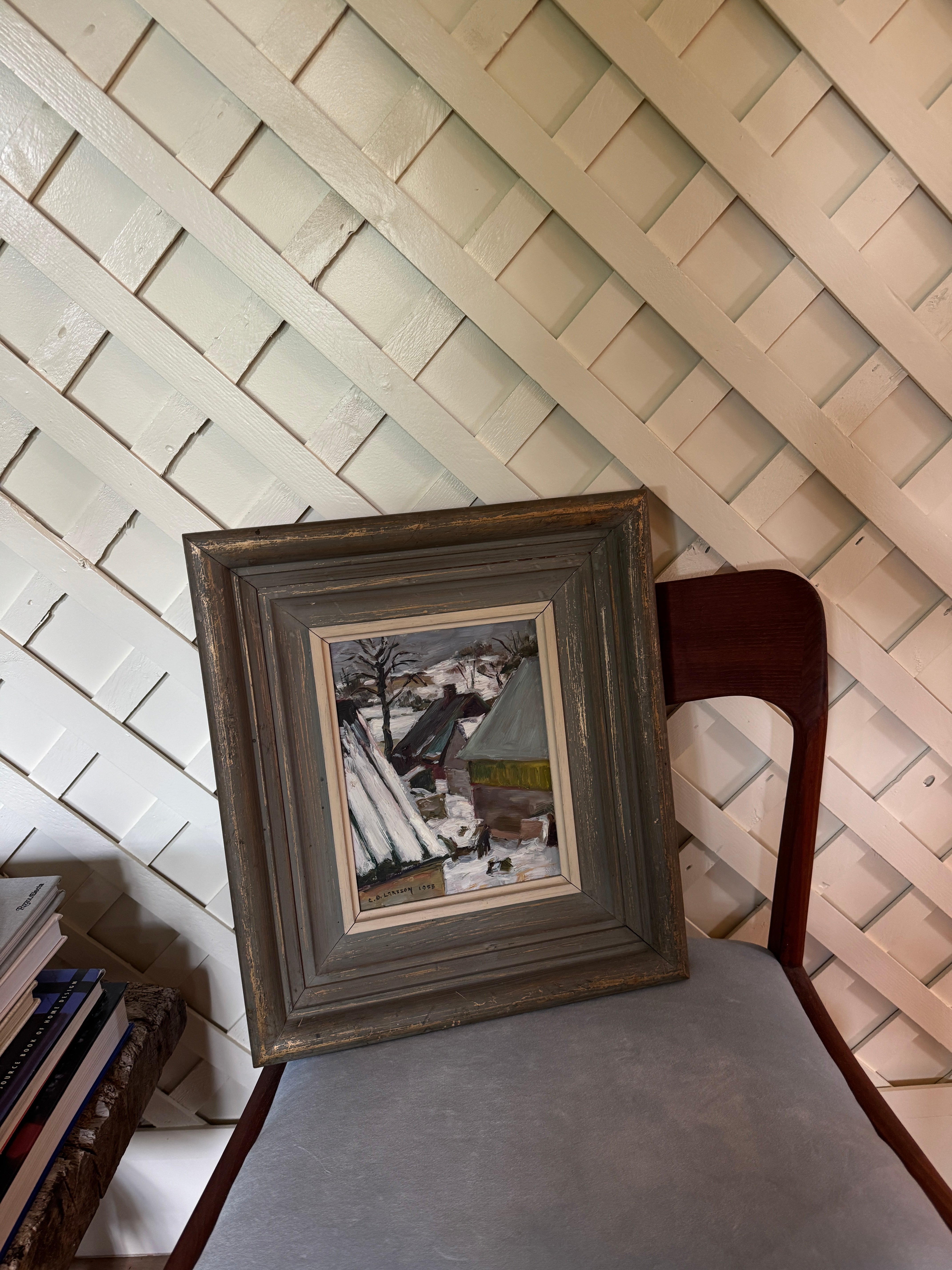 This small yet striking oil on wood painting from 1955 features a cozy winter village scene, rendered with an expressive and textured brushwork. The composition showcases snow-covered rooftops and a cluster of rustic buildings, nestled closely together as if to fend off the cold. The artist skillfully contrasts the crisp white snow with dark, muted tones of the surrounding structures, while hints of green and ochre offer a pop of color. The bare trees stand starkly against a grey, overcast sky, adding a sense of seasonal atmosphere. The thick impasto technique gives the piece a tactile quality, making the snow appear heavy and the scene almost tangible. It comes in the outstanding original frame.