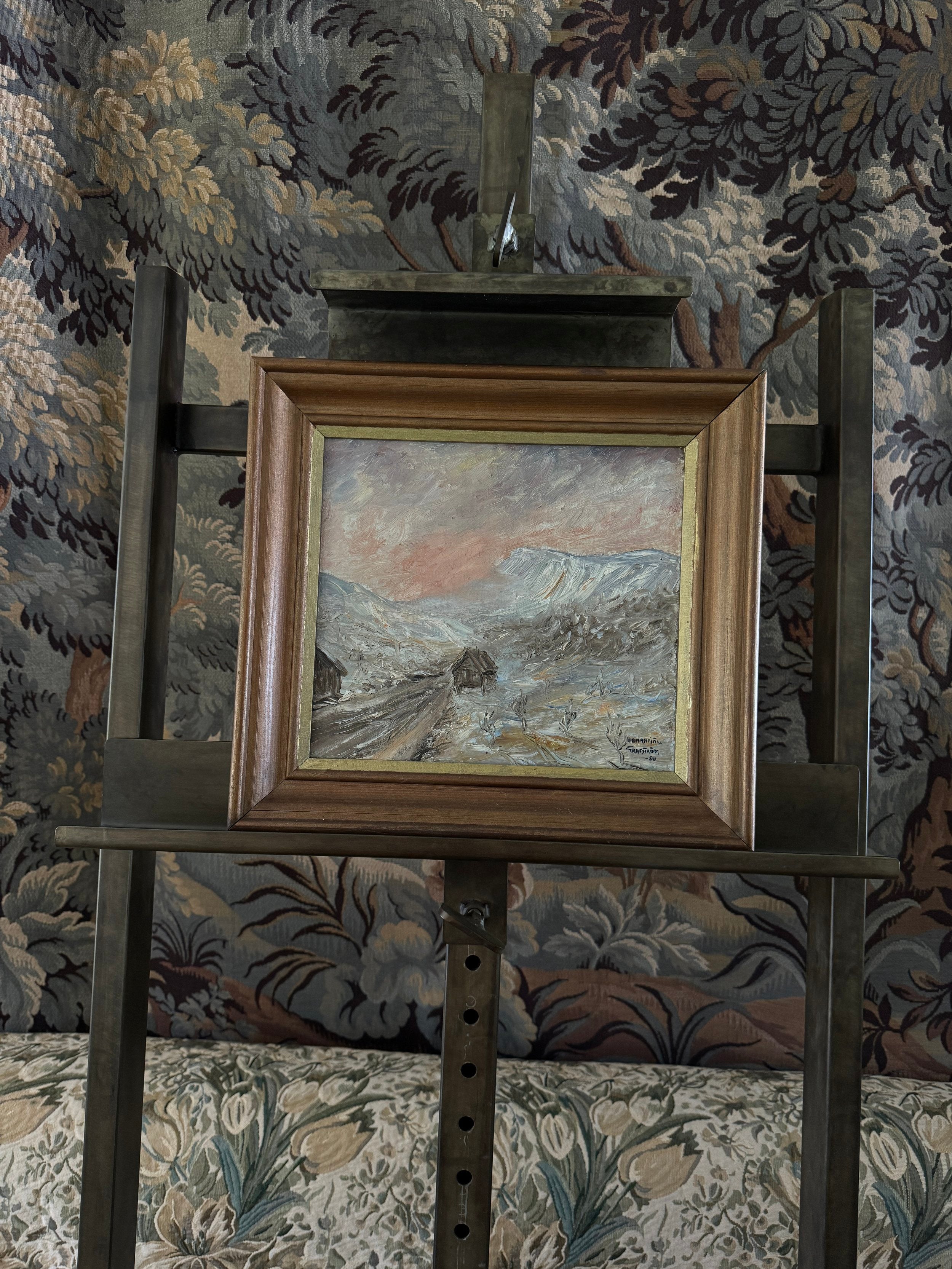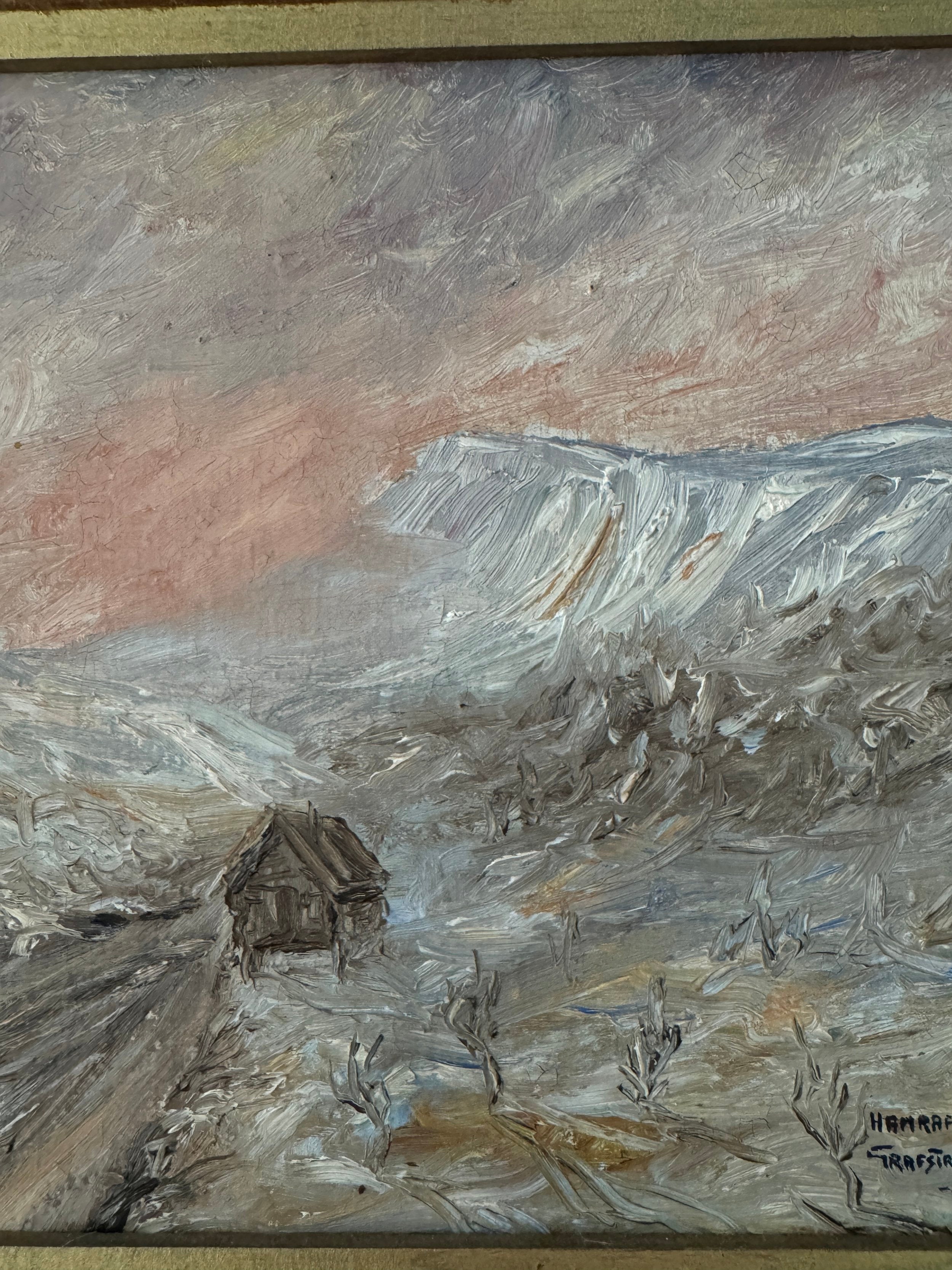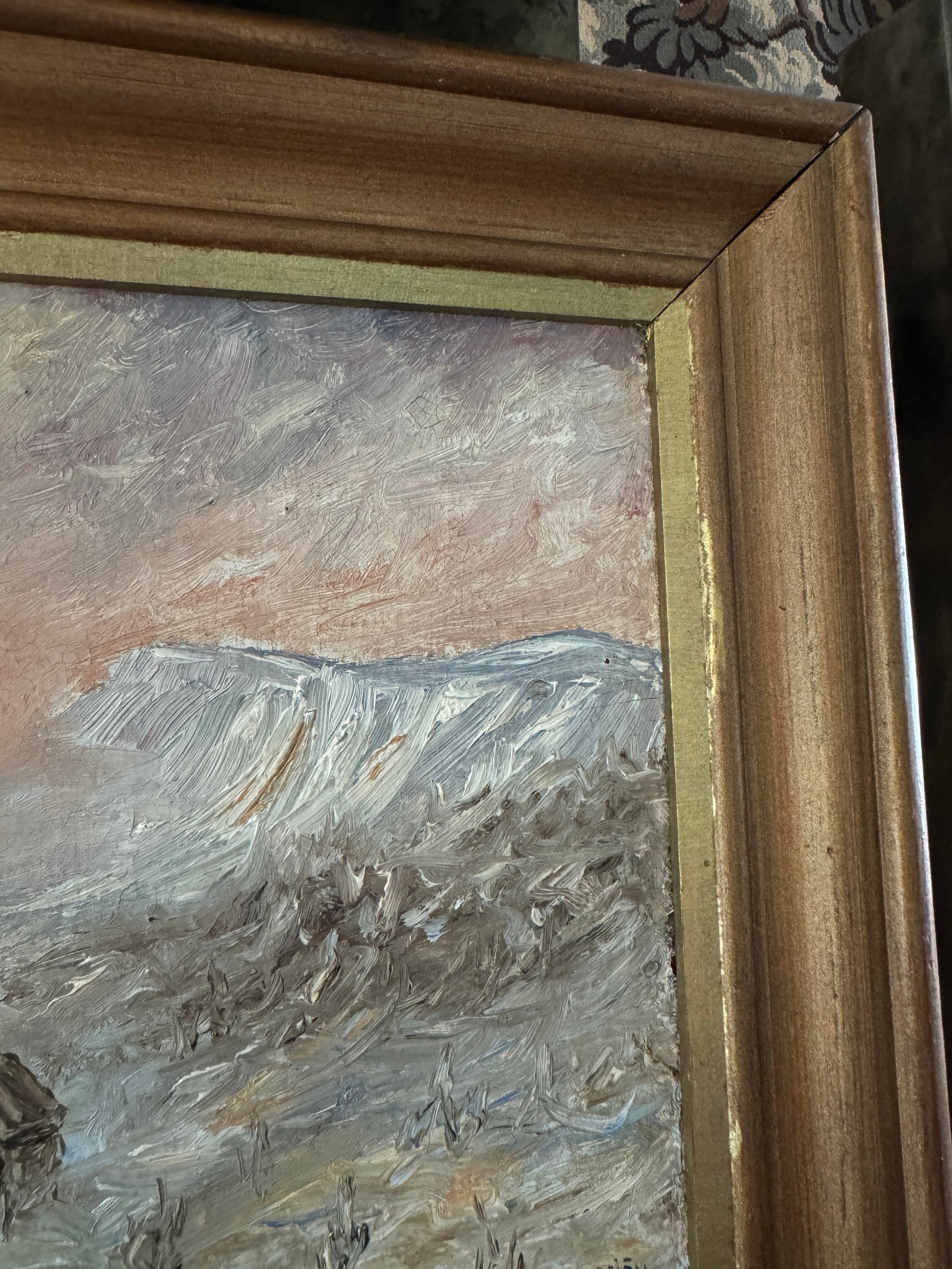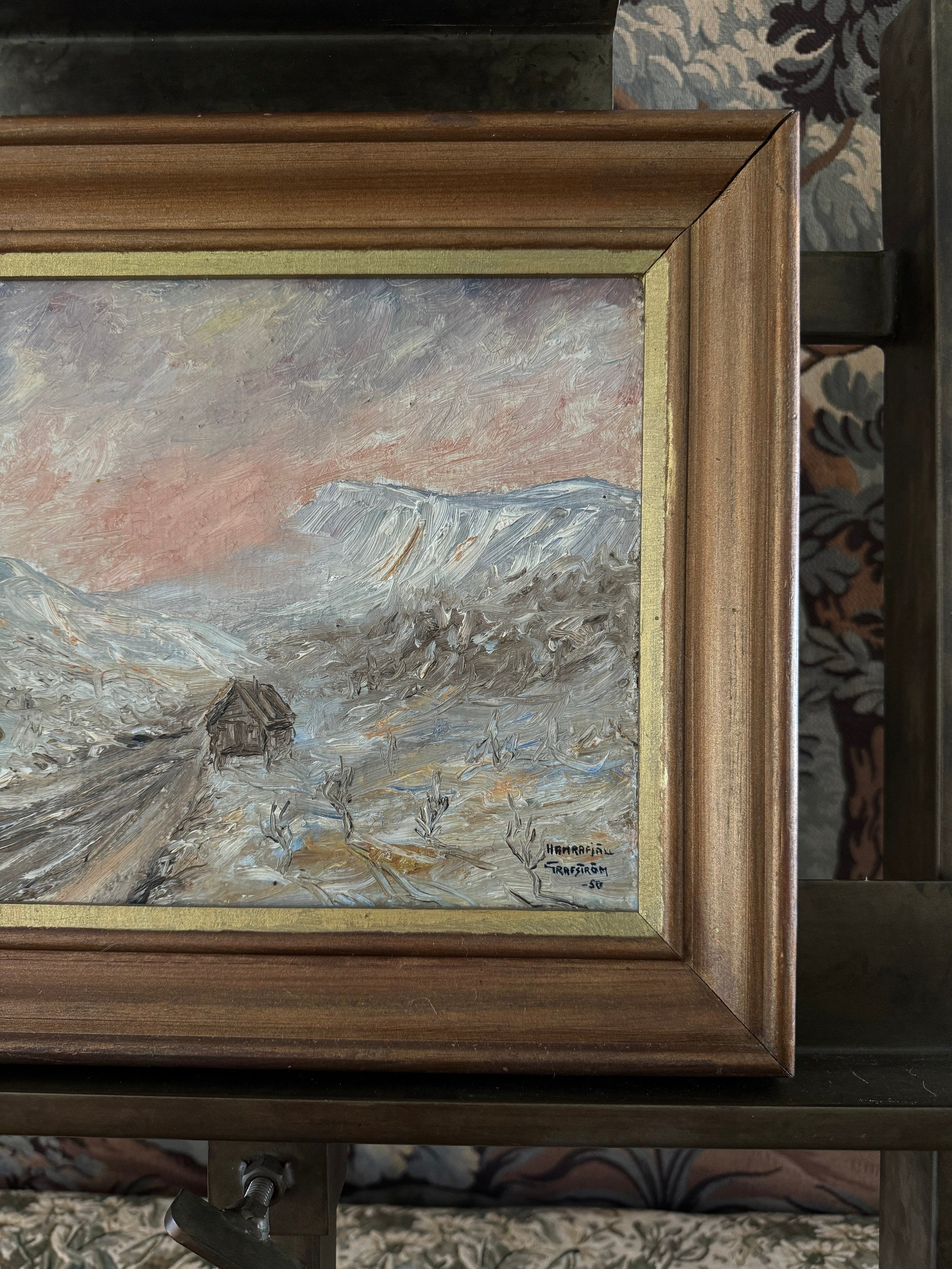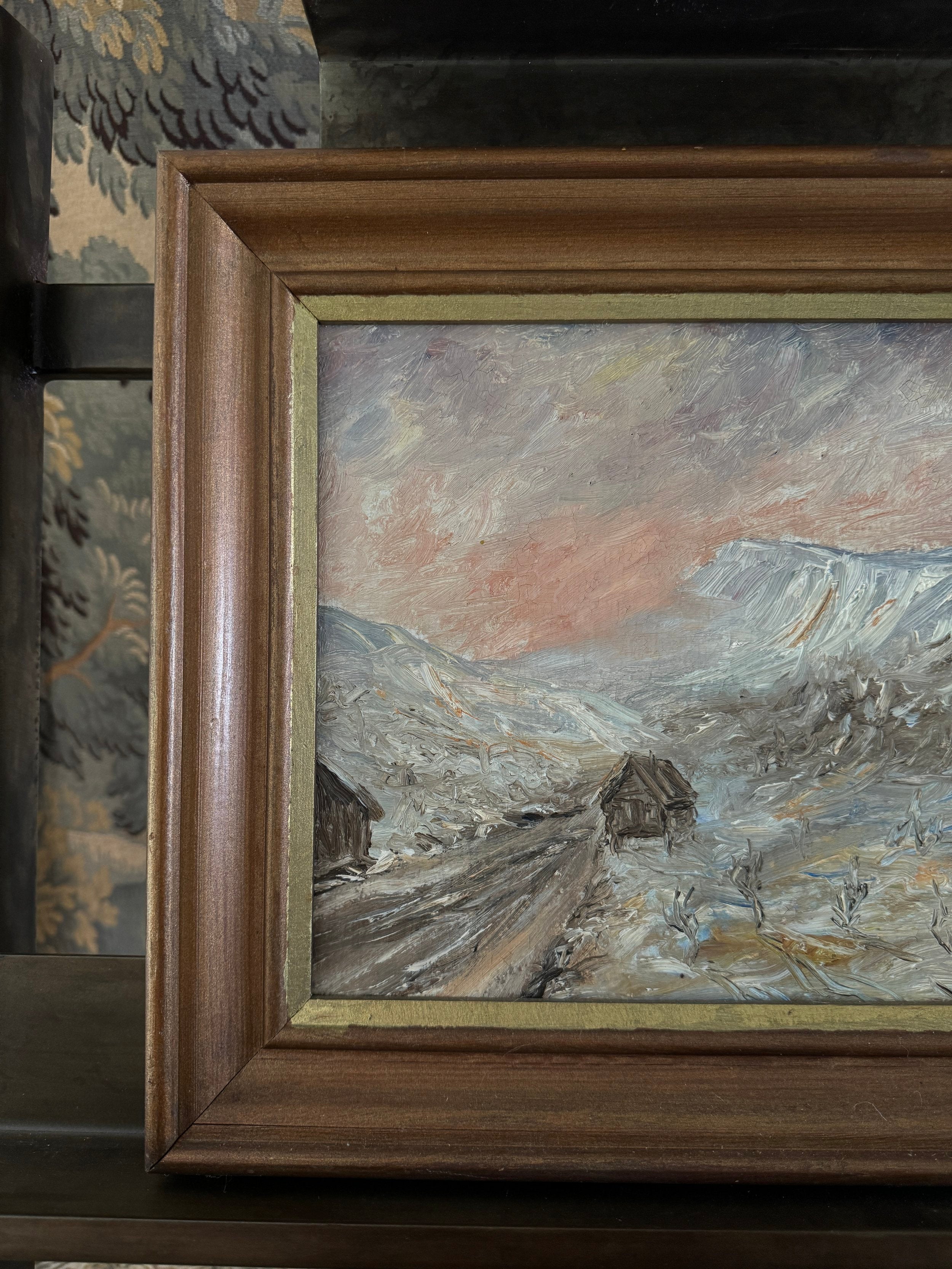 This 1950 Swedish oil on board painting exudes the serene beauty of a winter landscape at dusk. The scene depicts a quiet, snow-laden valley framed by imposing mountains, their peaks gently touched by the last light of day. A winding country road leads the eye towards a rustic cabin nestled among the snowy terrain, evoking a sense of solitude and shelter. The artist’s brushwork is fluid and expressive, capturing the soft blush of the sky as it transitions from pale pink to the cool hues of twilight. The delicate interplay of light and shadow lends the painting a peaceful, almost wistful atmosphere, encapsulating the stillness of a Scandinavian winter evening. It is surrounded by the original frame.