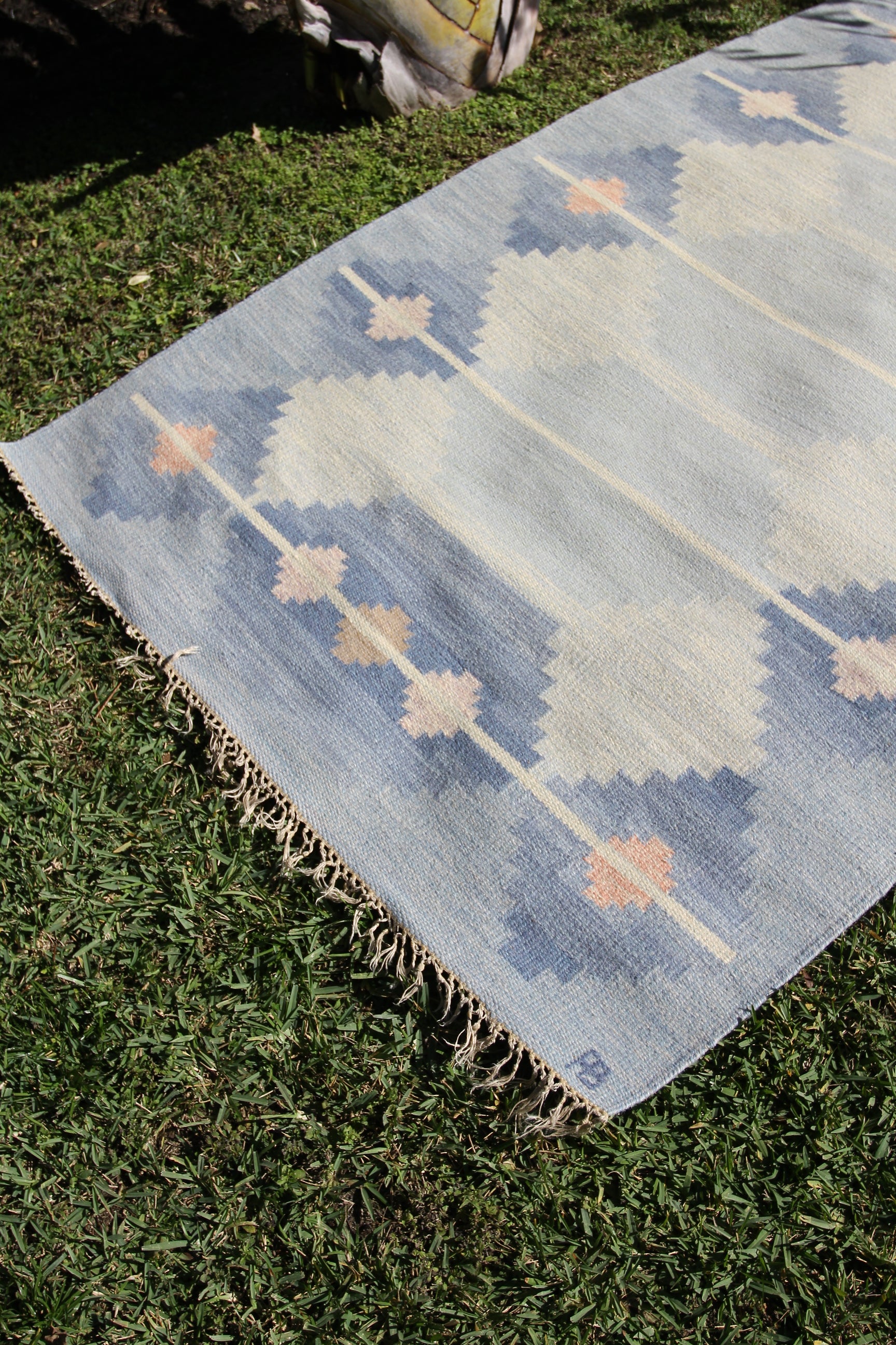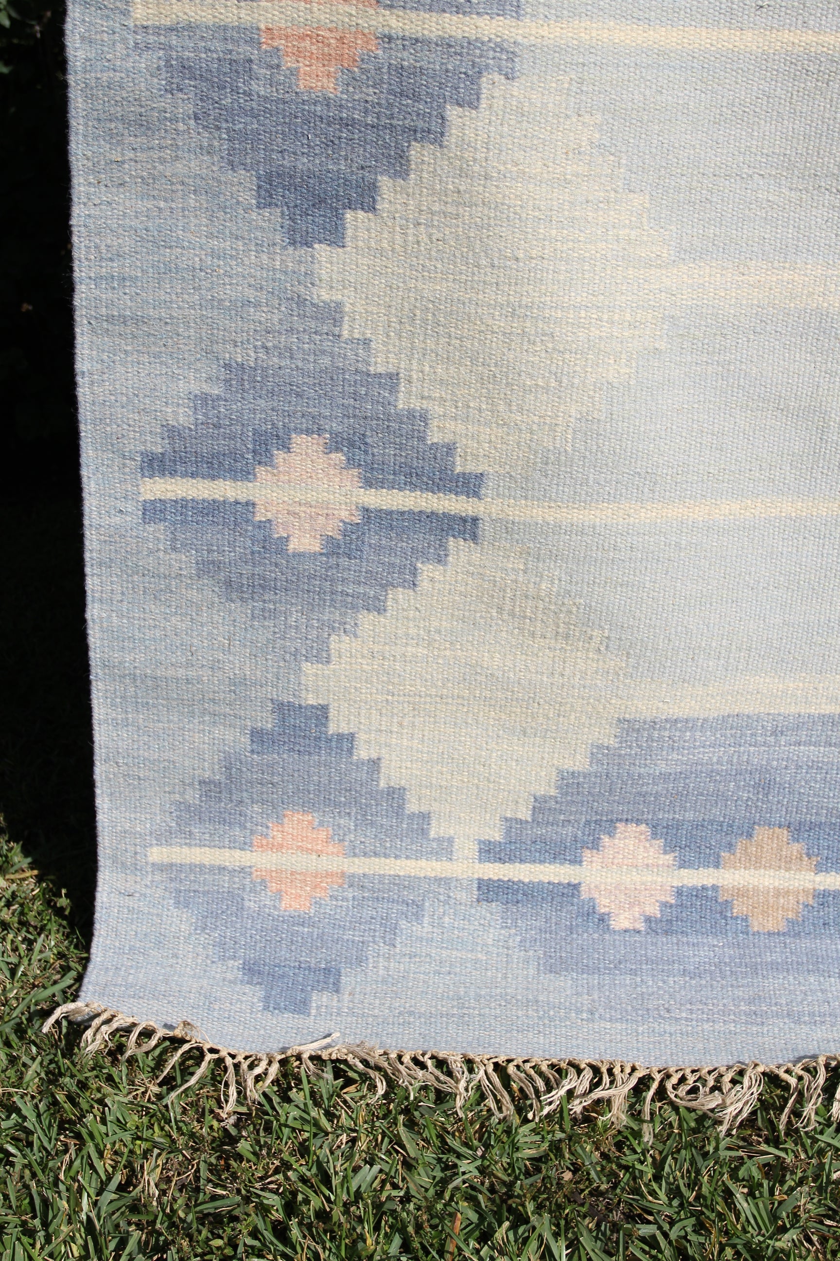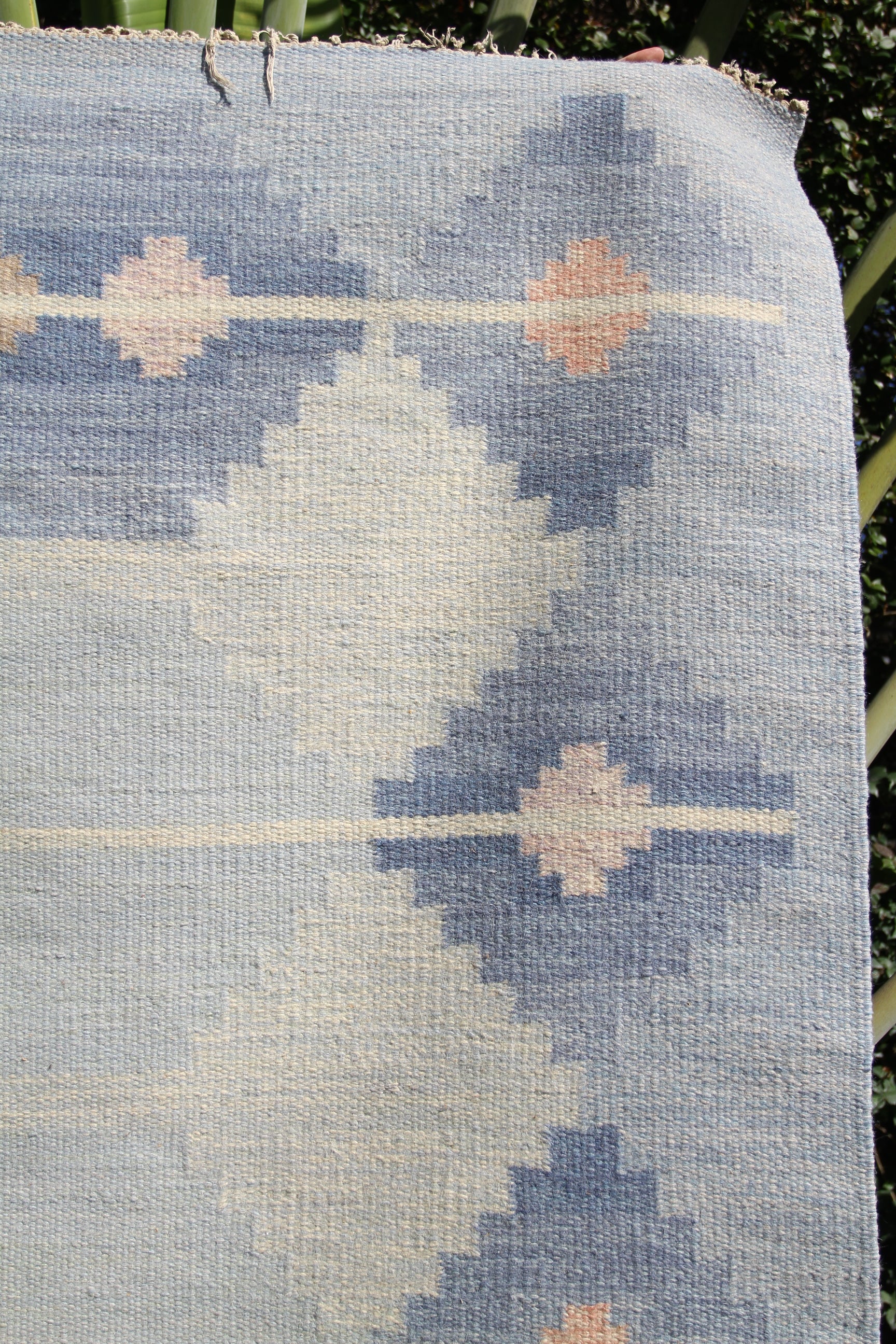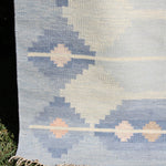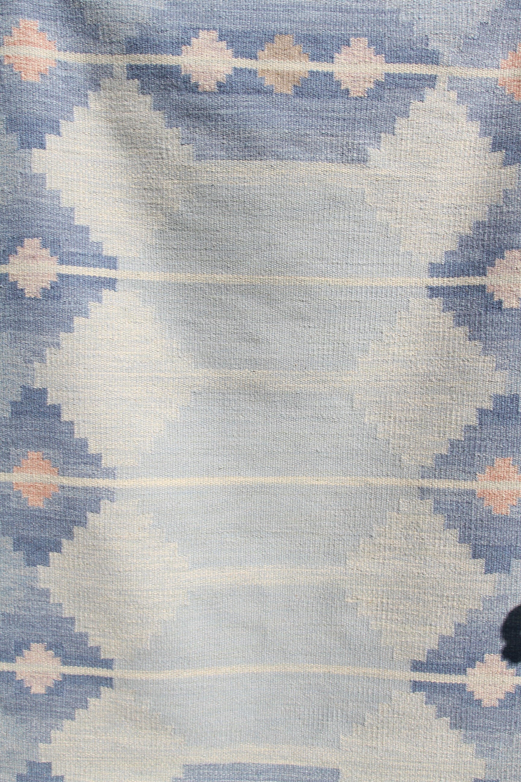 A rare 1940s Swedish flat-weave rug by Polly Björkman, composed in serene shades of sky blue, indigo, and muted rose. The design balances geometry and softness—rows of diamond medallions unfold across the field, their edges softened by Björkman’s characteristic use of tonal gradation. The restrained palette, punctuated by pale pink accents, gives the piece both harmony and liveliness, making it equally suited for modern interiors or traditional Scandinavian settings. Woven with wool, it reflects the enduring artistry of mid-century Swedish textile design, where craft, utility, and beauty converge seamlessly.