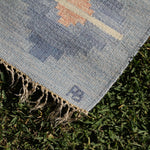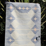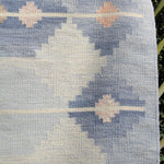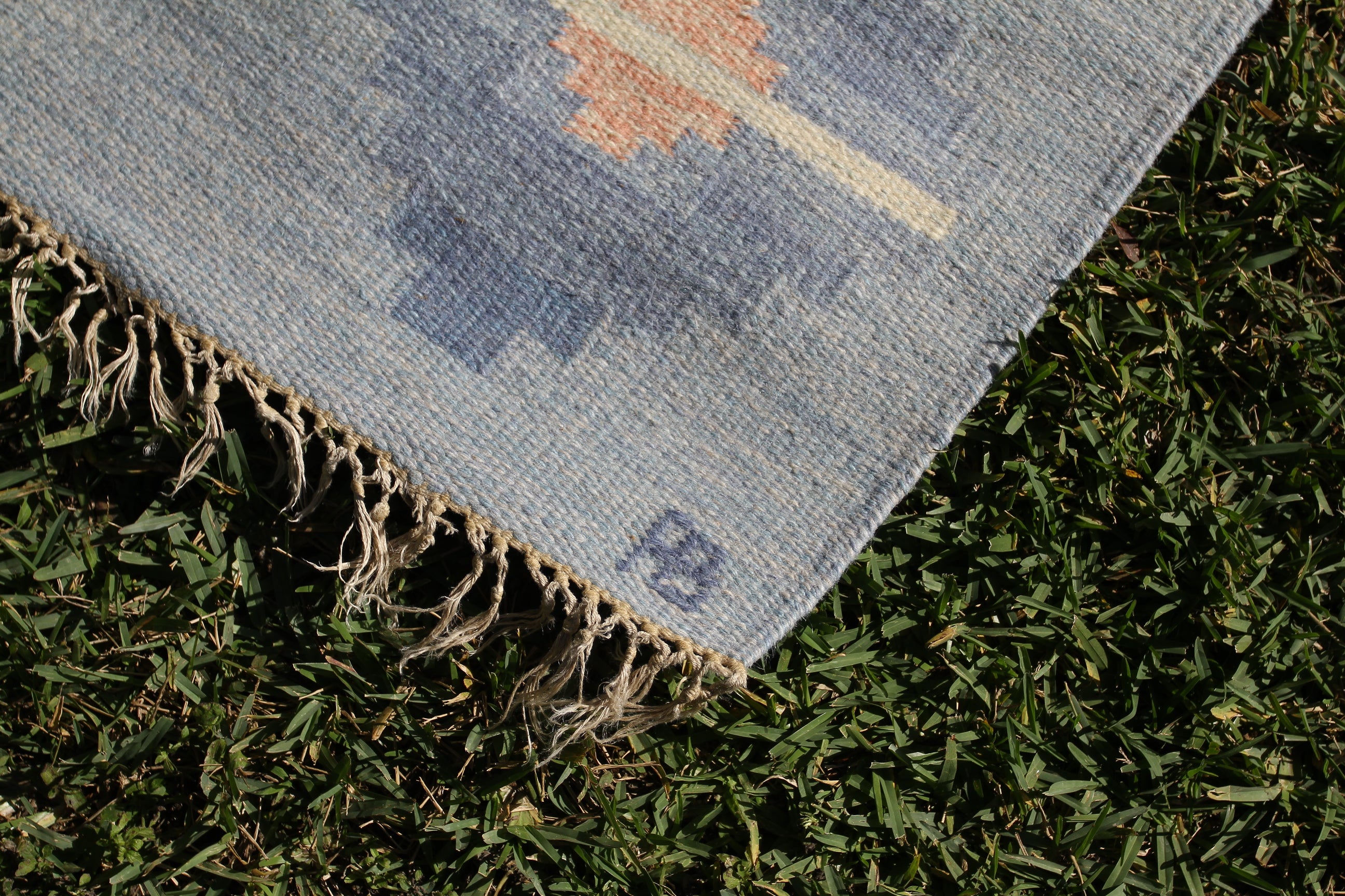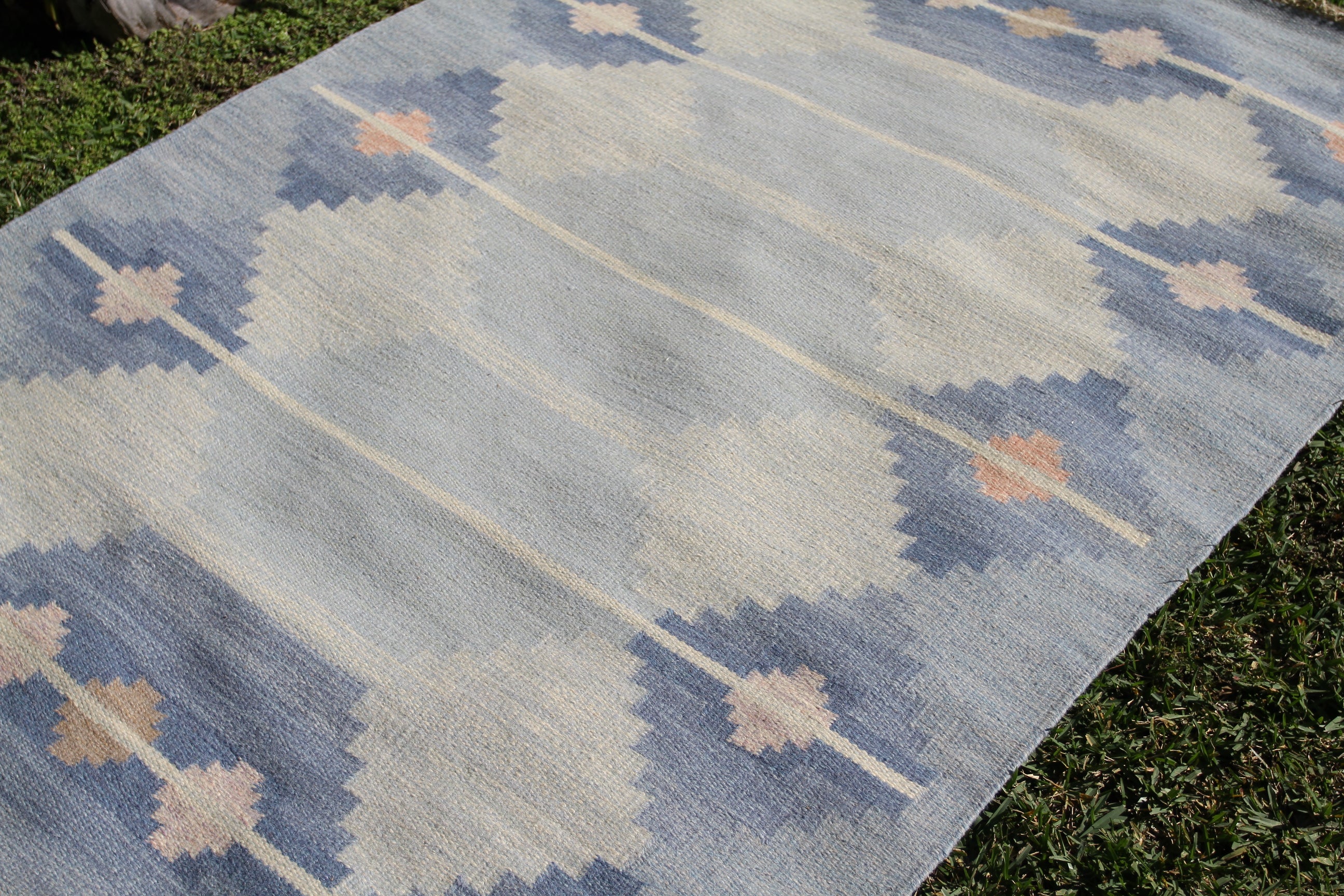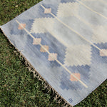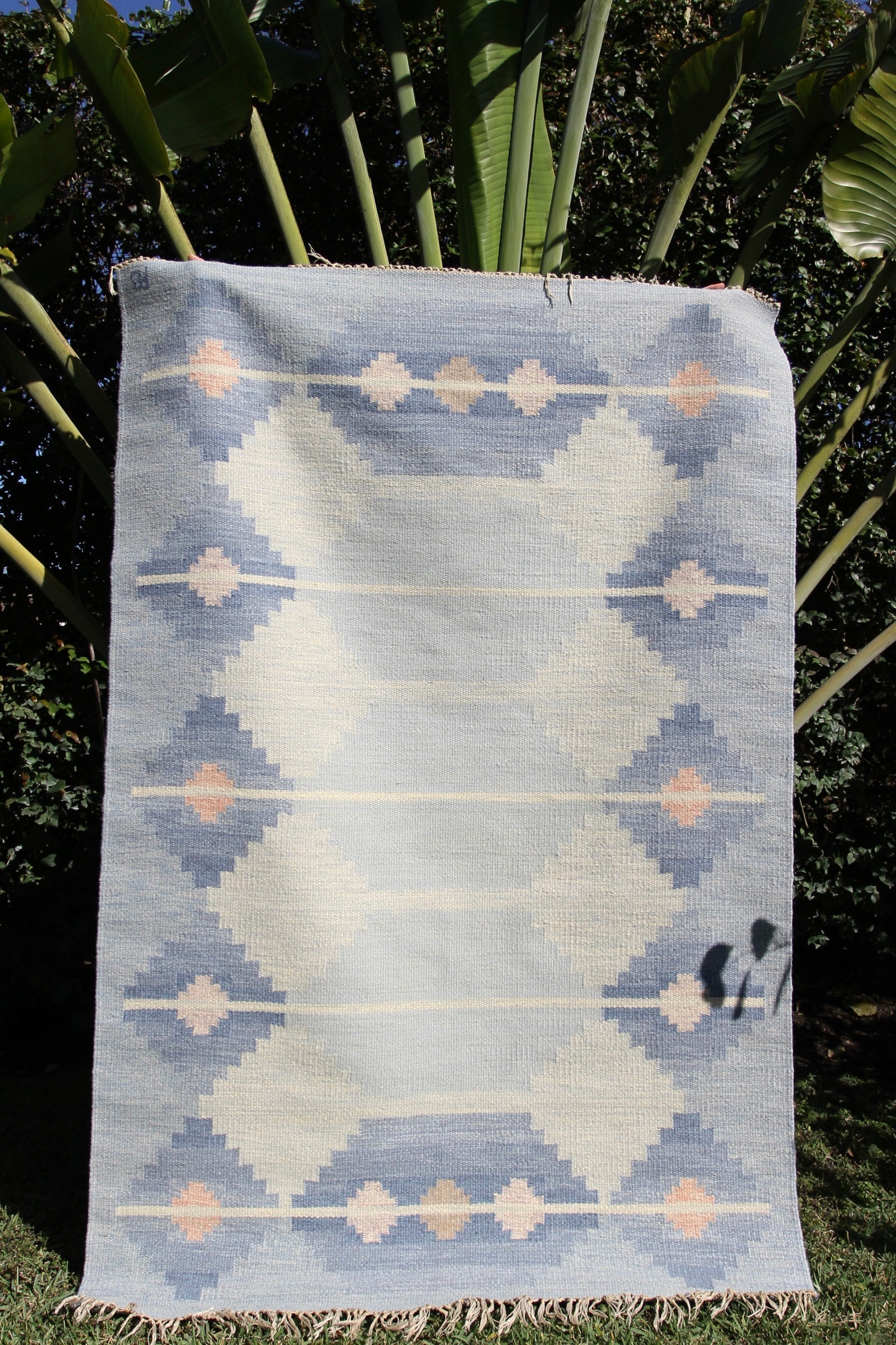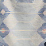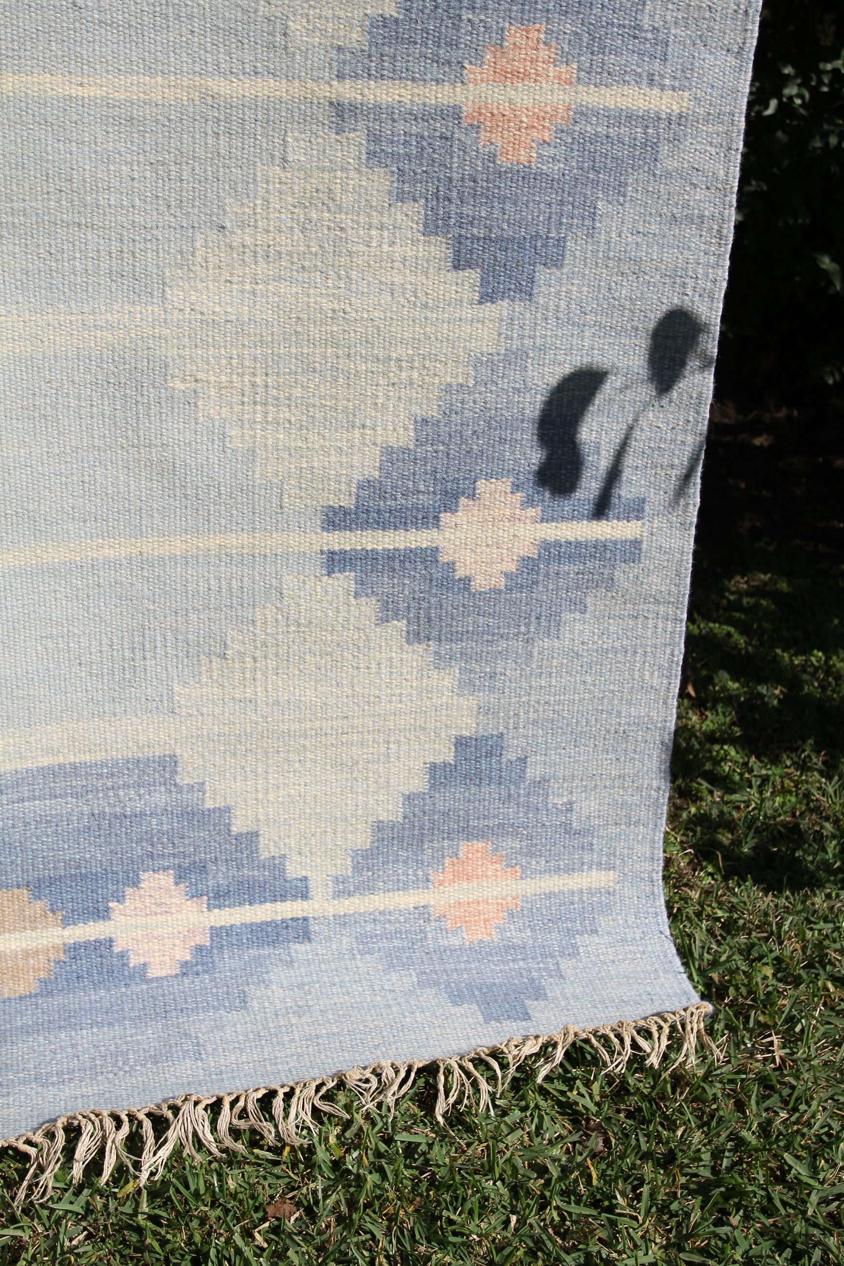 A rare 1940s Swedish flat-weave rug by Polly Björkman, composed in serene shades of sky blue, indigo, and muted rose. The design balances geometry and softness—rows of diamond medallions unfold across the field, their edges softened by Björkman’s characteristic use of tonal gradation. The restrained palette, punctuated by pale pink accents, gives the piece both harmony and liveliness, making it equally suited for modern interiors or traditional Scandinavian settings. Woven with wool, it reflects the enduring artistry of mid-century Swedish textile design, where craft, utility, and beauty converge seamlessly.
