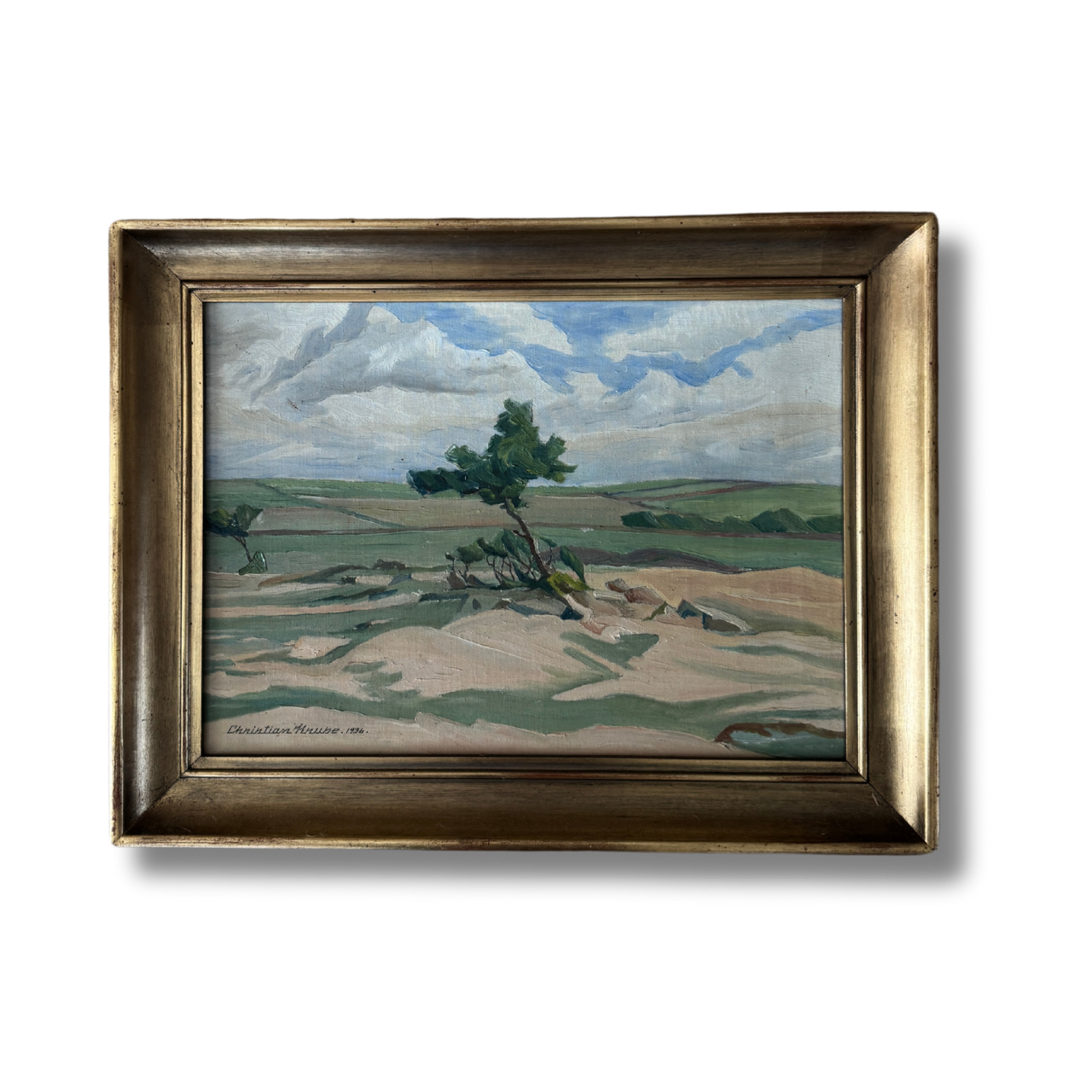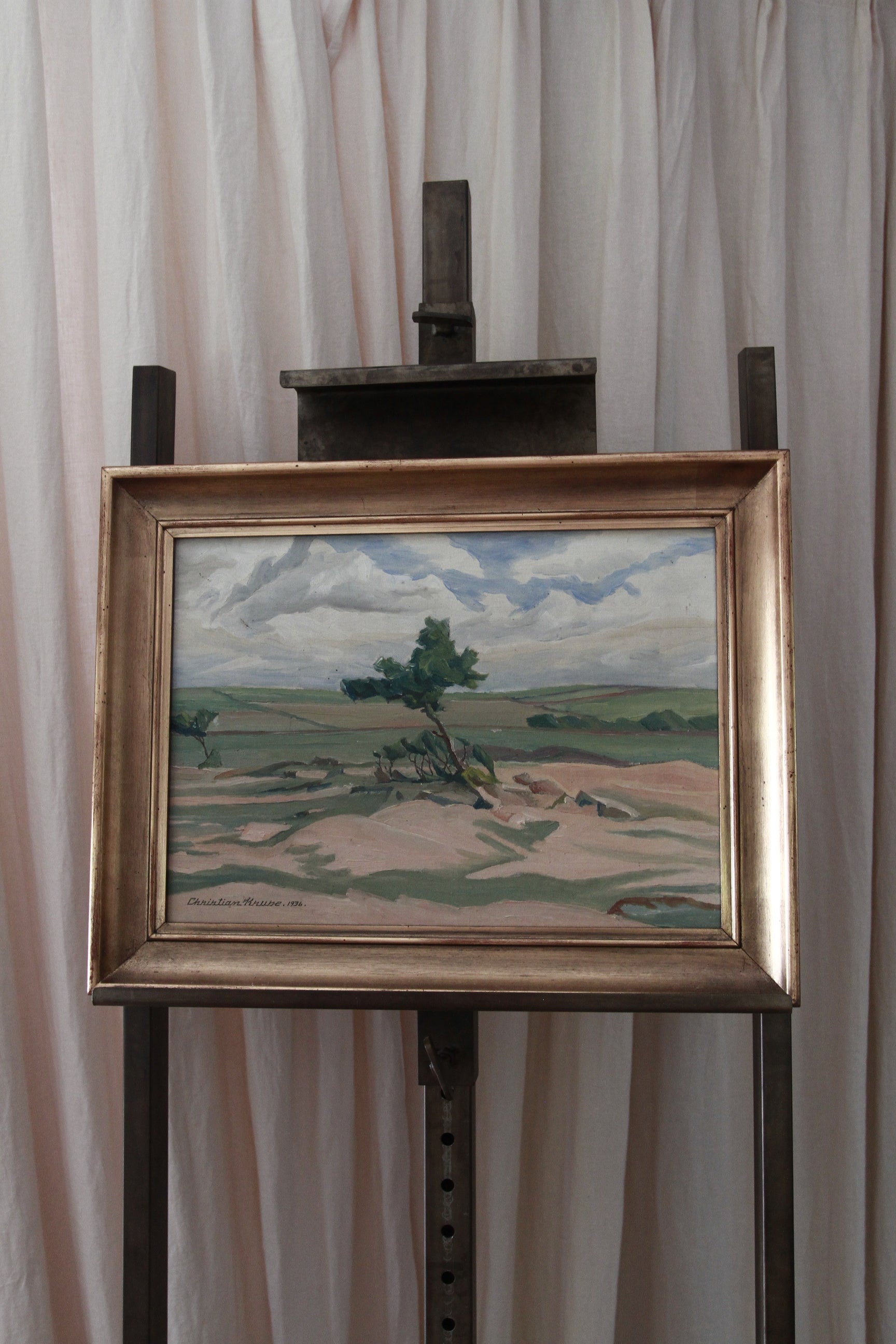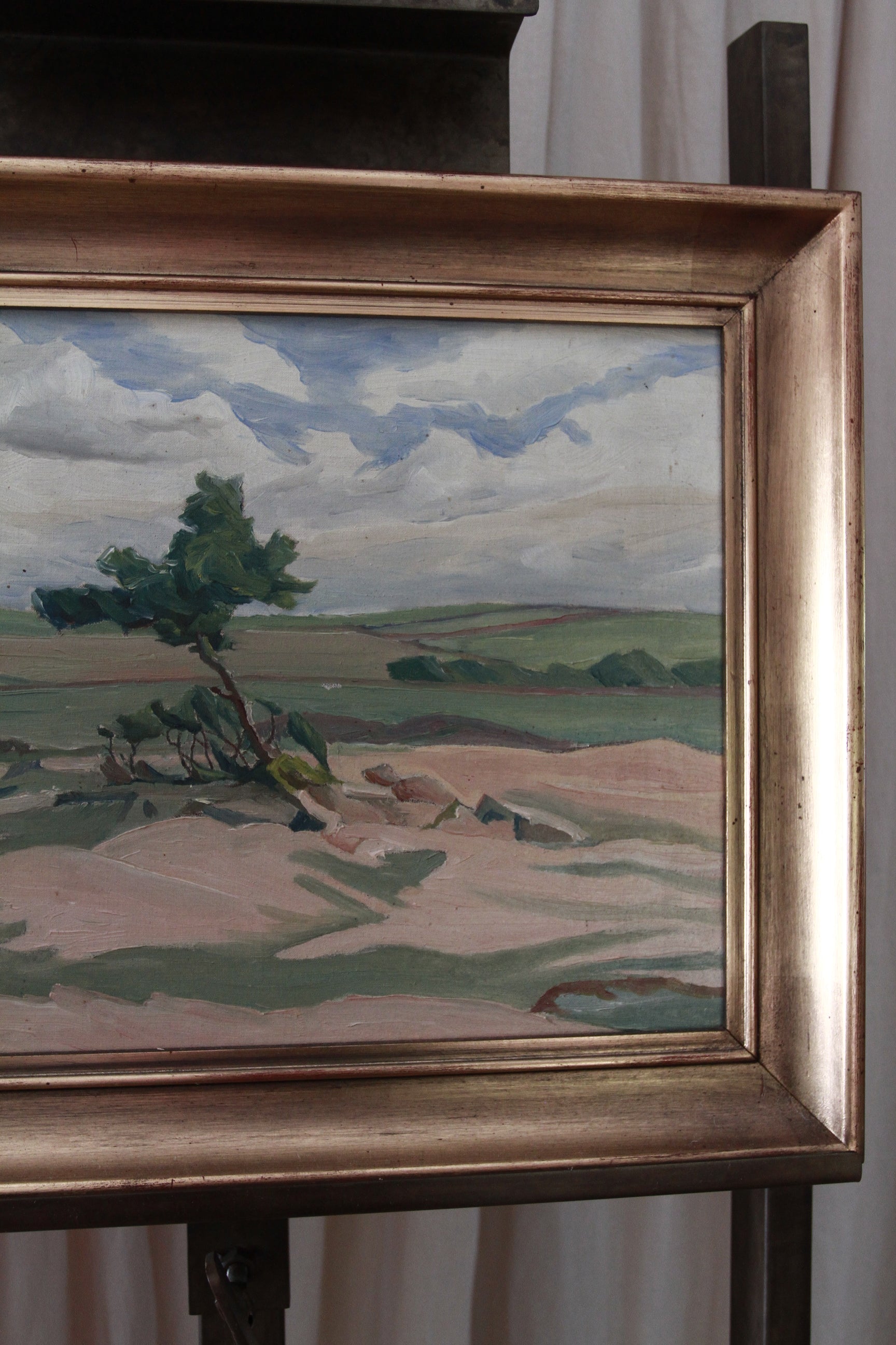 Painted in 1938 with an incredible signature, this piece is all atmosphere and restraint...a lone, wind-bent tree rising from a sandy or wheat-covered heath, surrounded by soft shadows and shifting skies. The palette is muted but purposeful: sage, stone, cloud-white, and hints of sea-glass green. There’s a quiet strength to the central form, standing resilient against the vast openness beyond. Framed in the original soft gold wood, the work carries the weight of a place deeply observed...a landscape rendered not just as it looks, but as it feels: honest, enduring, and slightly melancholic in the best way.
