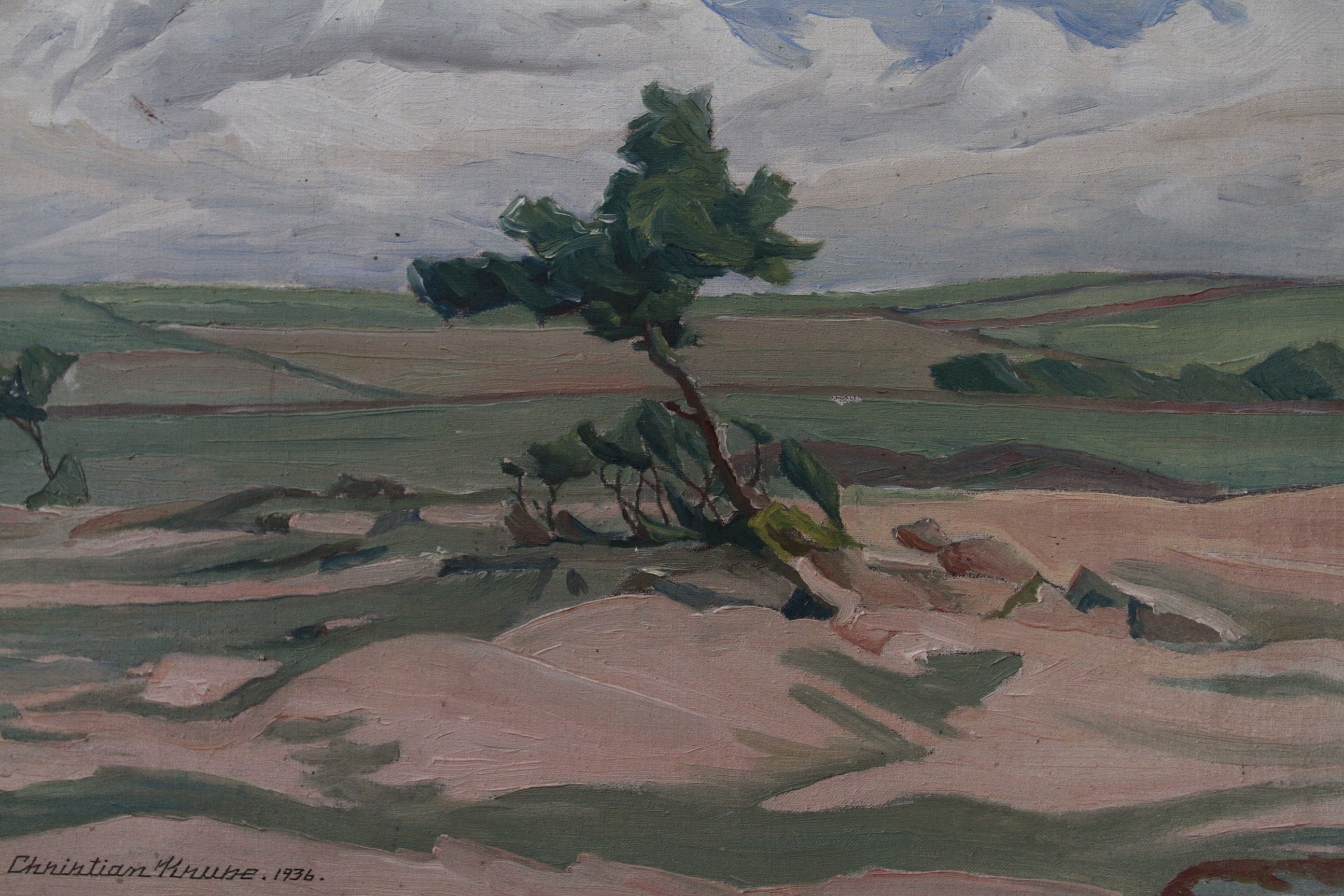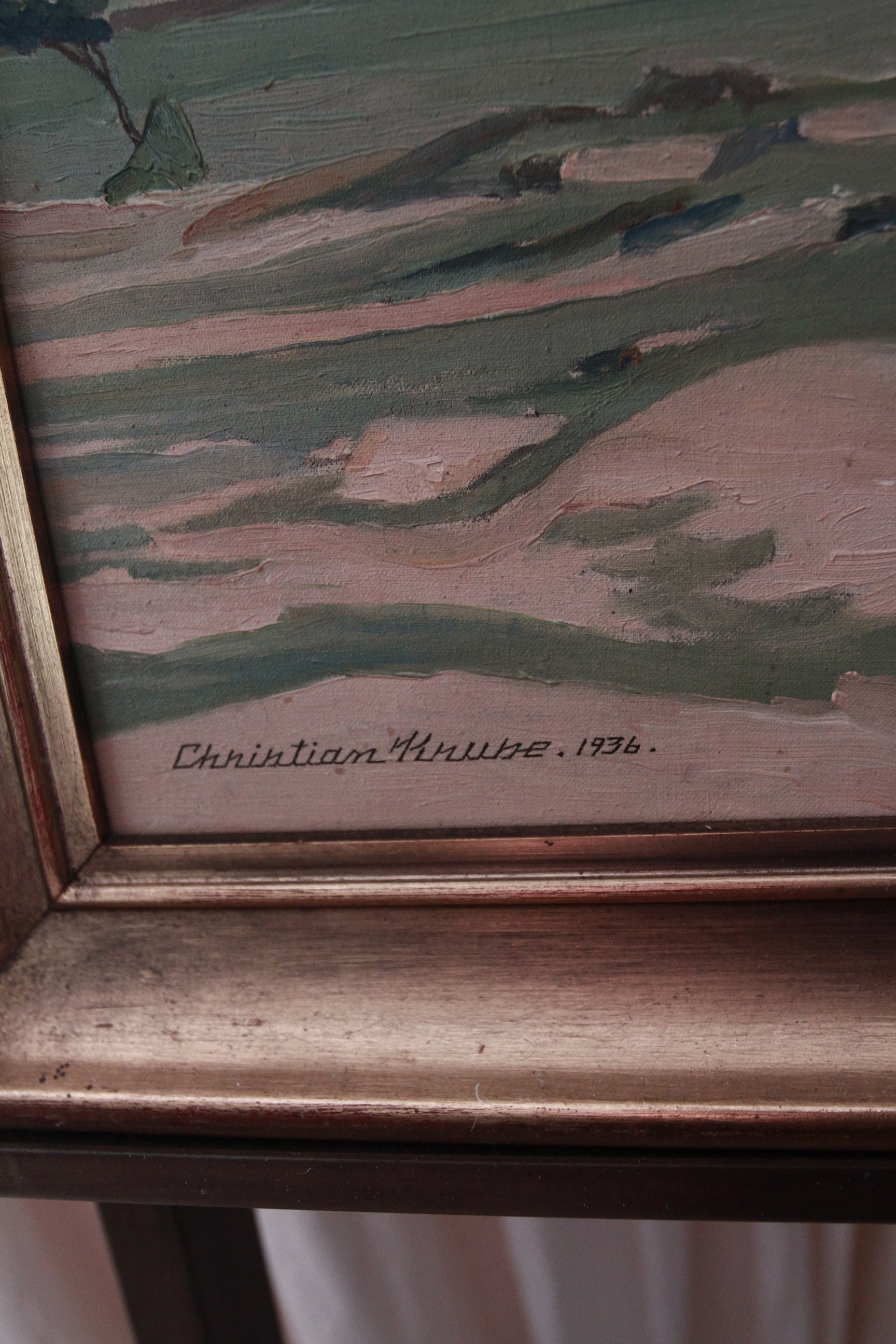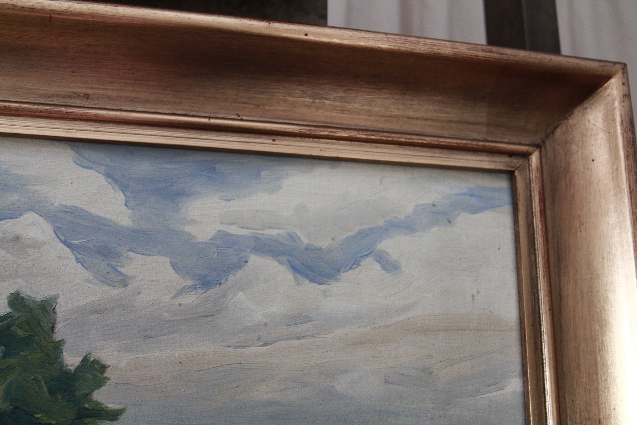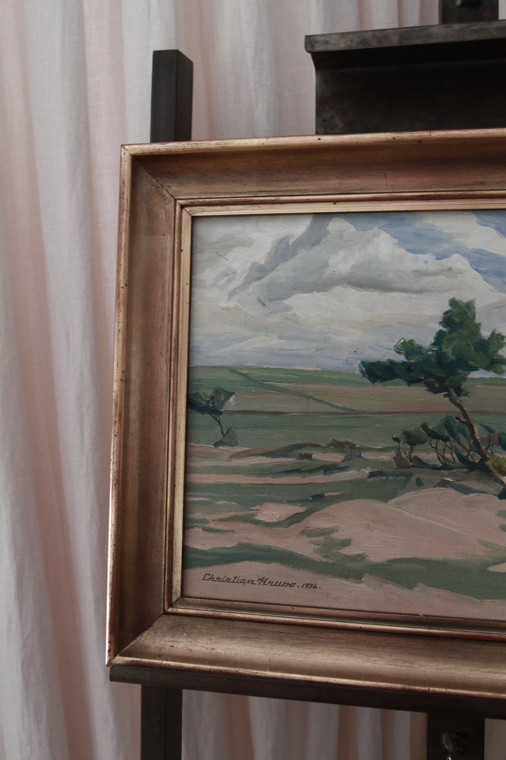 Painted in 1938 with an incredible signature, this piece is all atmosphere and restraint...a lone, wind-bent tree rising from a sandy or wheat-covered heath, surrounded by soft shadows and shifting skies. The palette is muted but purposeful: sage, stone, cloud-white, and hints of sea-glass green. There’s a quiet strength to the central form, standing resilient against the vast openness beyond. Framed in the original soft gold wood, the work carries the weight of a place deeply observed...a landscape rendered not just as it looks, but as it feels: honest, enduring, and slightly melancholic in the best way.