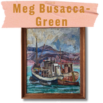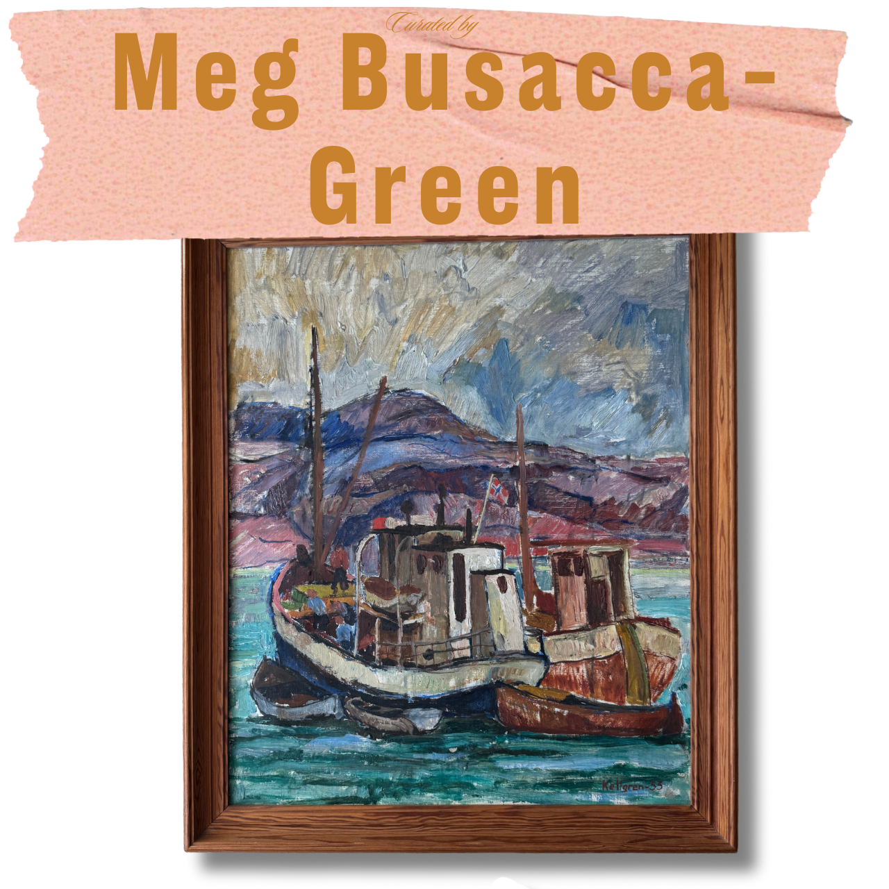A midcentury Scandinavian oil on canvas from 1953 depicts moored fishing boats set against a backdrop of rugged mountains and moving skies. The artist’s thick, confident brushstrokes capture both the solidity of the vessels and the swirling dynamism of sea and sky. A bold palette of teal, ochre, and rust-red enhances the raw drama of the Nordic coast, while the Norwegian flag punctuates the scene with a touch of identity. Framed in a warm-toned pine wood, the work radiates both strength and atmosphere, a life shaped by the sea.