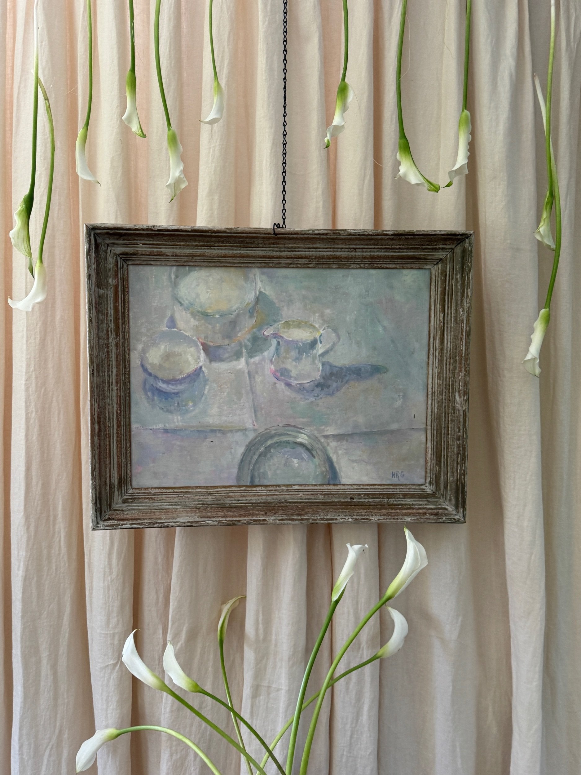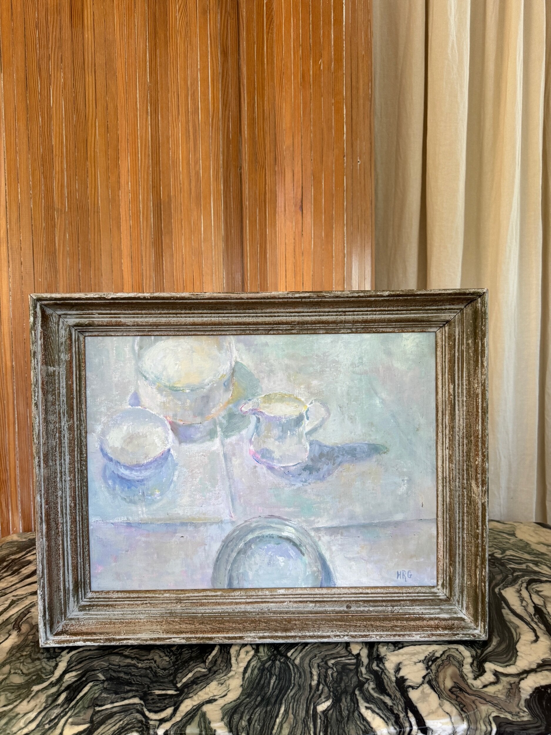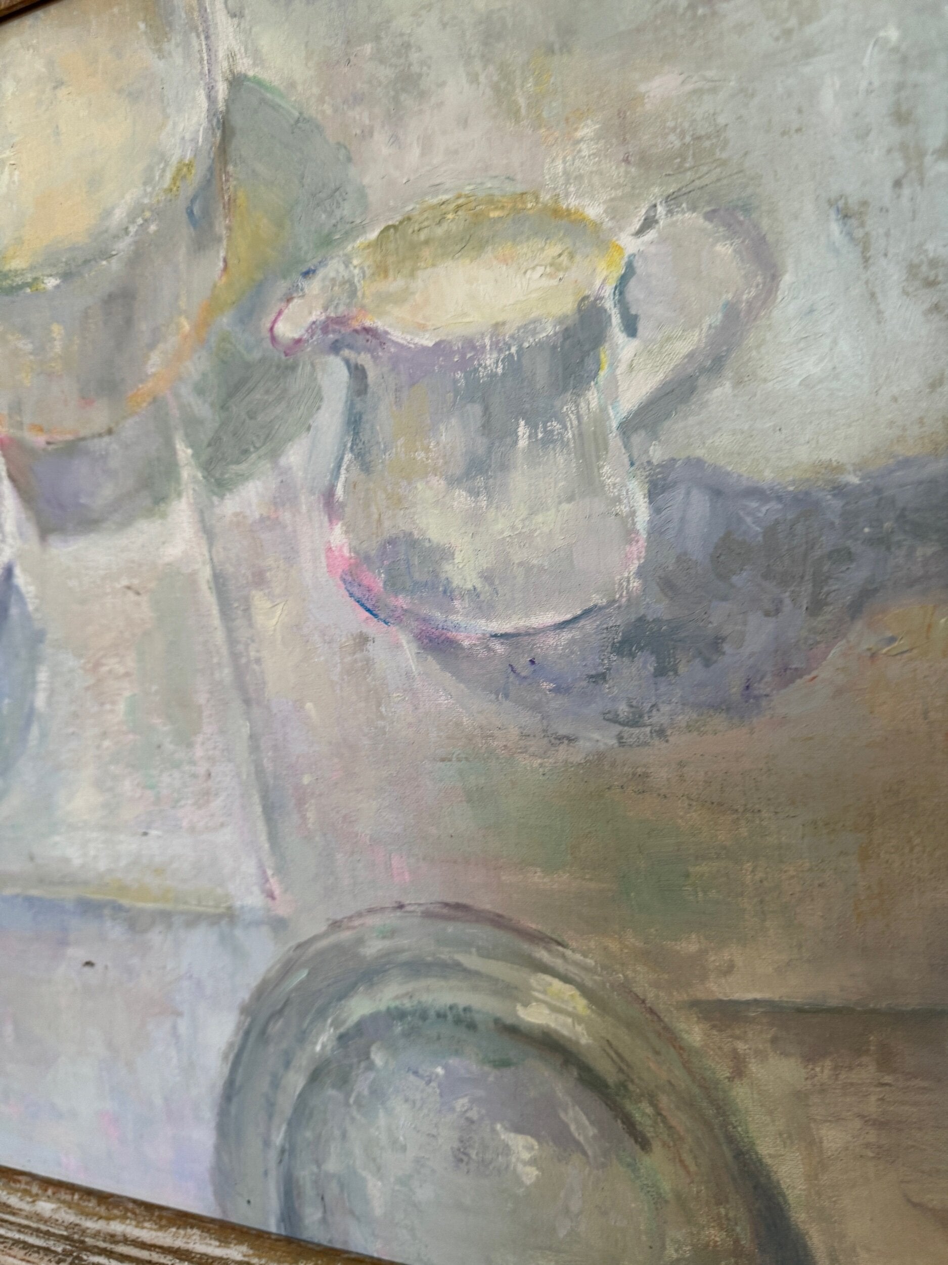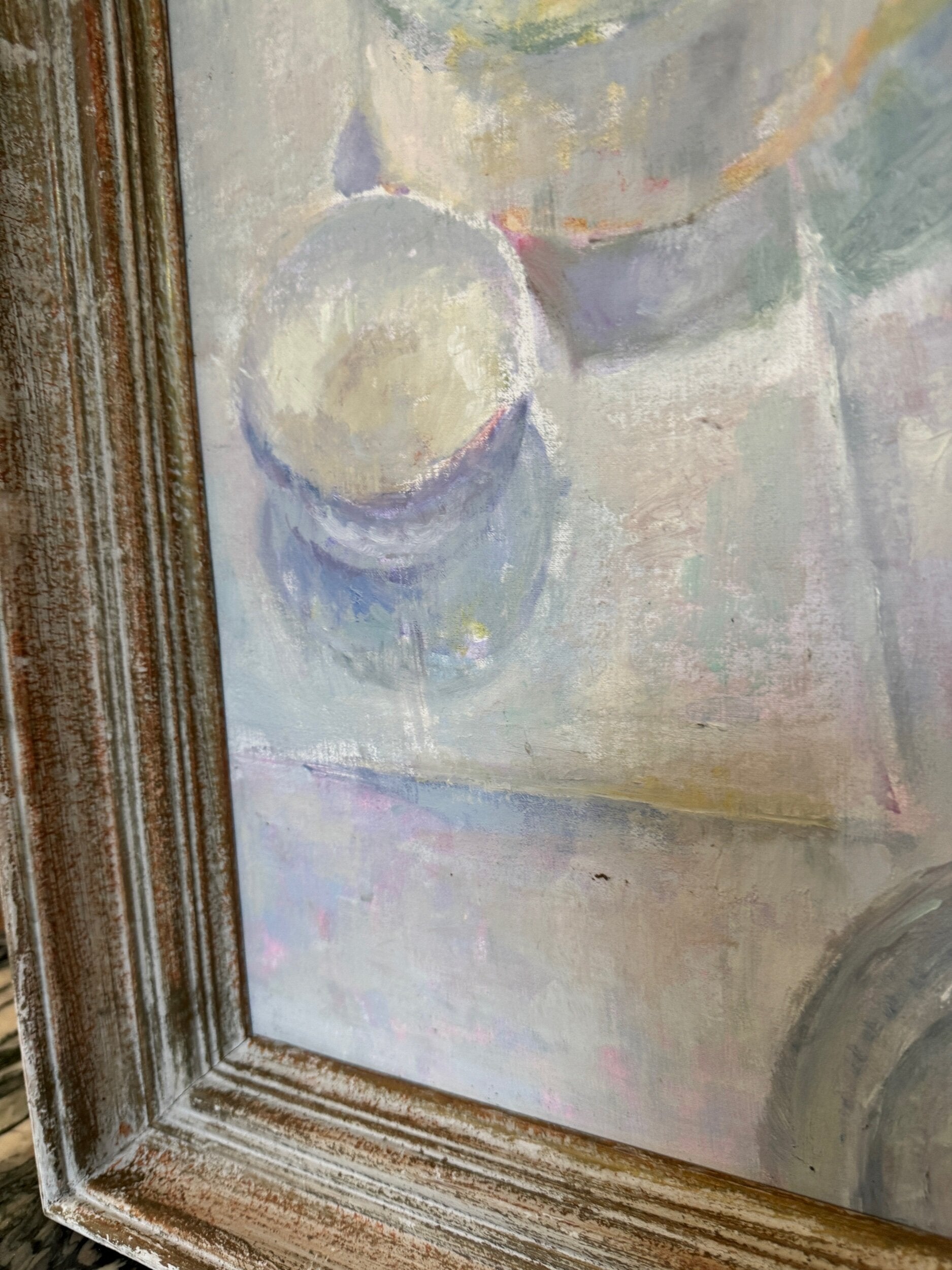 This oil on canvas transforms the simplest of table settings into a study of light and atmosphere. Bowls, a jug, and a plate are rendered in the softest palette of whites, silvers, and pale pastels, their forms dissolving gently into one another as though veiled in morning light. Subtle touches of rose, lavender, and lemon flicker across the surfaces, giving the work a shimmering quality that feels both ethereal and grounded. Framed in weathered wood, the piece captures a timeless elegance, an ode to restraint, intimacy, and the quiet beauty of everyday rituals.