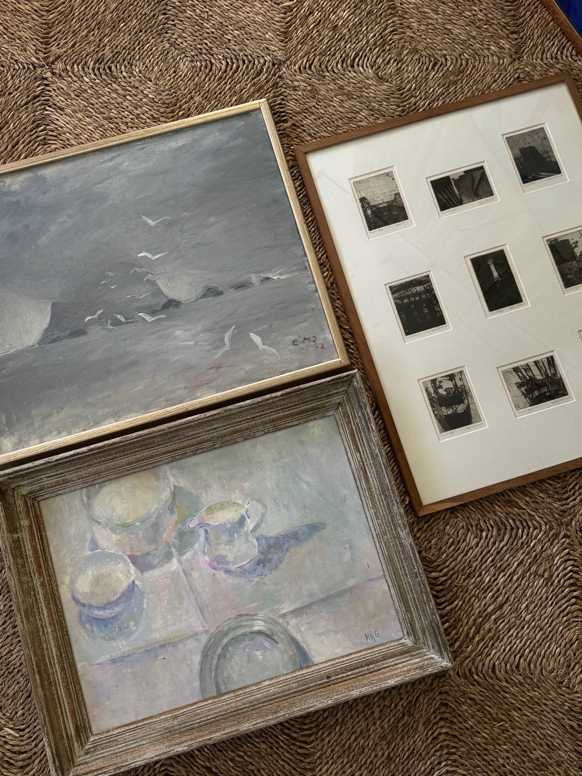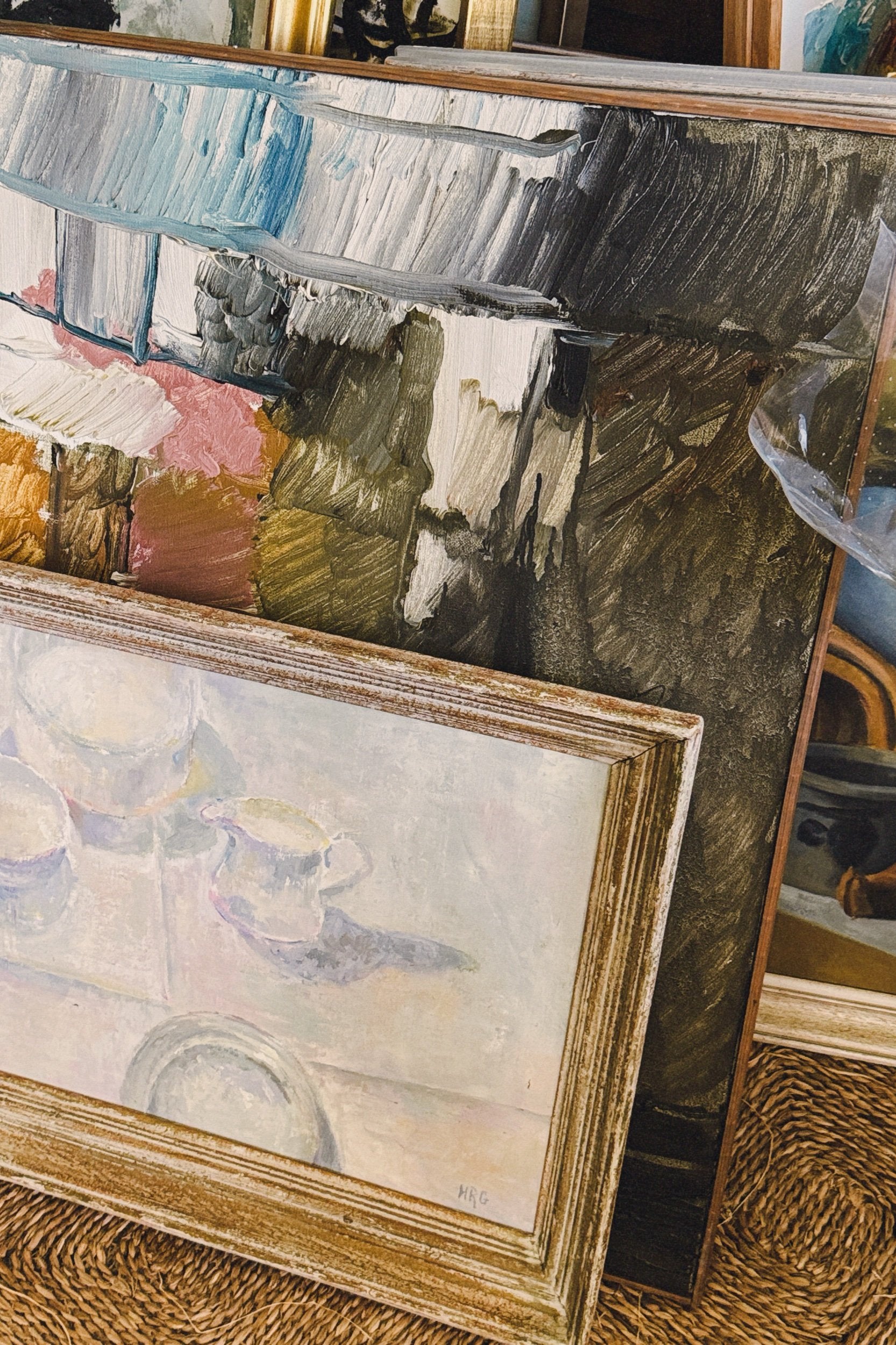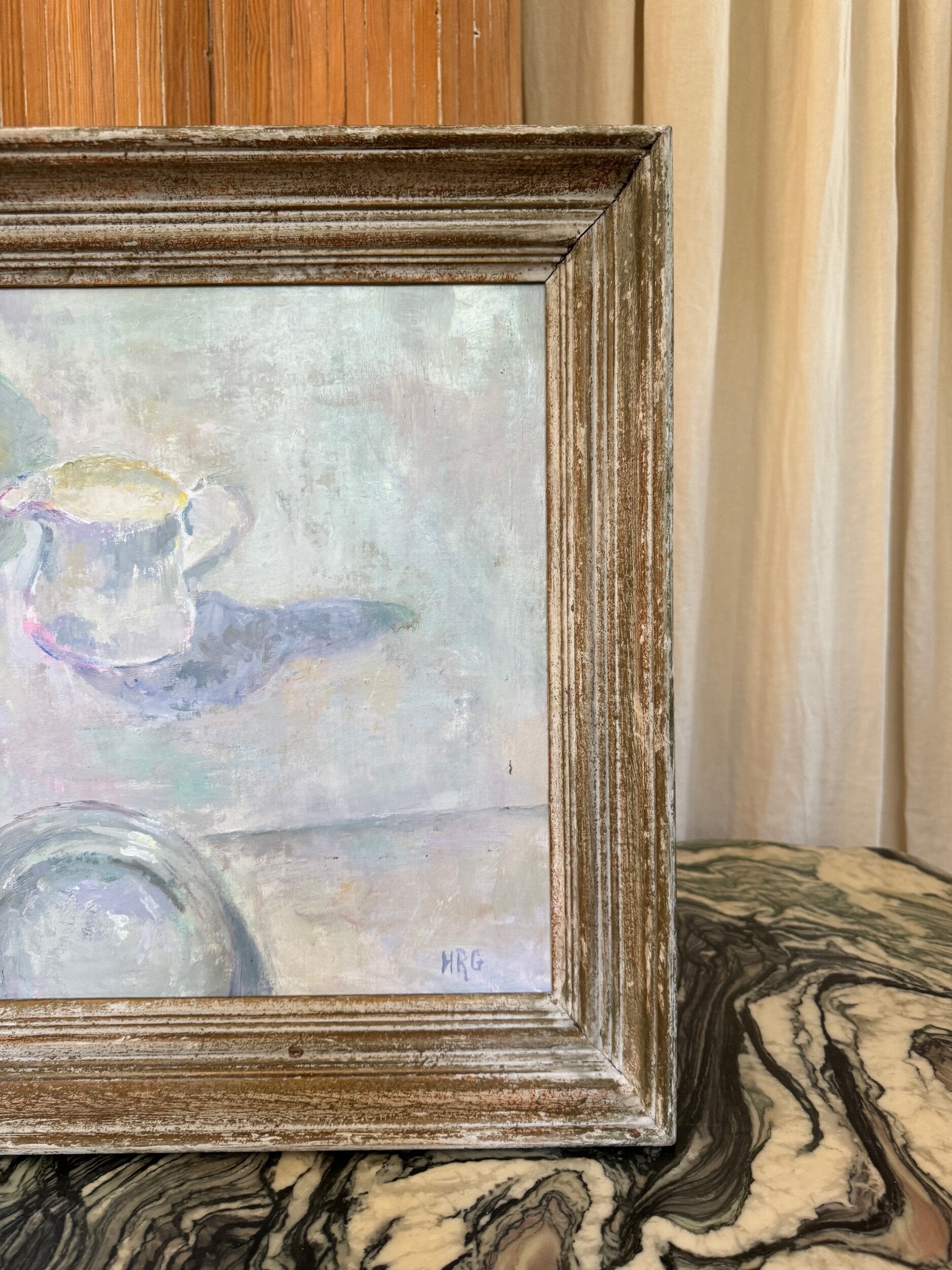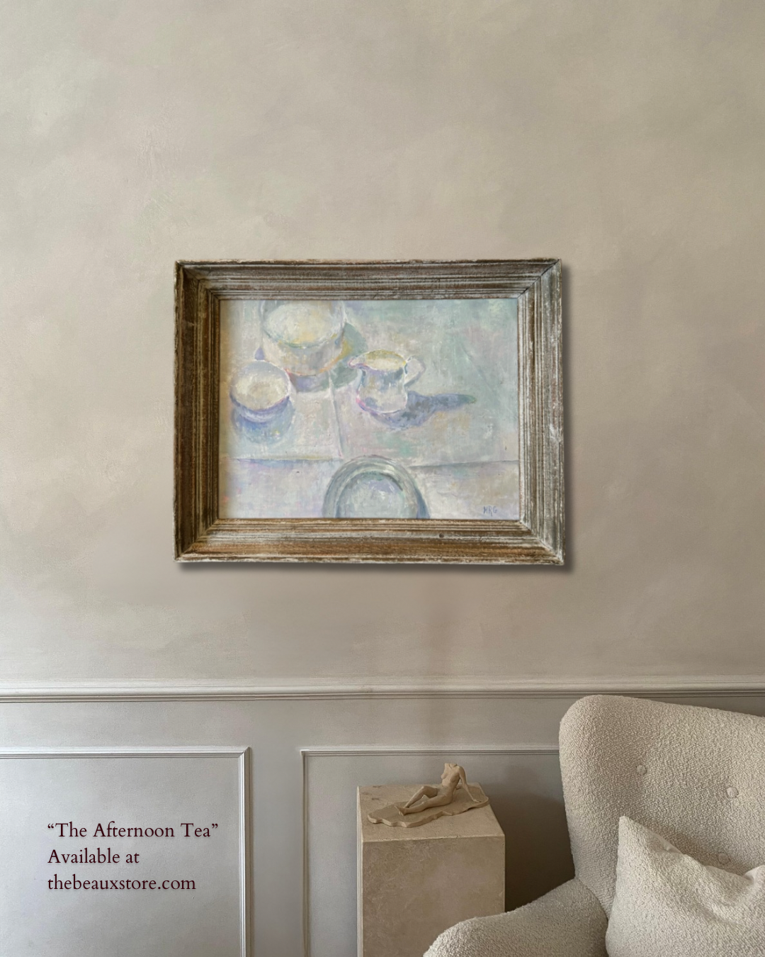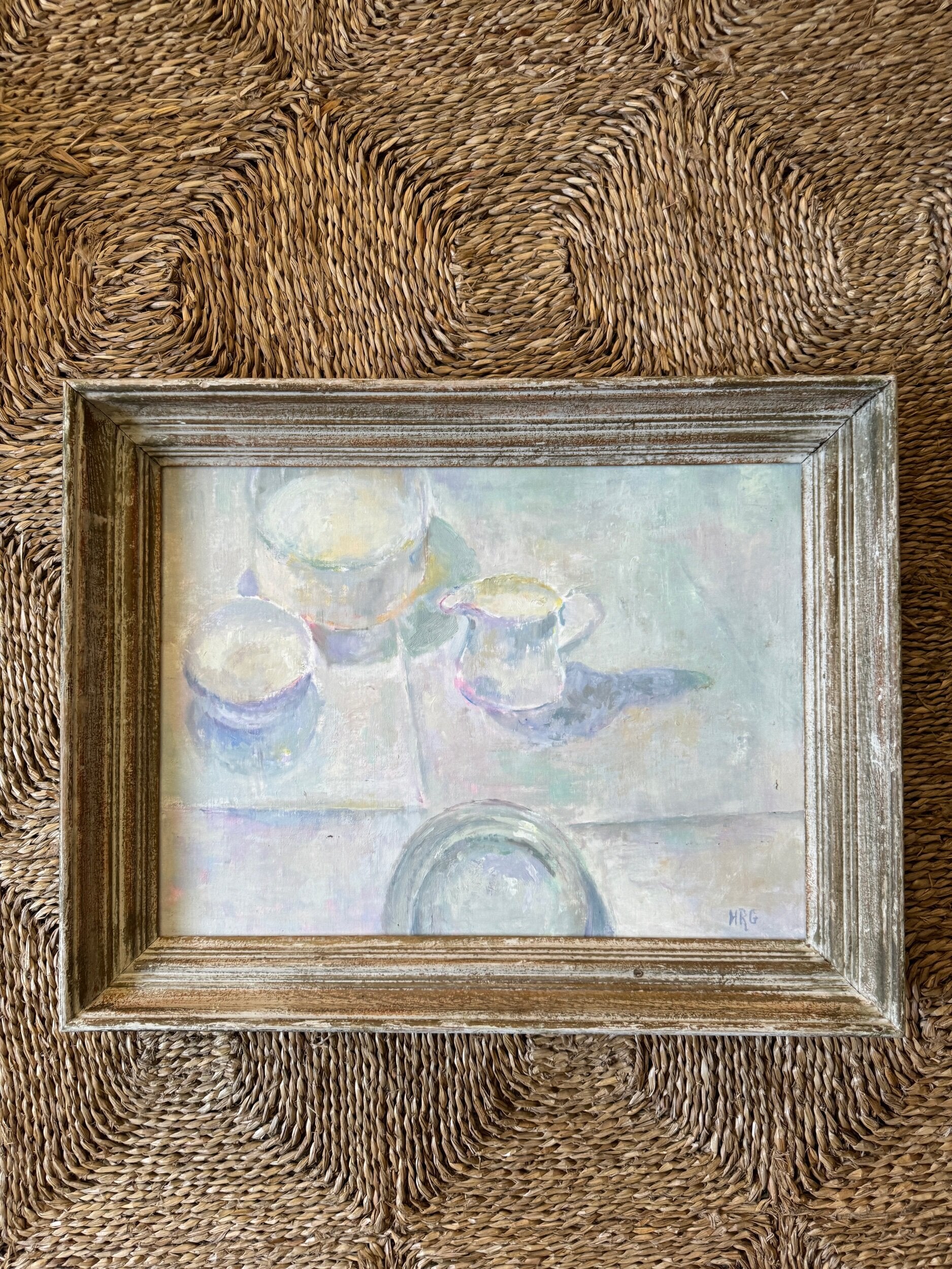 This oil on canvas transforms the simplest of table settings into a study of light and atmosphere. Bowls, a jug, and a plate are rendered in the softest palette of whites, silvers, and pale pastels, their forms dissolving gently into one another as though veiled in morning light. Subtle touches of rose, lavender, and lemon flicker across the surfaces, giving the work a shimmering quality that feels both ethereal and grounded. Framed in weathered wood, the piece captures a timeless elegance, an ode to restraint, intimacy, and the quiet beauty of everyday rituals.