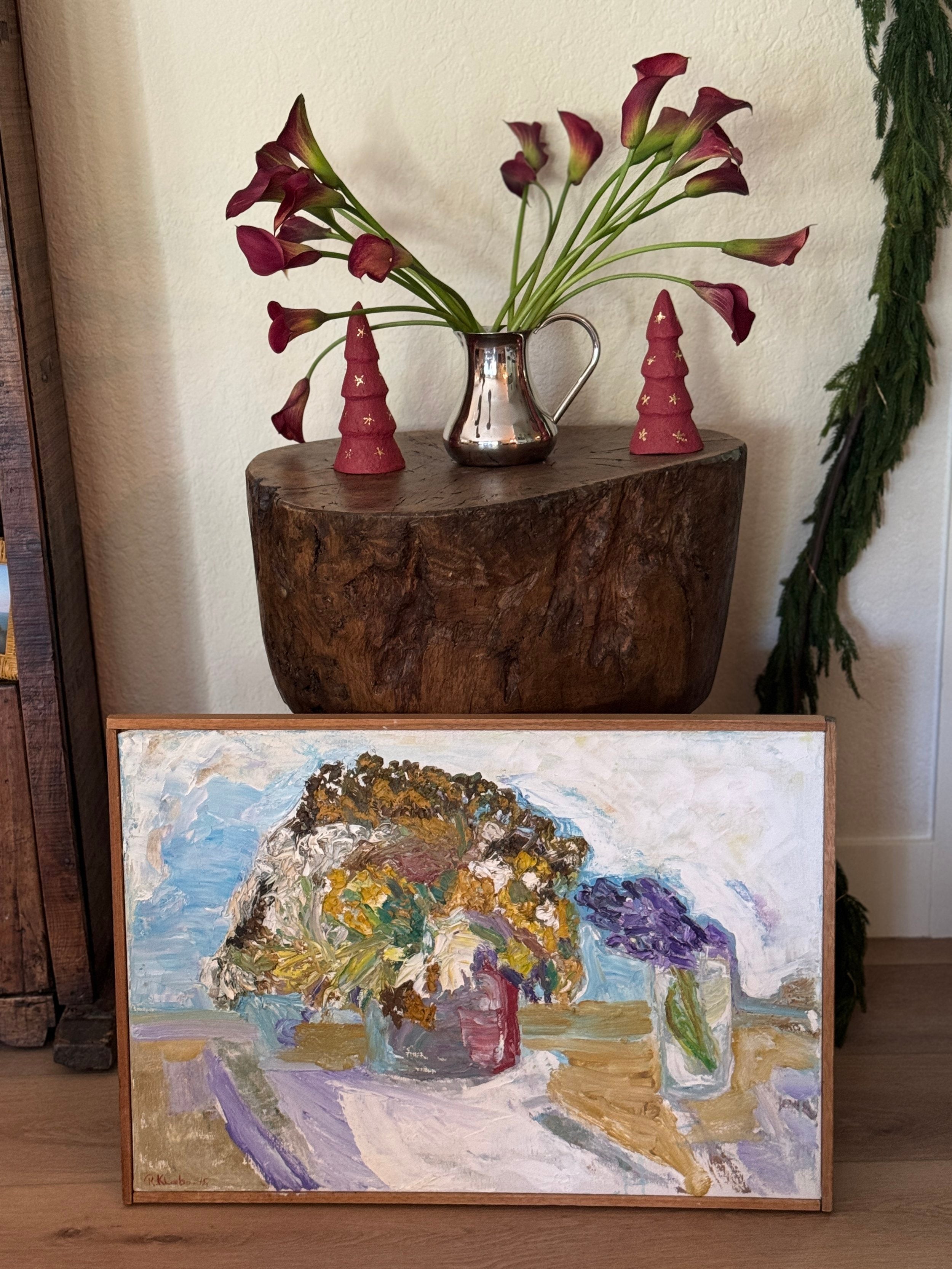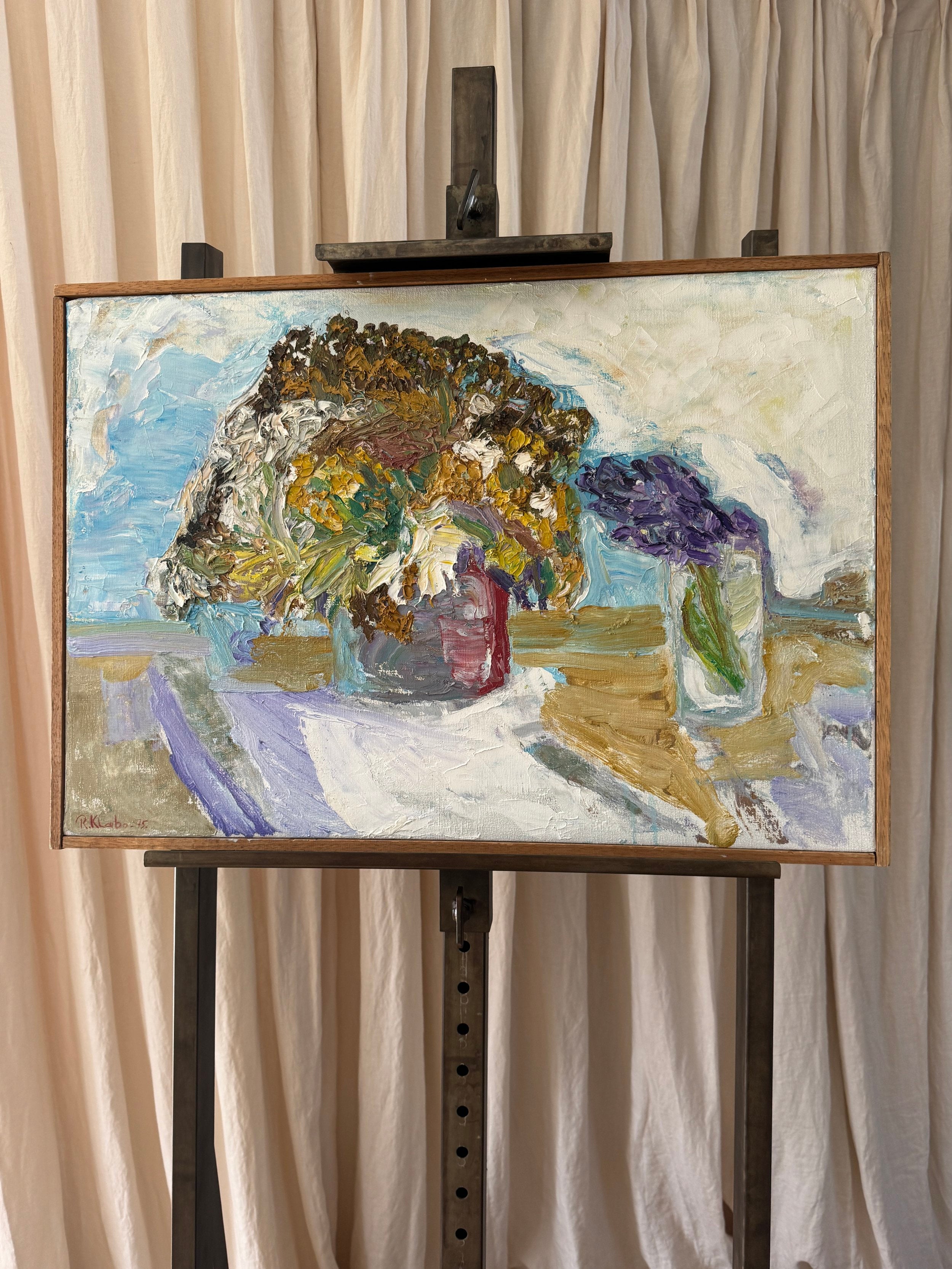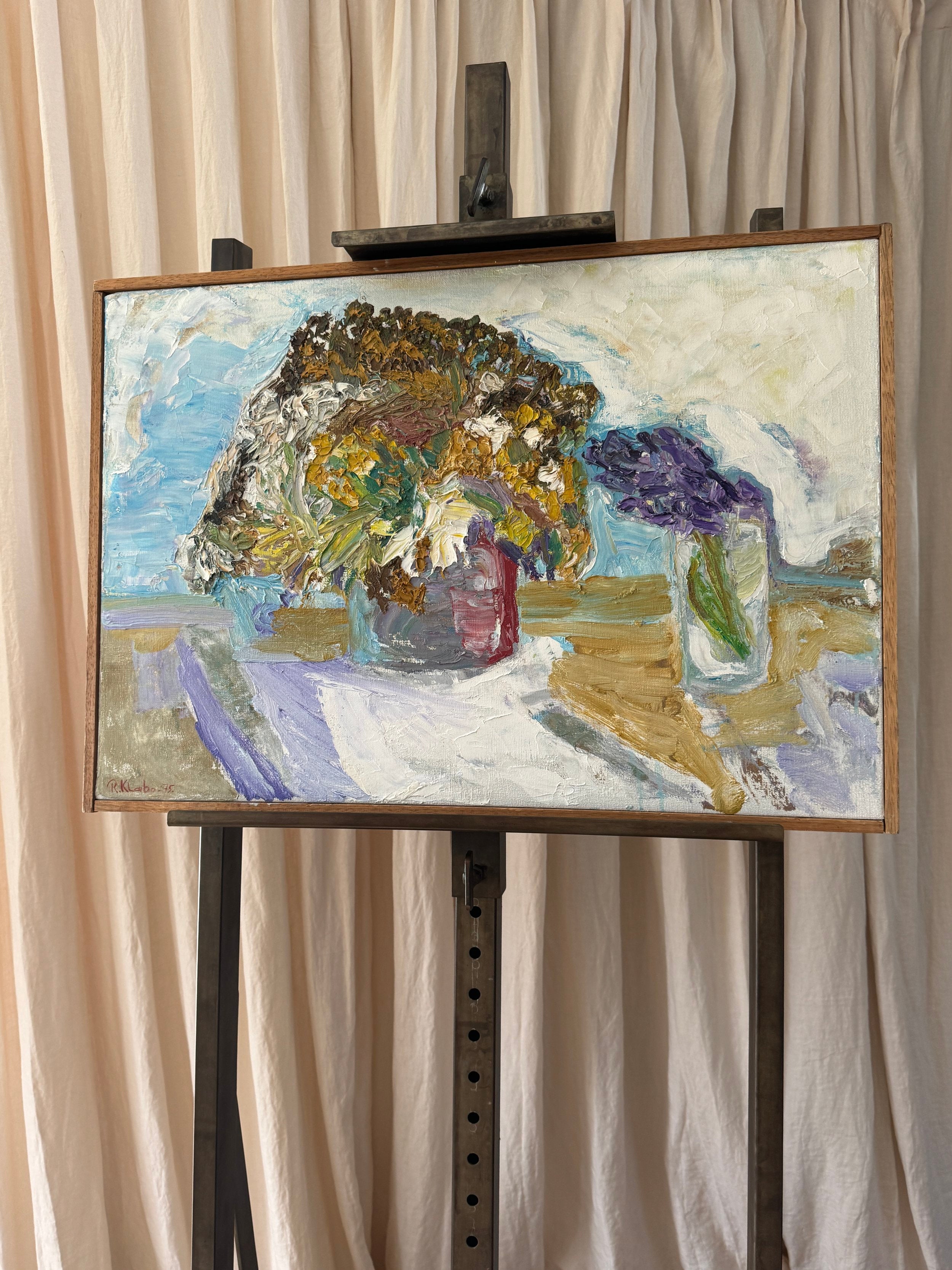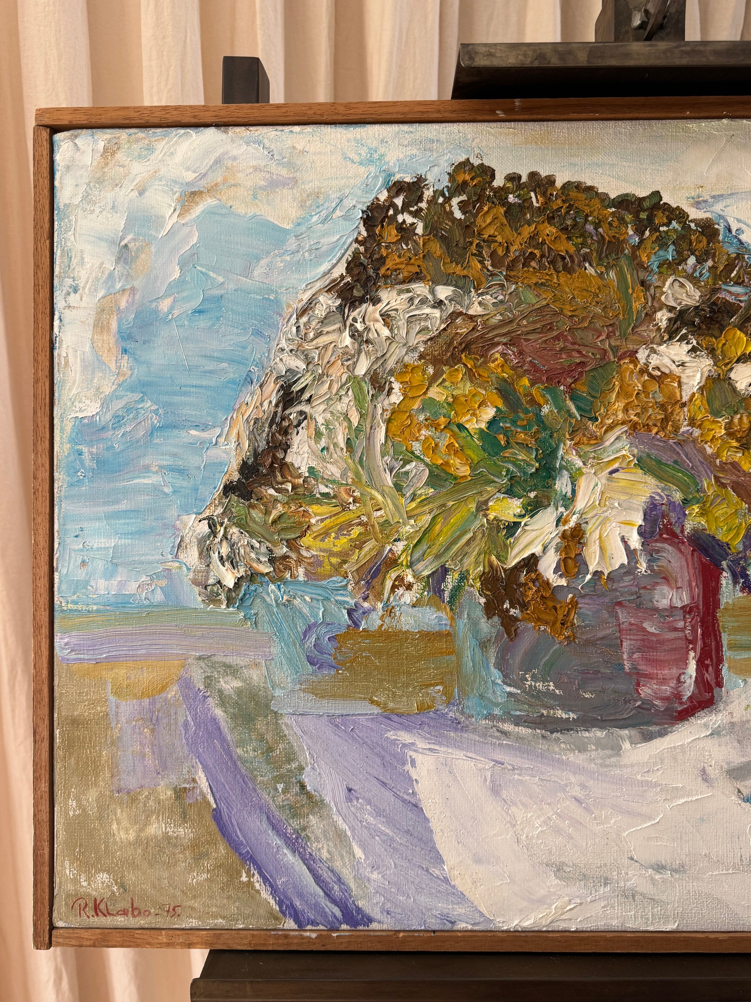 A luminous embodiment of Swedish modernism, this large-scale 1975 oil painting commands attention with its bold, impasto-heavy brushwork and a rich palette that feels both grounded and romantic. The textured impasto draws the eye into a dynamic interplay of light and shadow, evoking the organic beauty of a sun-drenched still life. Set within its original artist’s oak frame, the piece strikes the perfect balance between rustic warmth and contemporary sophistication. Everlasting flowers to be enjoyed for generations to come!