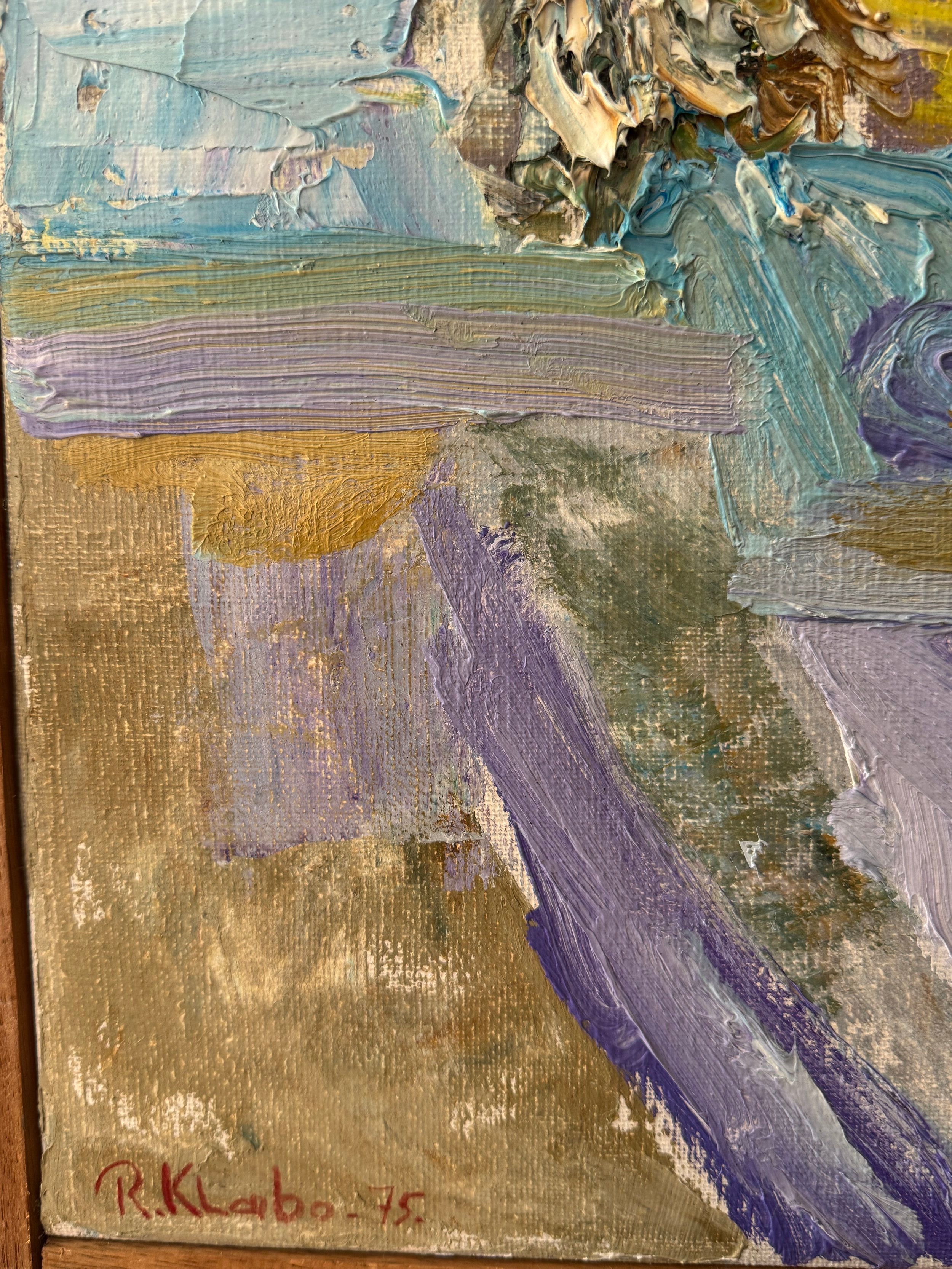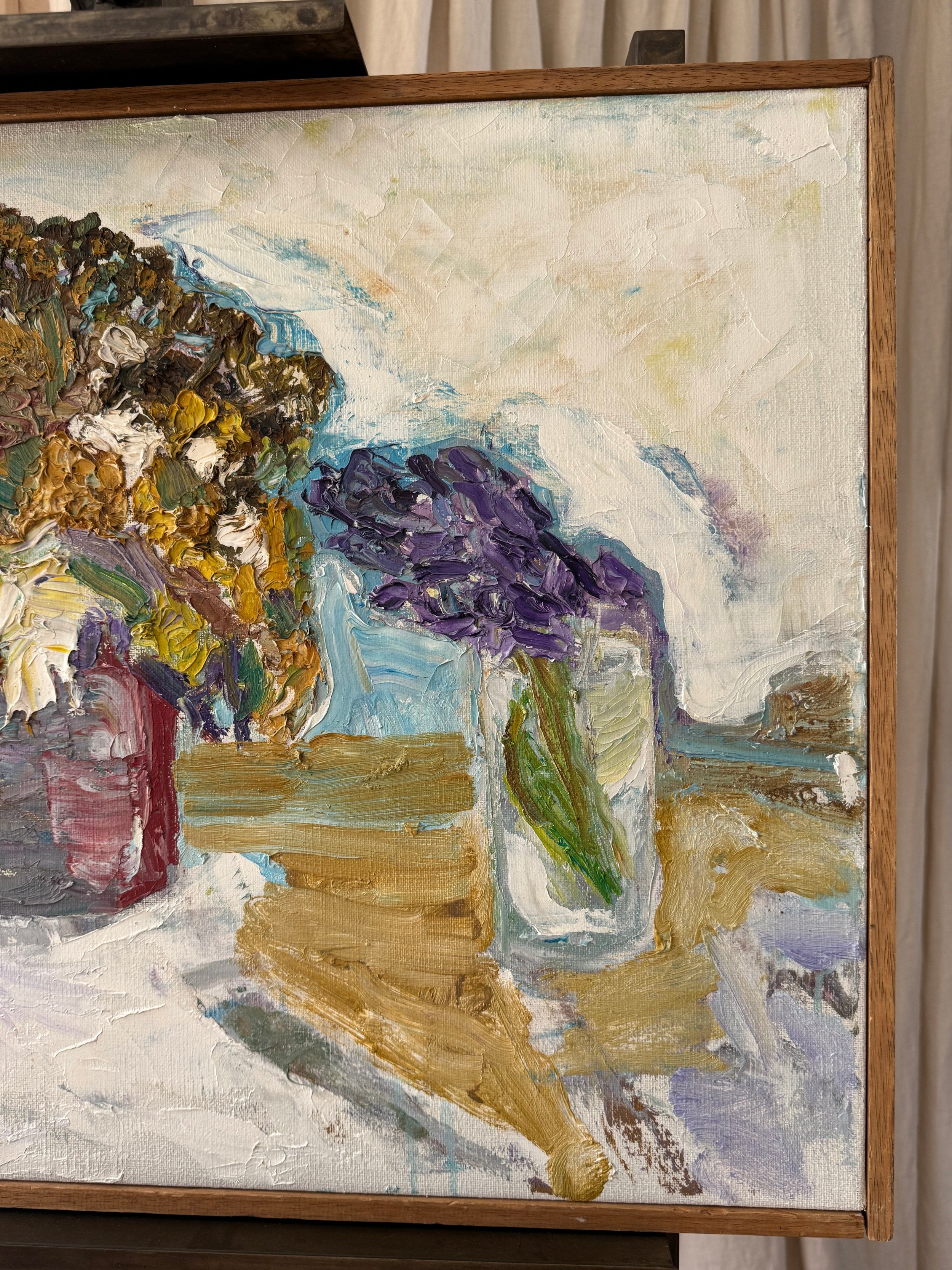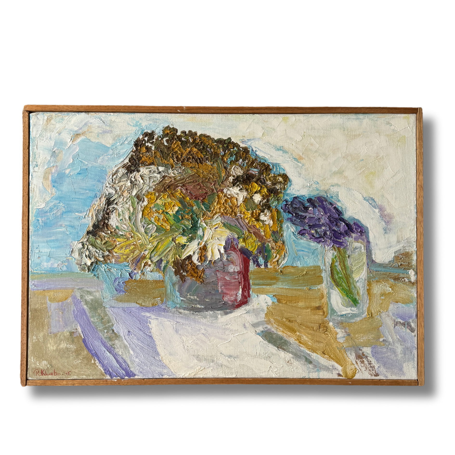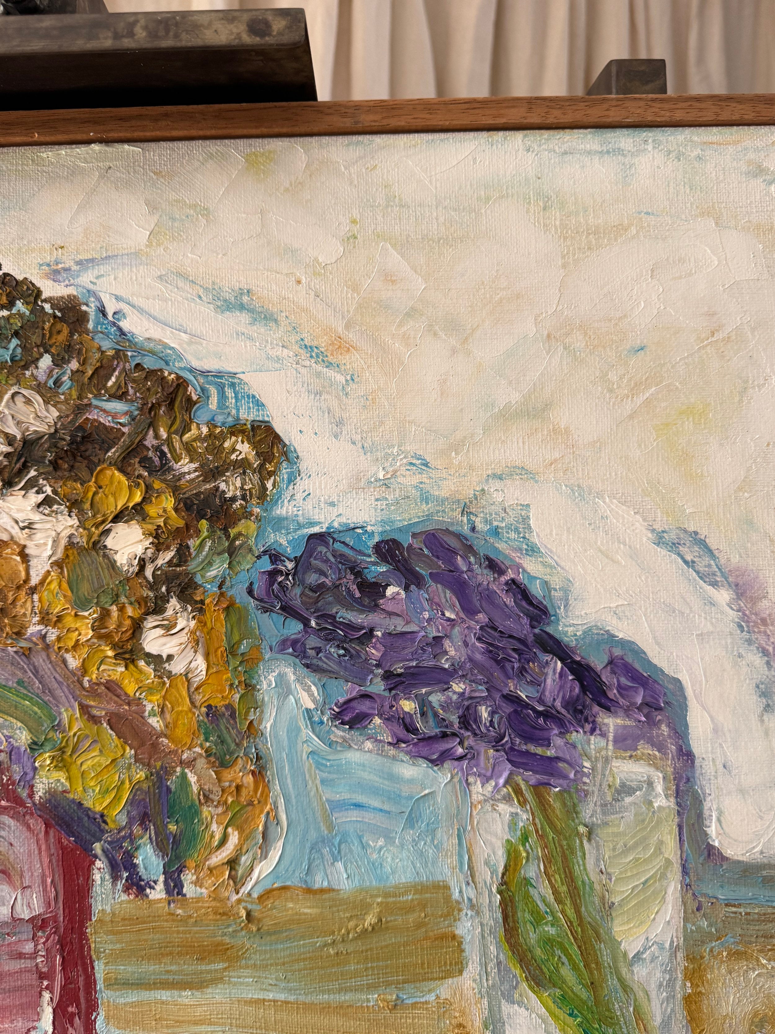 A luminous embodiment of Swedish modernism, this large-scale 1975 oil painting commands attention with its bold, impasto-heavy brushwork and a rich palette that feels both grounded and romantic. The textured impasto draws the eye into a dynamic interplay of light and shadow, evoking the organic beauty of a sun-drenched still life. Set within its original artist’s oak frame, the piece strikes the perfect balance between rustic warmth and contemporary sophistication. Everlasting flowers to be enjoyed for generations to come!