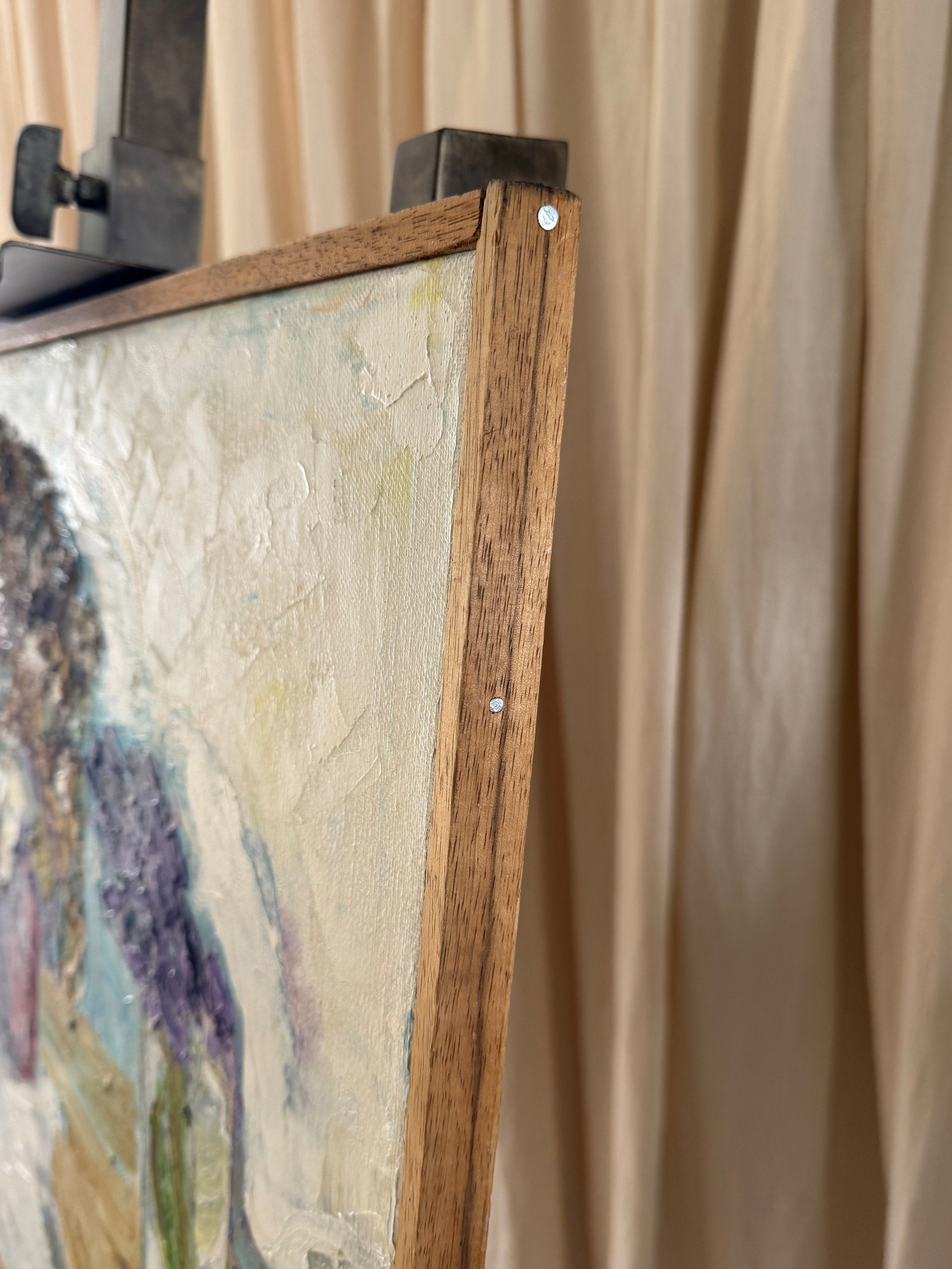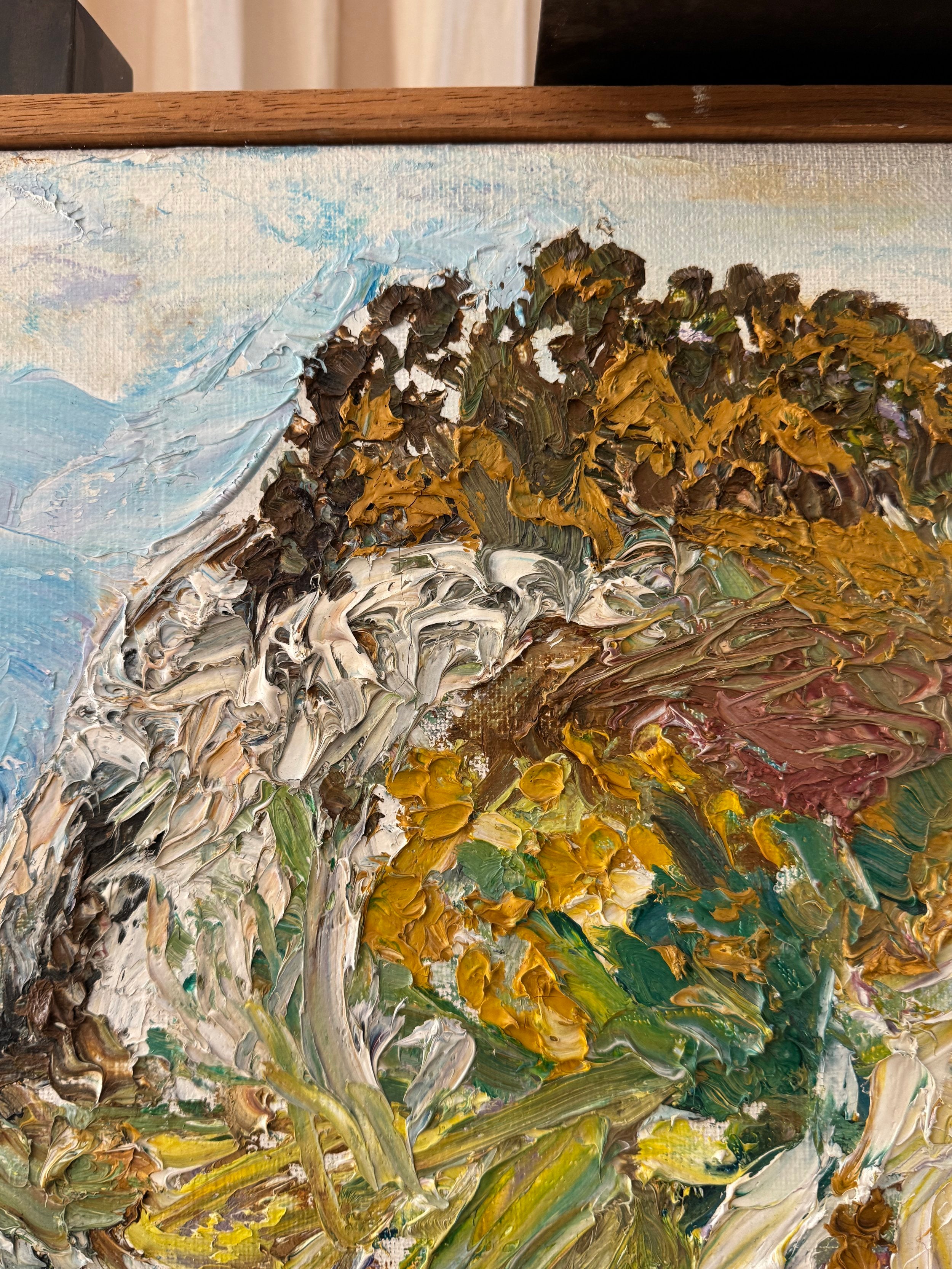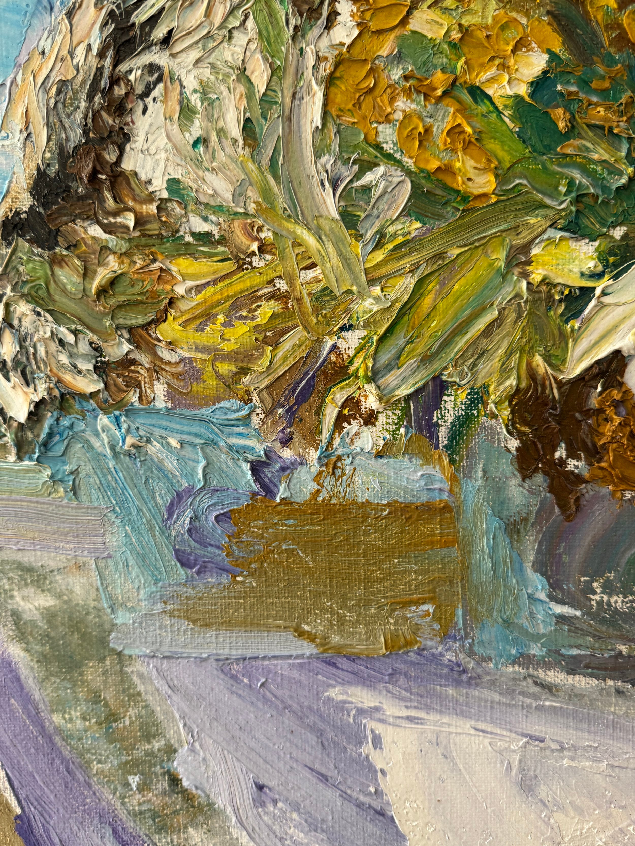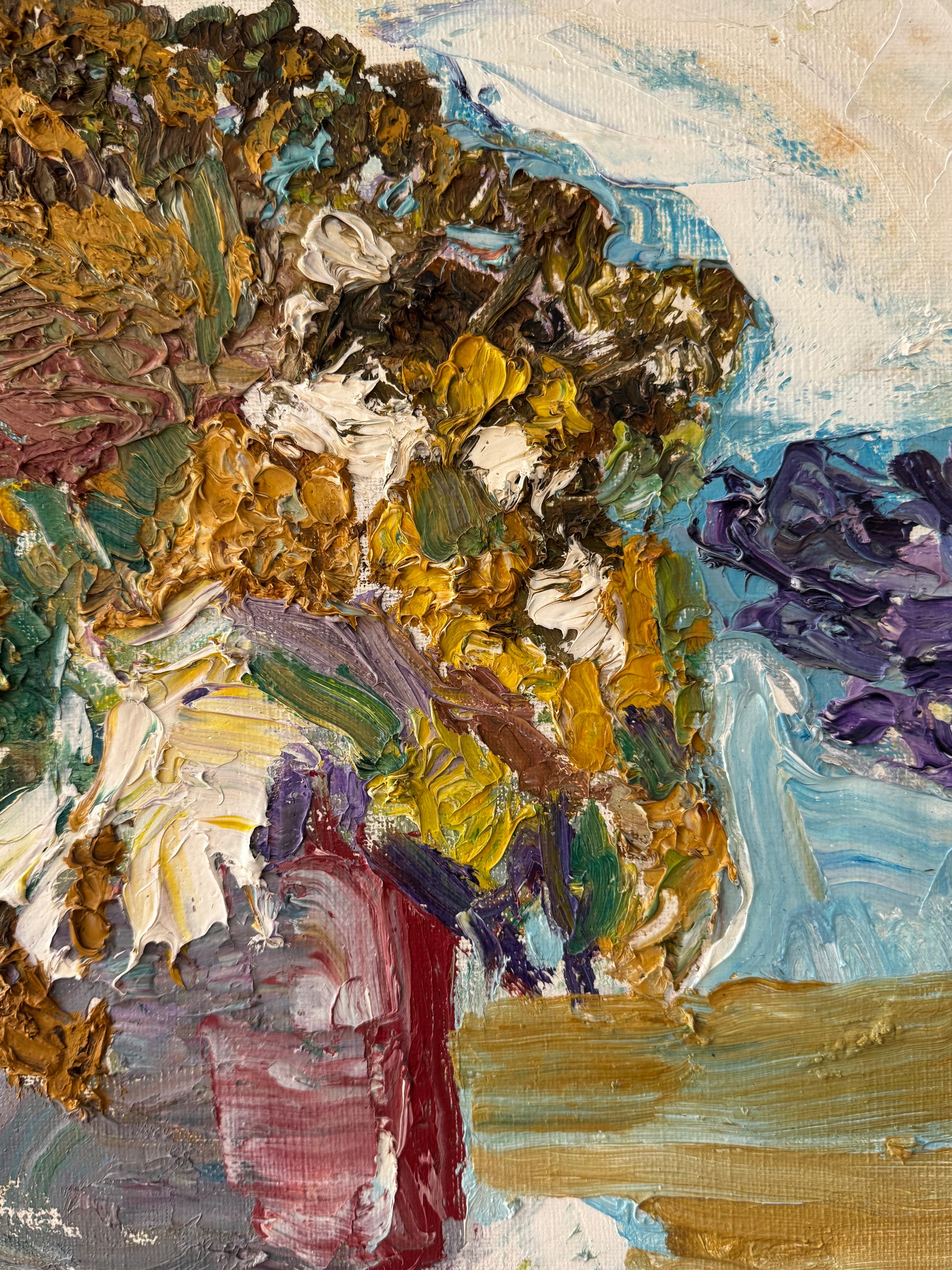 A luminous embodiment of Swedish modernism, this large-scale 1975 oil painting commands attention with its bold, impasto-heavy brushwork and a rich palette that feels both grounded and romantic. The textured impasto draws the eye into a dynamic interplay of light and shadow, evoking the organic beauty of a sun-drenched still life. Set within its original artist’s oak frame, the piece strikes the perfect balance between rustic warmth and contemporary sophistication. Everlasting flowers to be enjoyed for generations to come!
