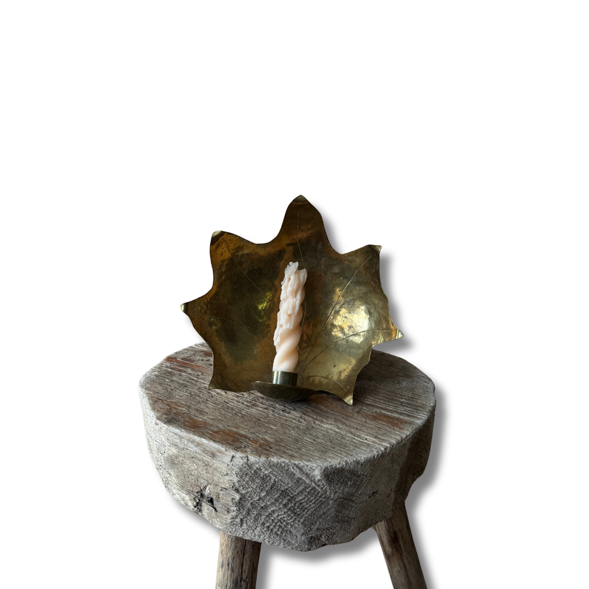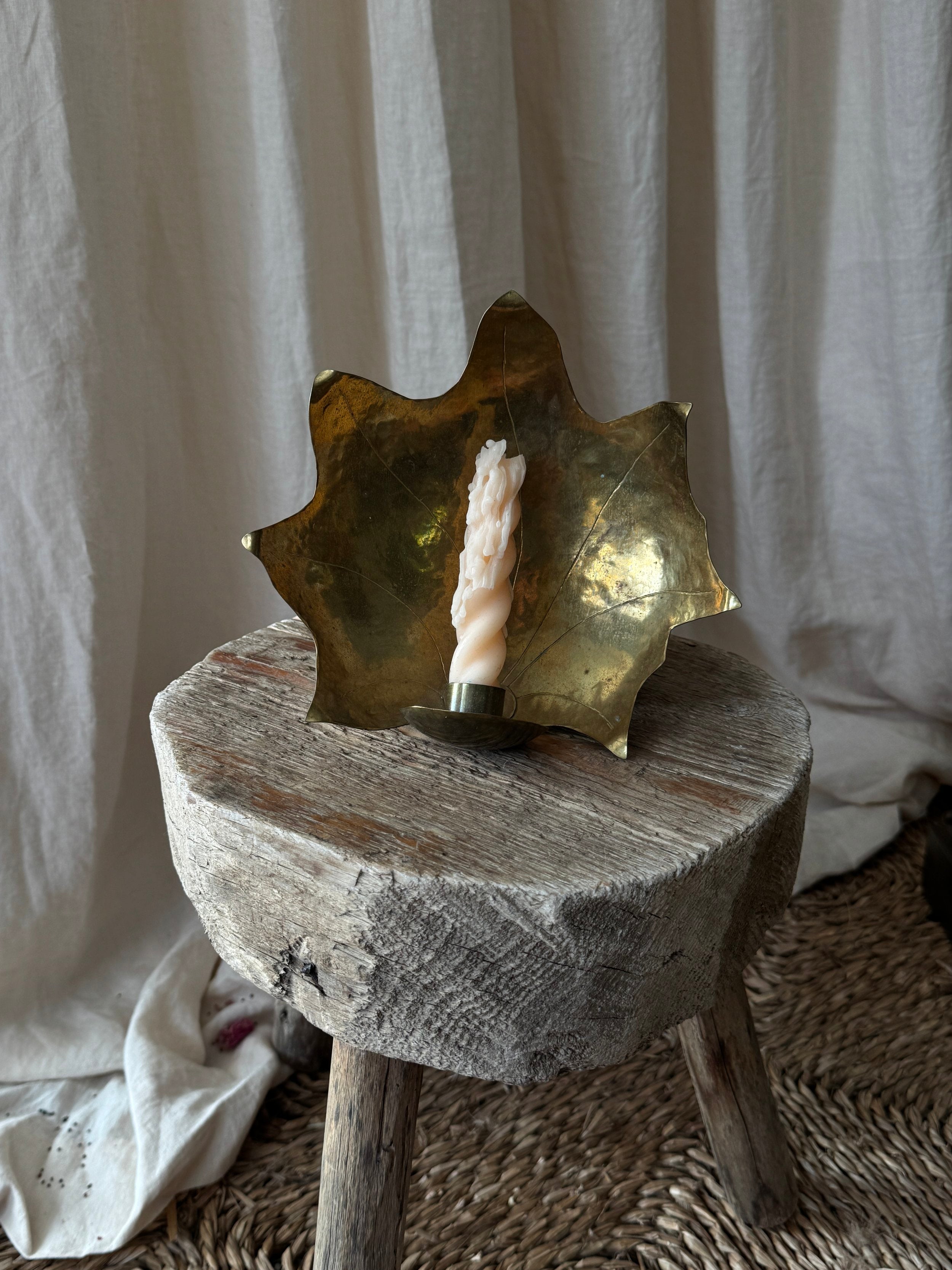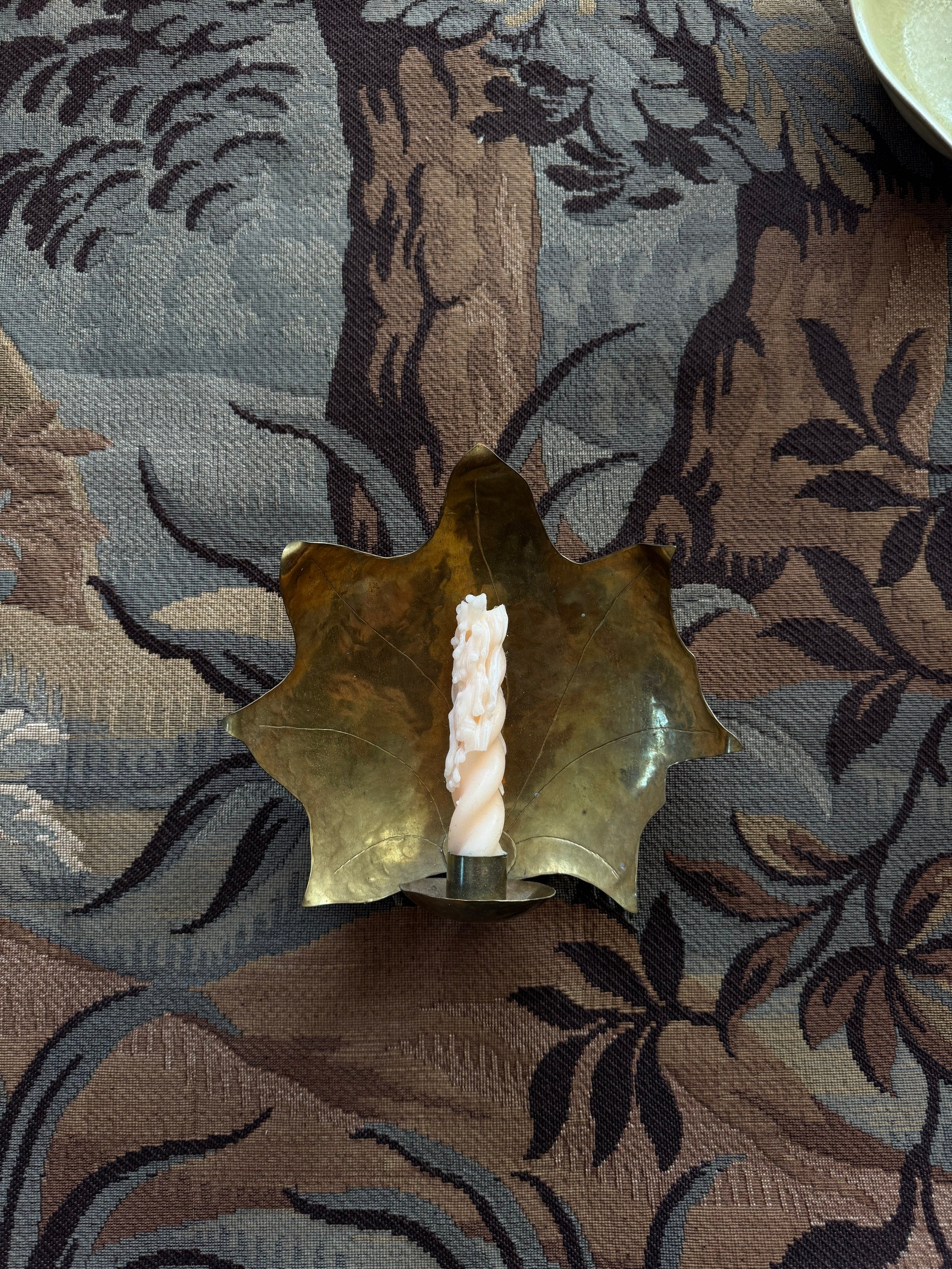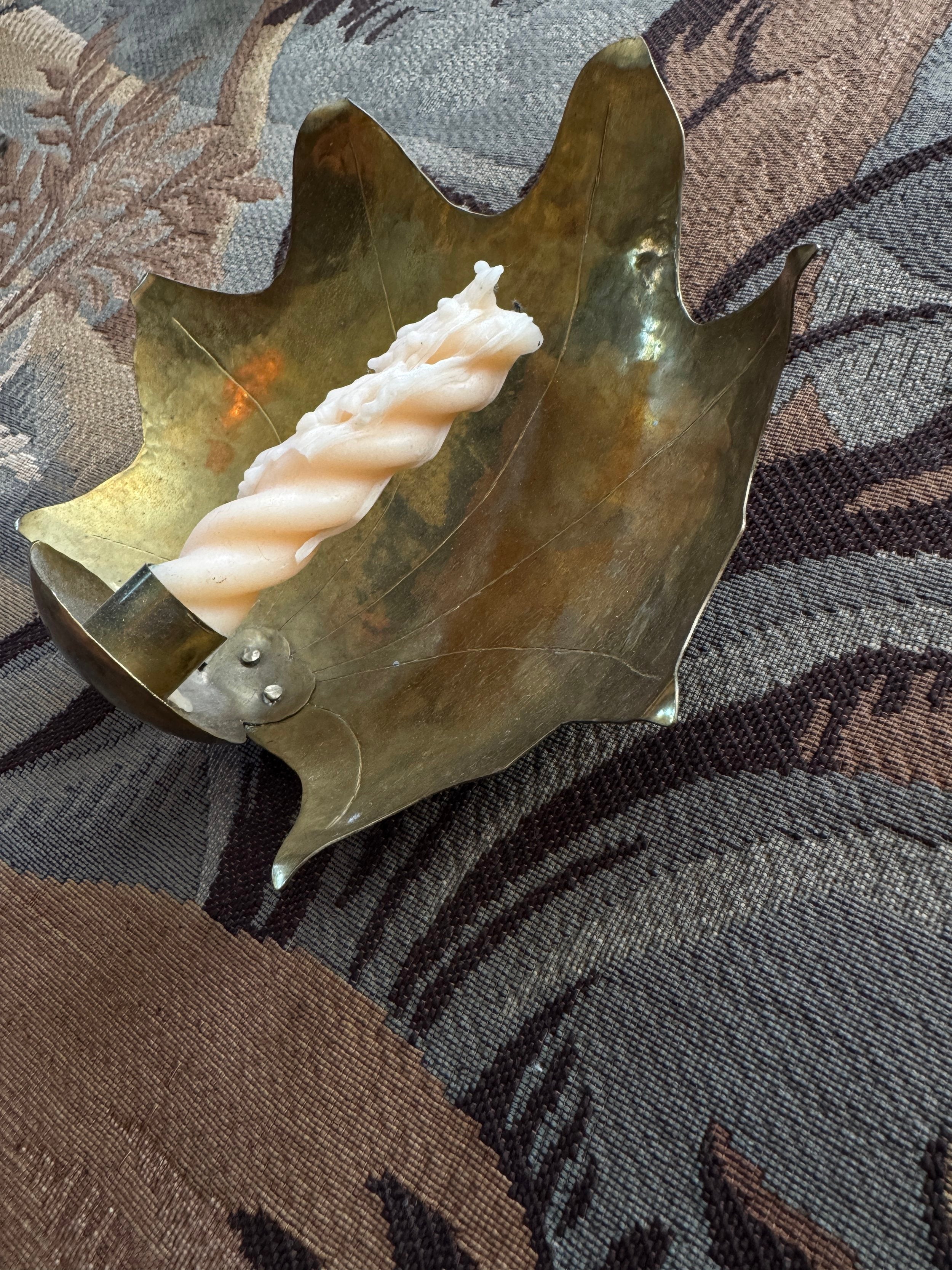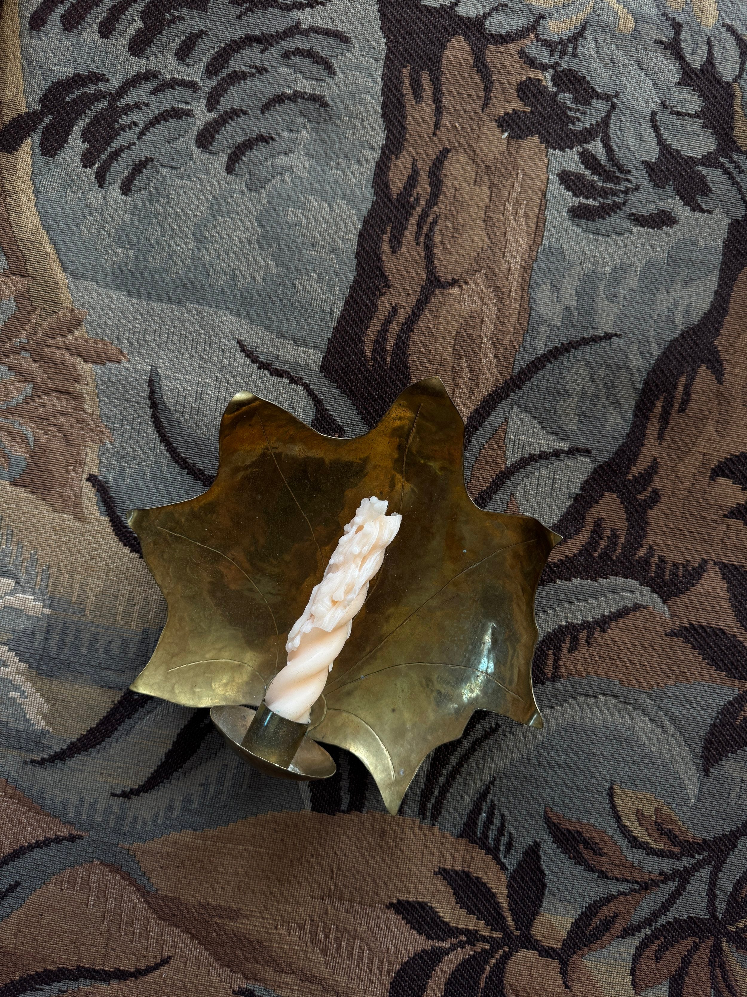 A Swedish midcentury hand-hammered brass leaf with a candlestick holder makes this piece incredibly personal and intimate. The delicate edges are a personal favourite.