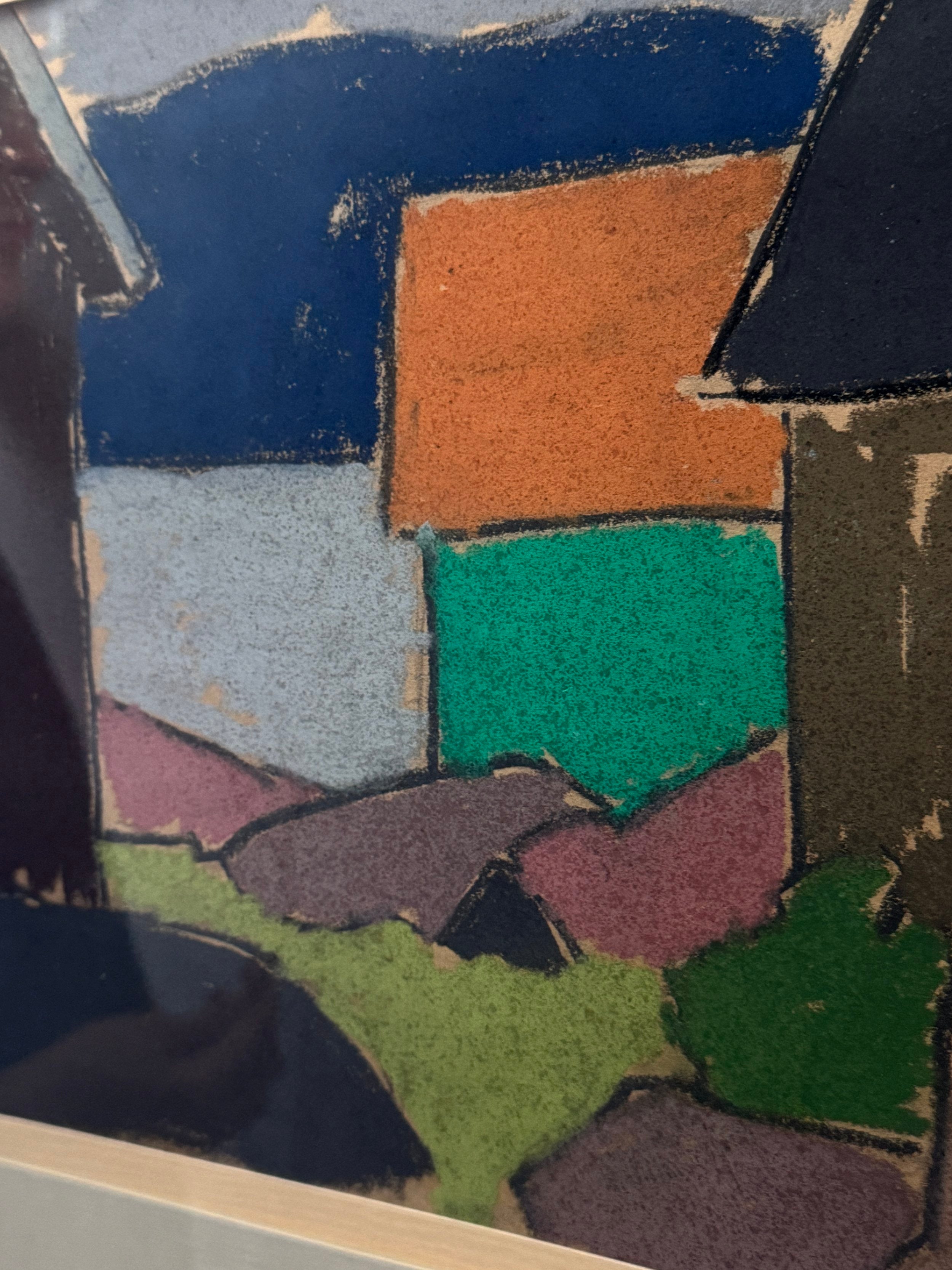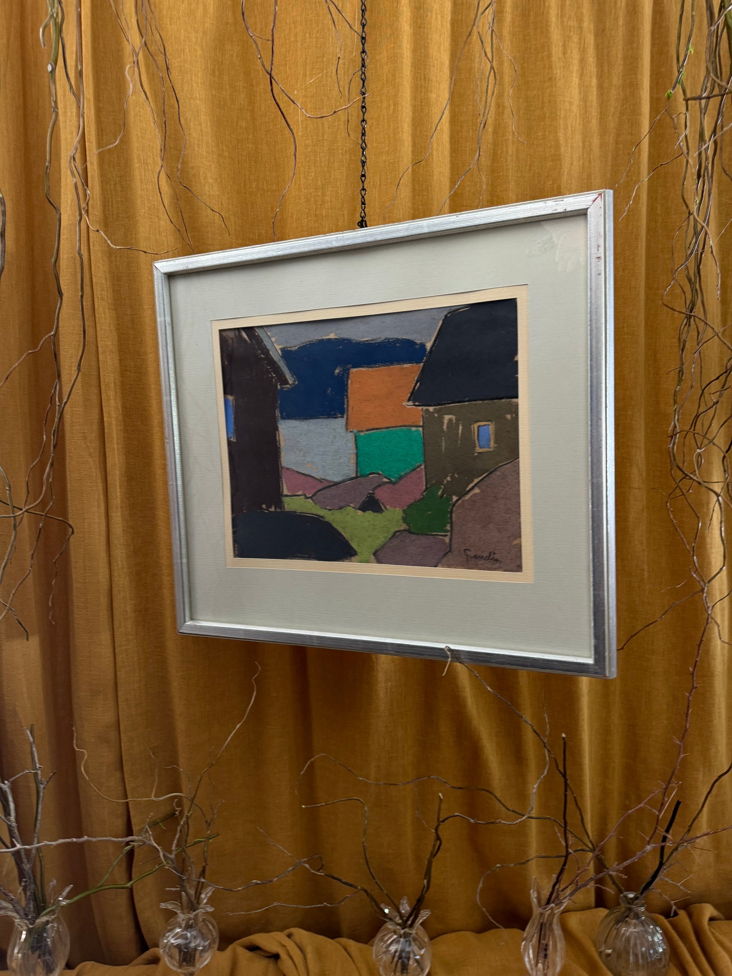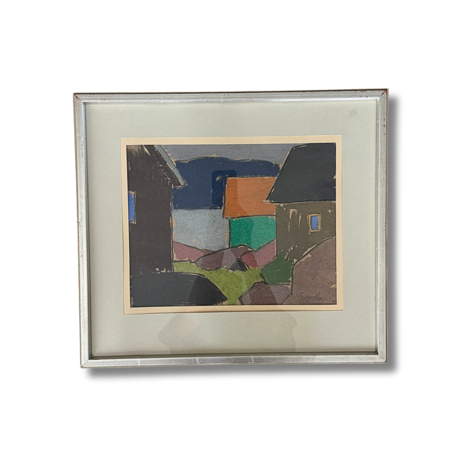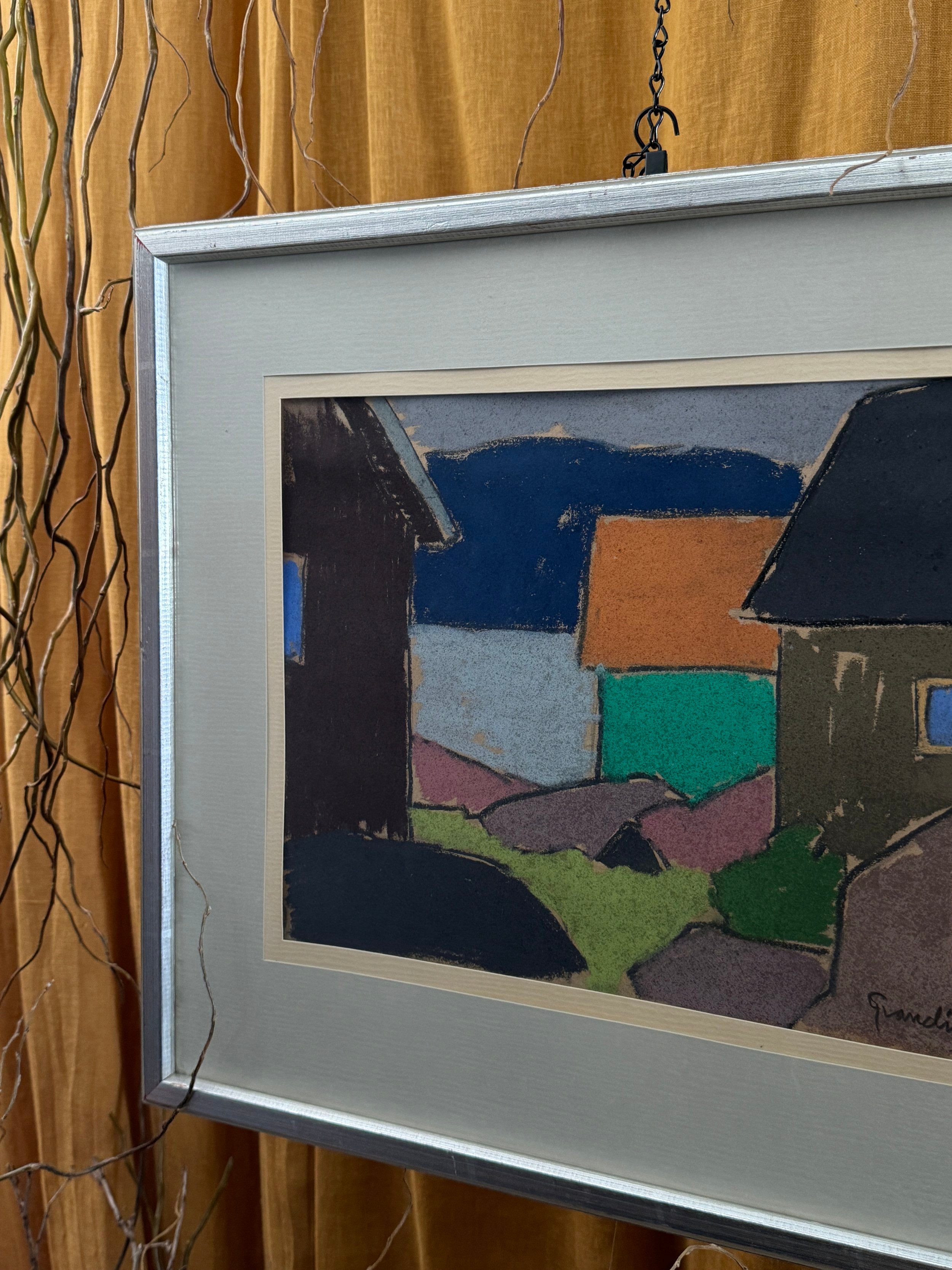 This oil pastel exemplifies Swedish midcentury modernism, featuring a stylized landscape or architectural abstraction with simplified, blocky forms. The piece showcases a harmonious use of muted, earthy tones alongside brighter accents like teal and orange, reflecting the Scandinavian approach to capturing natural light and seasonal color contrasts. The composition’s geometric elements, such as the intersecting lines of buildings and the angular shapes of rocks or hills, echo the midcentury focus on form and structure. The flattened perspective and bold, contrasting shapes suggest influences from the color field and abstract expressionist movements, common in Swedish modern art of the 1950s and 1960s. The original artwork’s frame, with its sleek, minimalist design, complements the era's aesthetic.