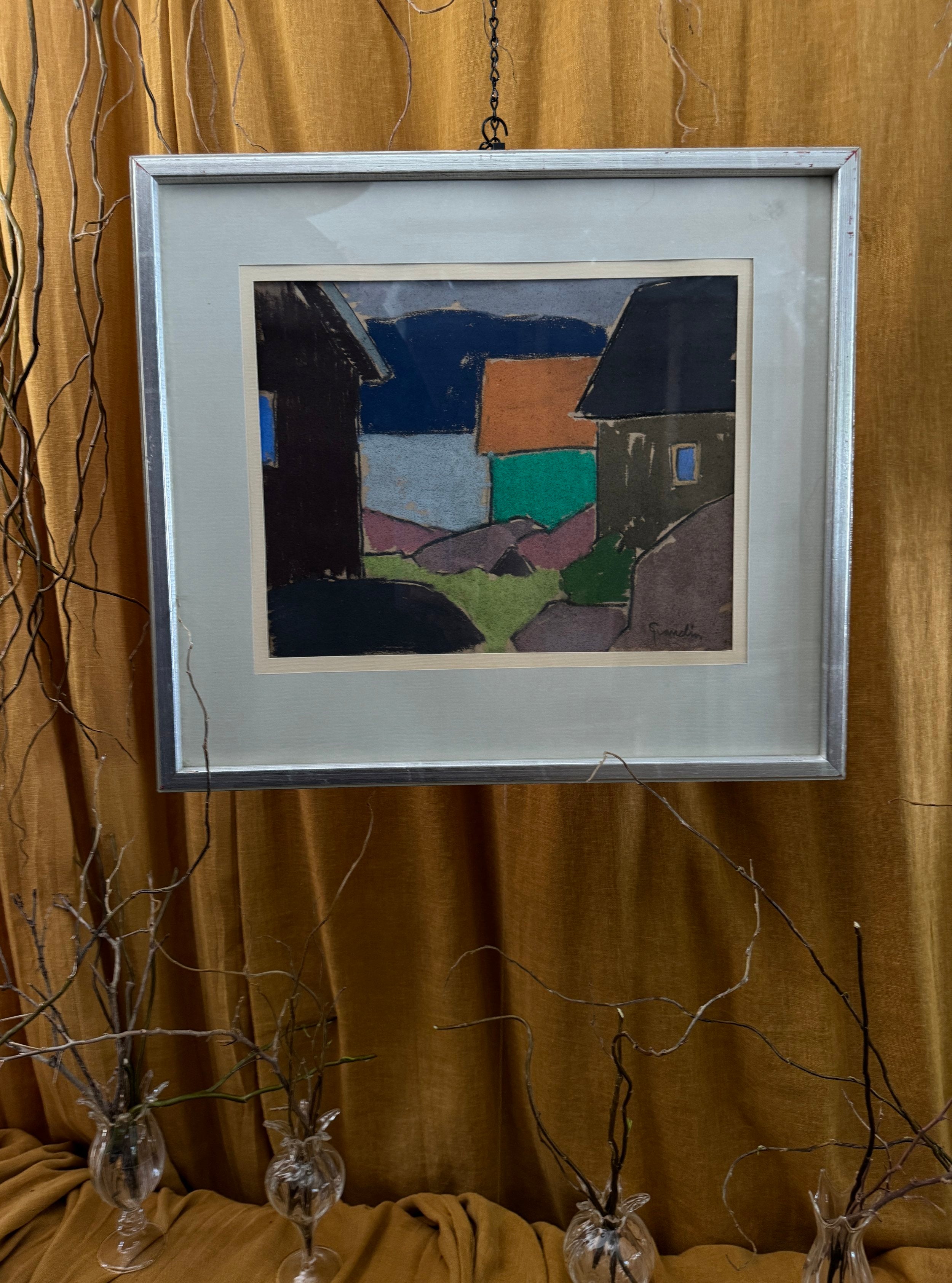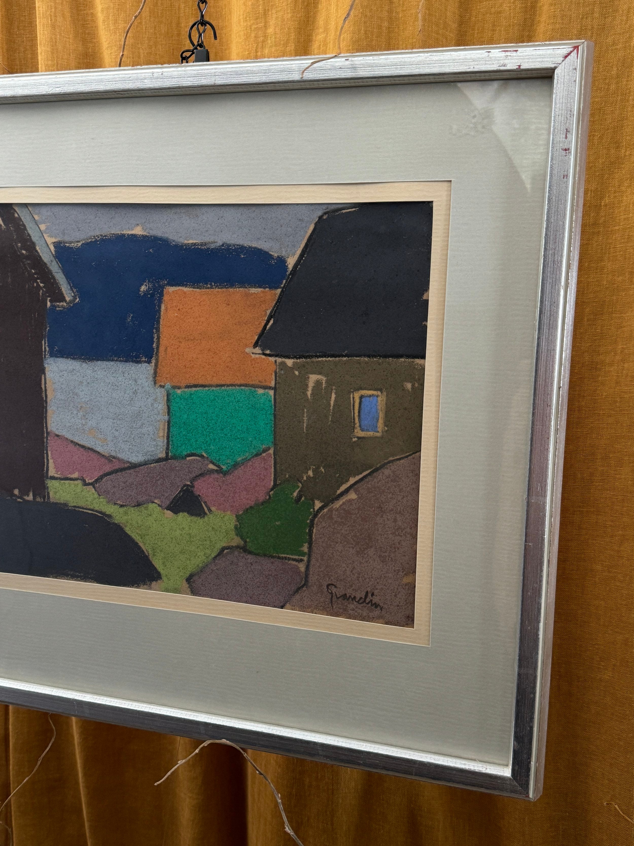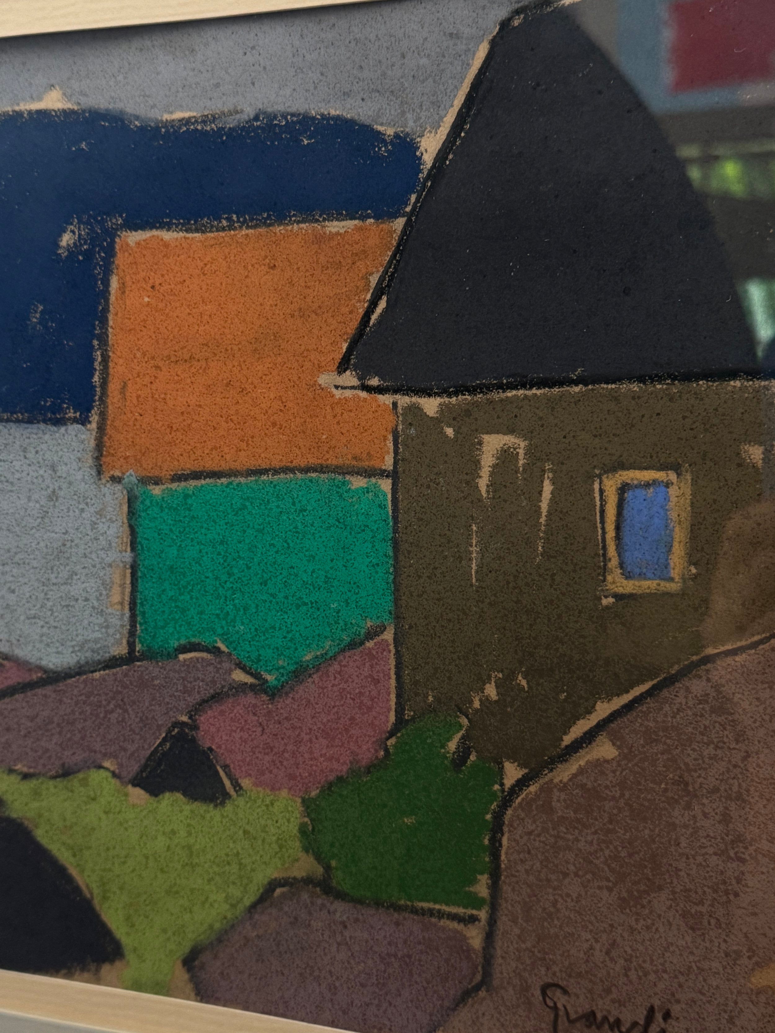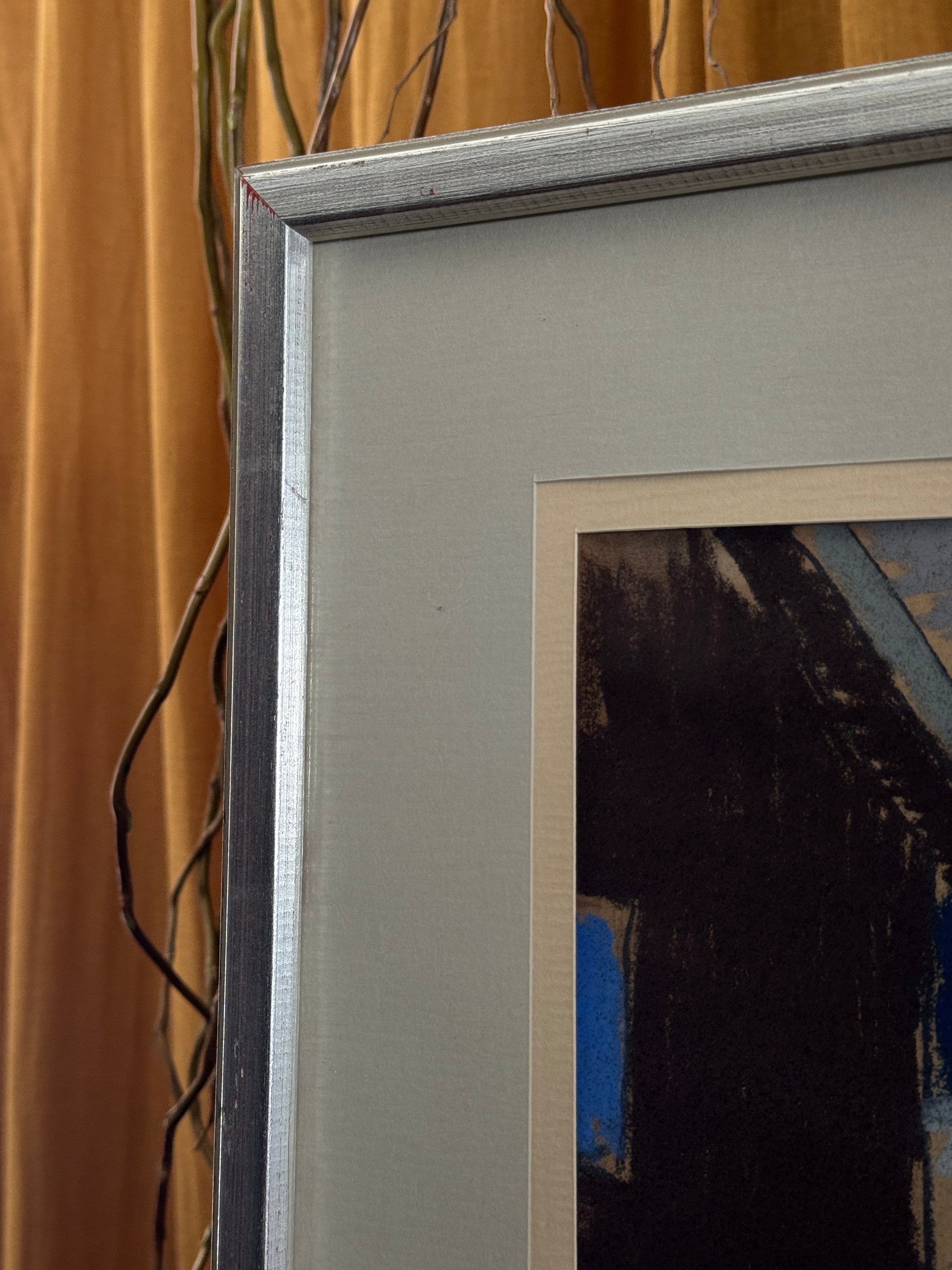 This oil pastel exemplifies Swedish midcentury modernism, featuring a stylized landscape or architectural abstraction with simplified, blocky forms. The piece showcases a harmonious use of muted, earthy tones alongside brighter accents like teal and orange, reflecting the Scandinavian approach to capturing natural light and seasonal color contrasts. The composition’s geometric elements, such as the intersecting lines of buildings and the angular shapes of rocks or hills, echo the midcentury focus on form and structure. The flattened perspective and bold, contrasting shapes suggest influences from the color field and abstract expressionist movements, common in Swedish modern art of the 1950s and 1960s. The original artwork’s frame, with its sleek, minimalist design, complements the era's aesthetic.