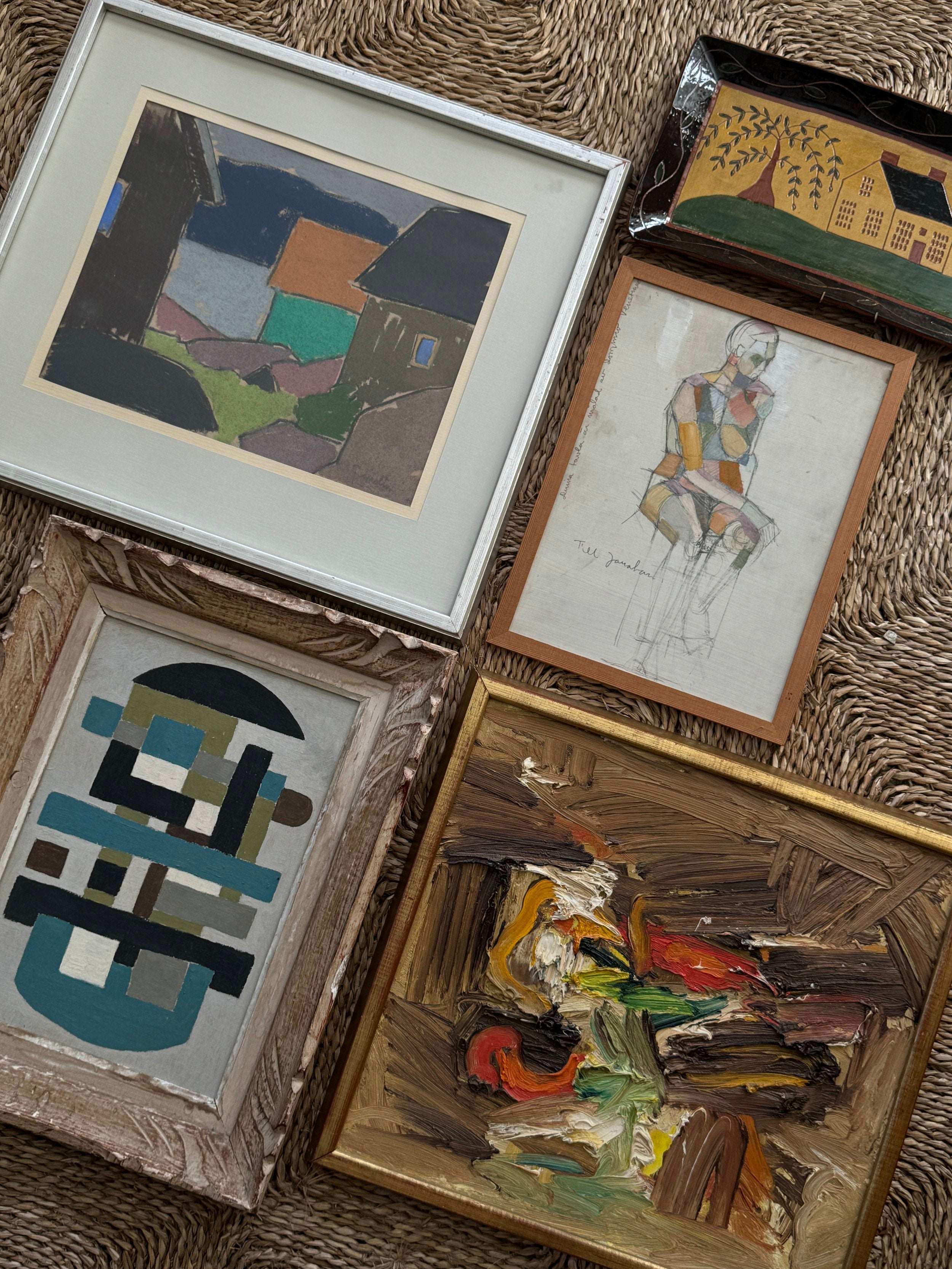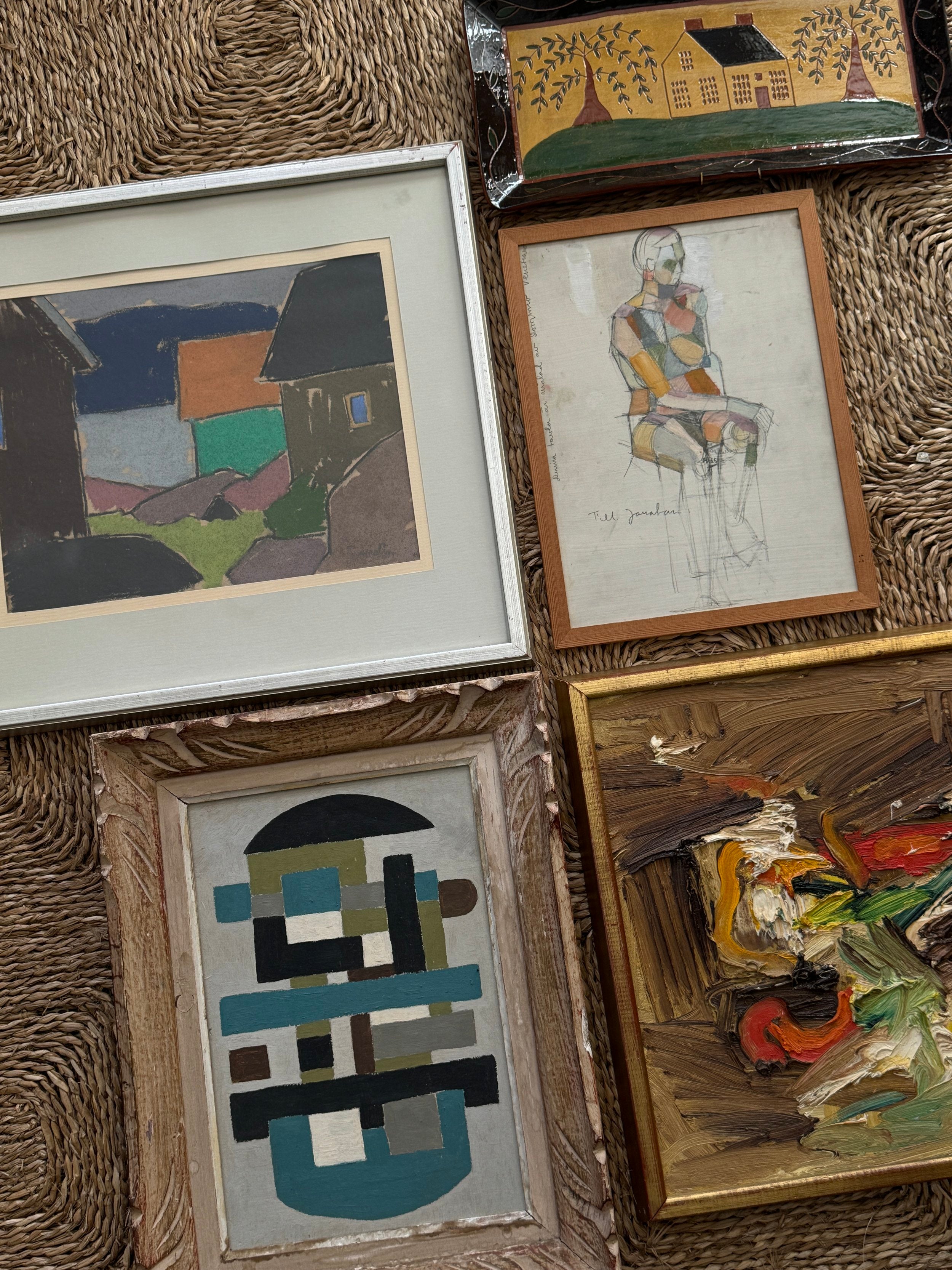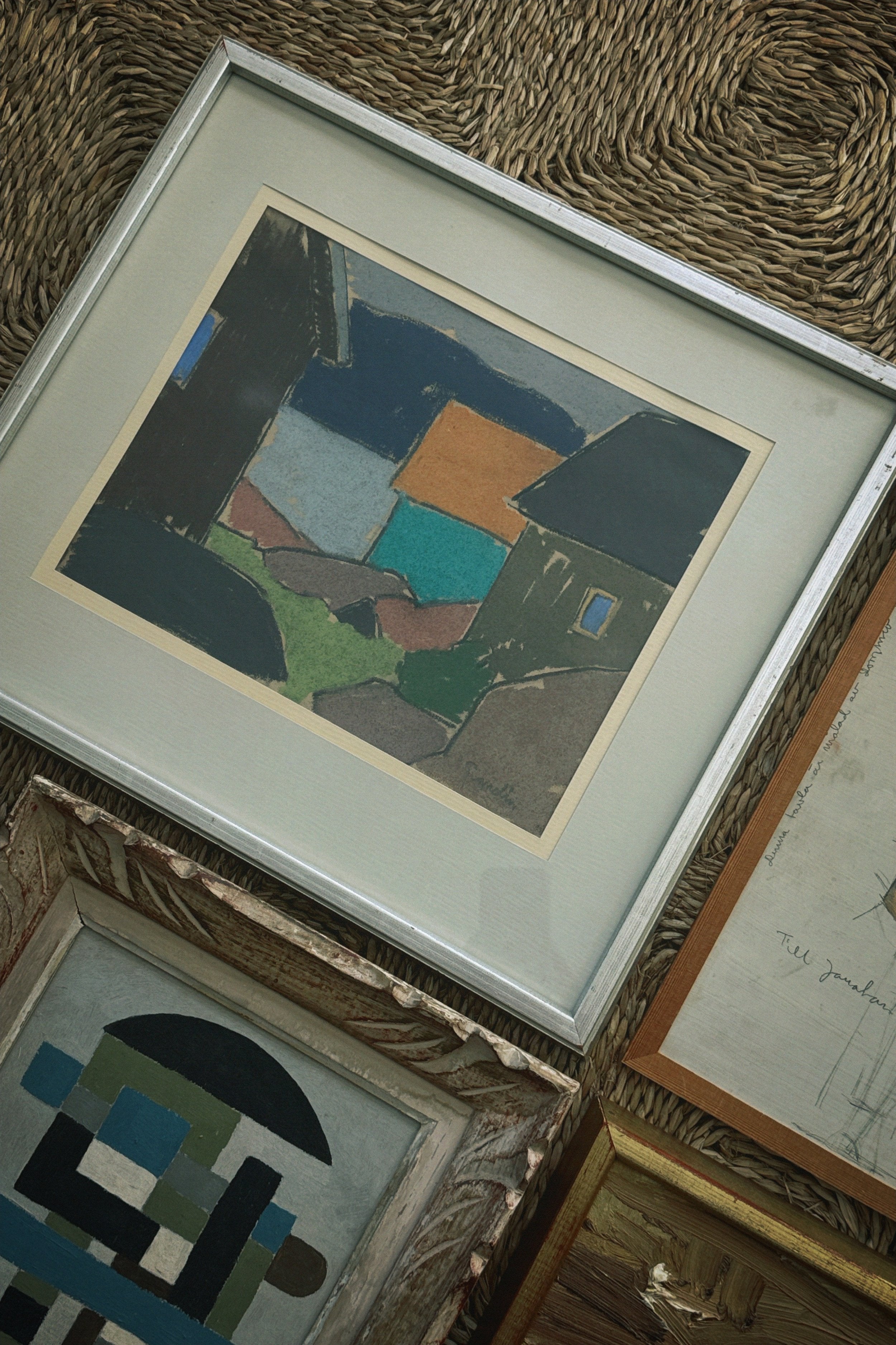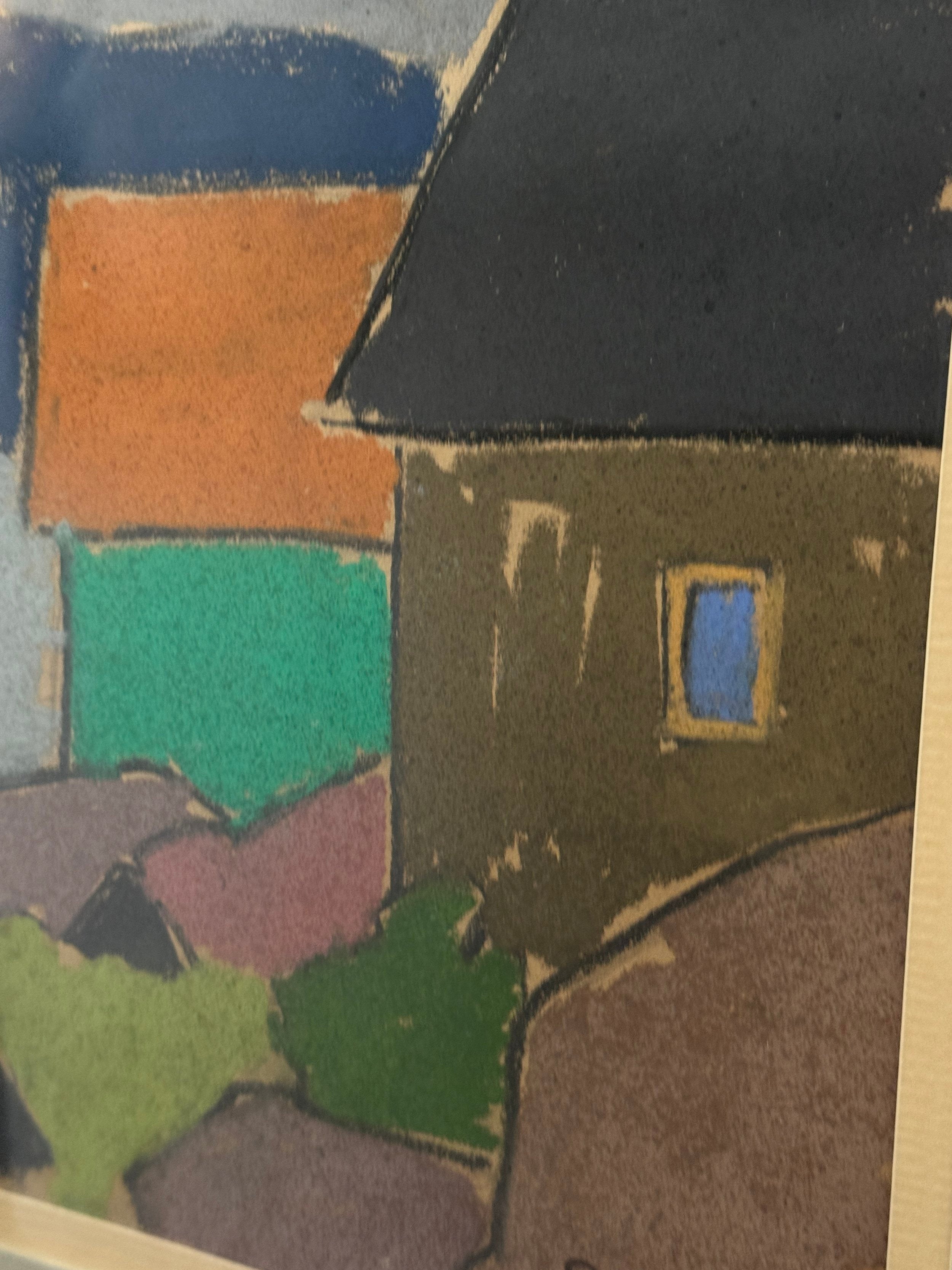 This oil pastel exemplifies Swedish midcentury modernism, featuring a stylized landscape or architectural abstraction with simplified, blocky forms. The piece showcases a harmonious use of muted, earthy tones alongside brighter accents like teal and orange, reflecting the Scandinavian approach to capturing natural light and seasonal color contrasts. The composition’s geometric elements, such as the intersecting lines of buildings and the angular shapes of rocks or hills, echo the midcentury focus on form and structure. The flattened perspective and bold, contrasting shapes suggest influences from the color field and abstract expressionist movements, common in Swedish modern art of the 1950s and 1960s. The original artwork’s frame, with its sleek, minimalist design, complements the era's aesthetic.
