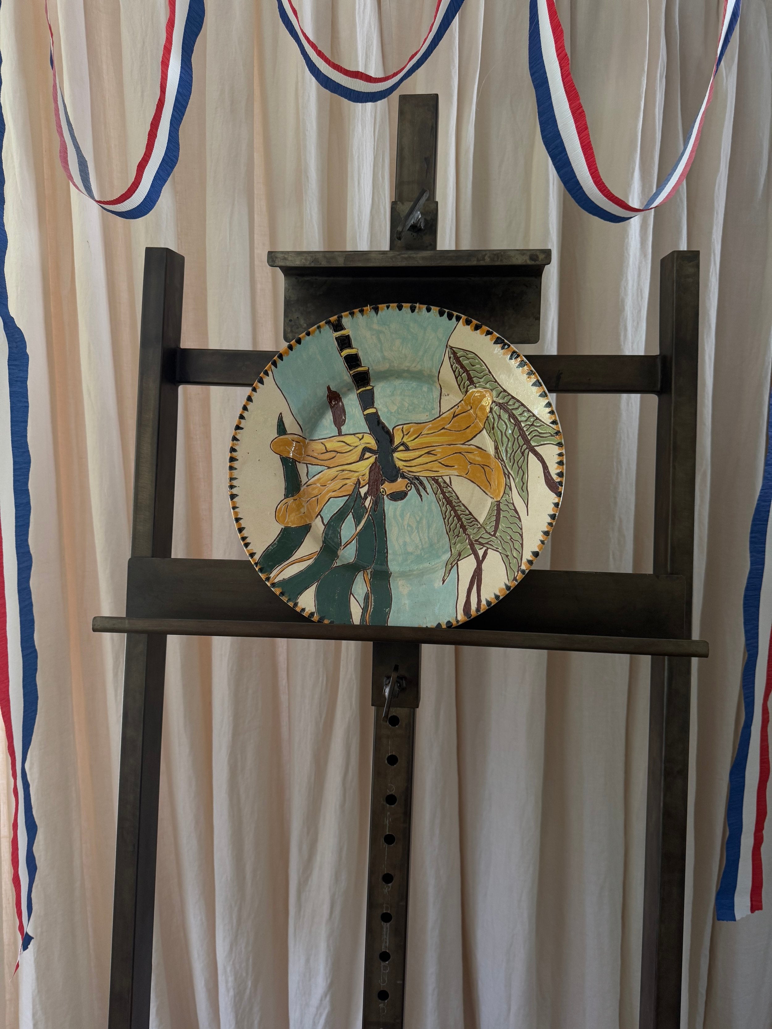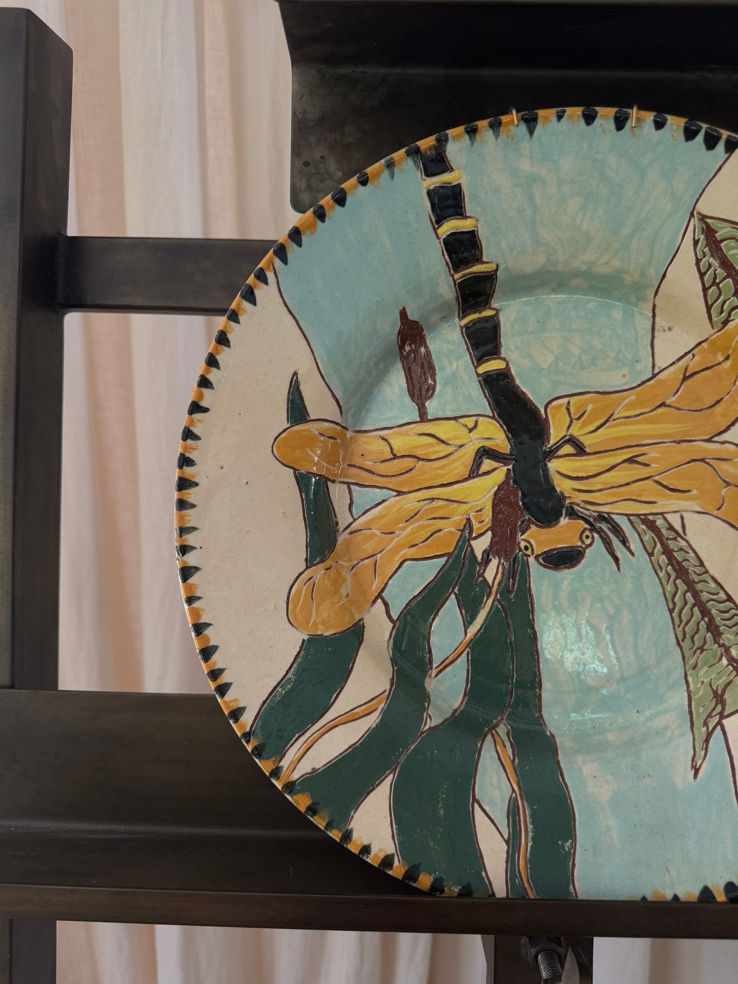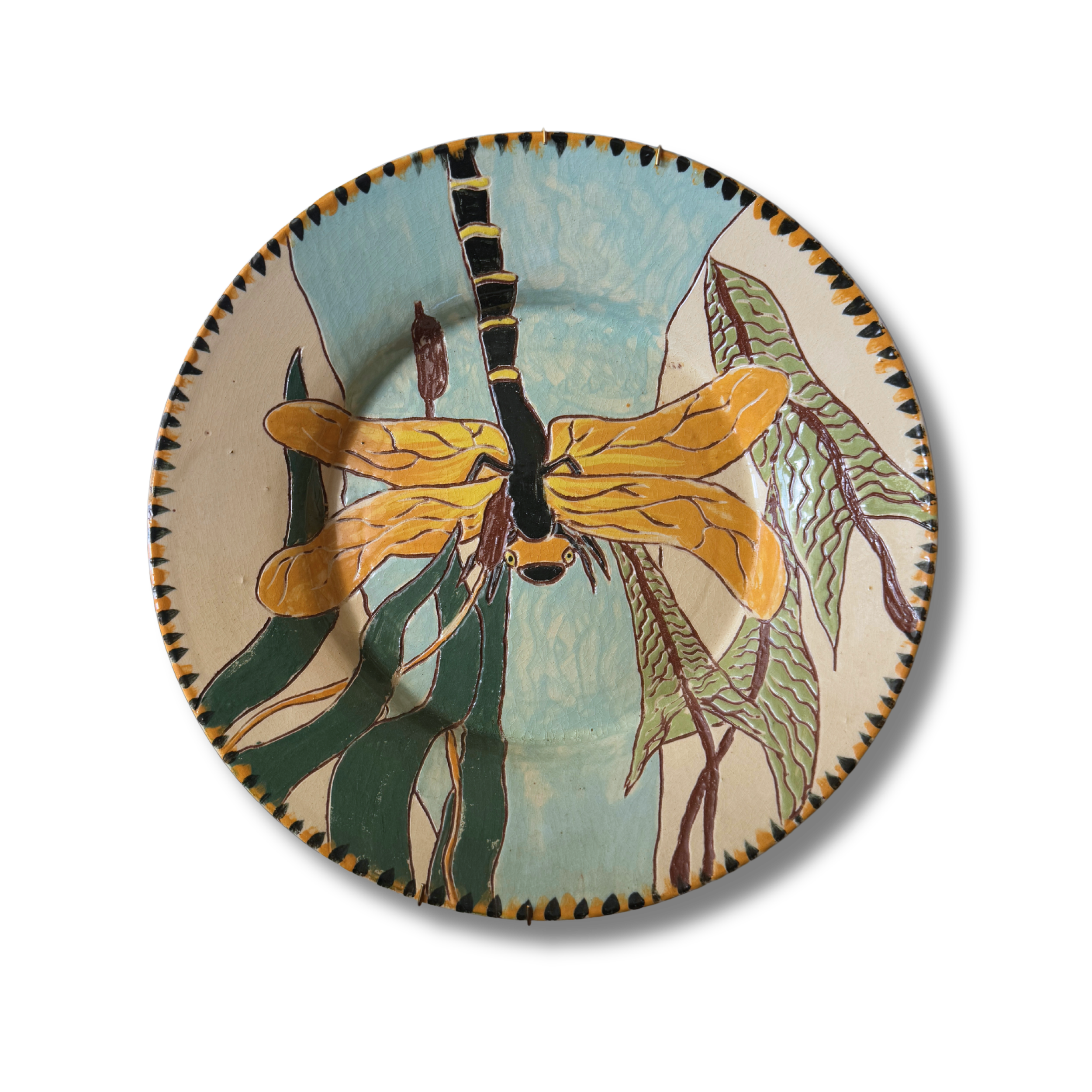 Sourced in England, here is a beautiful ceramic plate that can be hung or displayed. Featuring a hand-painted motif of a dragonfly, it is chock-full of beautiful blue, green, and yellow hues. Dragonflies are rich in symbolism and often represent transformation, joy, resilience, wisdom, and recently departed loved ones.