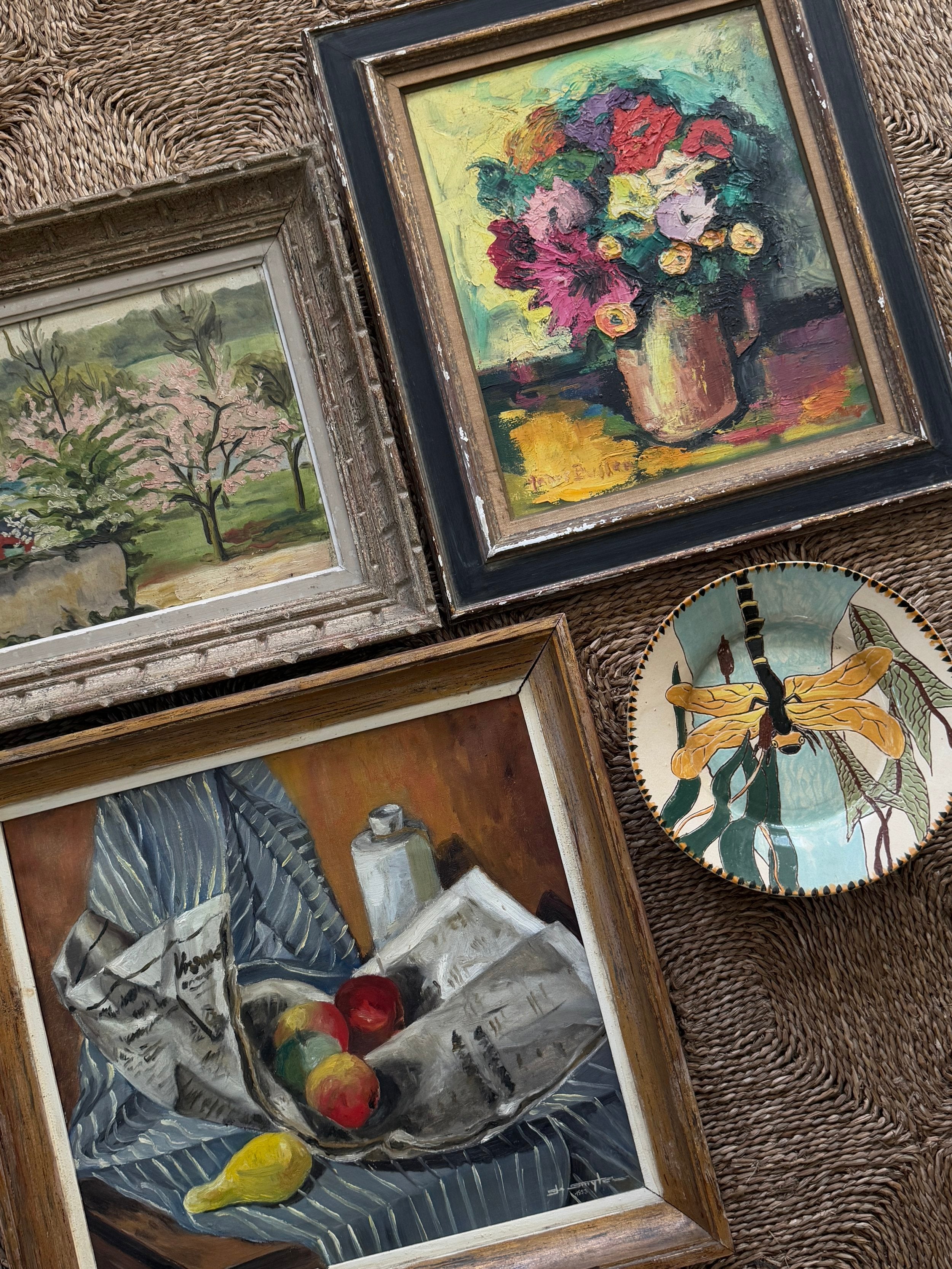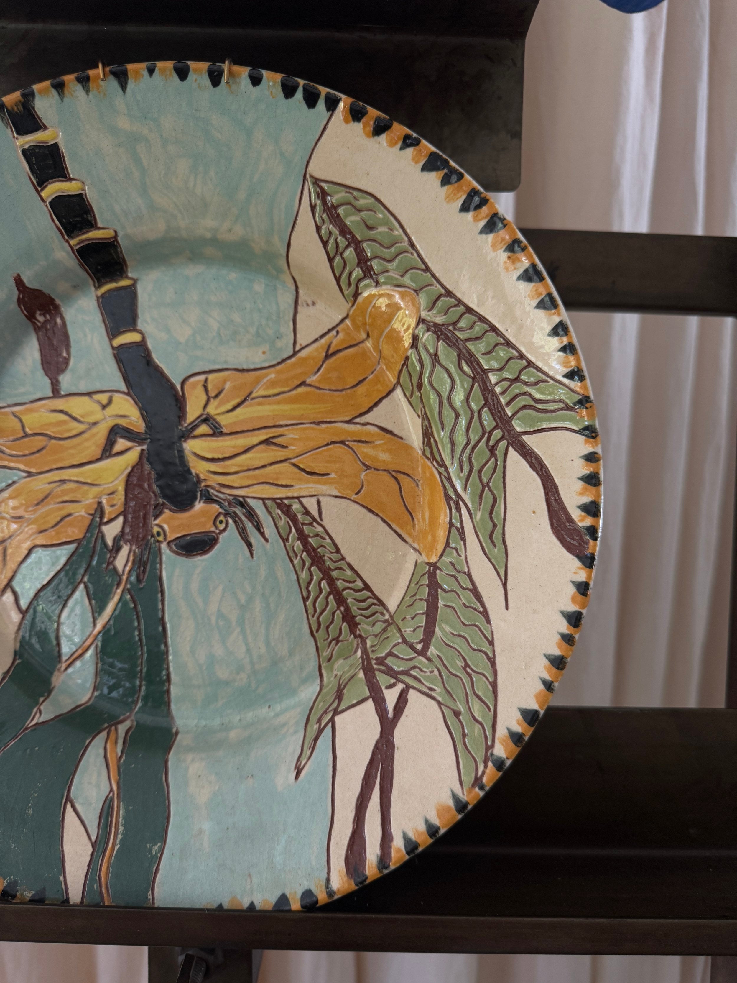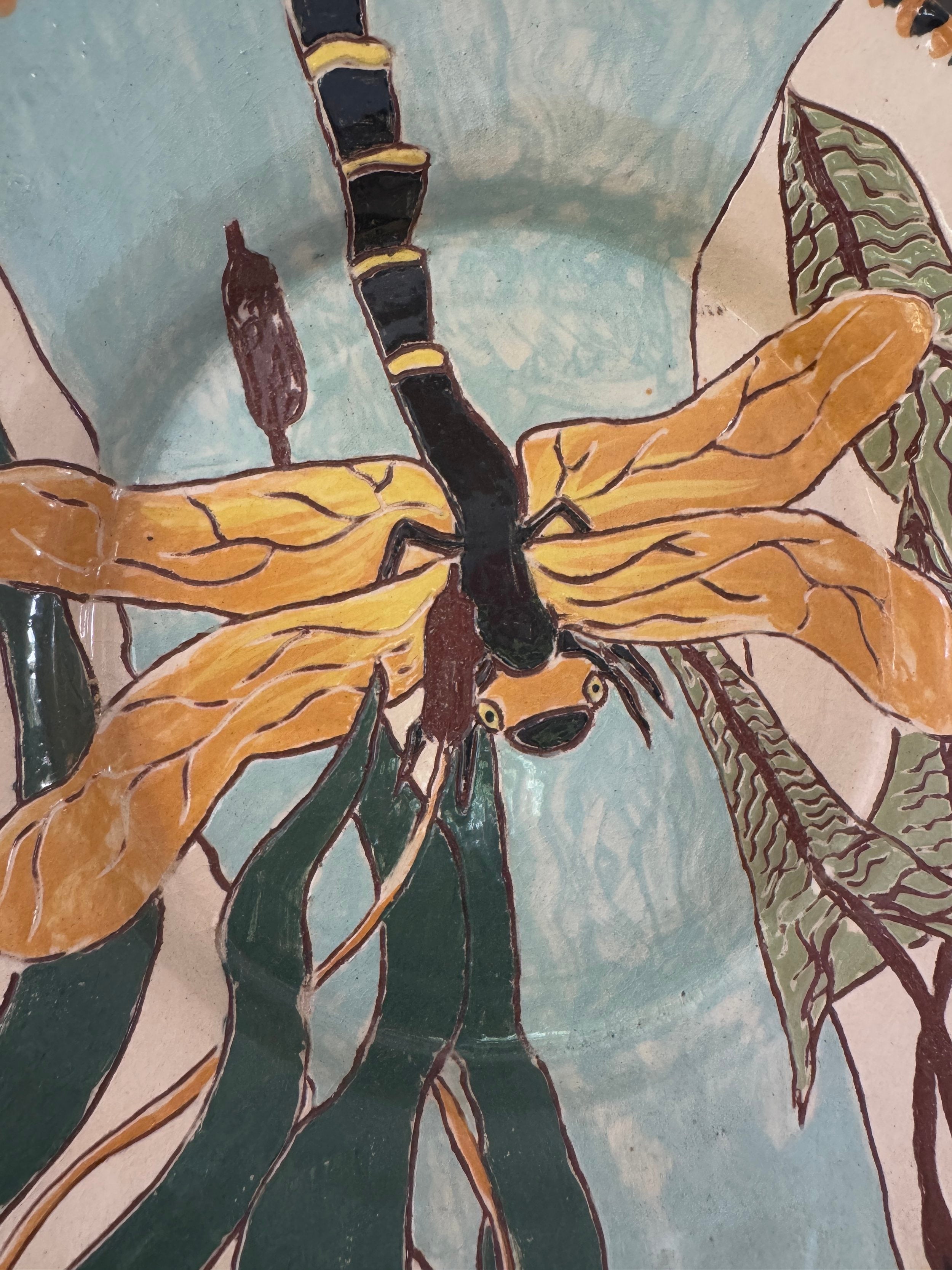Sourced in England, here is a beautiful ceramic plate that can be hung or displayed. Featuring a hand-painted motif of a dragonfly, it is chock-full of beautiful blue, green, and yellow hues. Dragonflies are rich in symbolism and often represent transformation, joy, resilience, wisdom, and recently departed loved ones.