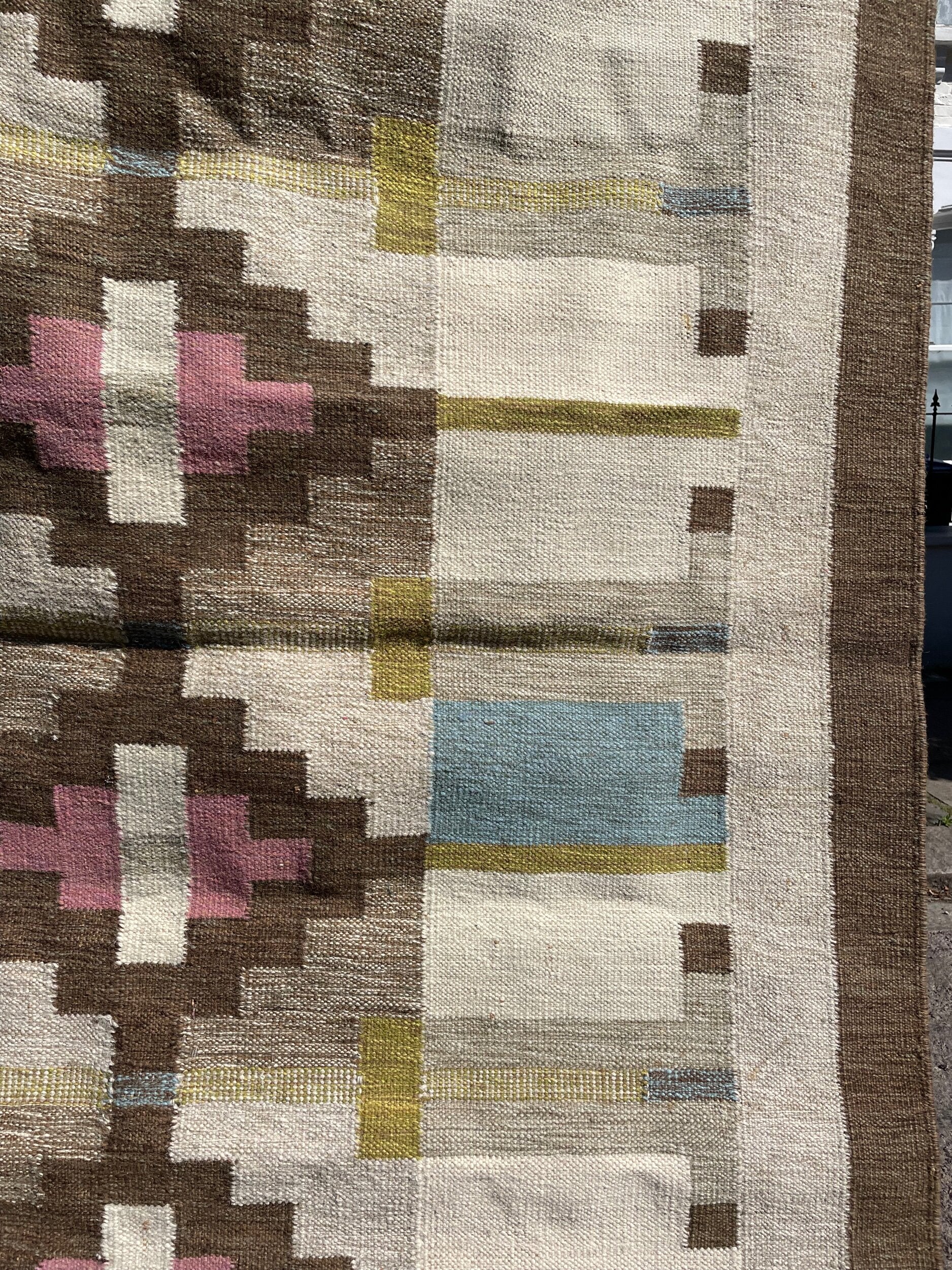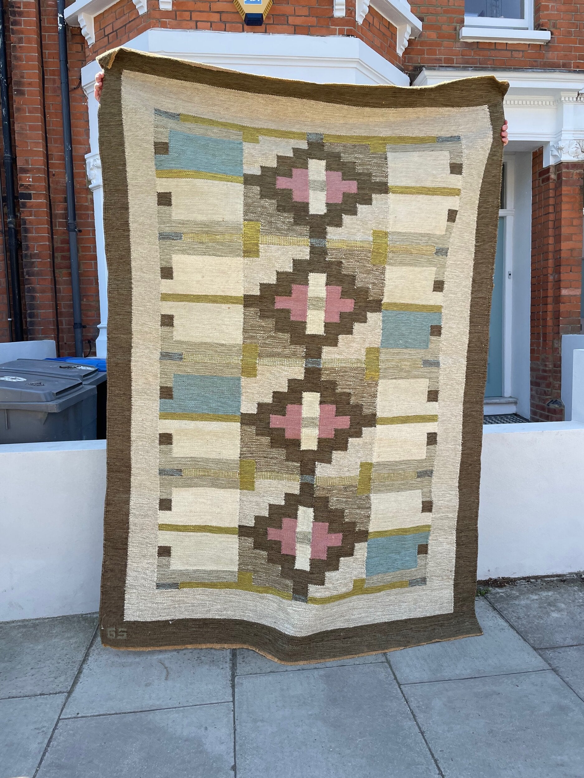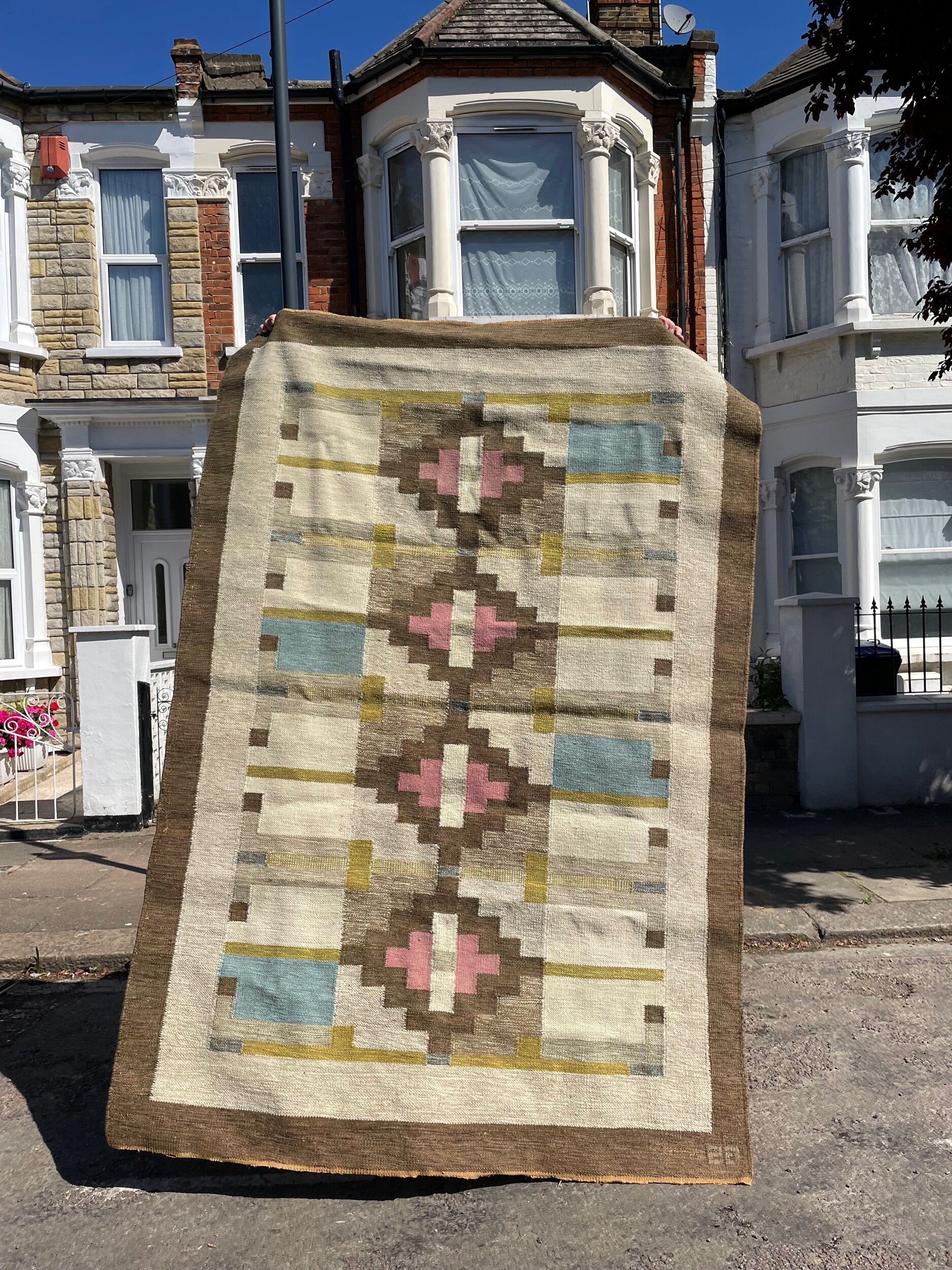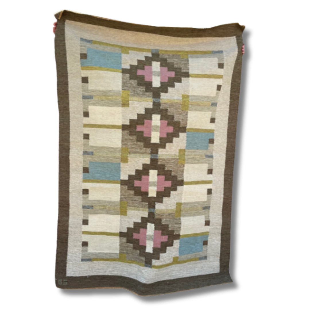 A striking handwoven Swedish flat-weave rug, signed “BS,” showcasing a refined balance of geometry and color. The central axis features bold stepped lozenges in soft rose and ivory, framed by earthy browns, muted ochres, and blocks of sky blue. The interplay of warm and cool tones, combined with the sharp architectural symmetry of the design, exemplifies the mid-20th century Scandinavian weaving tradition, where modernist abstraction met timeless craft. Both decorative and functional, this rug brings warmth, history, and quiet elegance into any interior.
