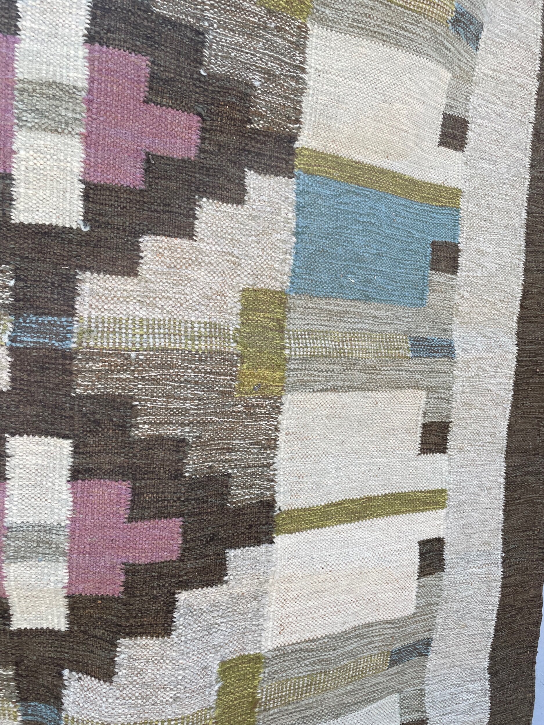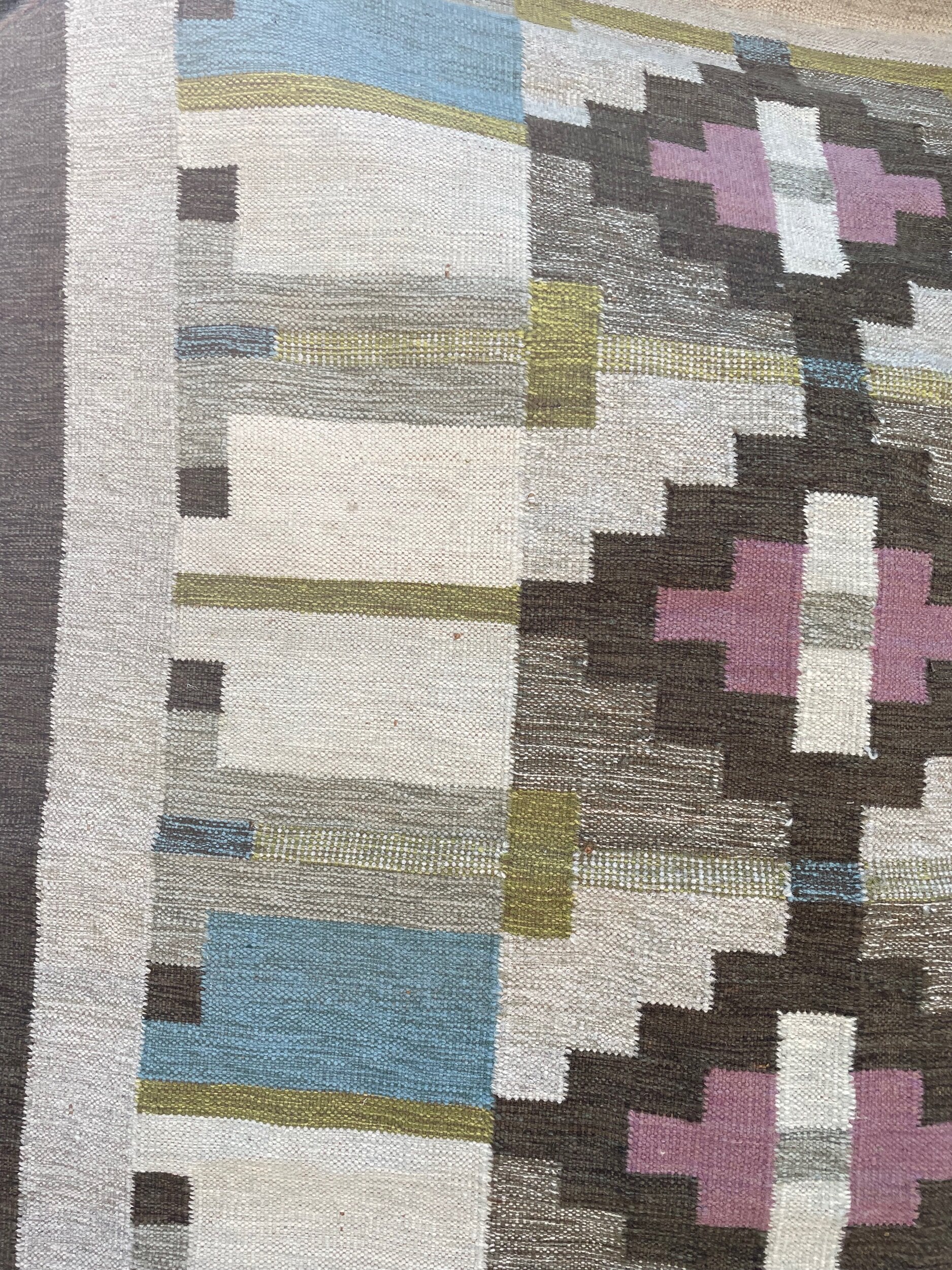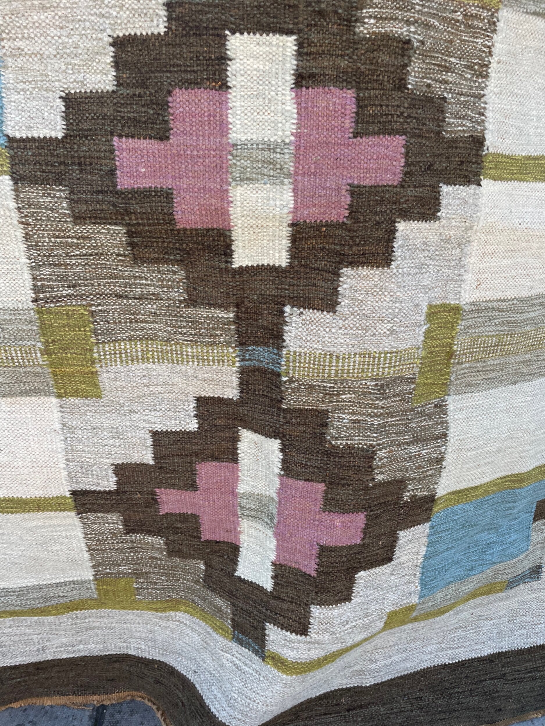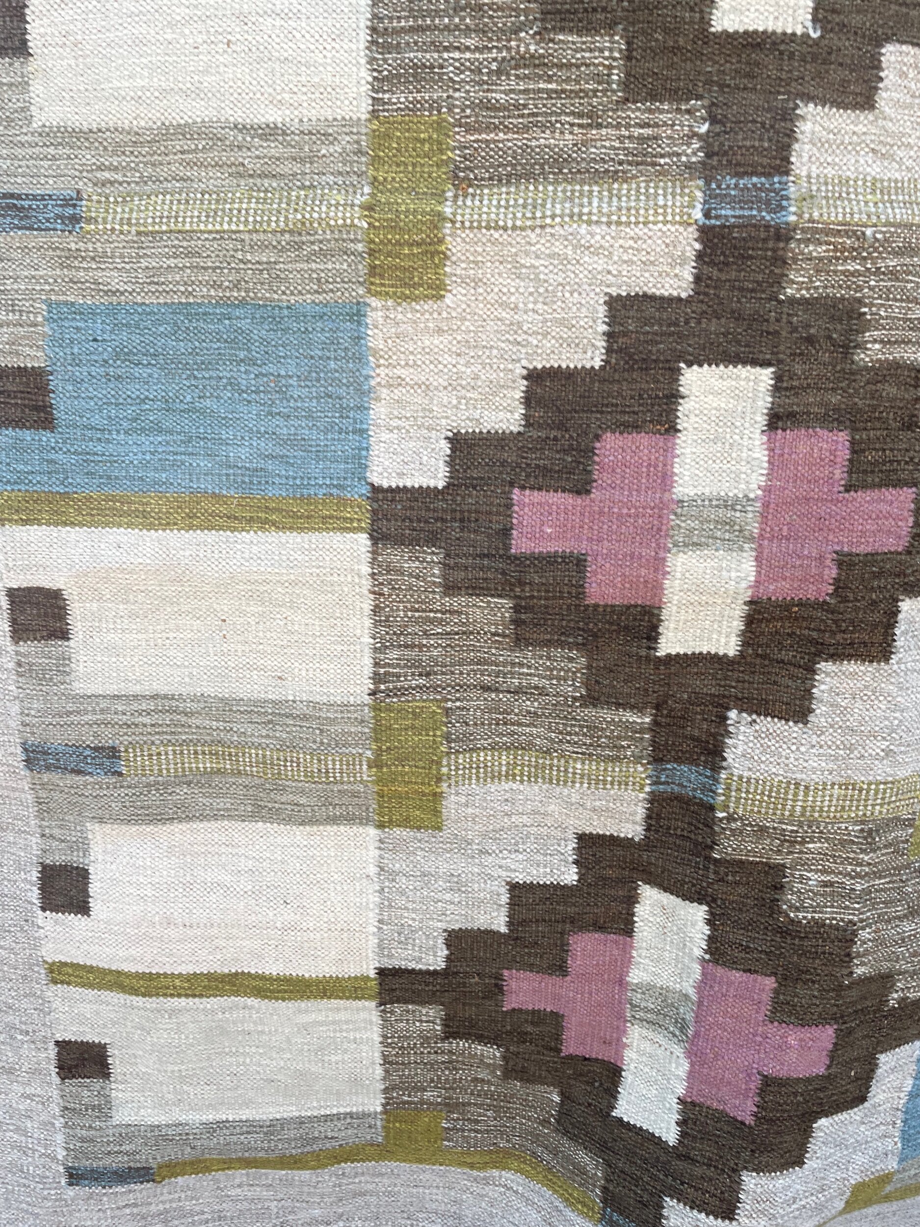 A striking handwoven Swedish flat-weave rug, signed “BS,” showcasing a refined balance of geometry and color. The central axis features bold stepped lozenges in soft rose and ivory, framed by earthy browns, muted ochres, and blocks of sky blue. The interplay of warm and cool tones, combined with the sharp architectural symmetry of the design, exemplifies the mid-20th century Scandinavian weaving tradition, where modernist abstraction met timeless craft. Both decorative and functional, this rug brings warmth, history, and quiet elegance into any interior.