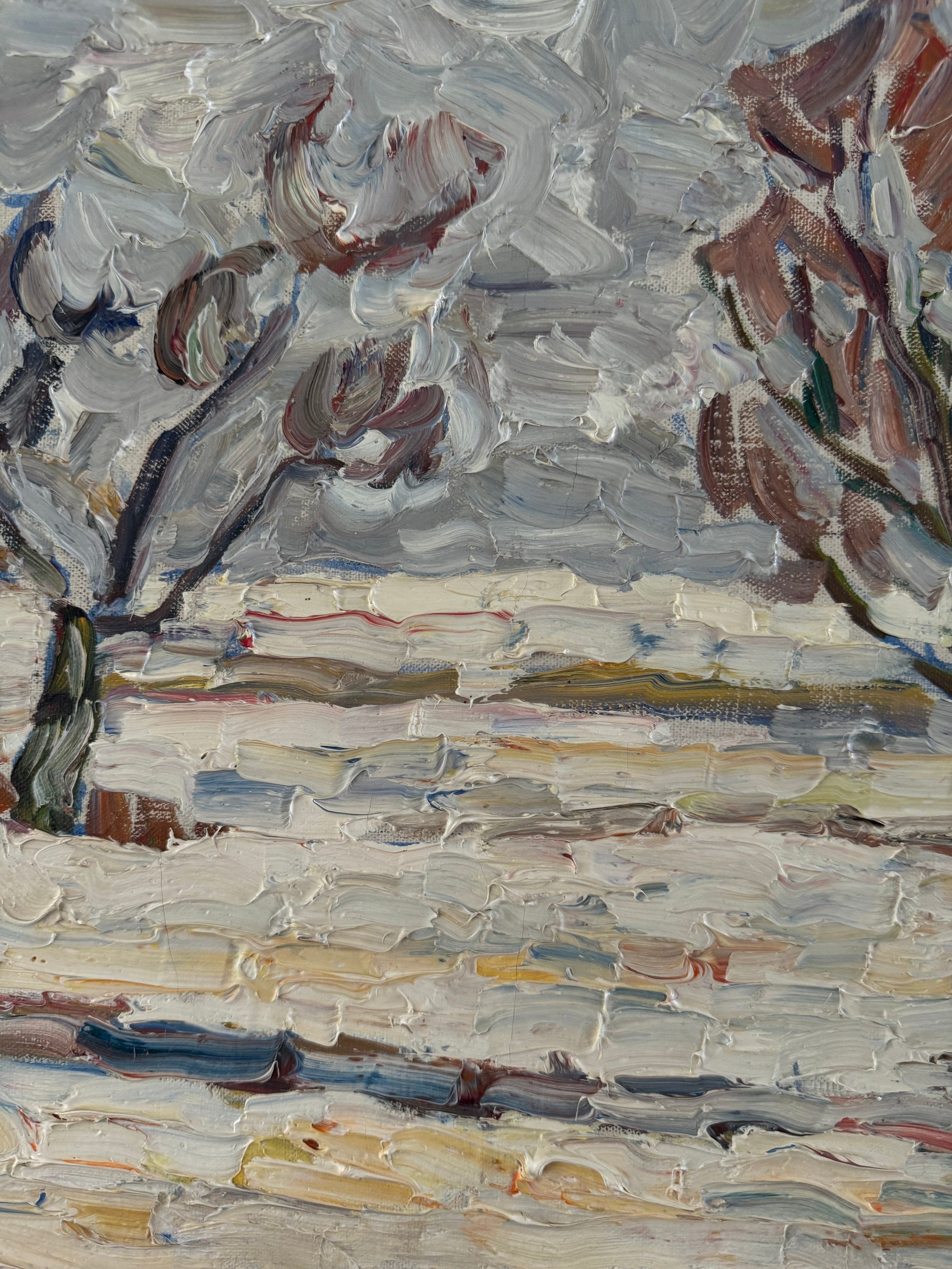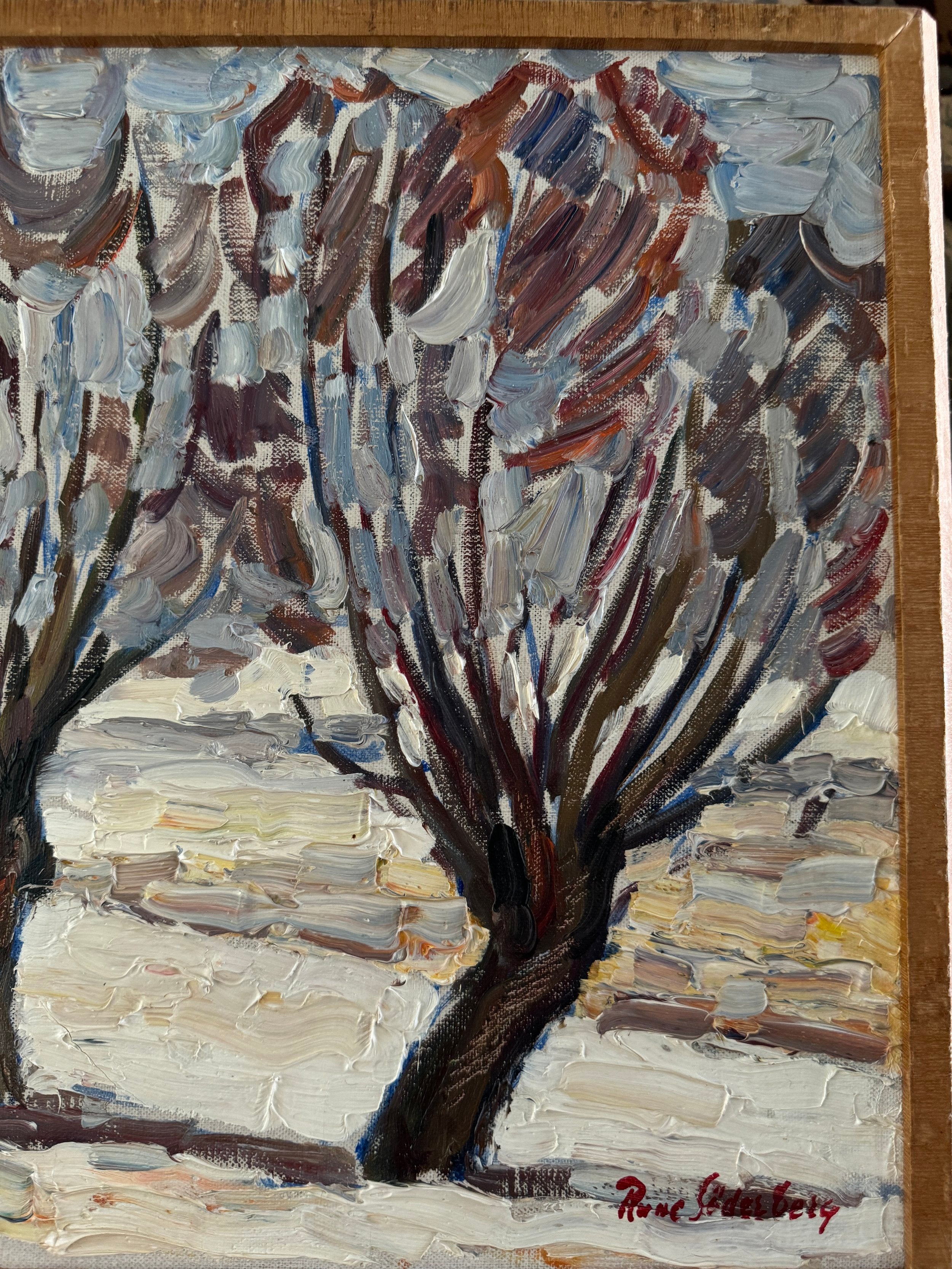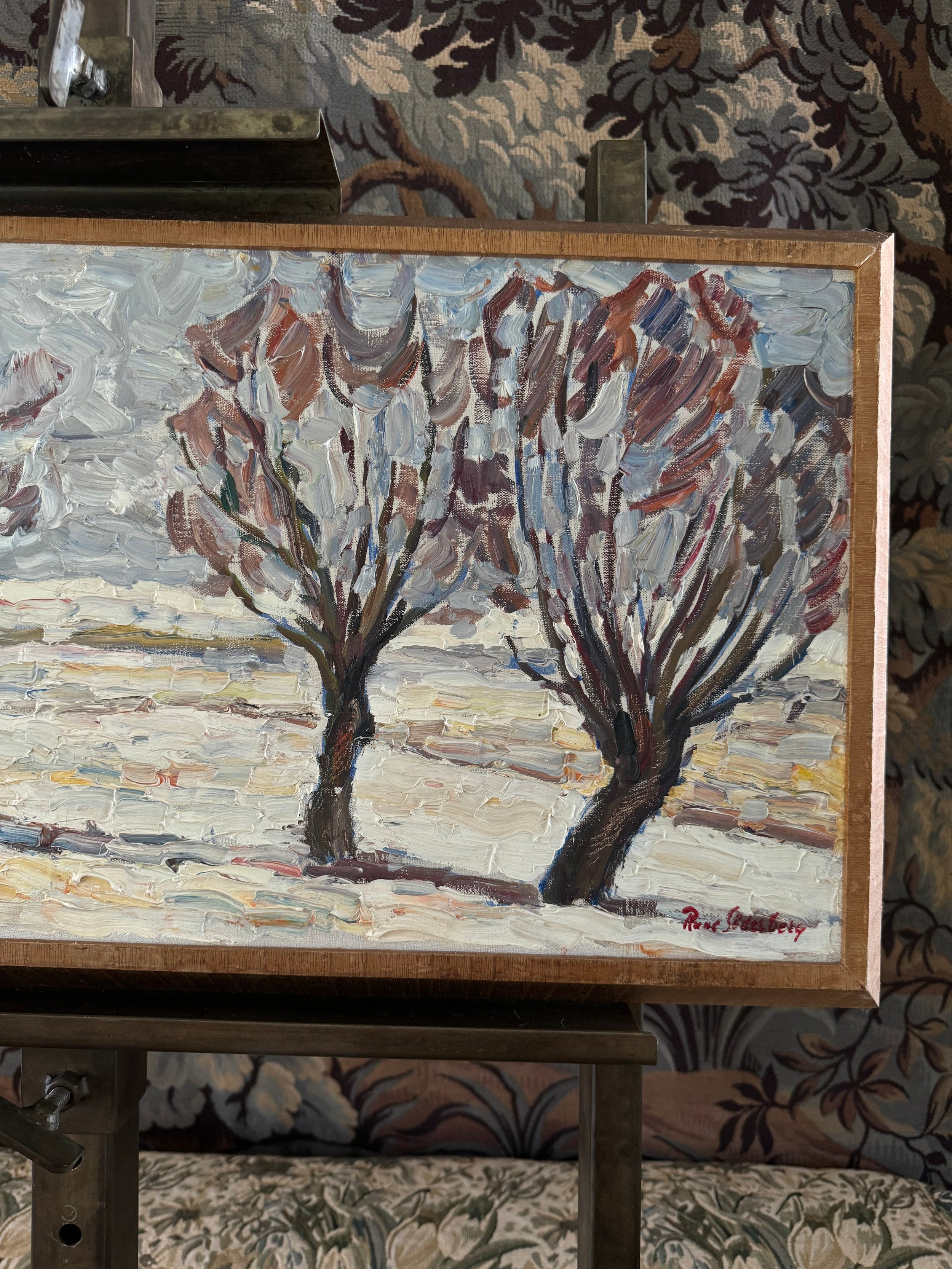 This Swedish midcentury oil on canvas captures a winter landscape with a masterful use of texture and expressive brushwork. The scene features a series of bare trees, their branches swept by a chilly wind, standing against a muted, overcast sky. The painter's use of thick, impasto strokes brings the snow-covered ground to life, emphasizing the rugged terrain and the season’s stark beauty. Hints of rust and ochre add warmth to the otherwise cool palette, creating contrast and depth. It is surrounded by the original frame.