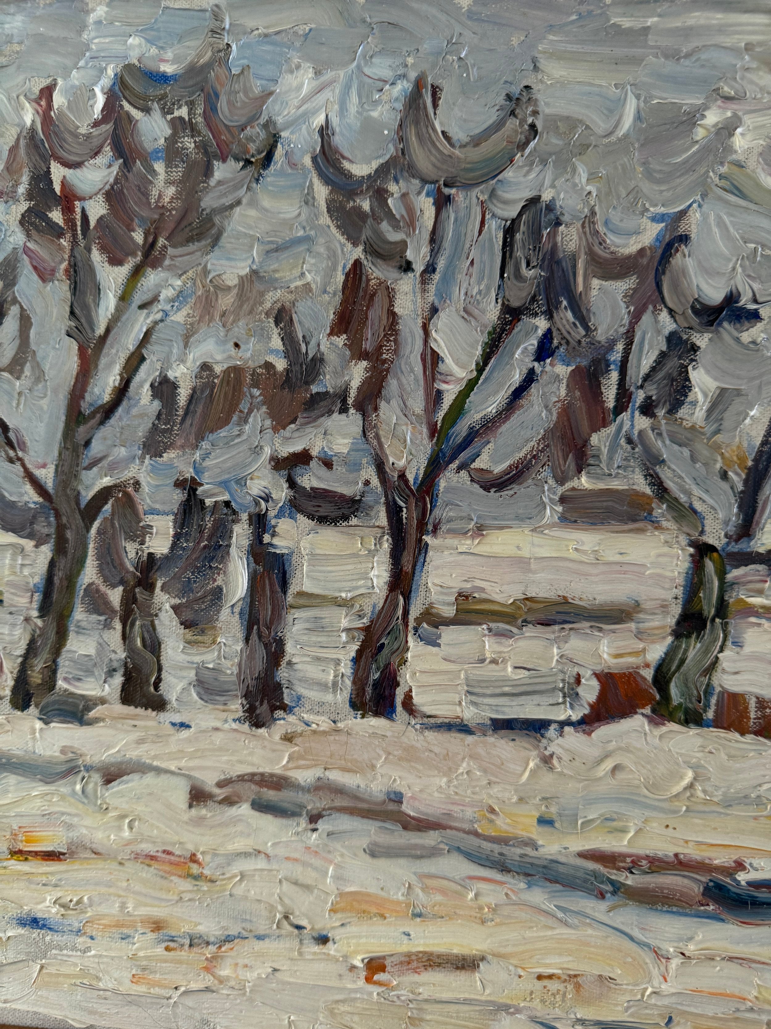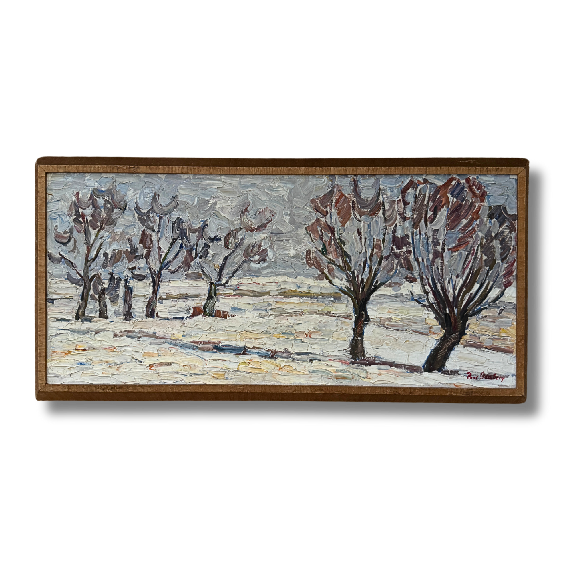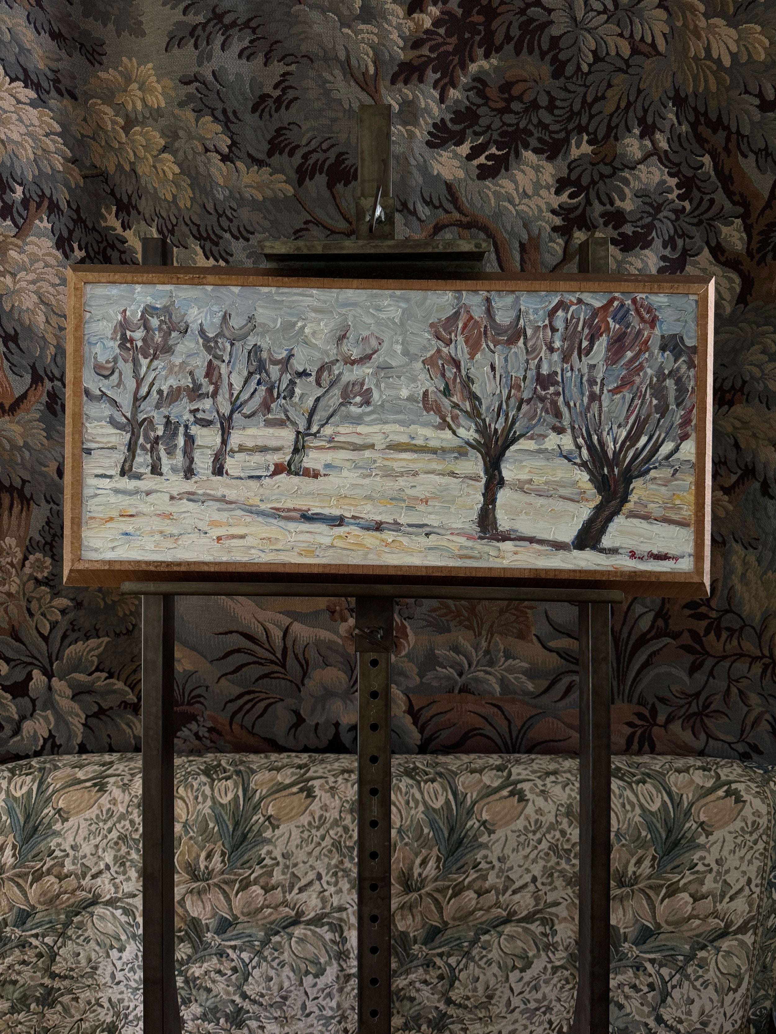 This Swedish midcentury oil on canvas captures a winter landscape with a masterful use of texture and expressive brushwork. The scene features a series of bare trees, their branches swept by a chilly wind, standing against a muted, overcast sky. The painter's use of thick, impasto strokes brings the snow-covered ground to life, emphasizing the rugged terrain and the season’s stark beauty. Hints of rust and ochre add warmth to the otherwise cool palette, creating contrast and depth. It is surrounded by the original frame.