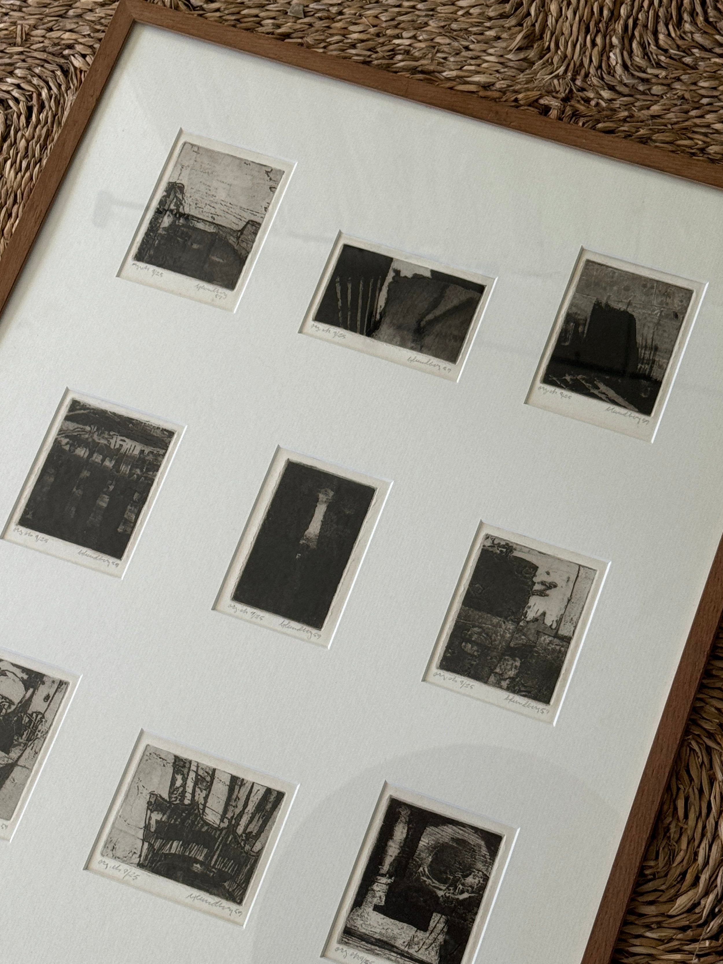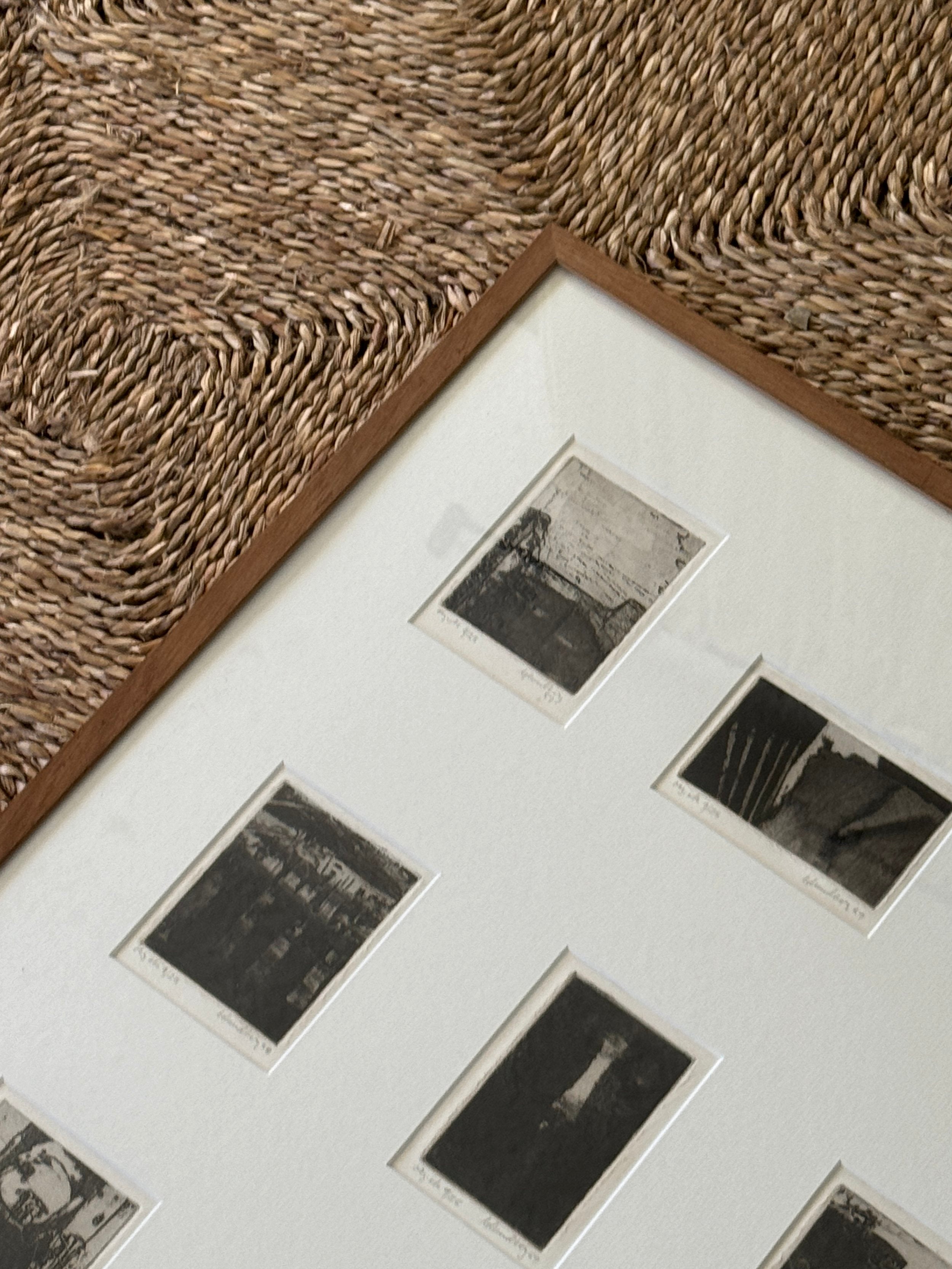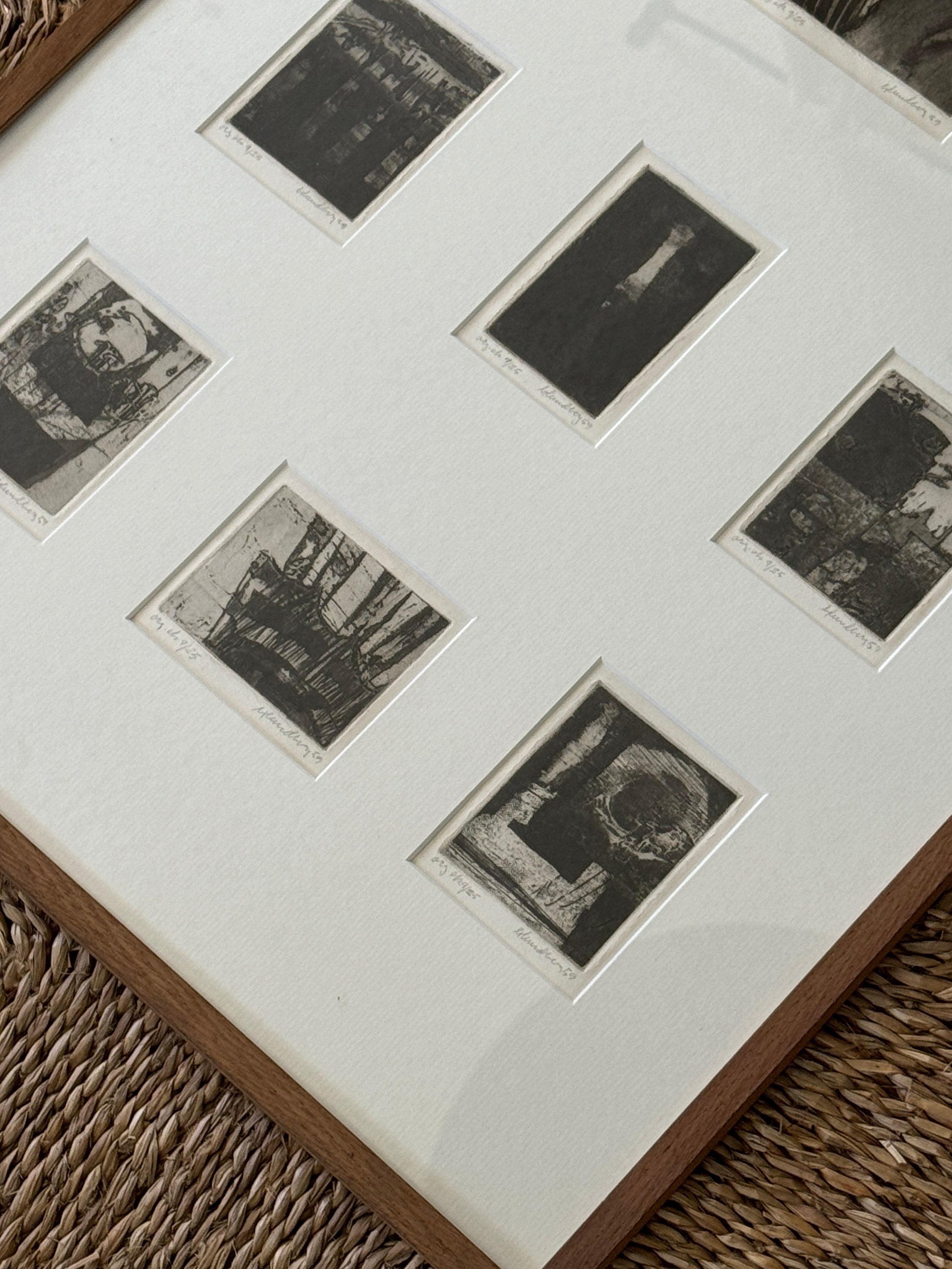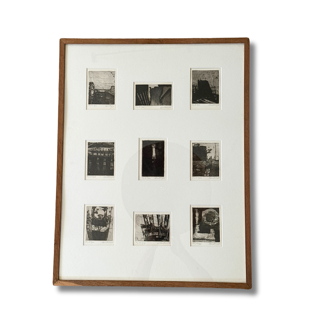 A suite of nine etchings, each one a world unto itself, brought together in a single frame to form a compelling visual rhythm. The works balance abstraction and structure, shadows, grids, and architectural fragments dissolve into textural fields of black and grey. Each print bears its own title and date, the artist’s hand evident in the subtle variations of line and tone, yet collectively they echo one another like stanzas in a poem. Hung as a group, they create an atmospheric narrative, intimate in scale yet expansive in their evocation of memory, place, and time.