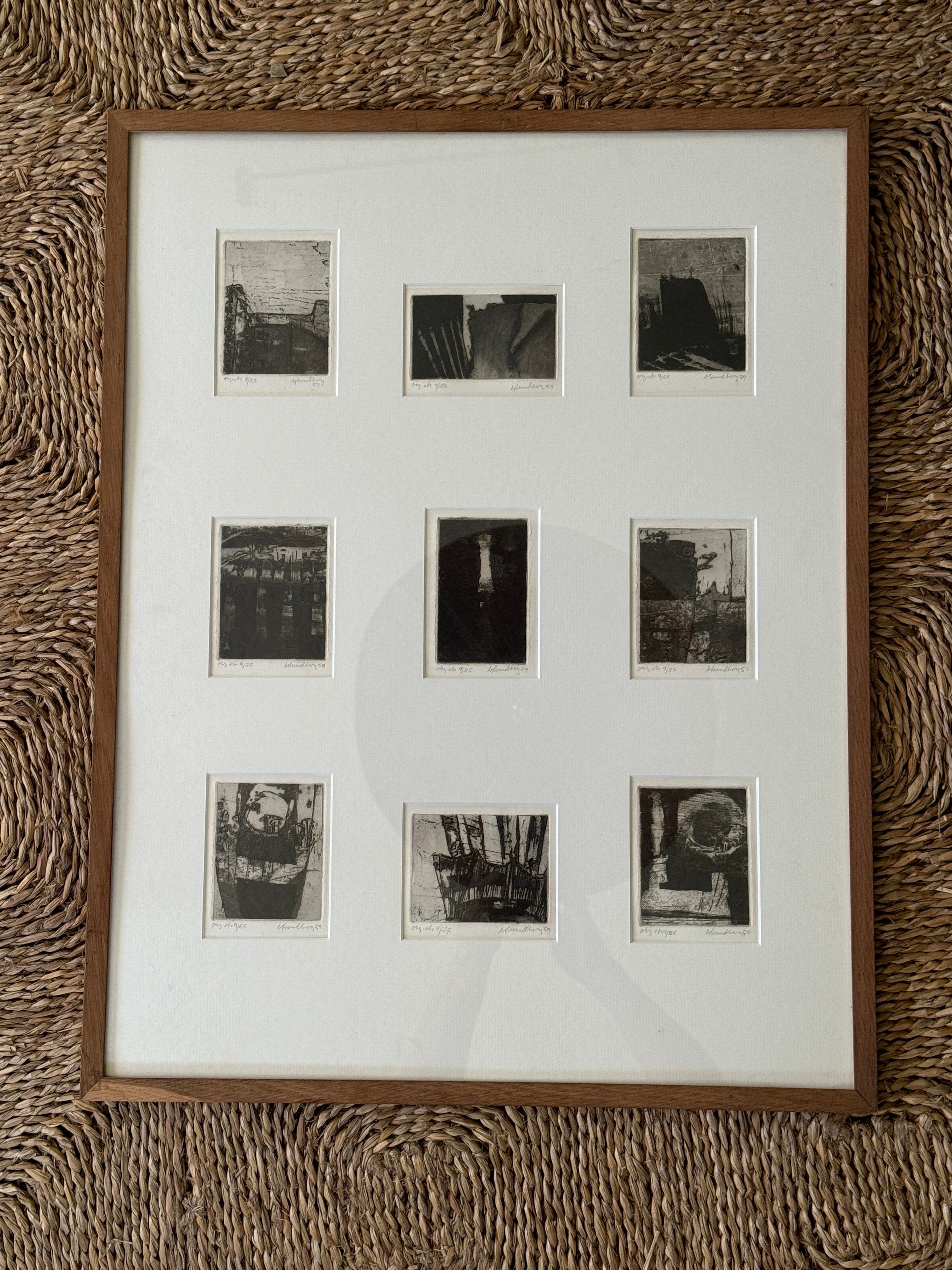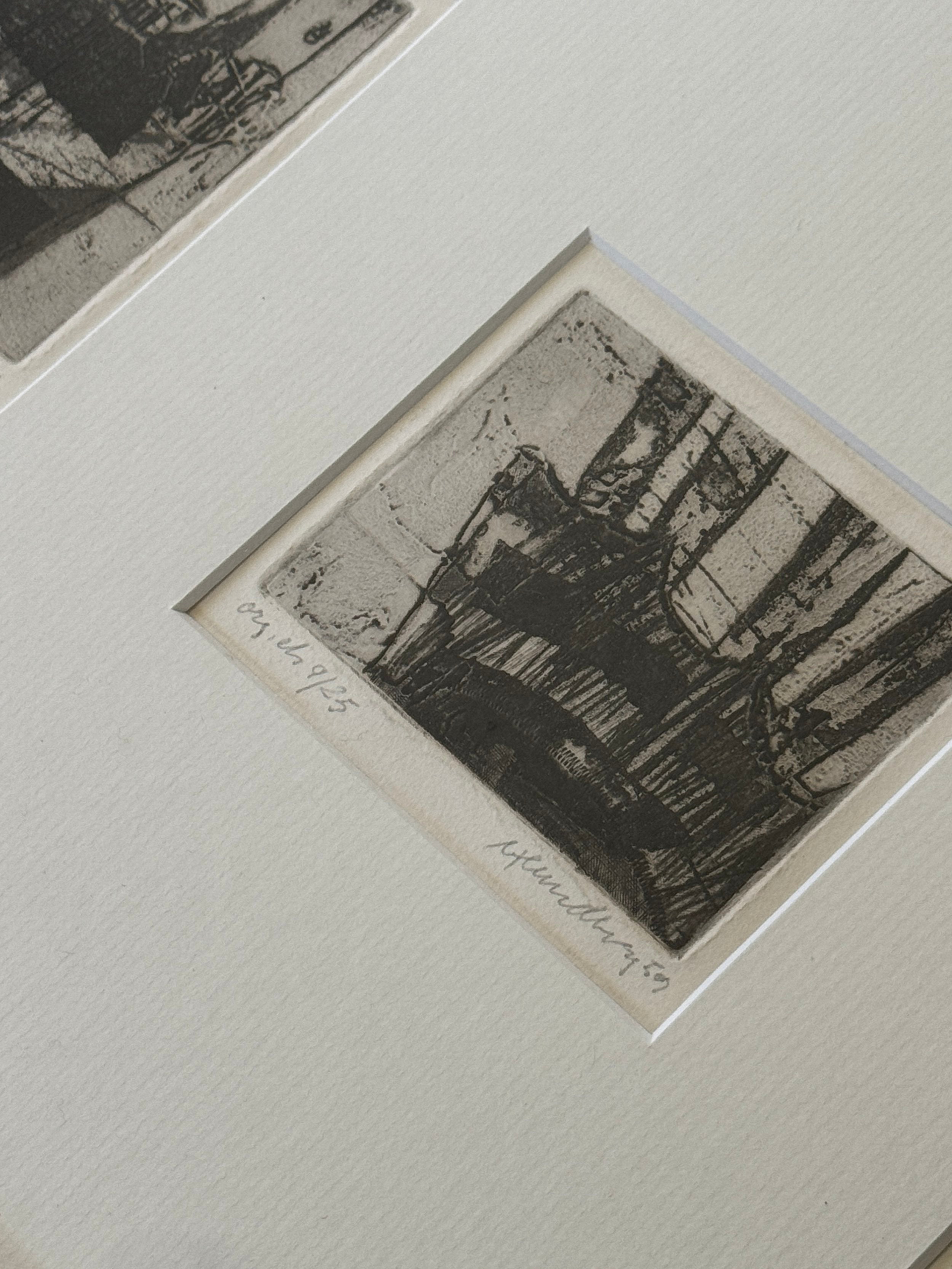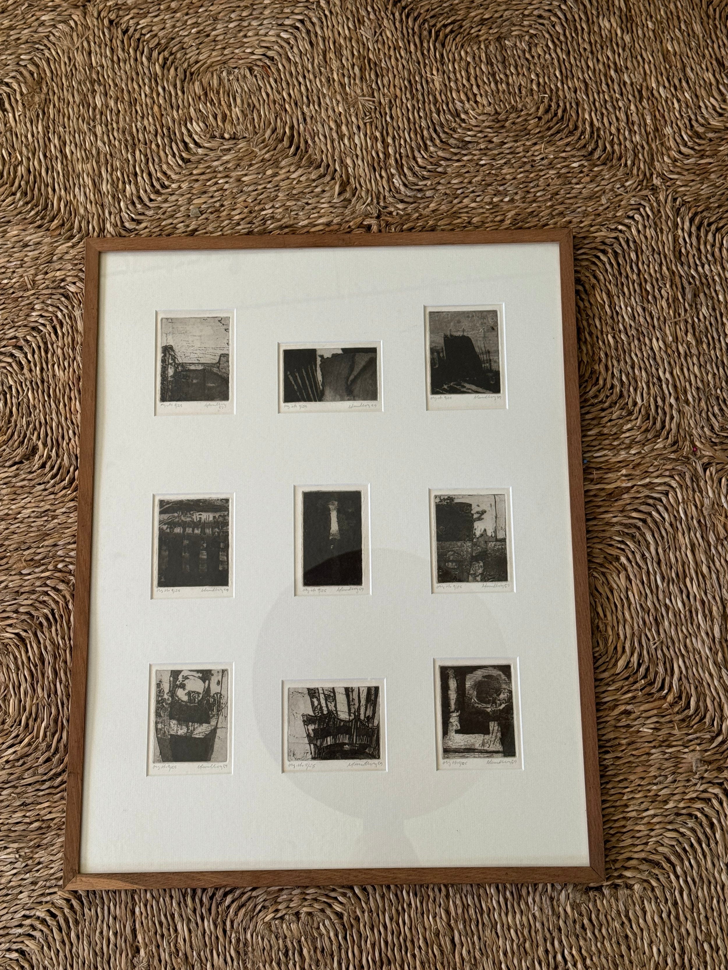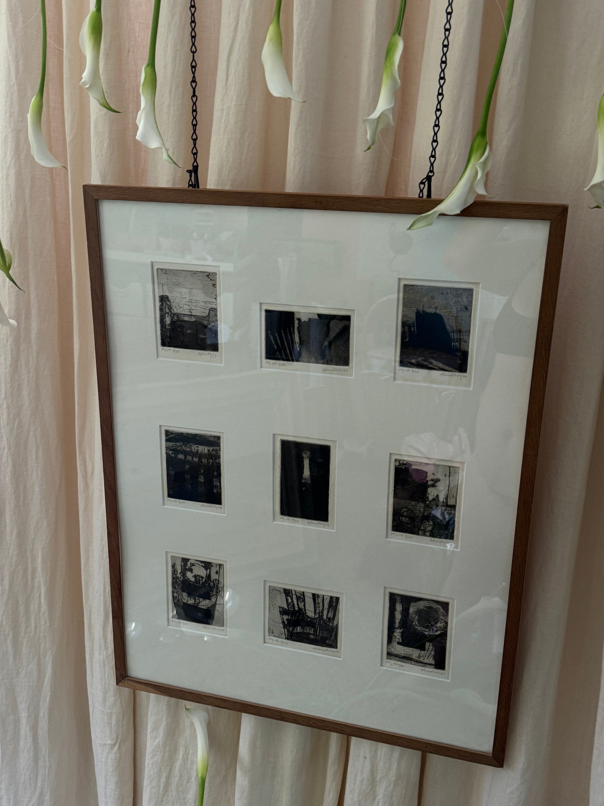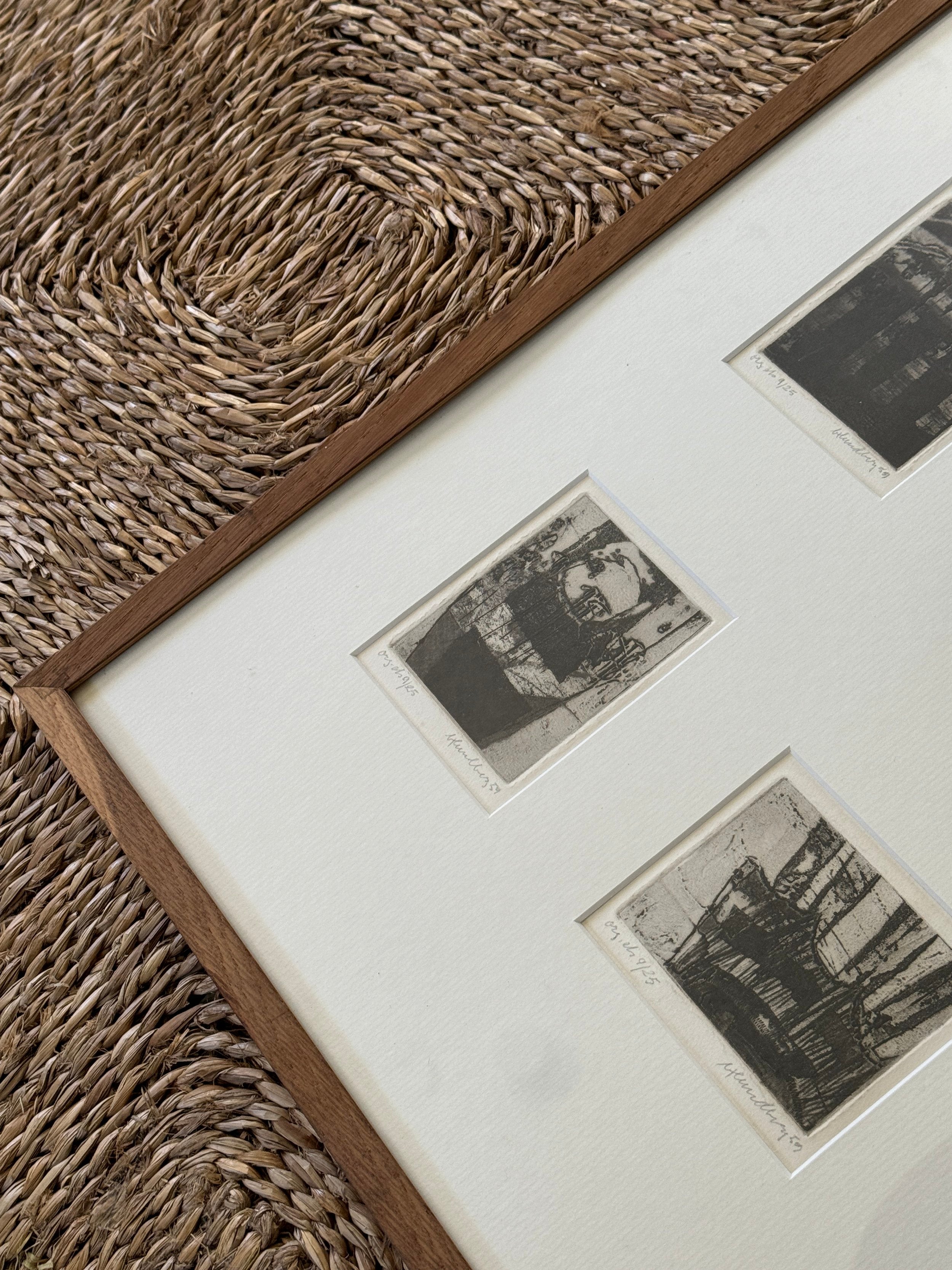 A suite of nine etchings, each one a world unto itself, brought together in a single frame to form a compelling visual rhythm. The works balance abstraction and structure, shadows, grids, and architectural fragments dissolve into textural fields of black and grey. Each print bears its own title and date, the artist’s hand evident in the subtle variations of line and tone, yet collectively they echo one another like stanzas in a poem. Hung as a group, they create an atmospheric narrative, intimate in scale yet expansive in their evocation of memory, place, and time.