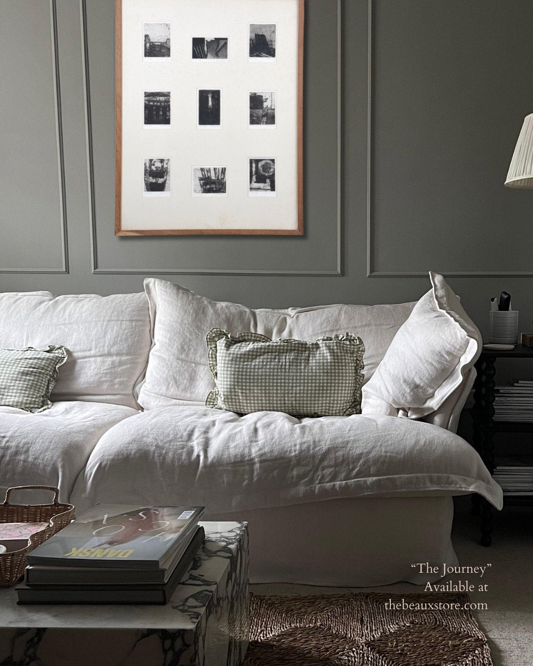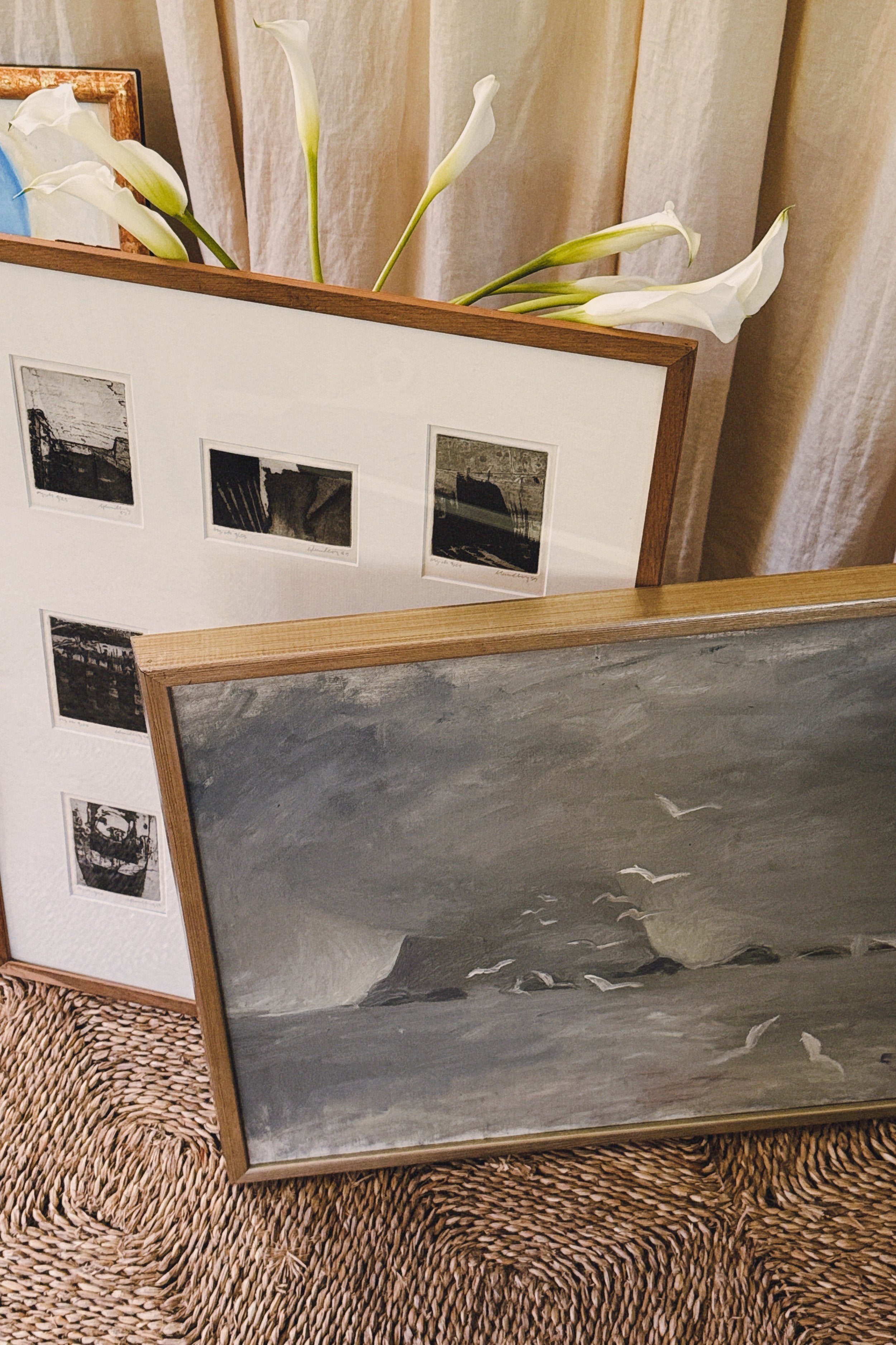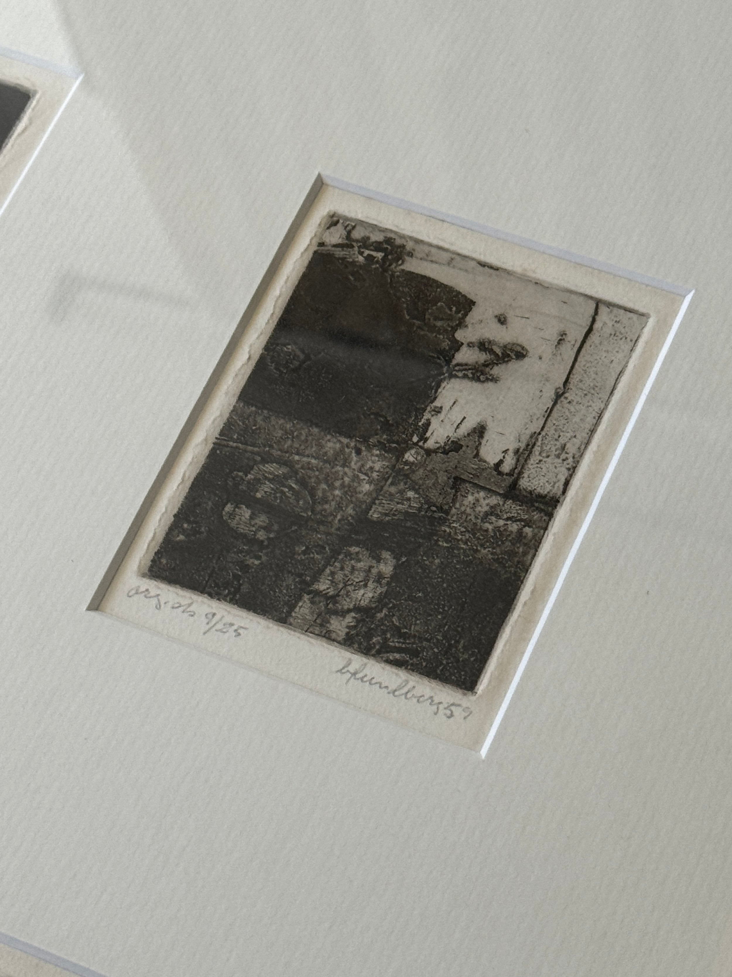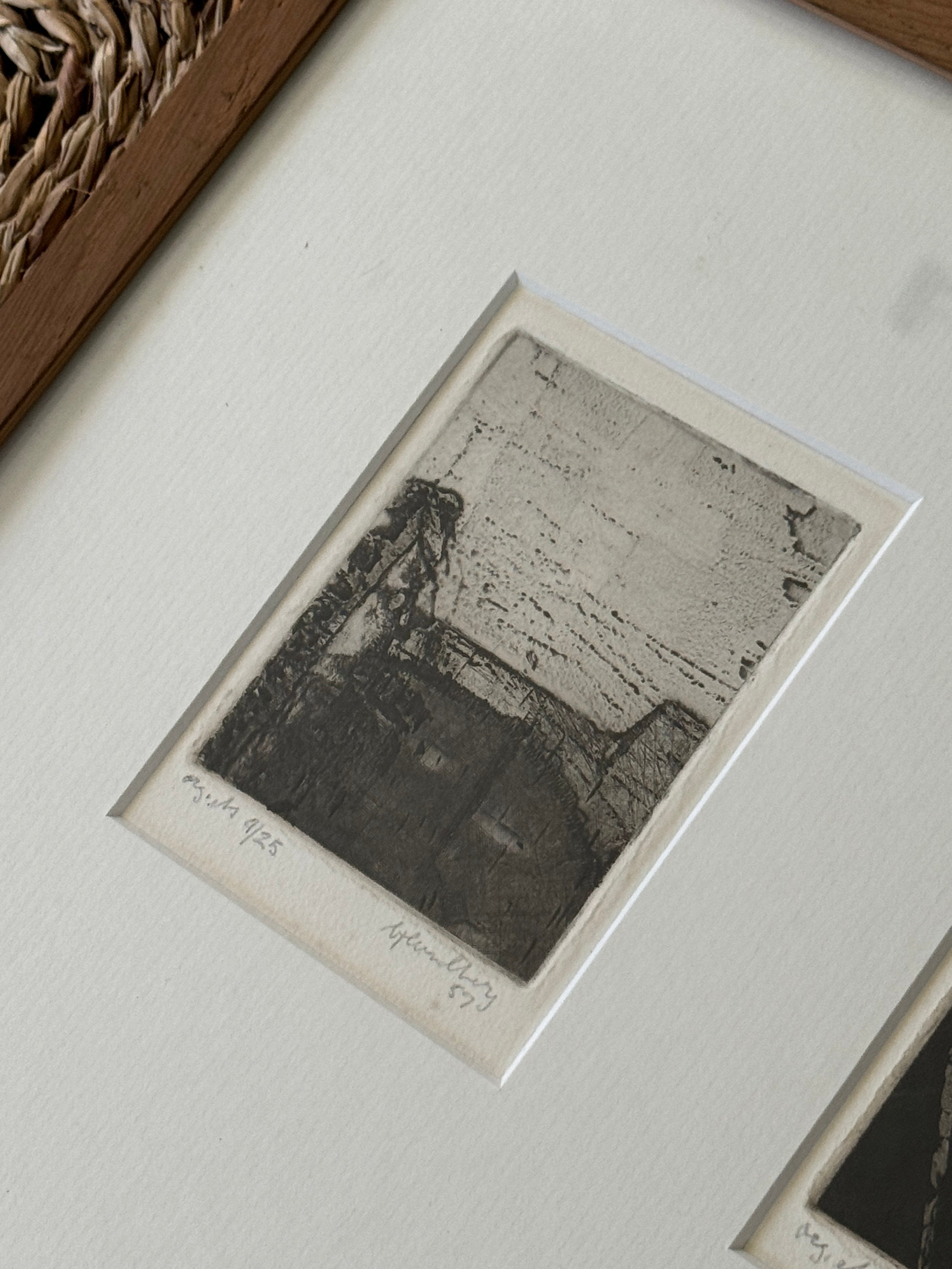 A suite of nine etchings, each one a world unto itself, brought together in a single frame to form a compelling visual rhythm. The works balance abstraction and structure, shadows, grids, and architectural fragments dissolve into textural fields of black and grey. Each print bears its own title and date, the artist’s hand evident in the subtle variations of line and tone, yet collectively they echo one another like stanzas in a poem. Hung as a group, they create an atmospheric narrative, intimate in scale yet expansive in their evocation of memory, place, and time.