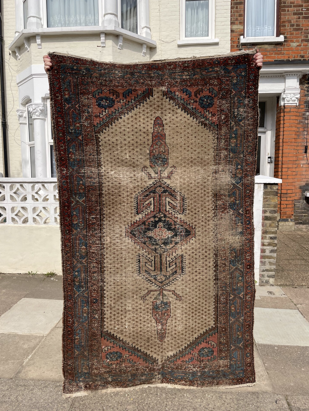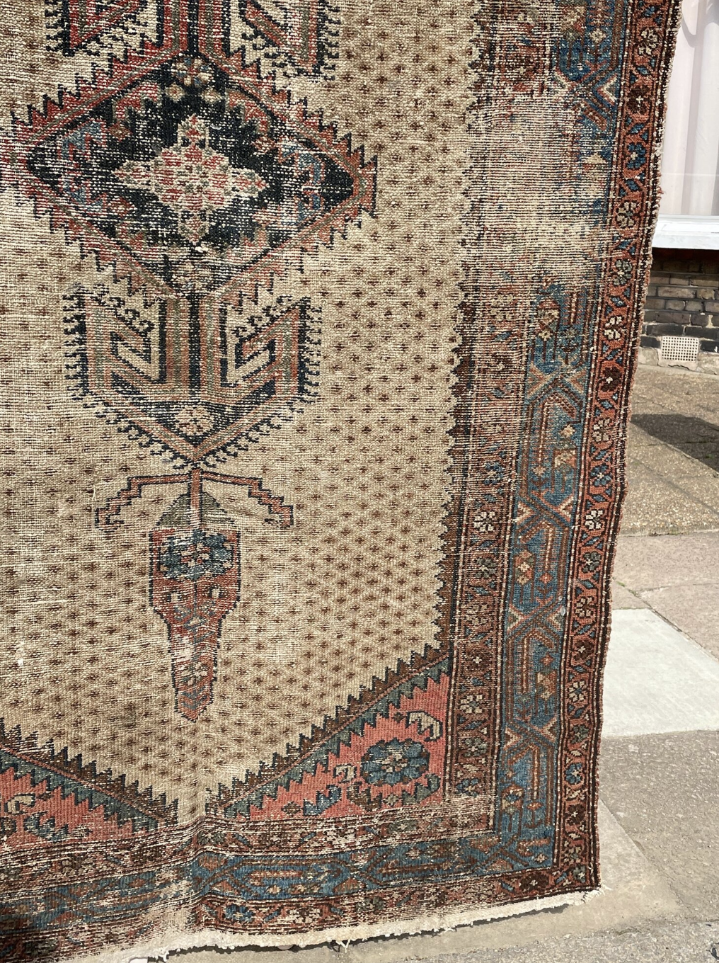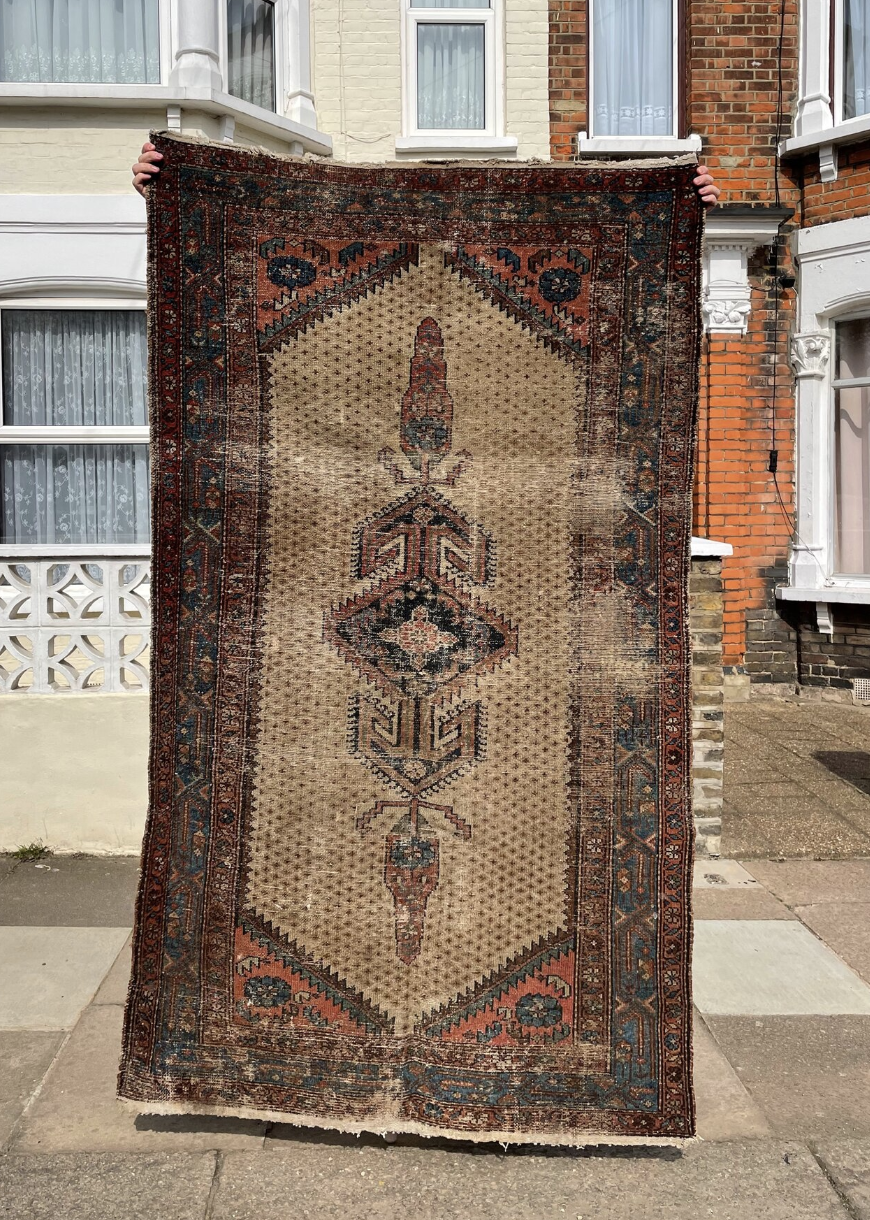 Here is a Kurdish Mosul Rug from circa 1900 that is perfectly worn (with one tear that is about 3-4cm) and it is a hang-knotted wool piece. Mosel rugs are tribal carpets made in the Kurdish nomadic districts of NW Iran. Sourced in England.
