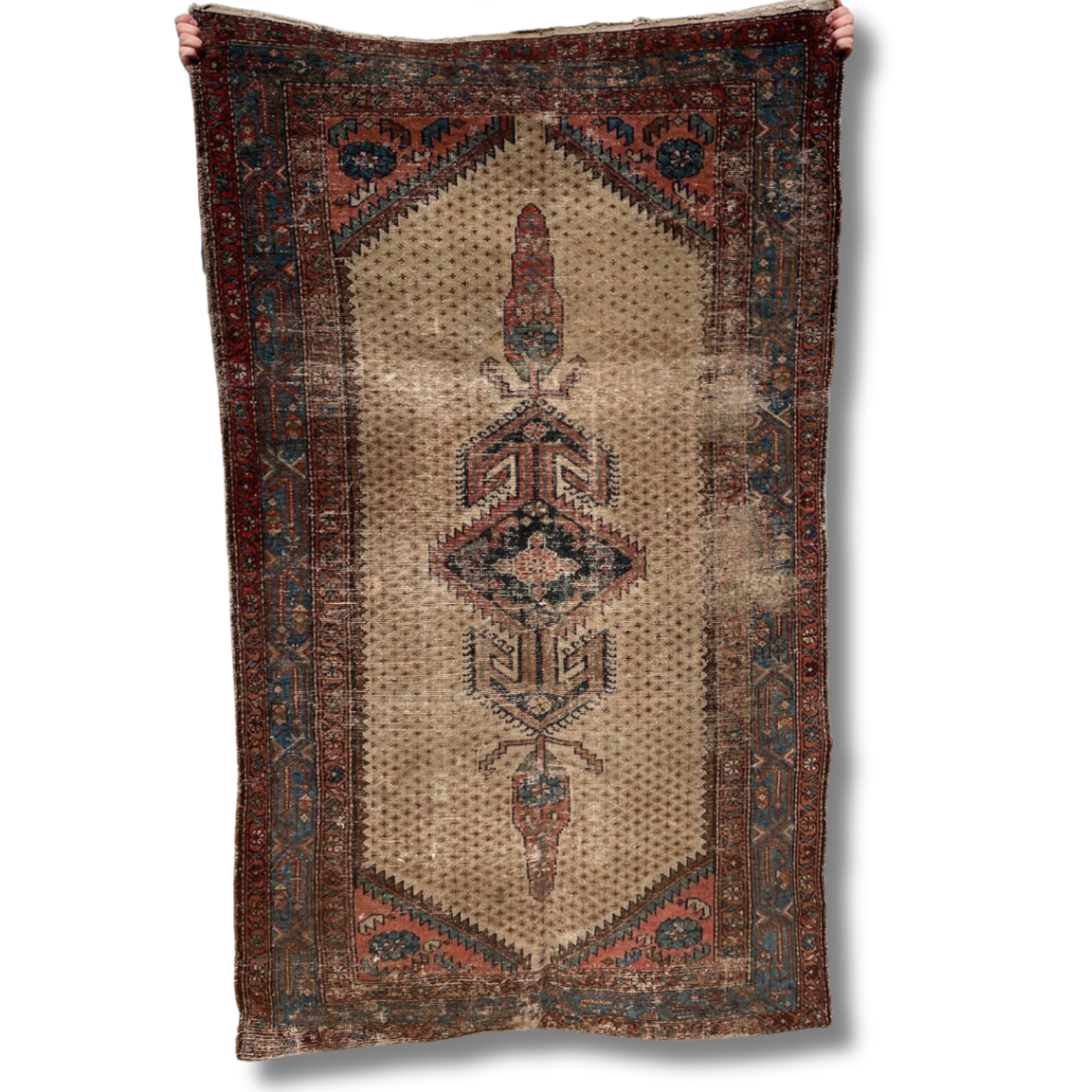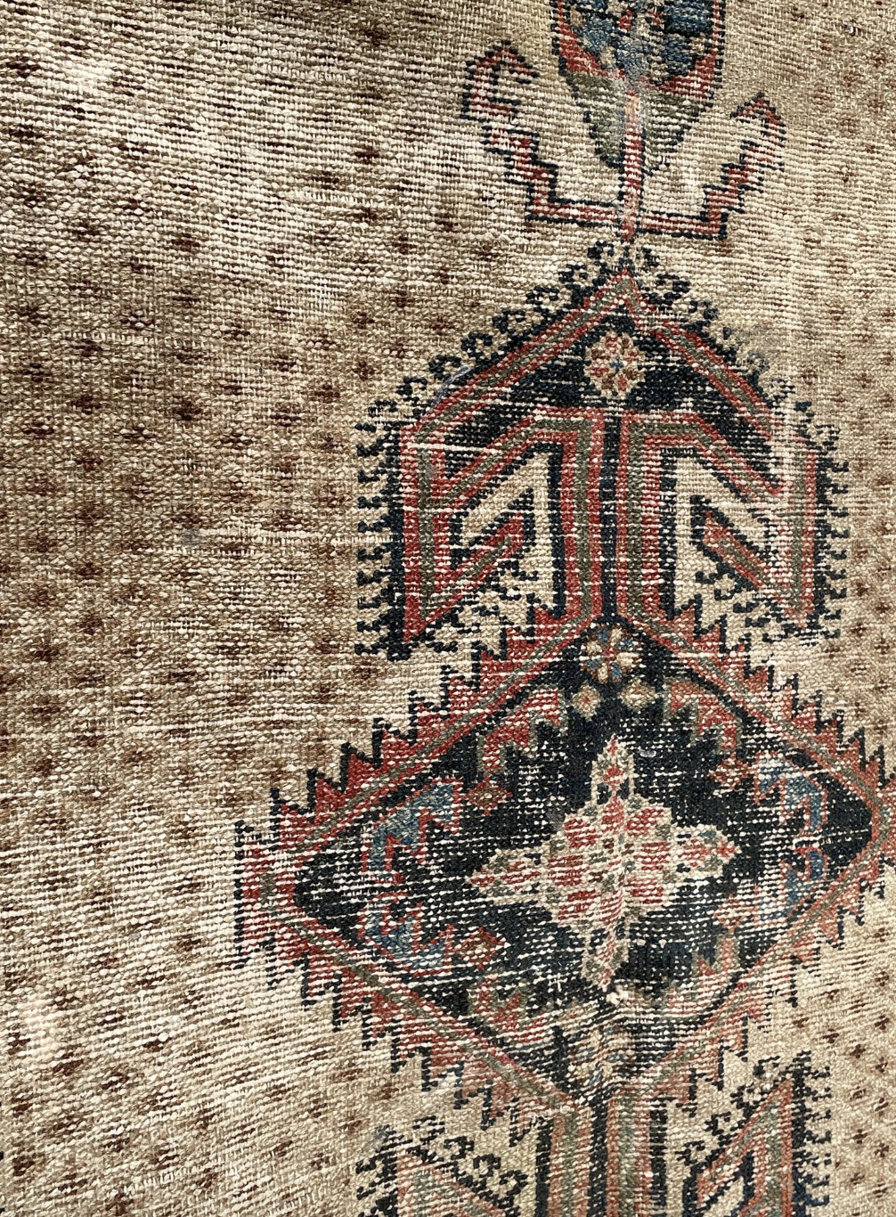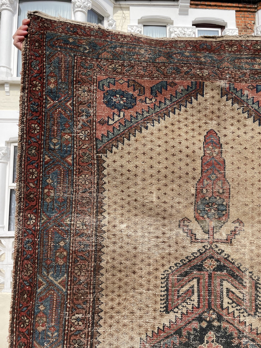 Here is a Kurdish Mosul Rug from circa 1900 that is perfectly worn (with one tear that is about 3-4cm) and it is a hang-knotted wool piece. Mosel rugs are tribal carpets made in the Kurdish nomadic districts of NW Iran. Sourced in England.