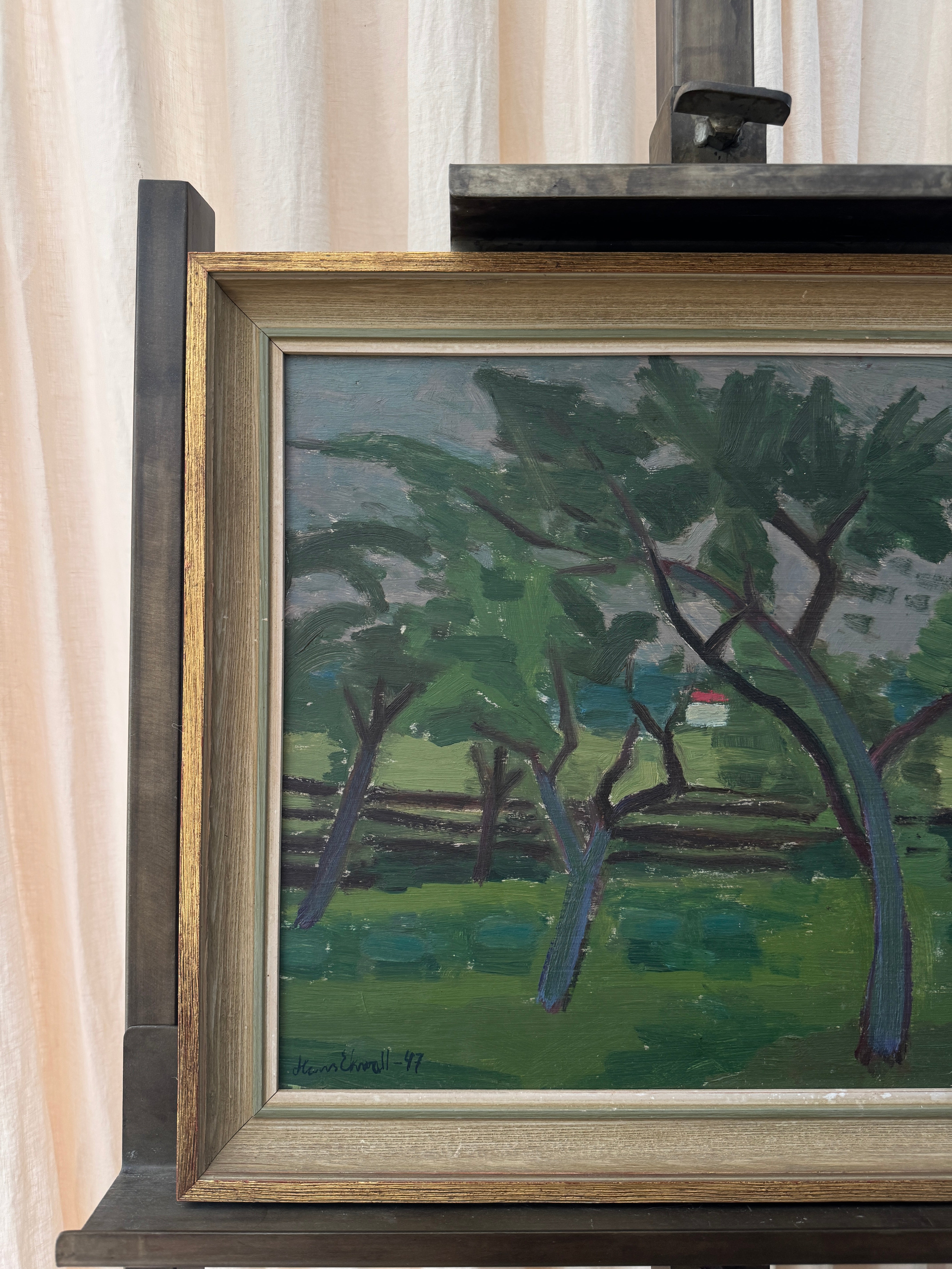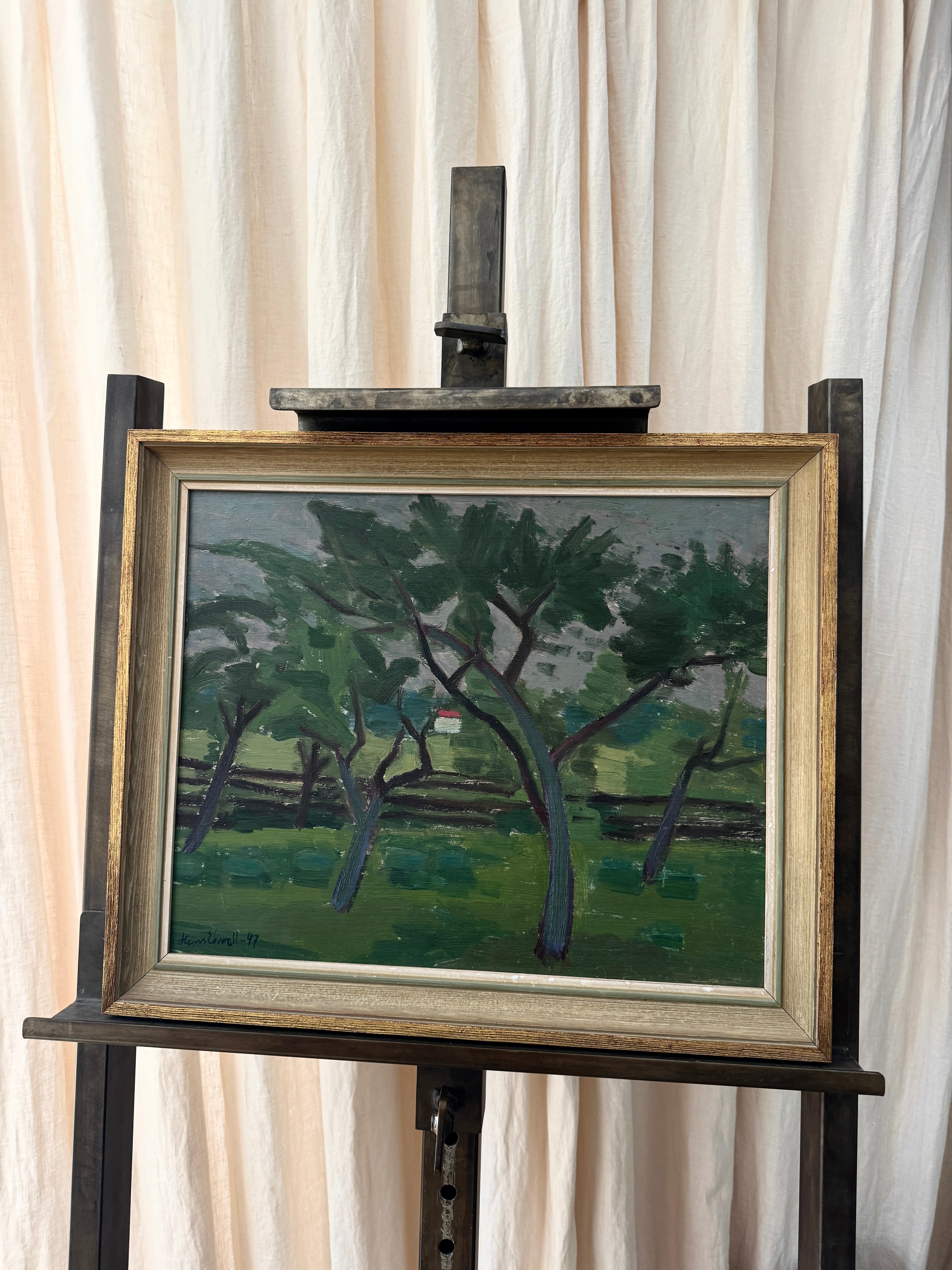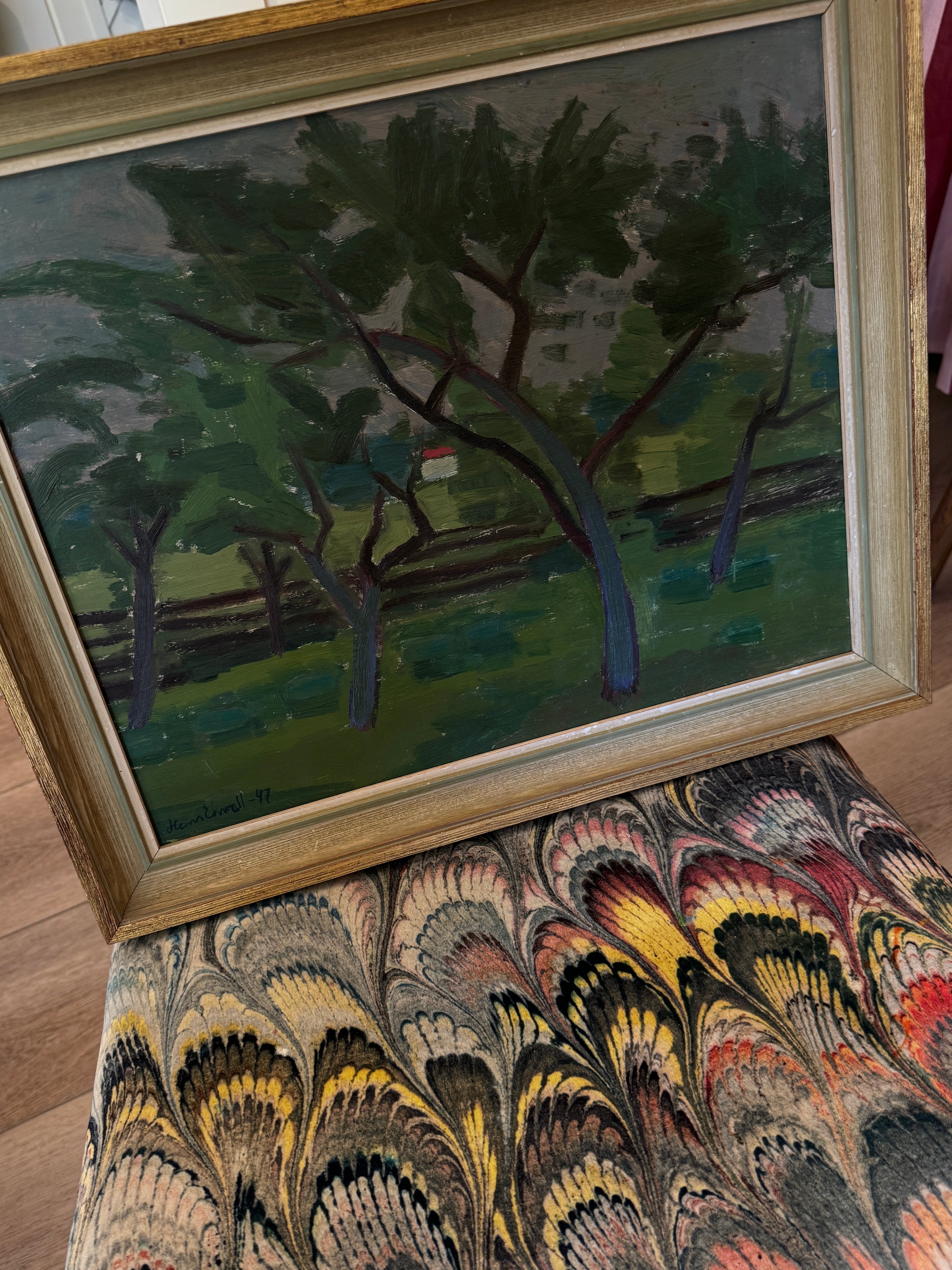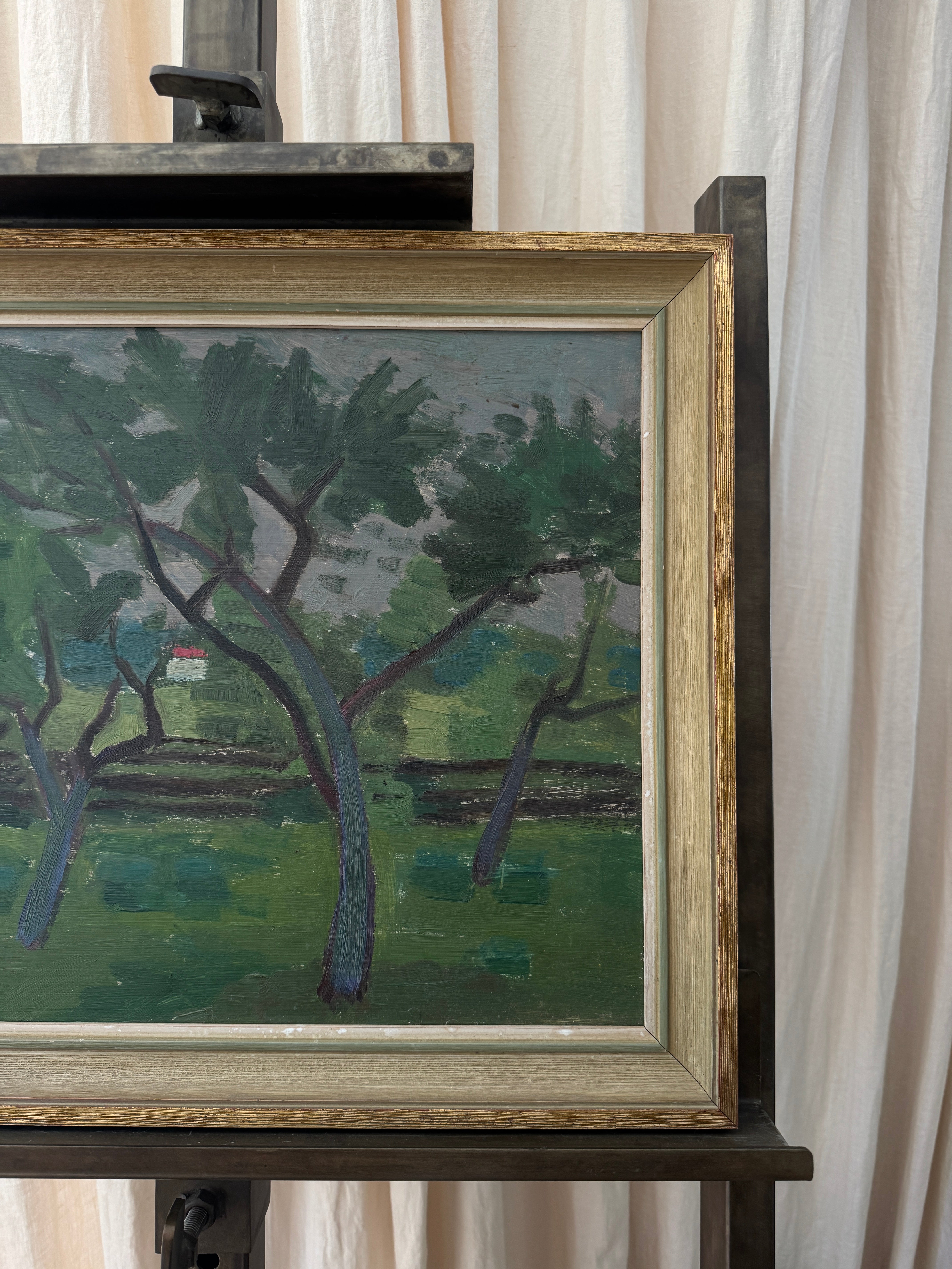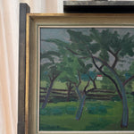 This 1947 landscape hums with that unmistakable Scandinavian ease...loose, gestural trees swaying in a rhythm that feels almost musical, their trunks bending like dancers across a green, painterly field. The artist captures not perfection but sensation: the cool hush of an overcast day, the soft scatter of brushstrokes suggesting movement, memory, and the kind of quiet you only find when you’ve wandered a bit too far off the path. Framed in a vintage gilt-and-wood surround, it’s the sort of painting that brings instant calm and a whisper of fresh air to any room.