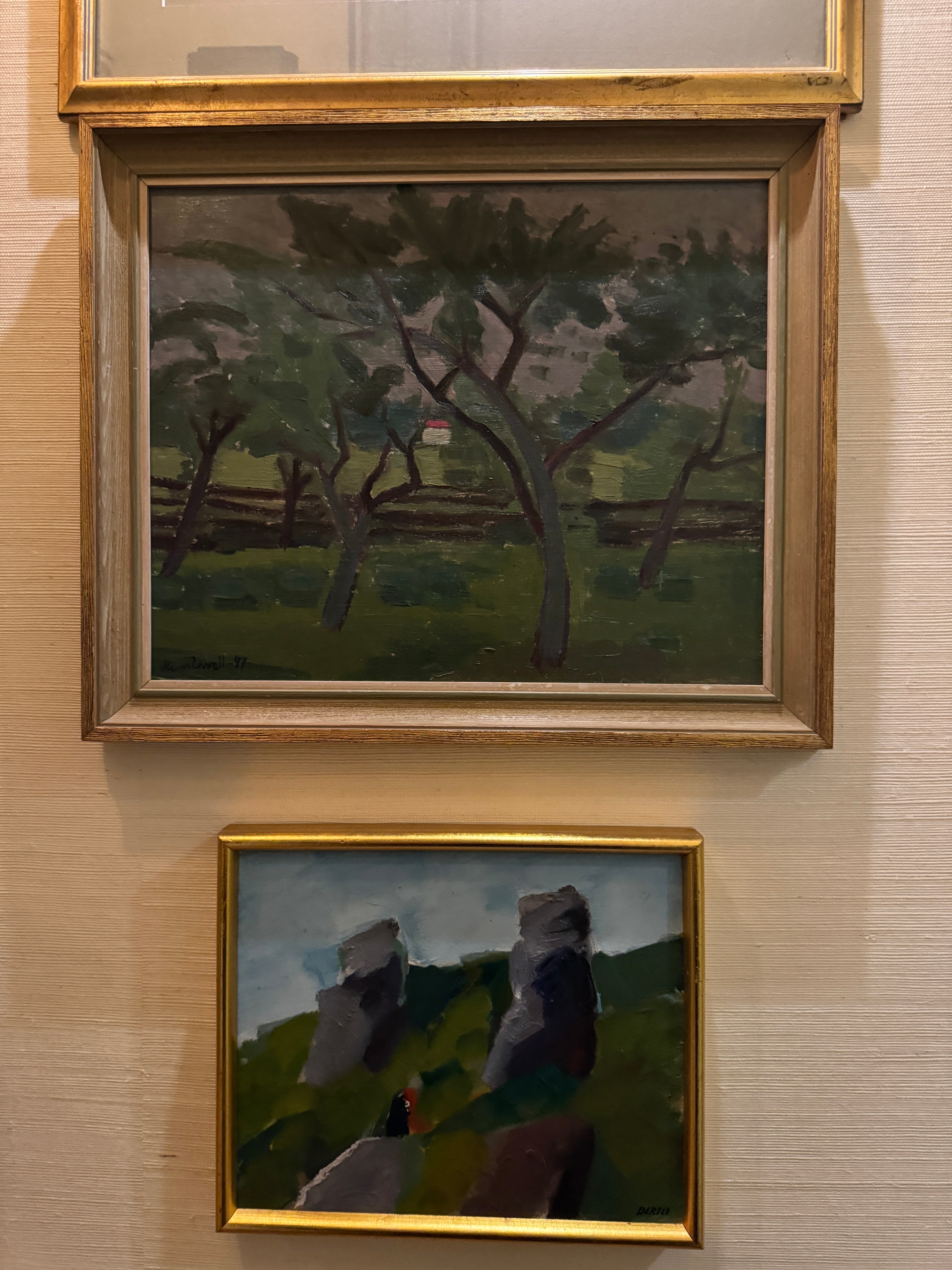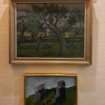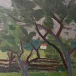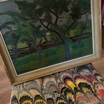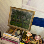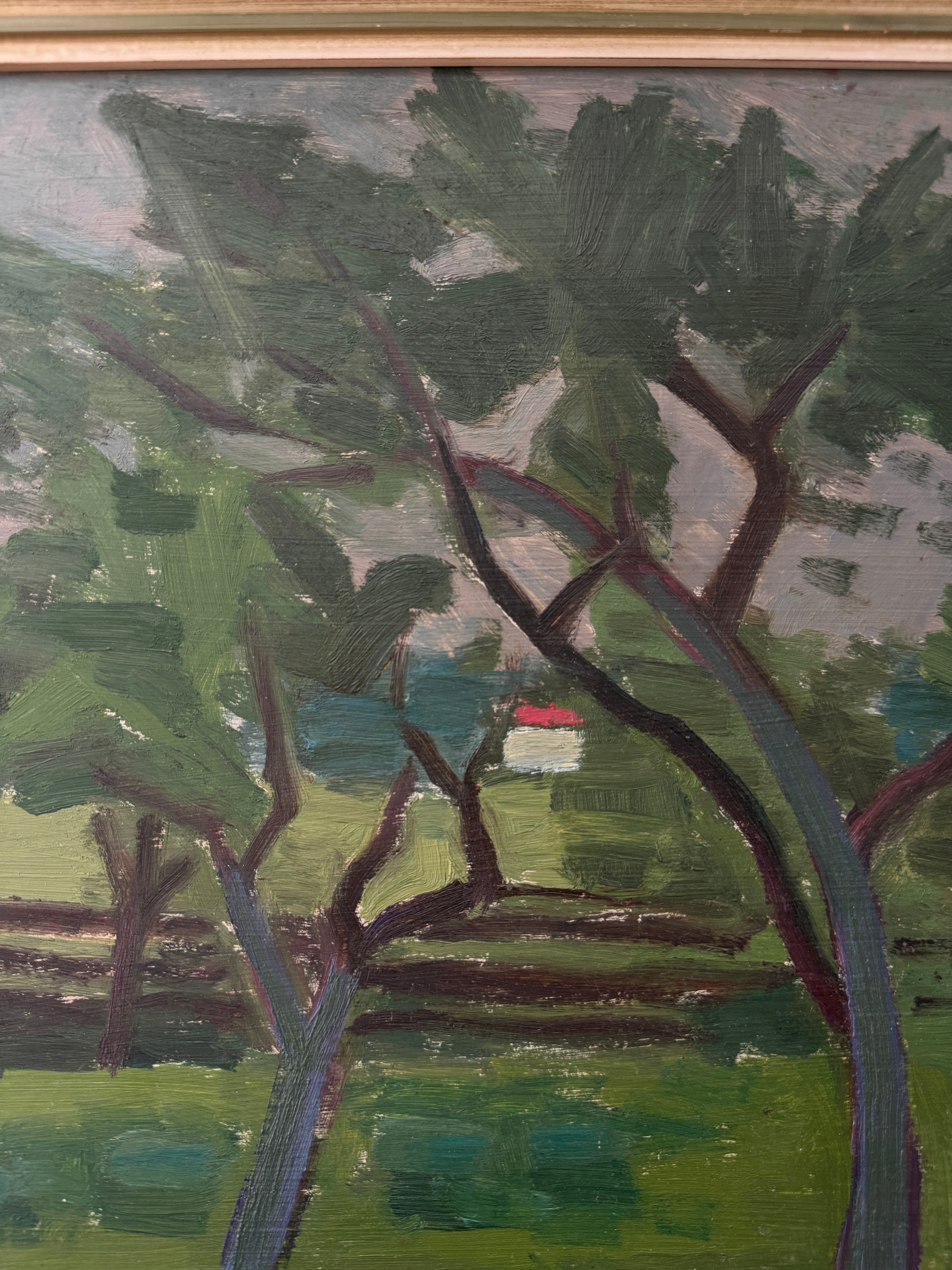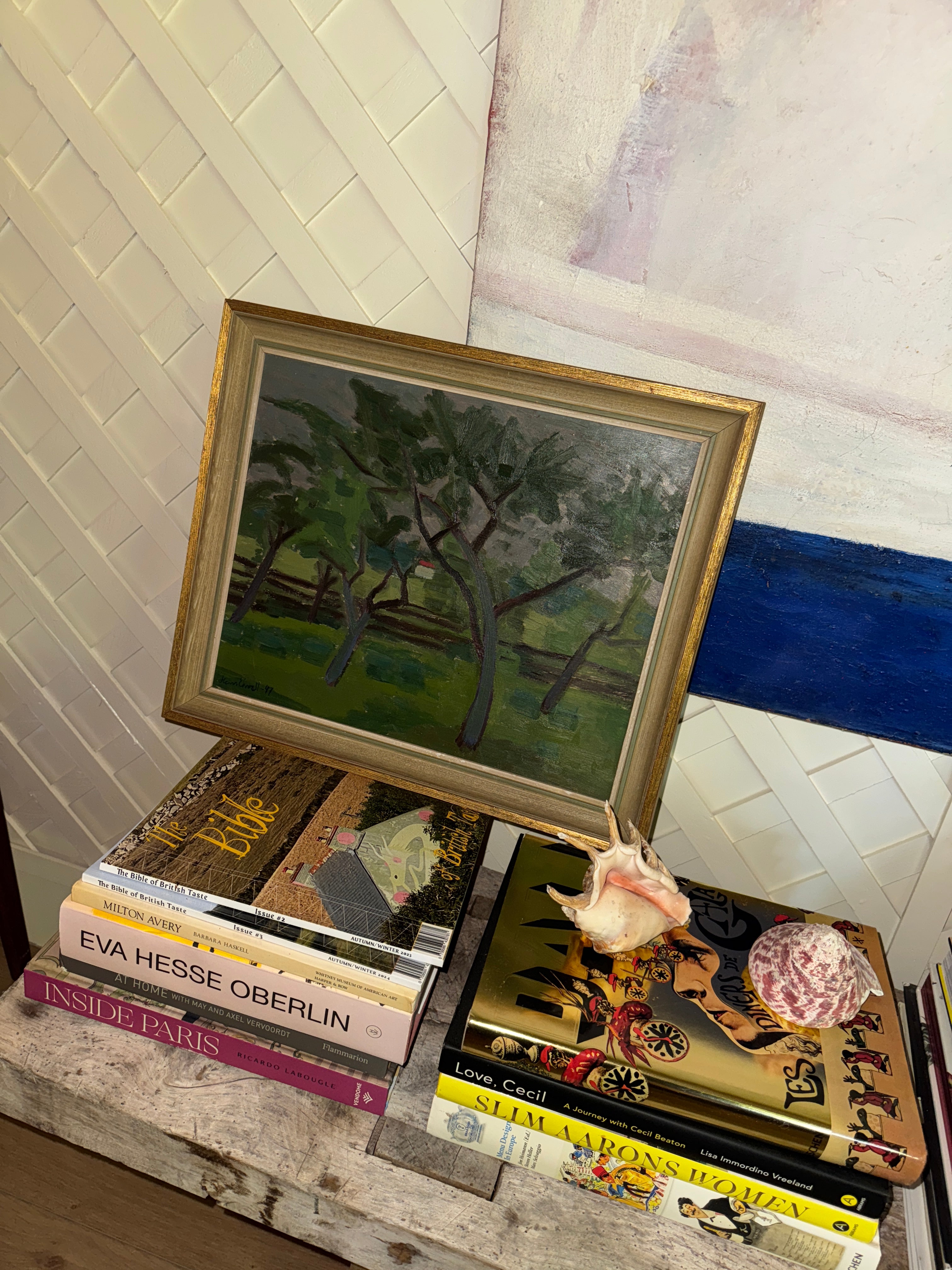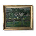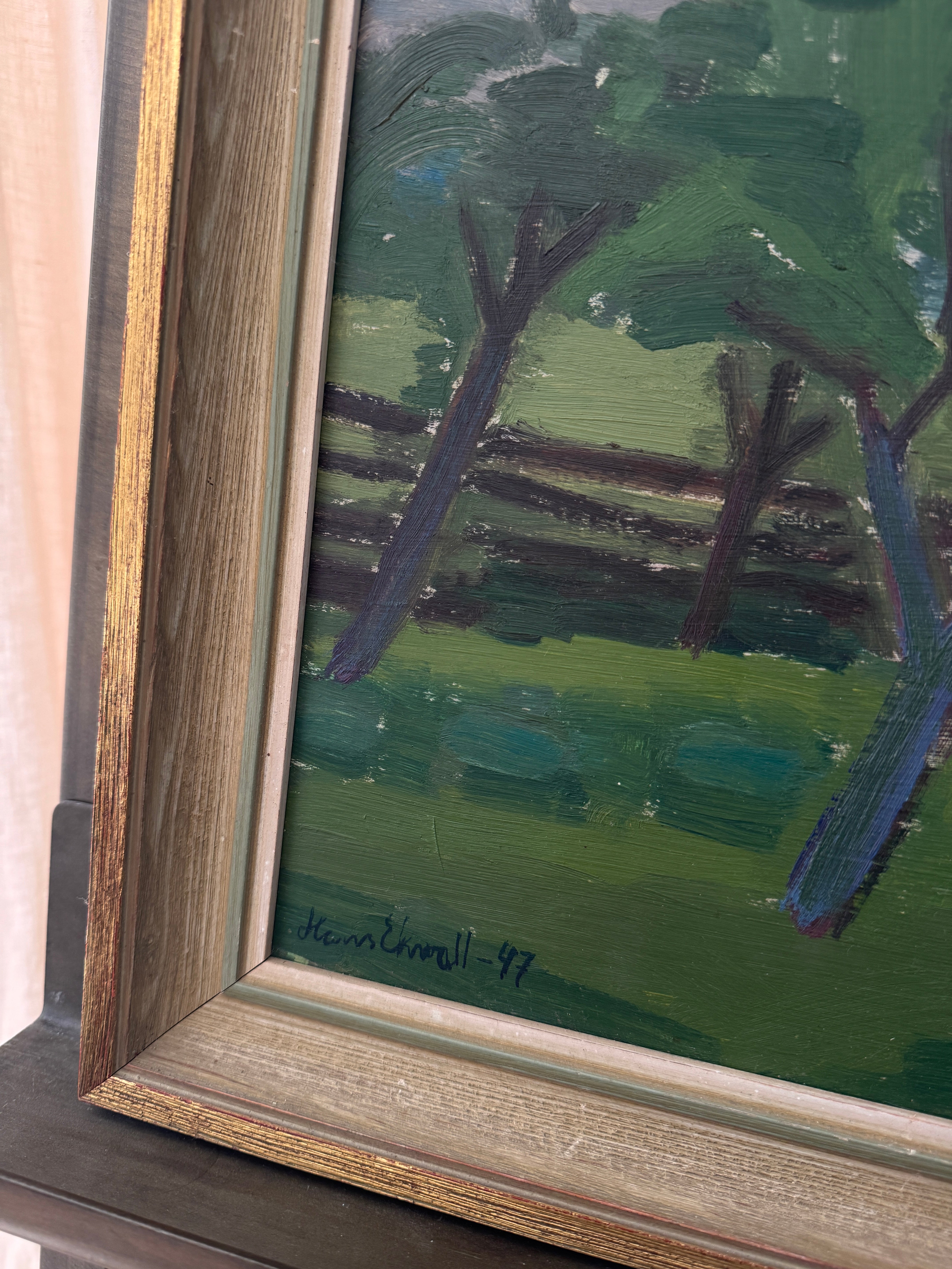 This 1947 landscape hums with that unmistakable Scandinavian ease...loose, gestural trees swaying in a rhythm that feels almost musical, their trunks bending like dancers across a green, painterly field. The artist captures not perfection but sensation: the cool hush of an overcast day, the soft scatter of brushstrokes suggesting movement, memory, and the kind of quiet you only find when you’ve wandered a bit too far off the path. Framed in a vintage gilt-and-wood surround, it’s the sort of painting that brings instant calm and a whisper of fresh air to any room.