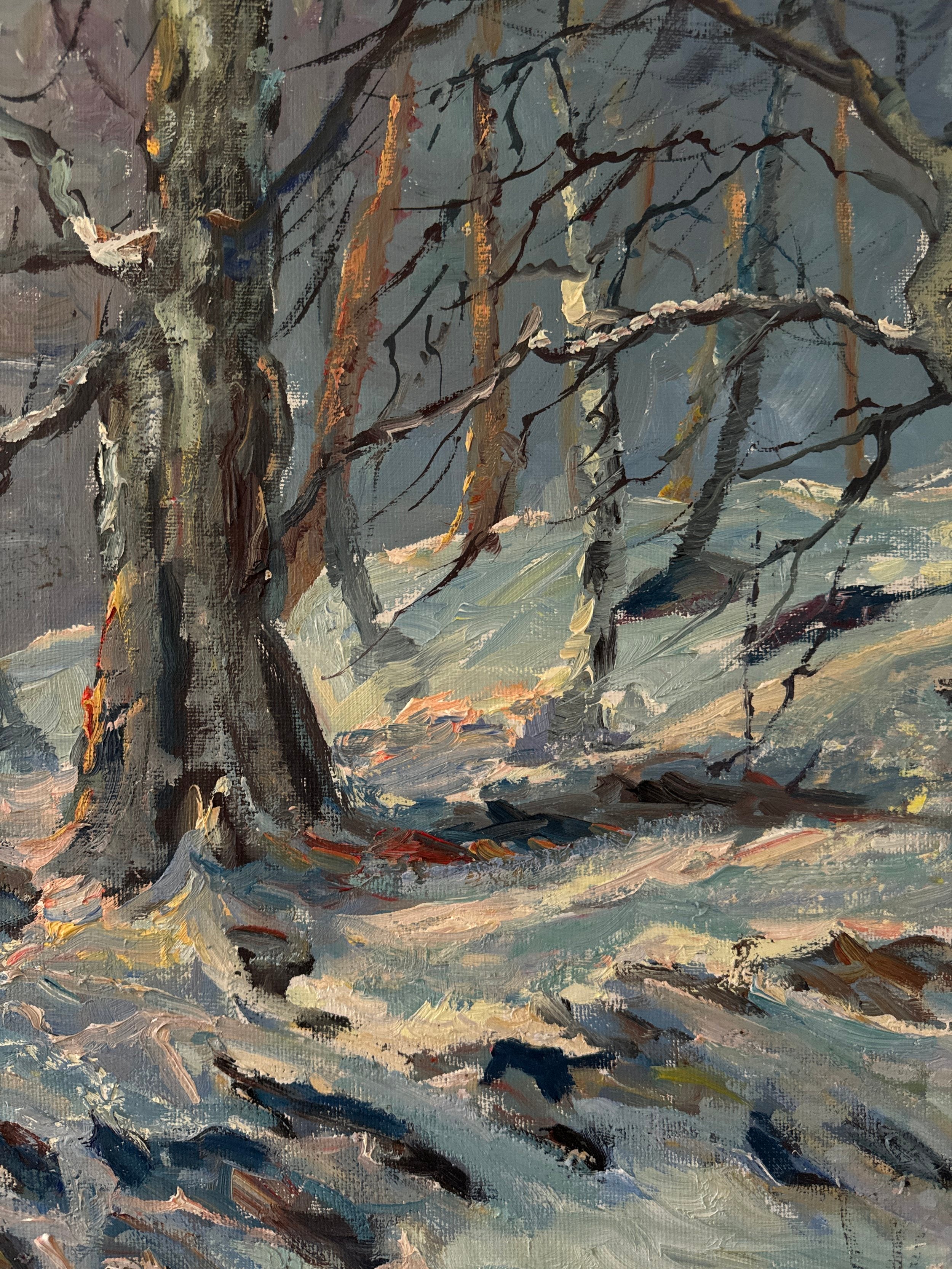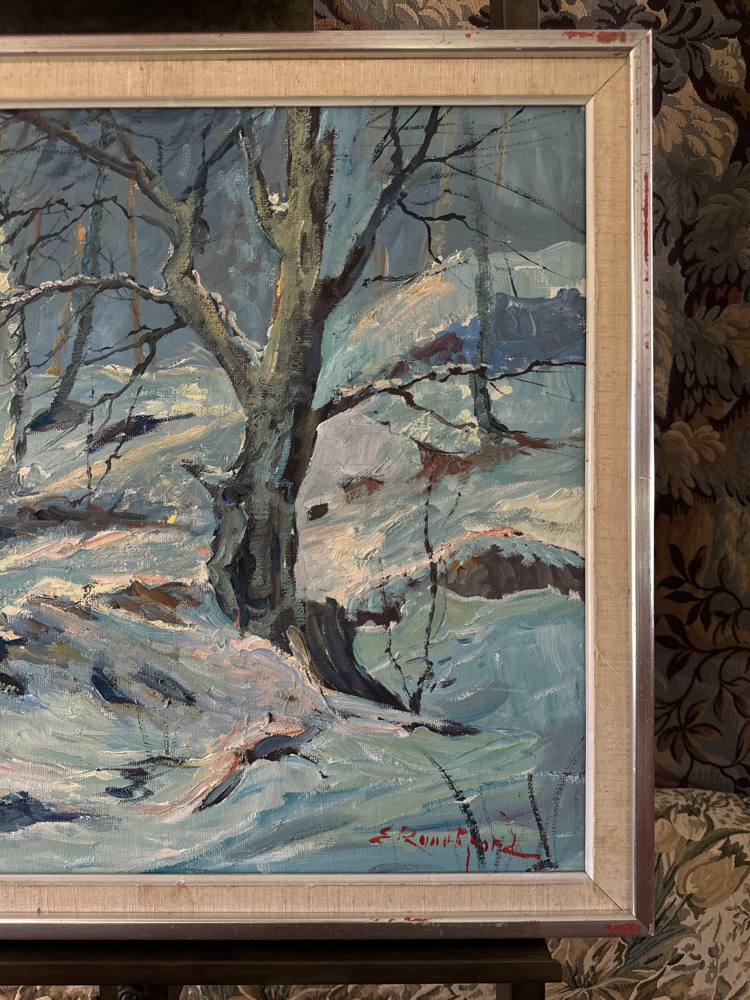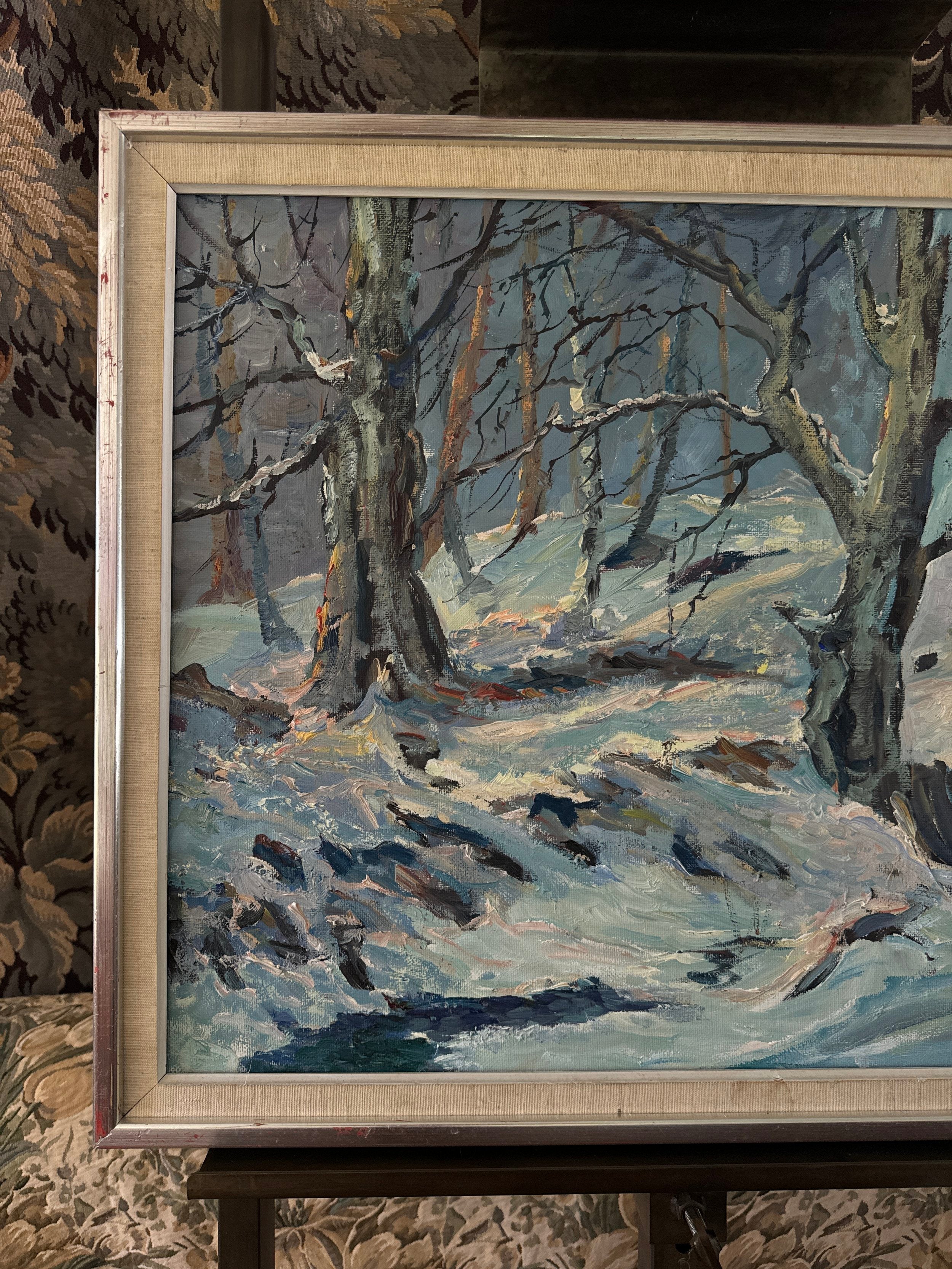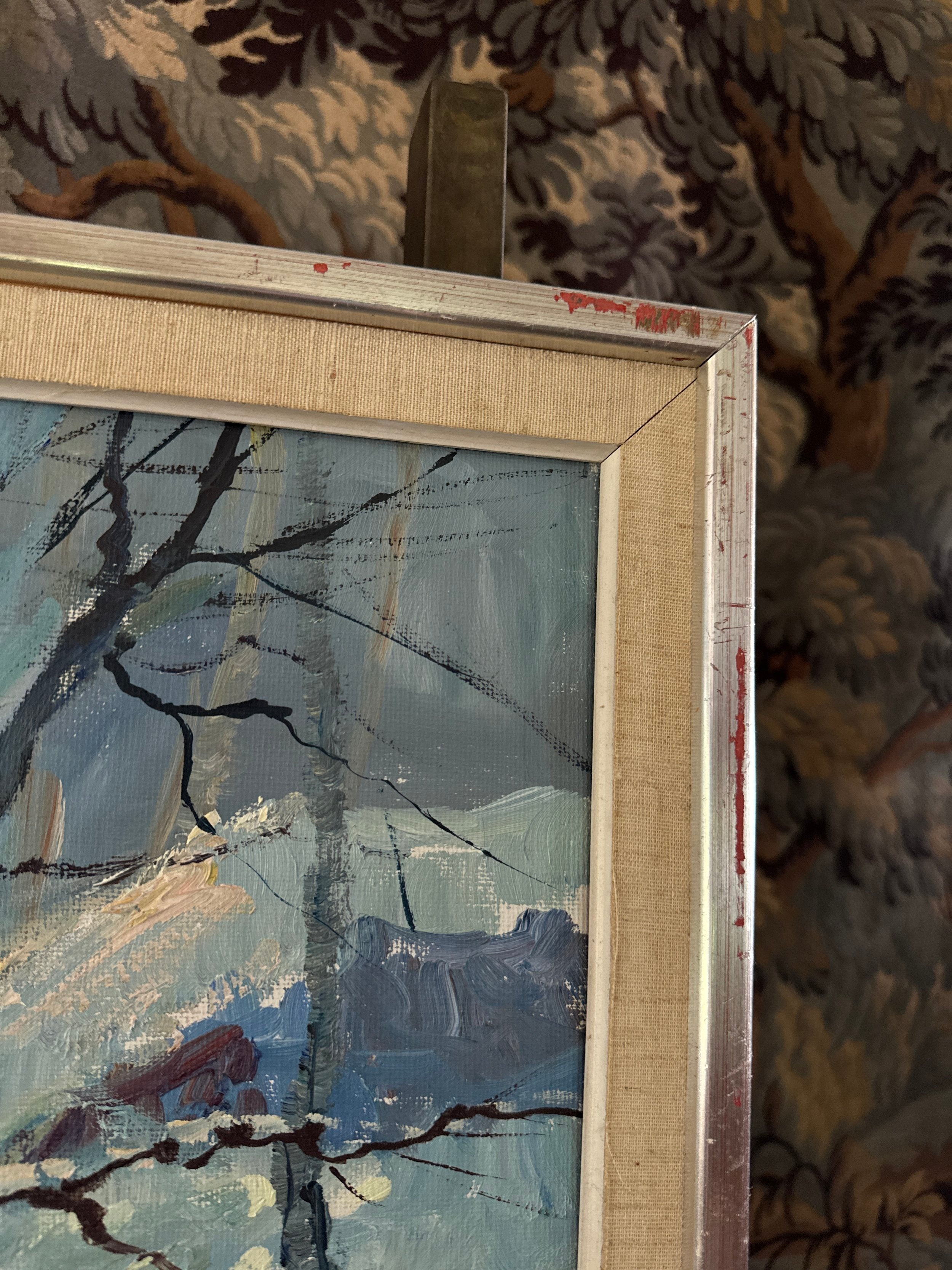 This atmospheric Swedish oil painting captures the quiet beauty of a snow-covered forest, rendered with expressive brushstrokes and a cool, wintry palette. The composition features two large, bare trees standing prominently in the foreground, their dark trunks and twisted branches creating a stark contrast against the soft, pale blue and white of the snow. The artist skillfully conveys the dappled light filtering through the trees, casting delicate shadows across the undulating, snow-laden ground. There’s a sense of solitude and stillness in the scene, as if it were the aftermath of a fresh snowfall. The painting’s textured surface adds a tactile quality, drawing the viewer into the tranquil, icy landscape, evoking the crisp air and peaceful silence of a winter forest. It comes in the original frame.