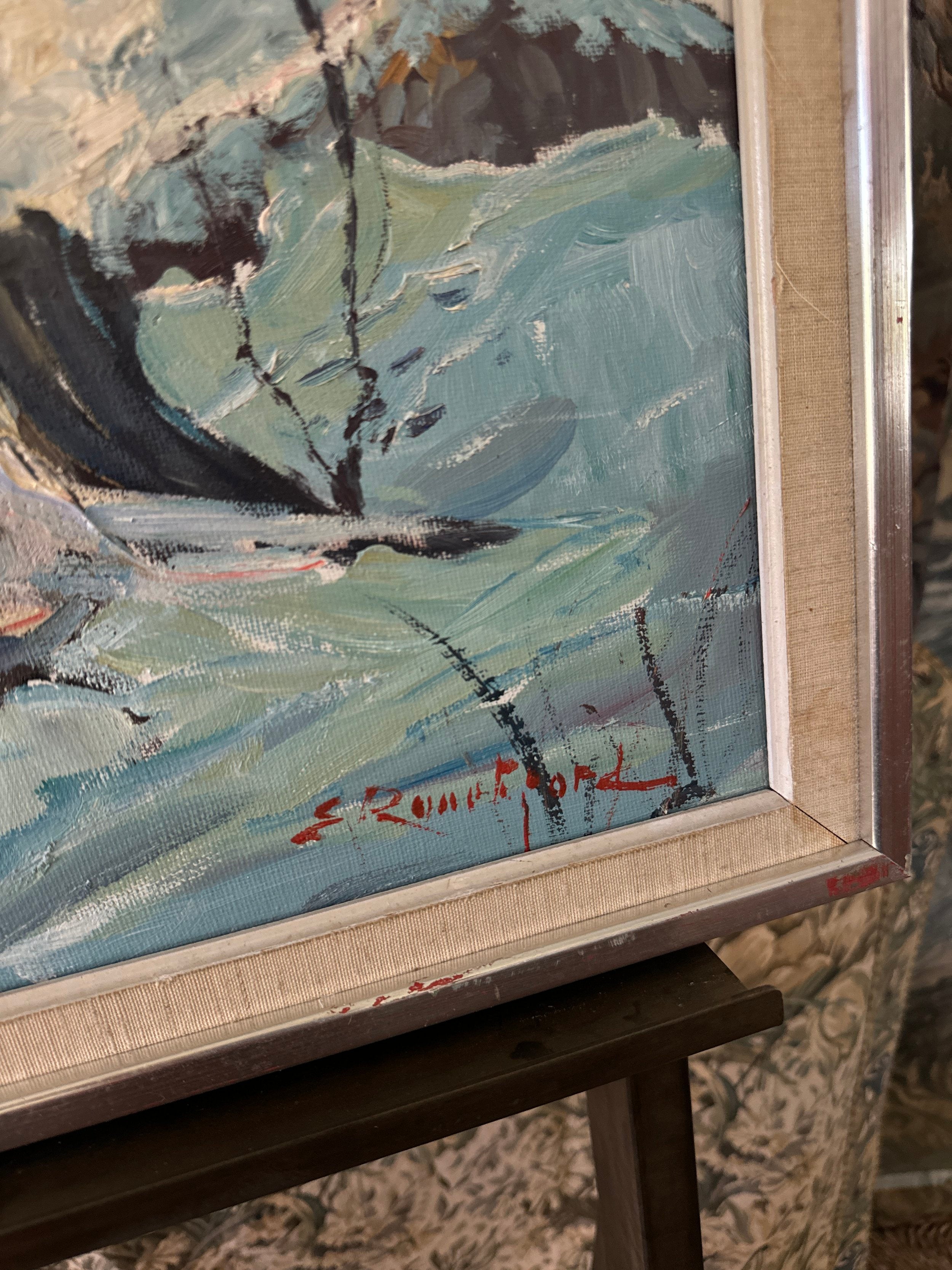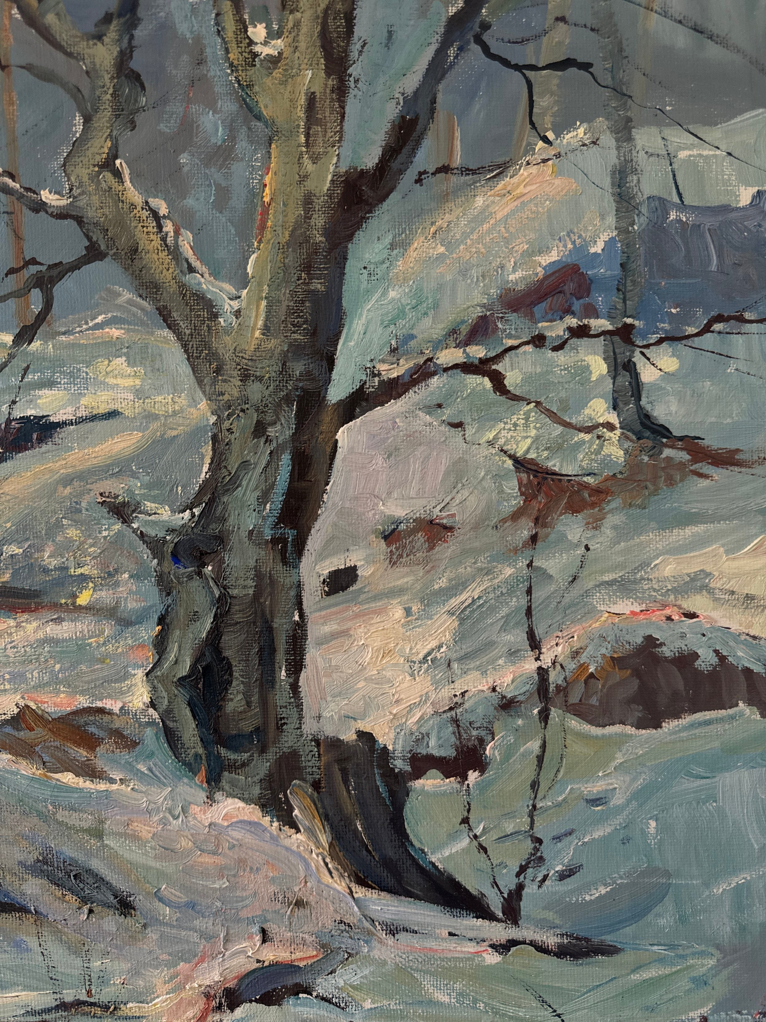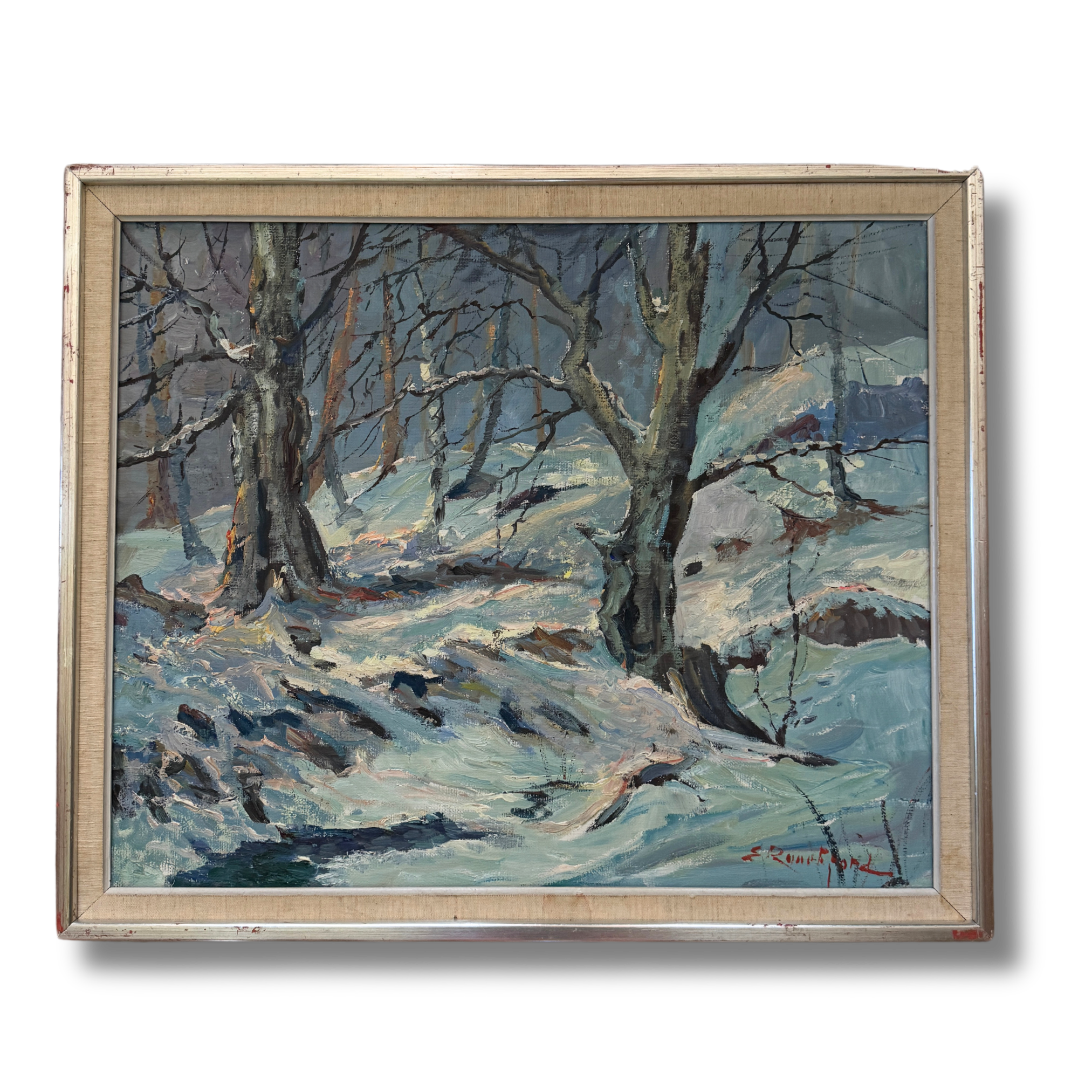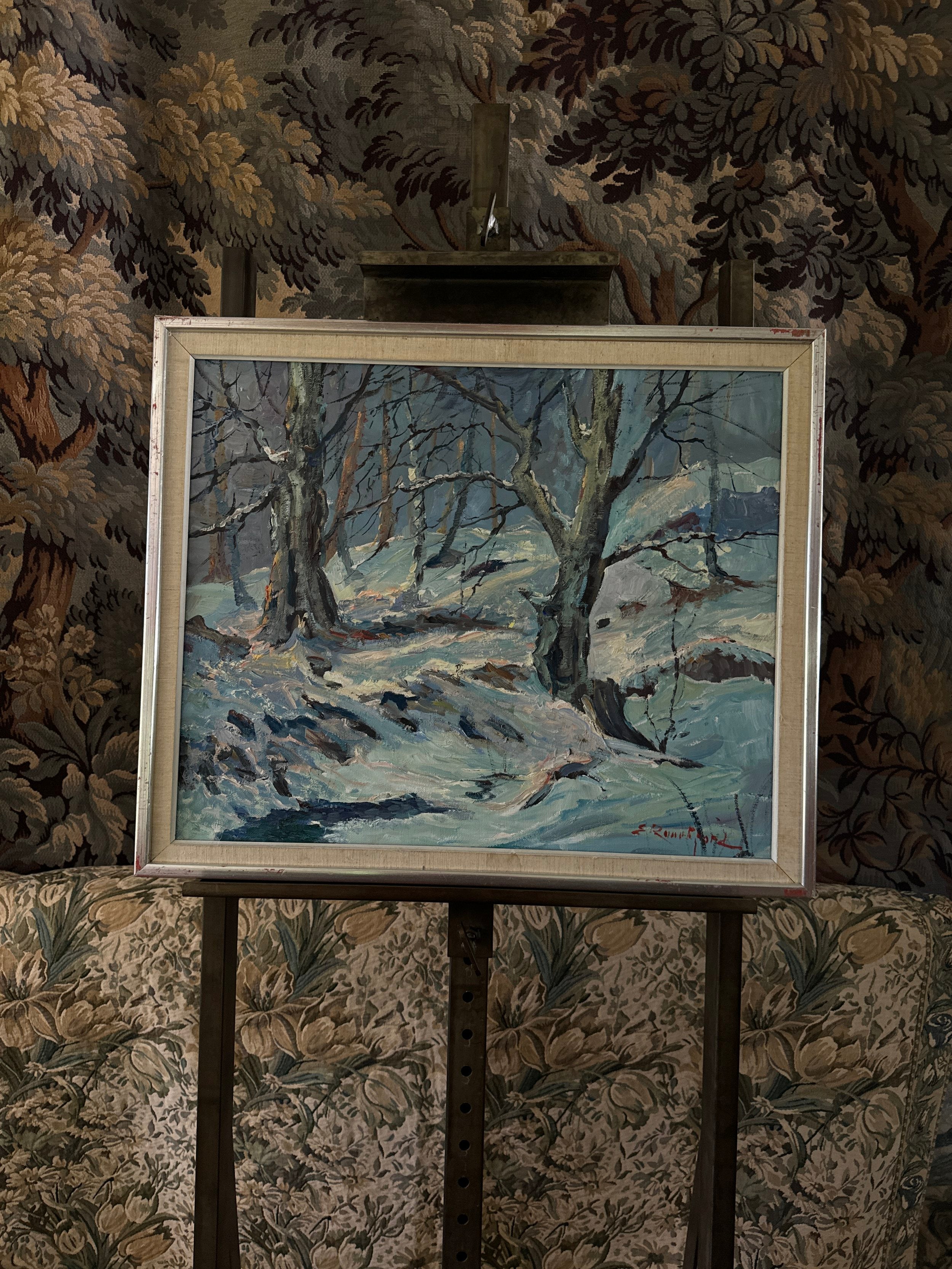 This atmospheric Swedish oil painting captures the quiet beauty of a snow-covered forest, rendered with expressive brushstrokes and a cool, wintry palette. The composition features two large, bare trees standing prominently in the foreground, their dark trunks and twisted branches creating a stark contrast against the soft, pale blue and white of the snow. The artist skillfully conveys the dappled light filtering through the trees, casting delicate shadows across the undulating, snow-laden ground. There’s a sense of solitude and stillness in the scene, as if it were the aftermath of a fresh snowfall. The painting’s textured surface adds a tactile quality, drawing the viewer into the tranquil, icy landscape, evoking the crisp air and peaceful silence of a winter forest. It comes in the original frame.