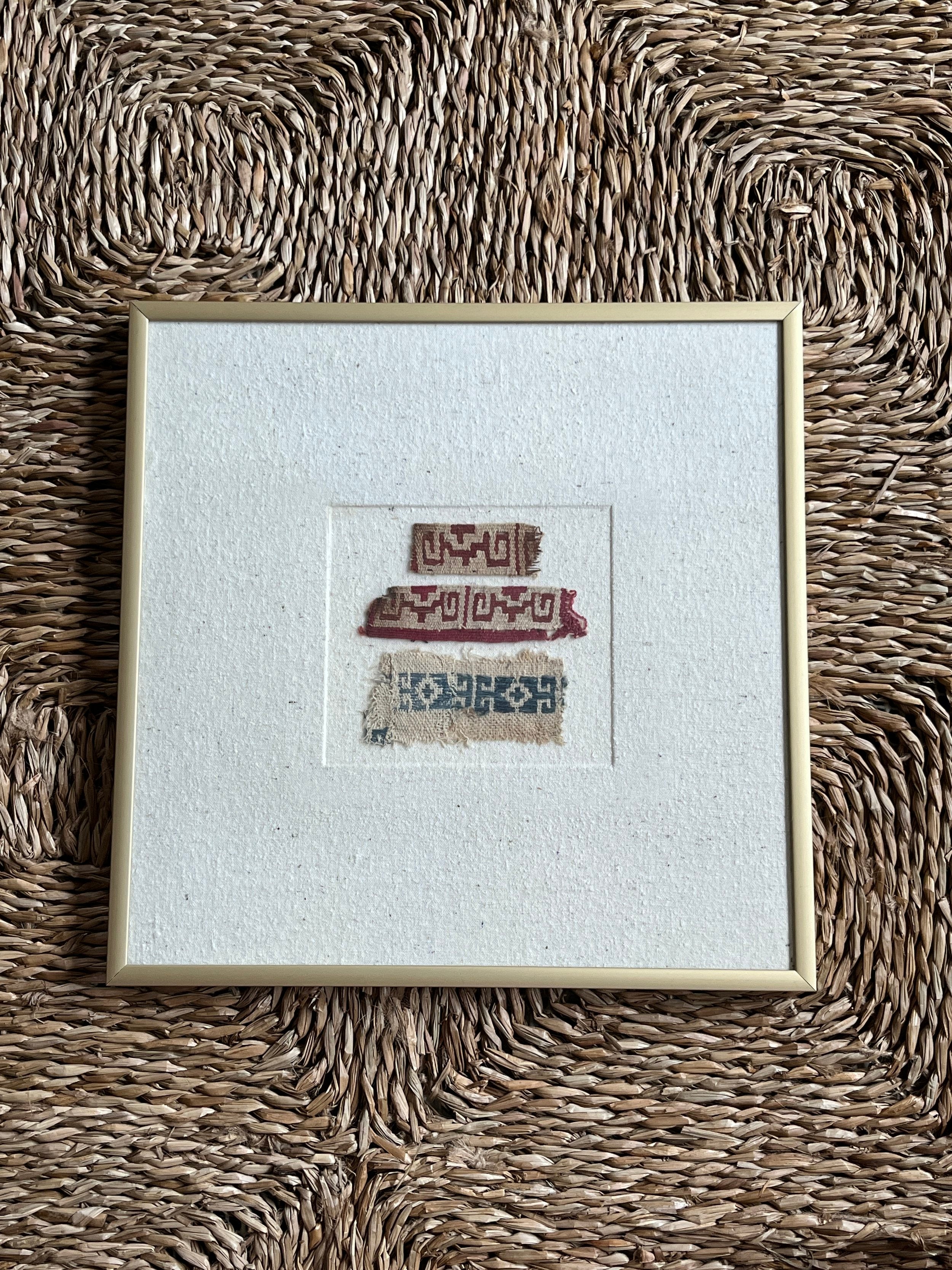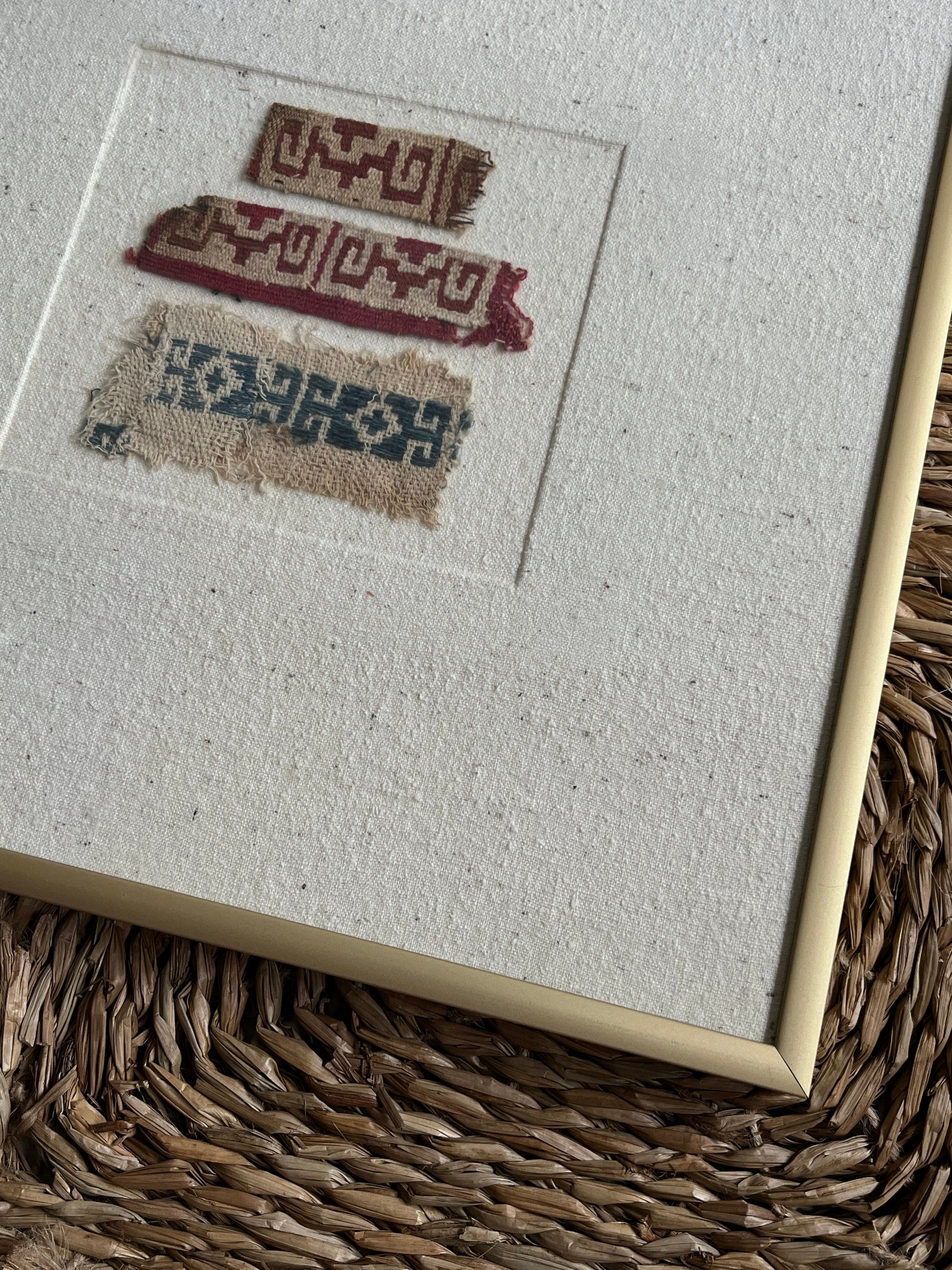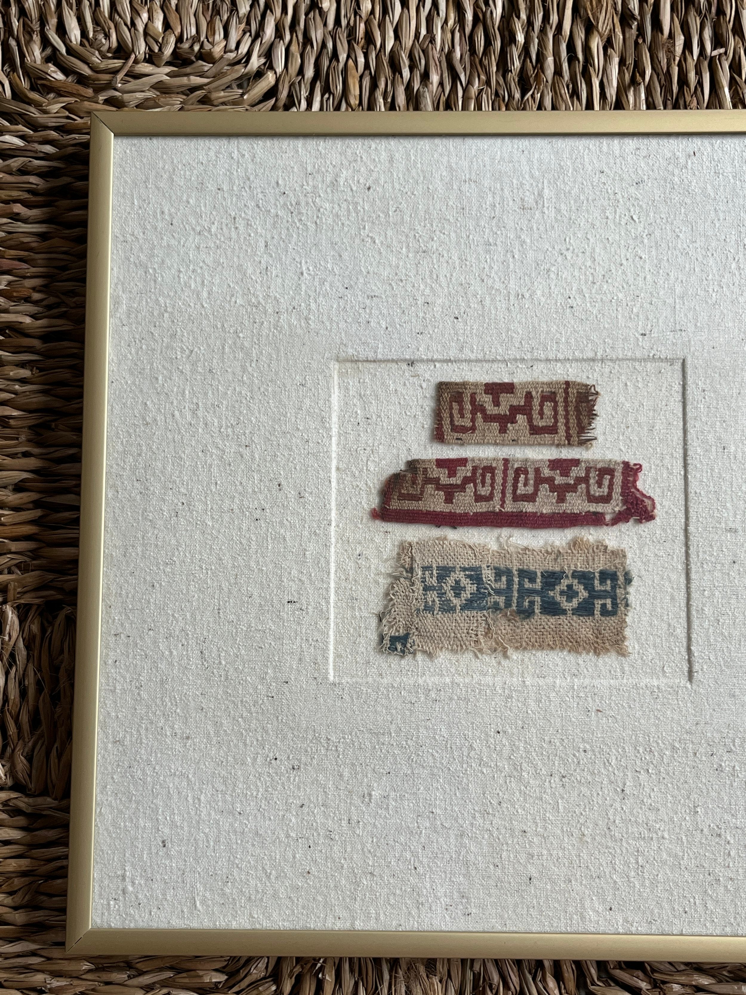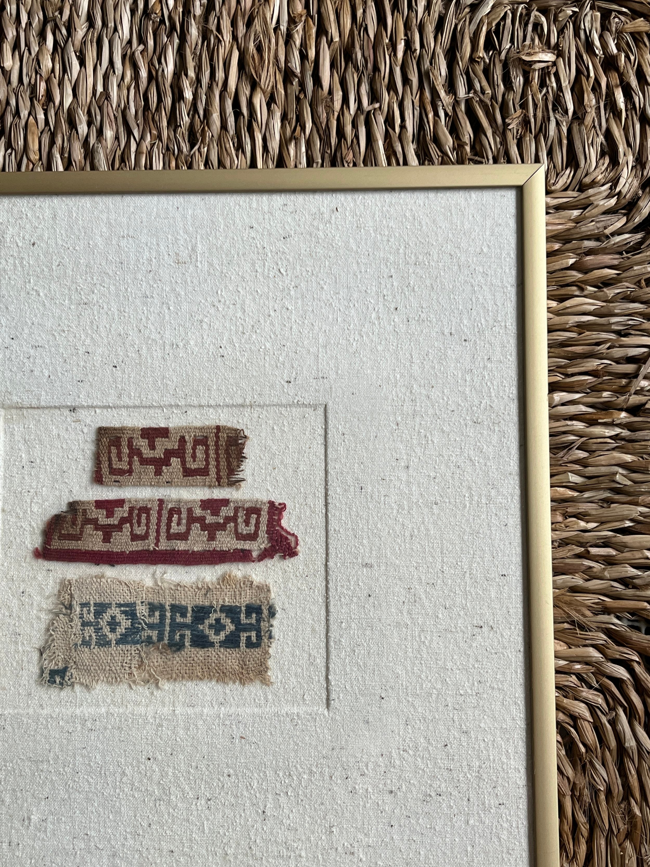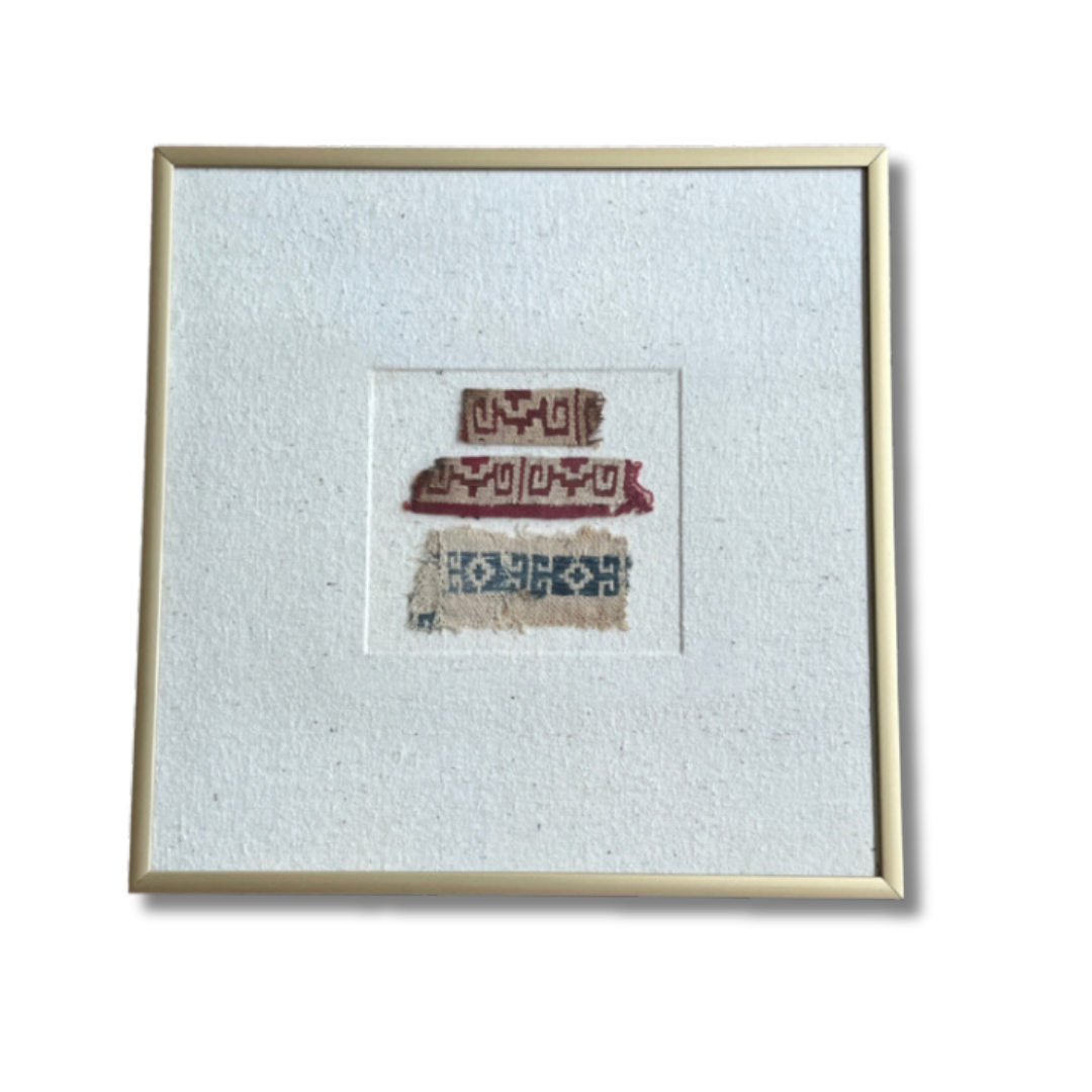 These are pre-Inca pieces. Gold framed behind glass on linen. Each of the five pieces in named after the Quechuan words for 1-5.