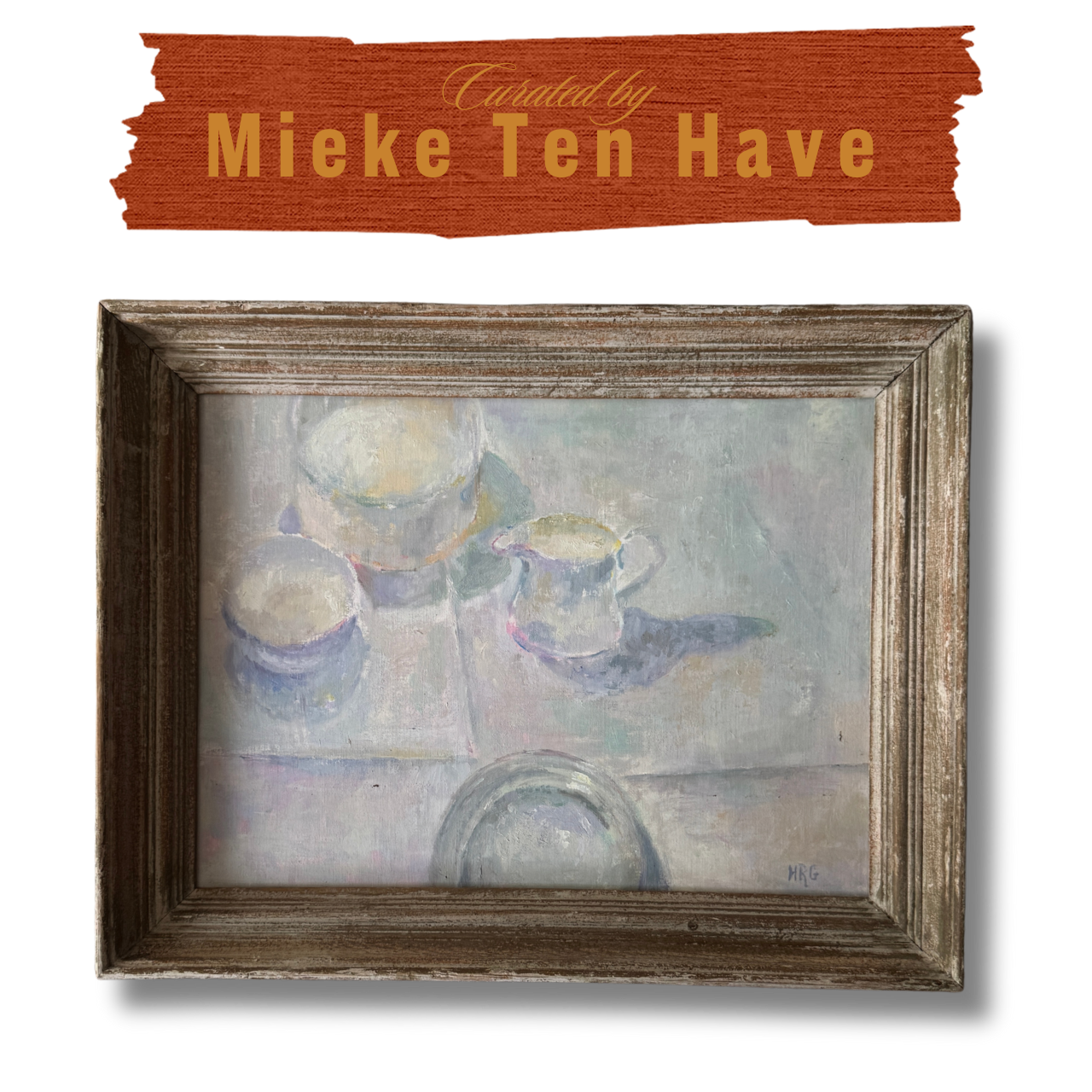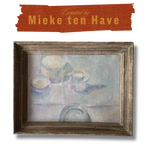 This oil on canvas transforms the simplest of table settings into a study of light and atmosphere. Bowls, a jug, and a plate are rendered in the softest palette of whites, silvers, and pale pastels, their forms dissolving gently into one another as though veiled in morning light. Subtle touches of rose, lavender, and lemon flicker across the surfaces, giving the work a shimmering quality that feels both ethereal and grounded. Framed in weathered wood, the piece captures a timeless elegance, an ode to restraint, intimacy, and the quiet beauty of everyday rituals.