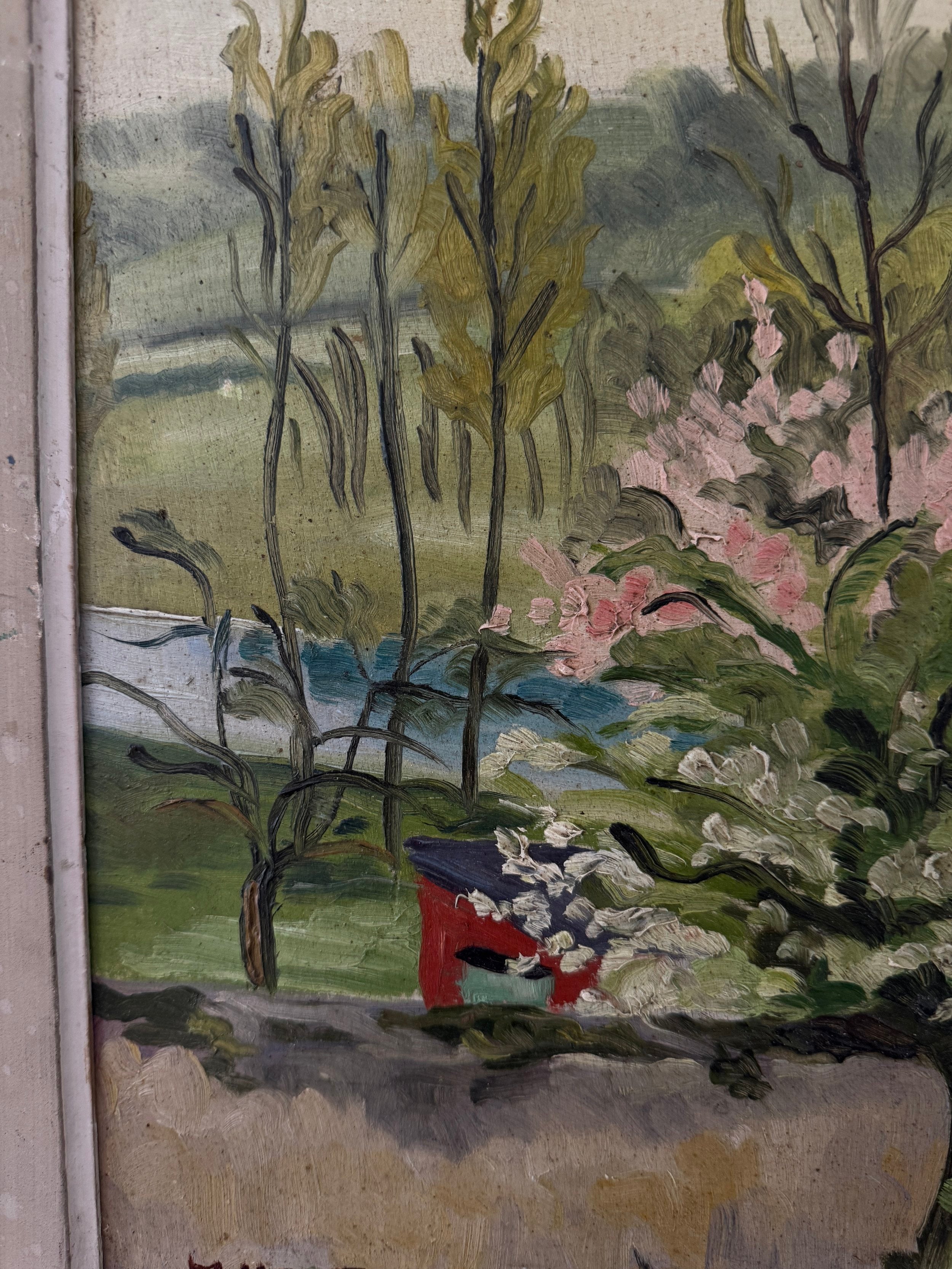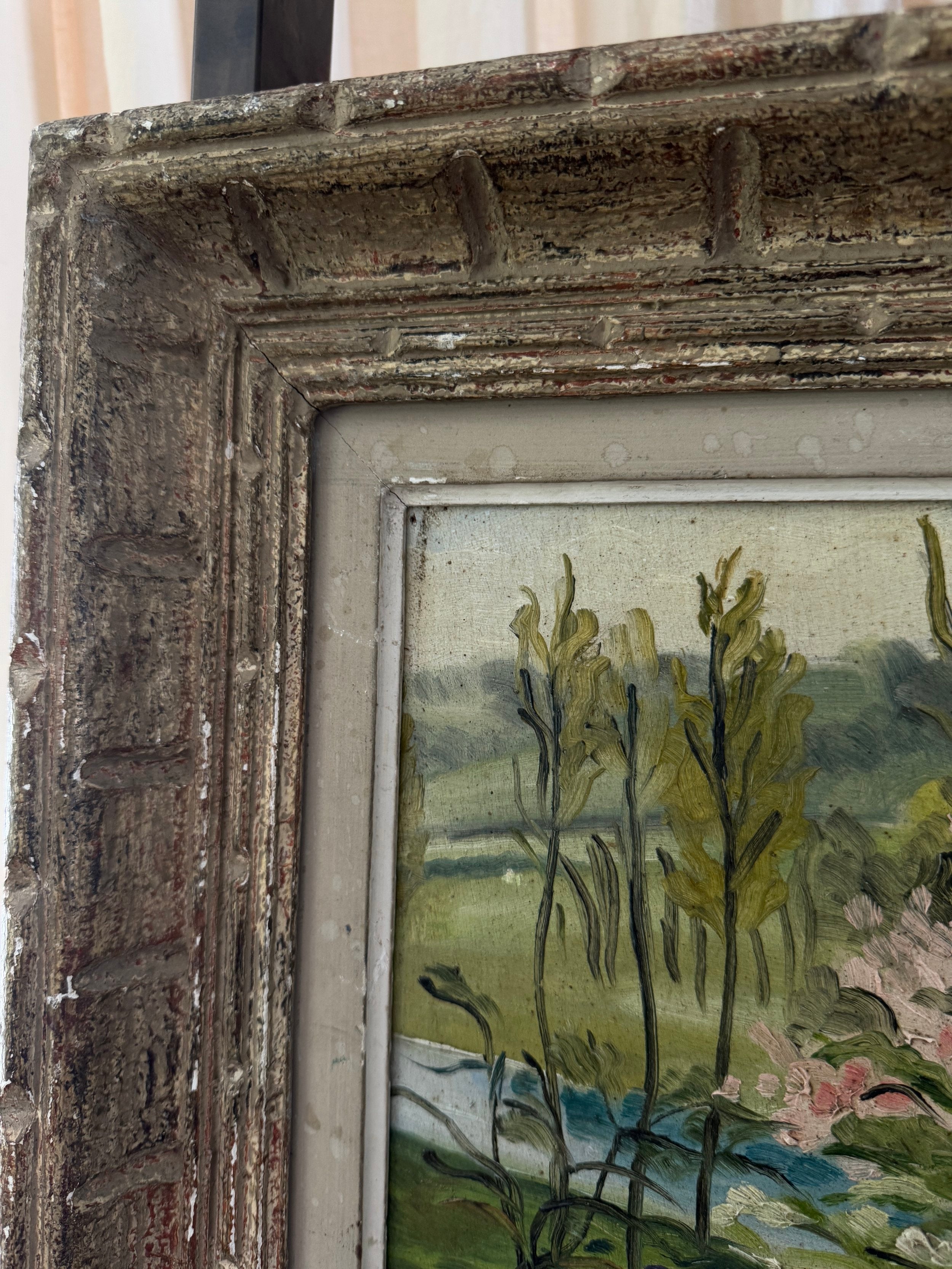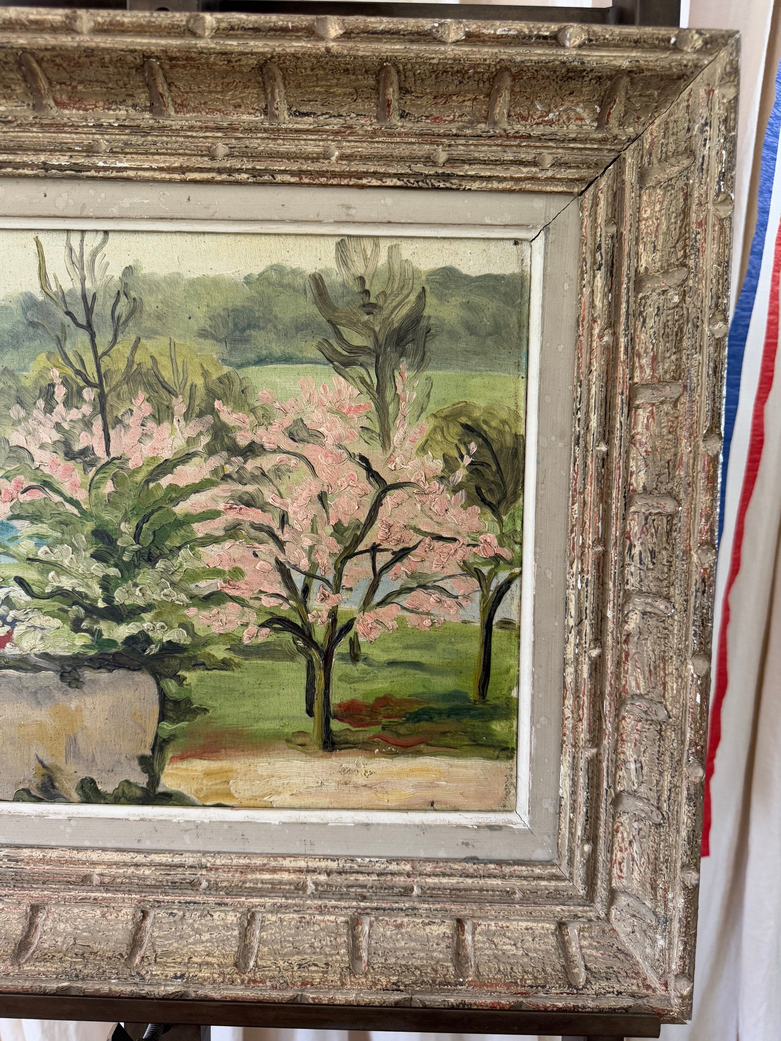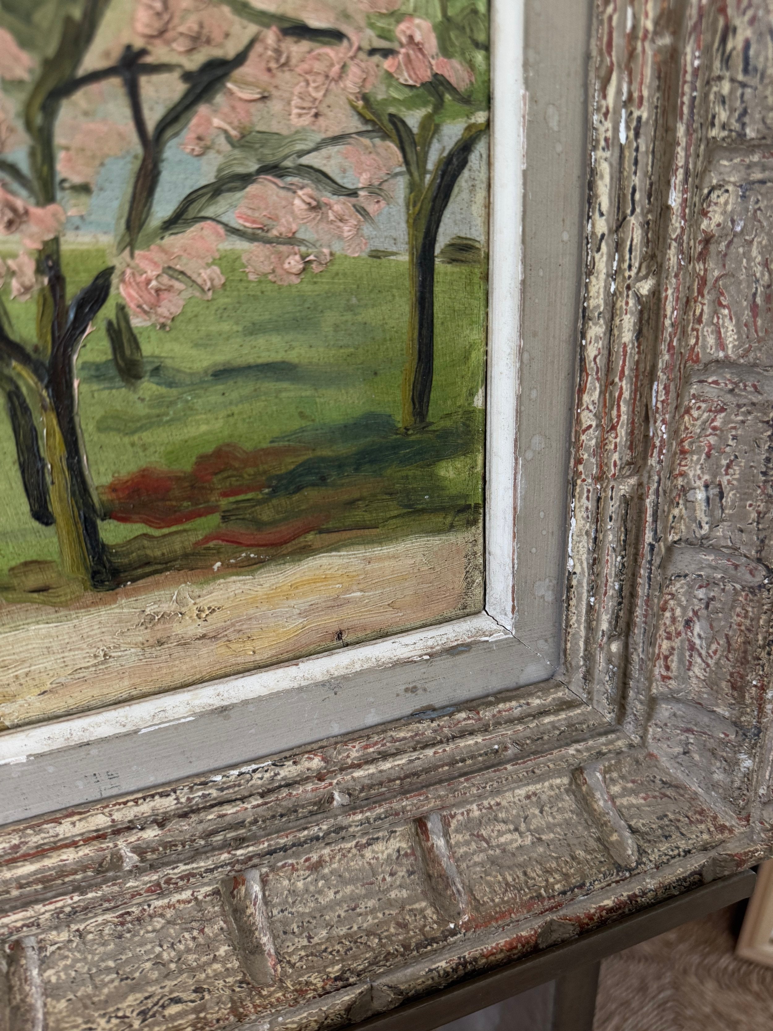 A charming French midcentury oil on board, this piece beautifully captures the hope of spring in full bloom. Soft pink blossoms burst against lush greenery, with expressive brushstrokes lending a sense of movement, new beginnings, and life. The textured, patina-ed frame only adds to its character, bringing an glorious dash of optimism that comes with a new season.