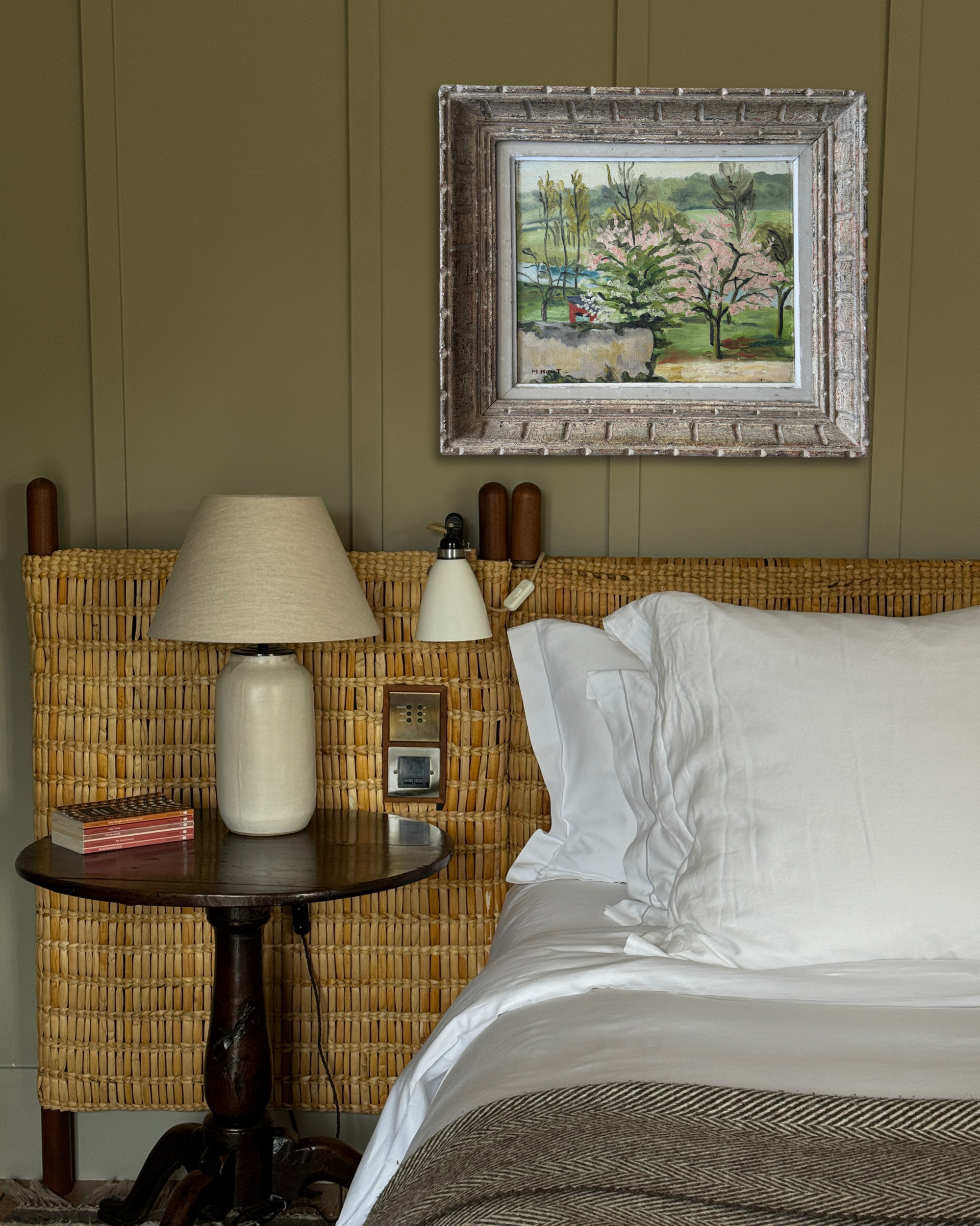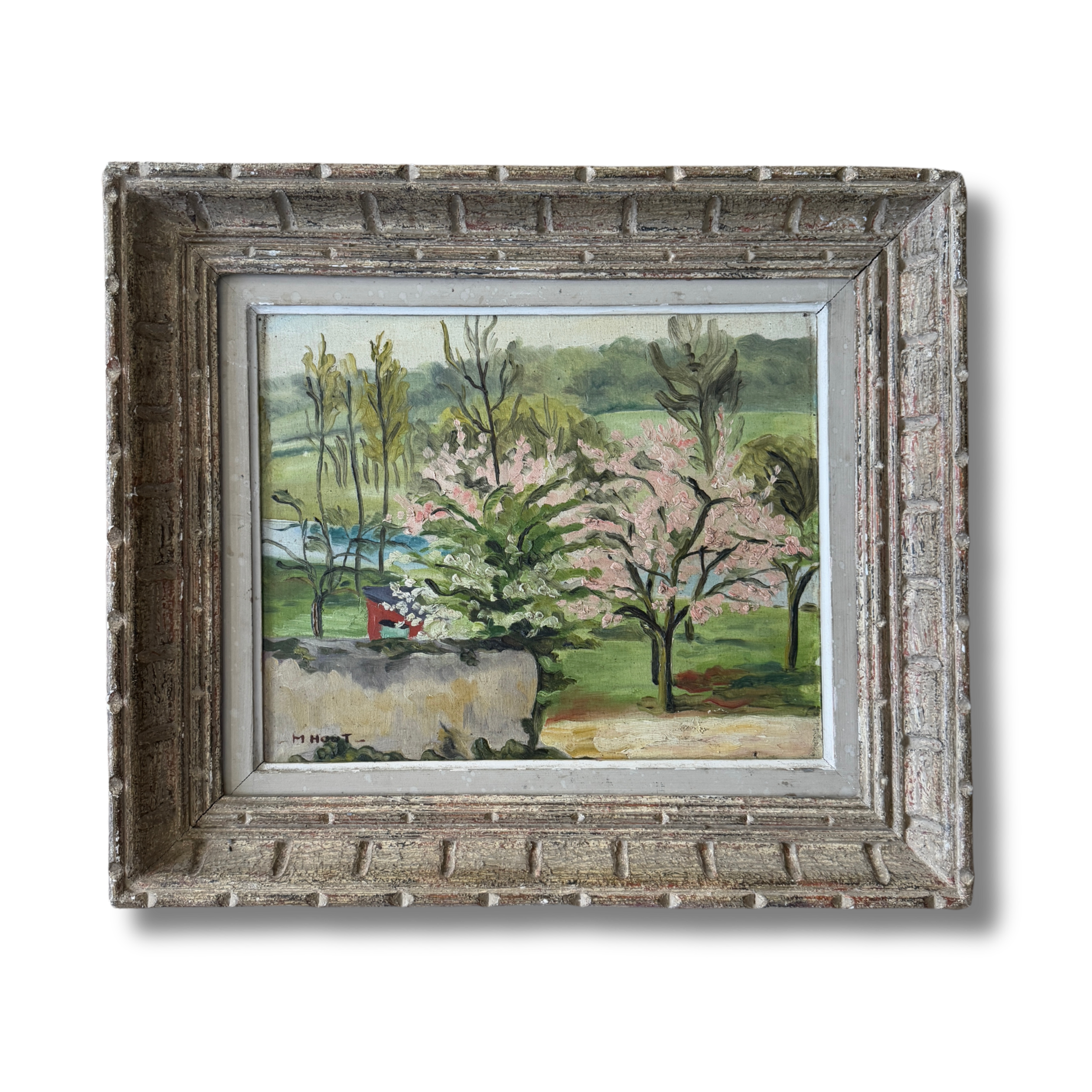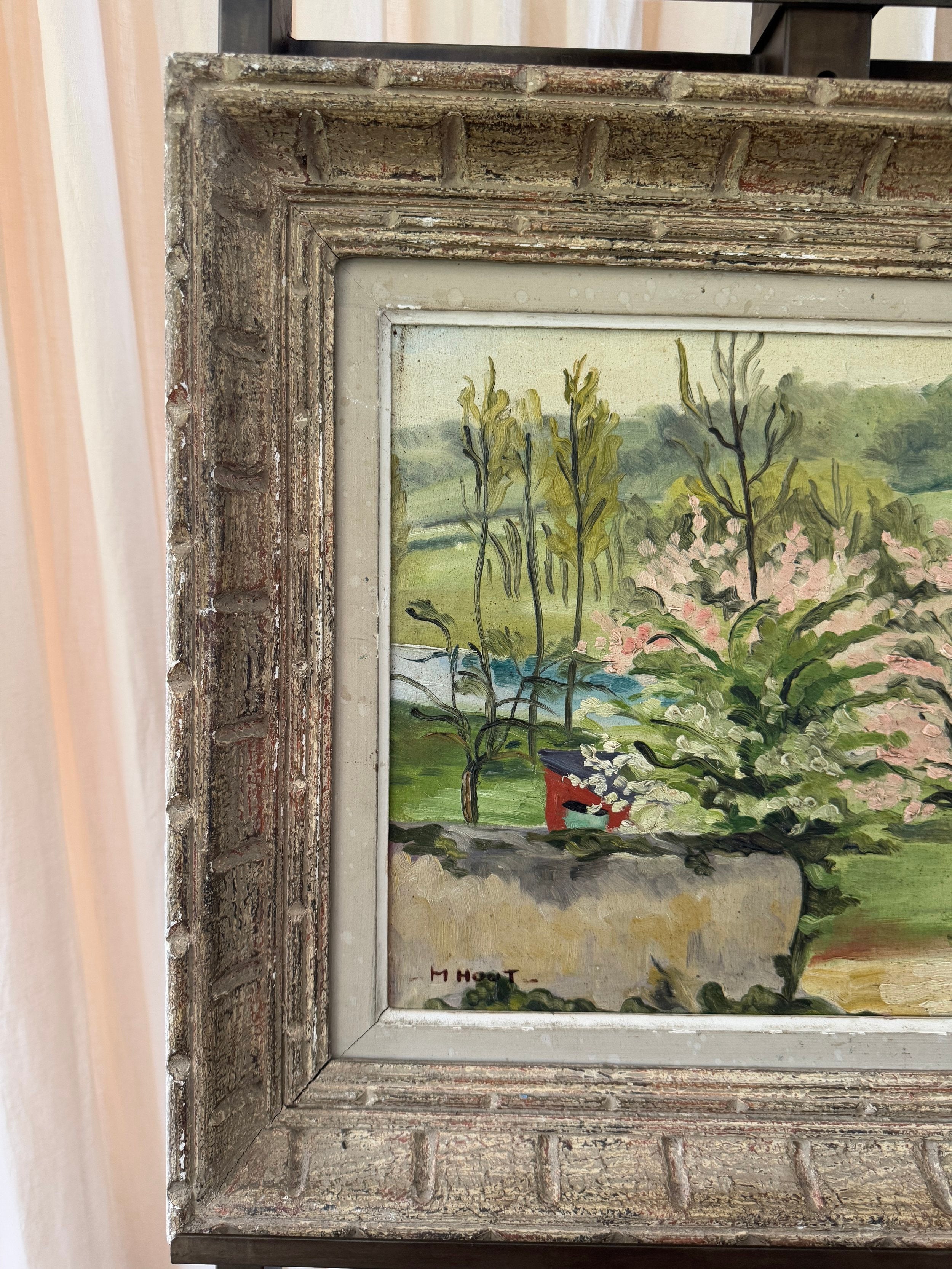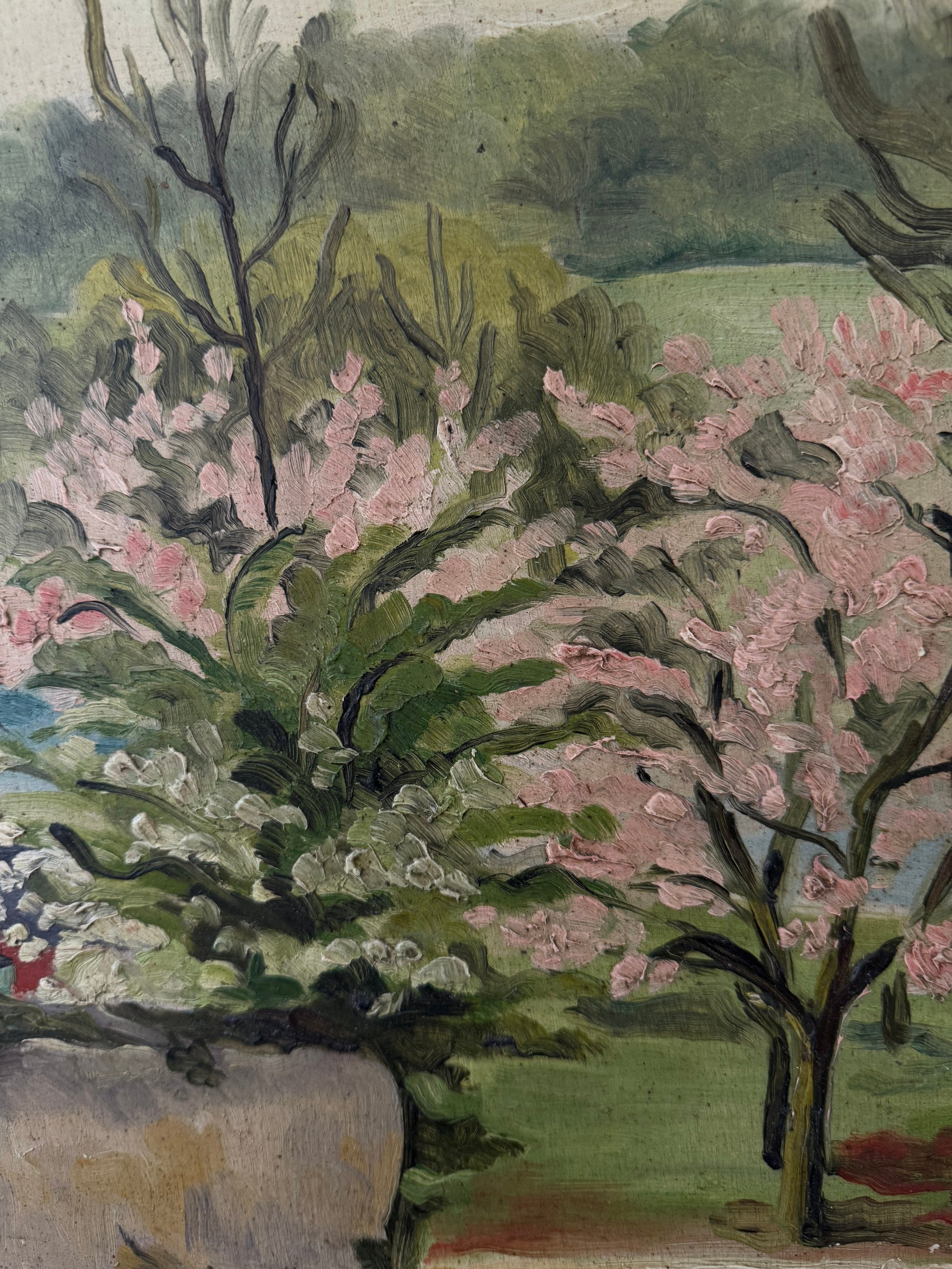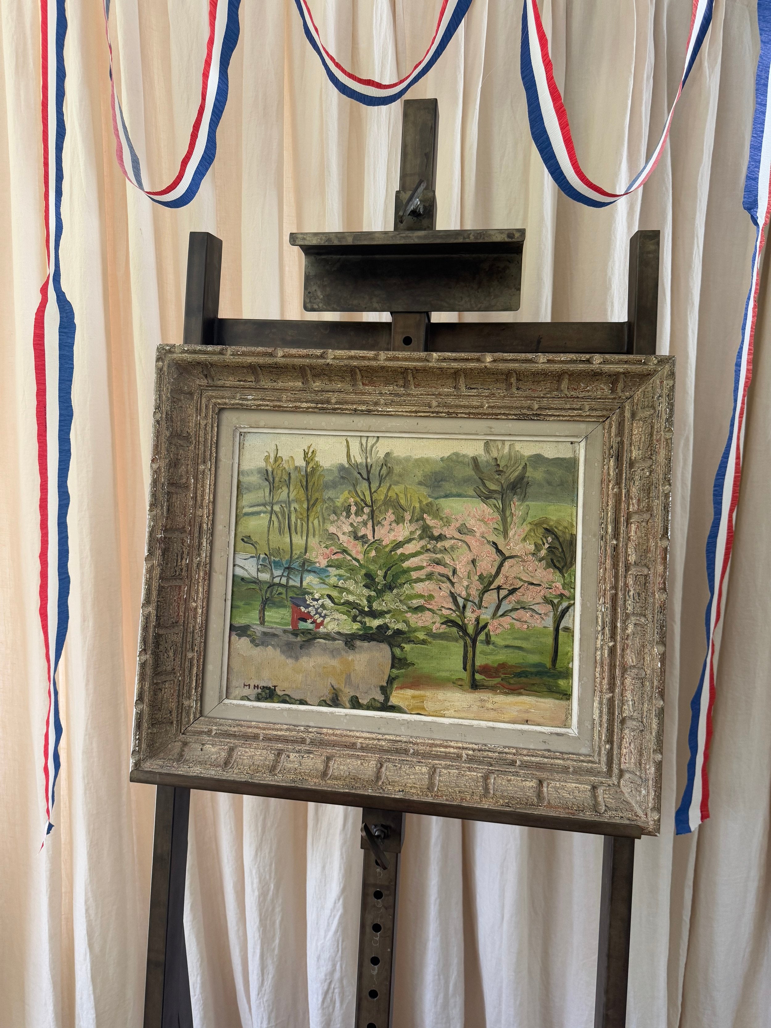 A charming French midcentury oil on board, this piece beautifully captures the hope of spring in full bloom. Soft pink blossoms burst against lush greenery, with expressive brushstrokes lending a sense of movement, new beginnings, and life. The textured, patina-ed frame only adds to its character, bringing an glorious dash of optimism that comes with a new season.