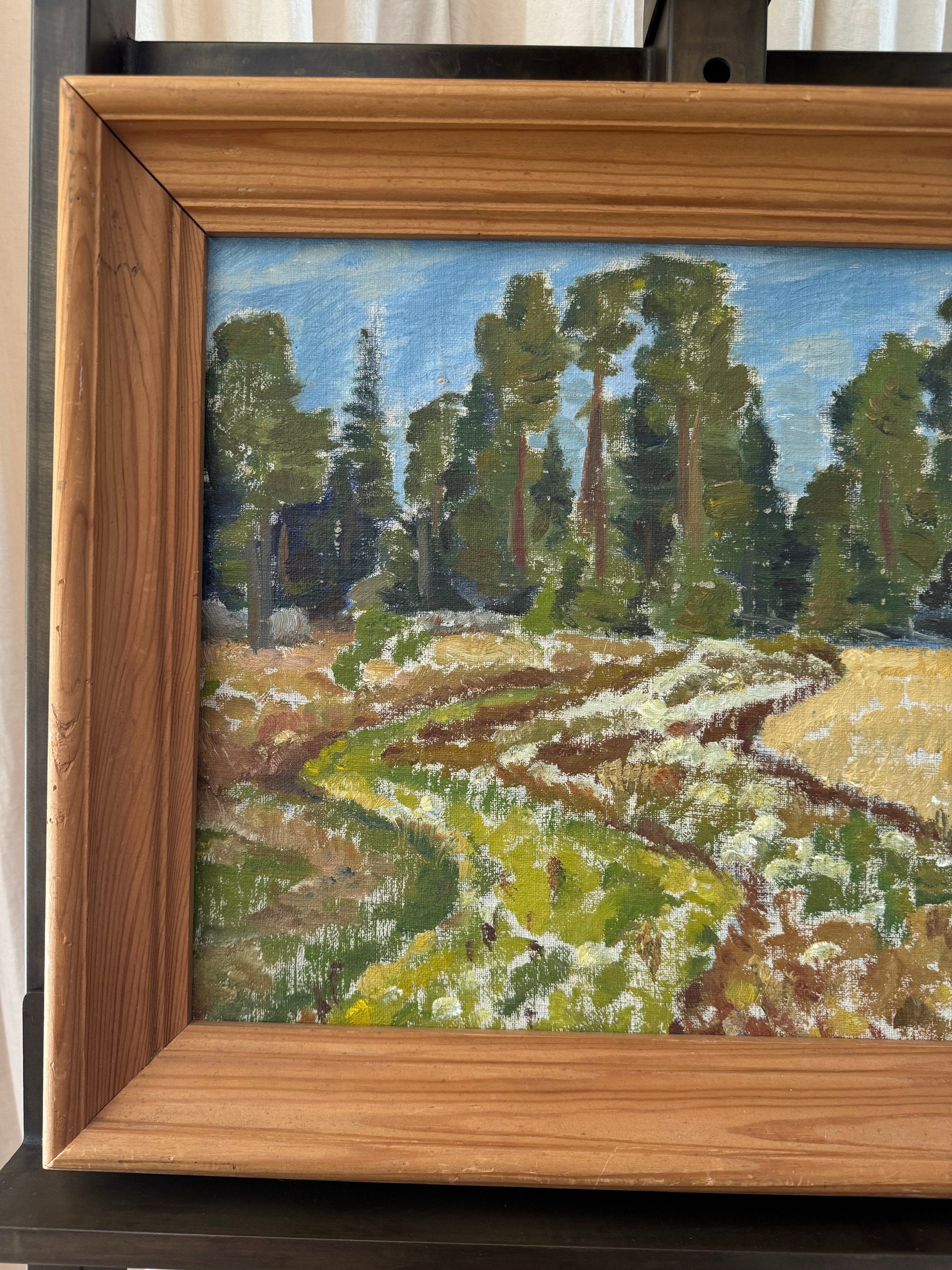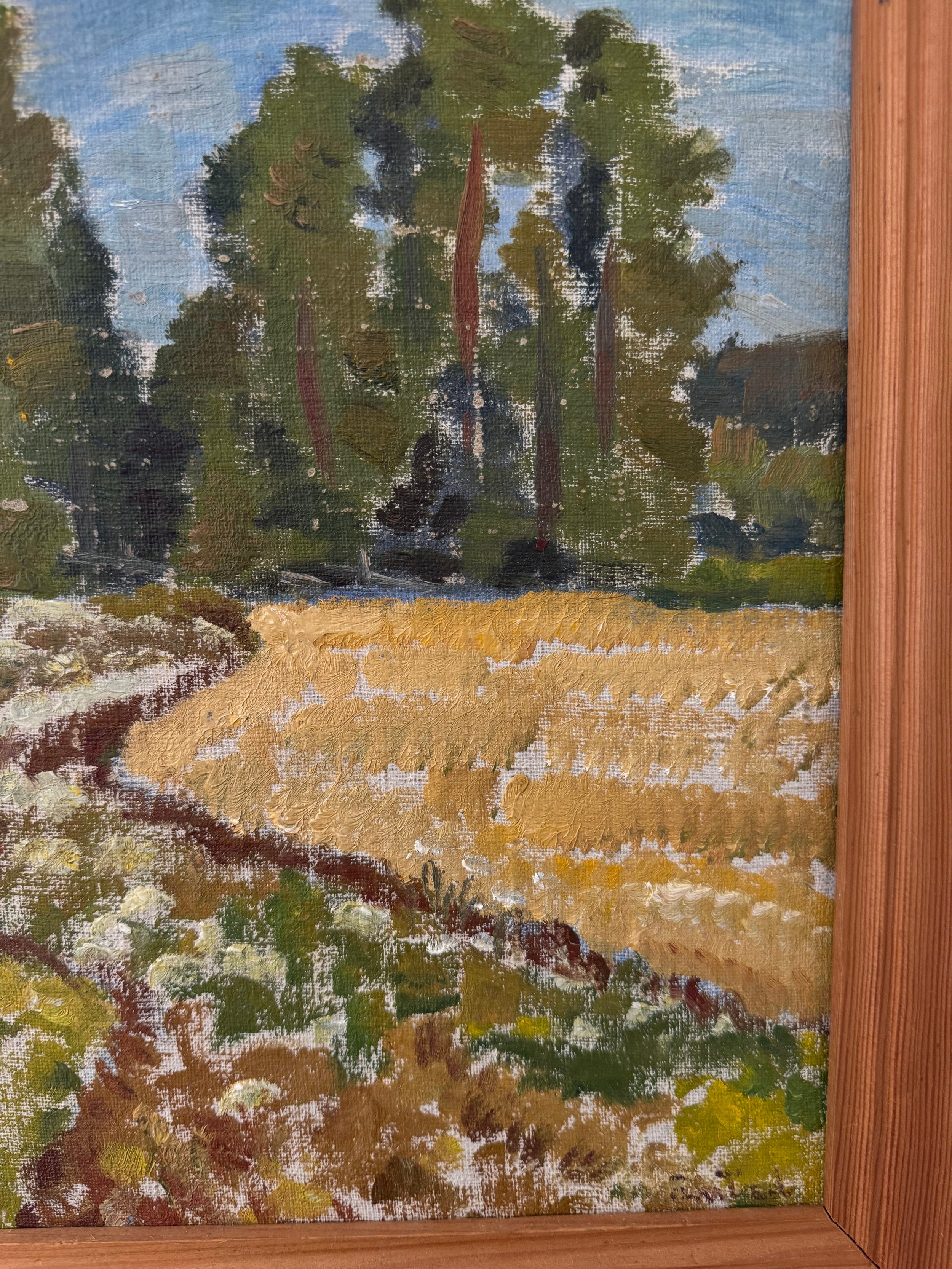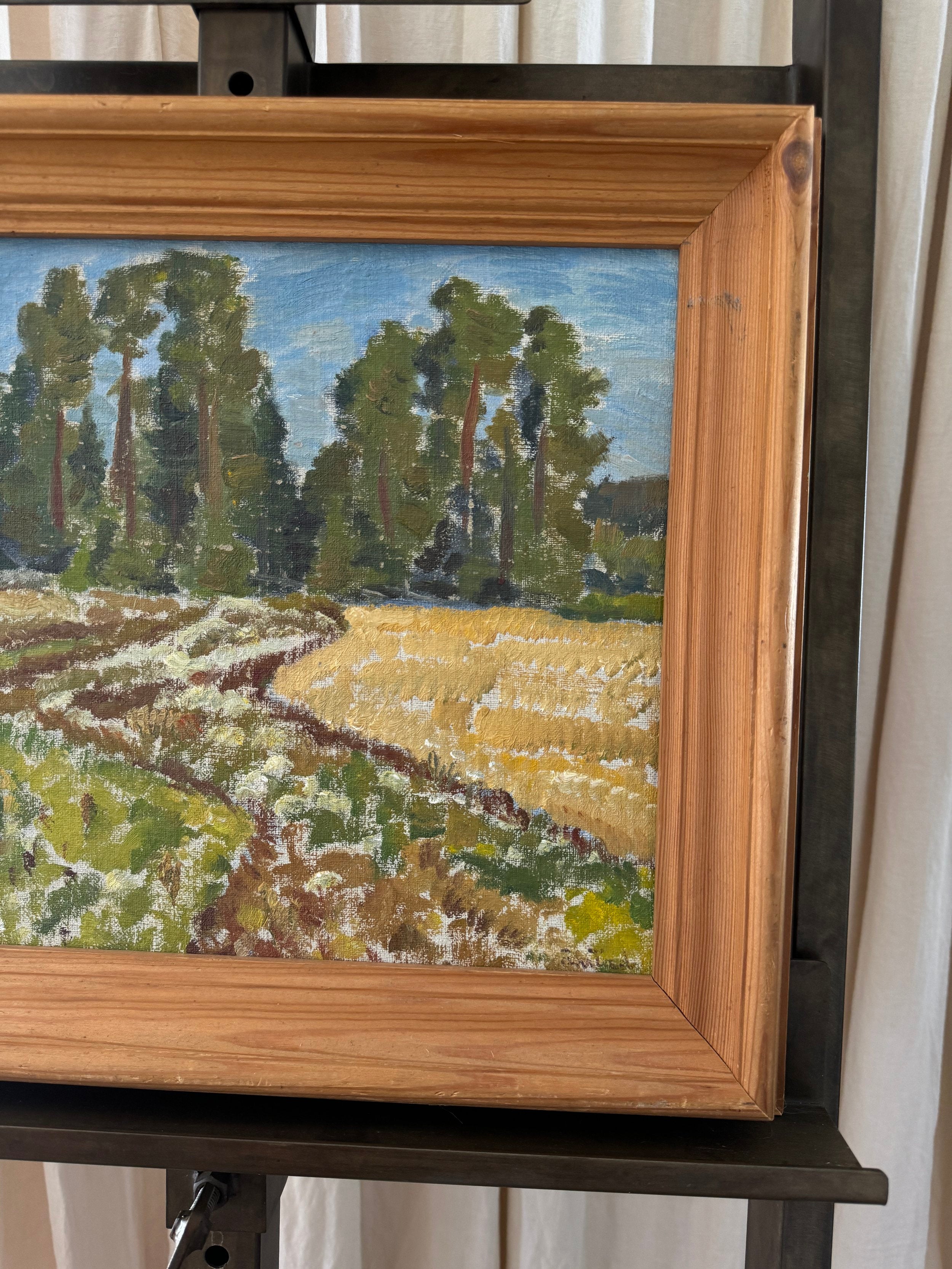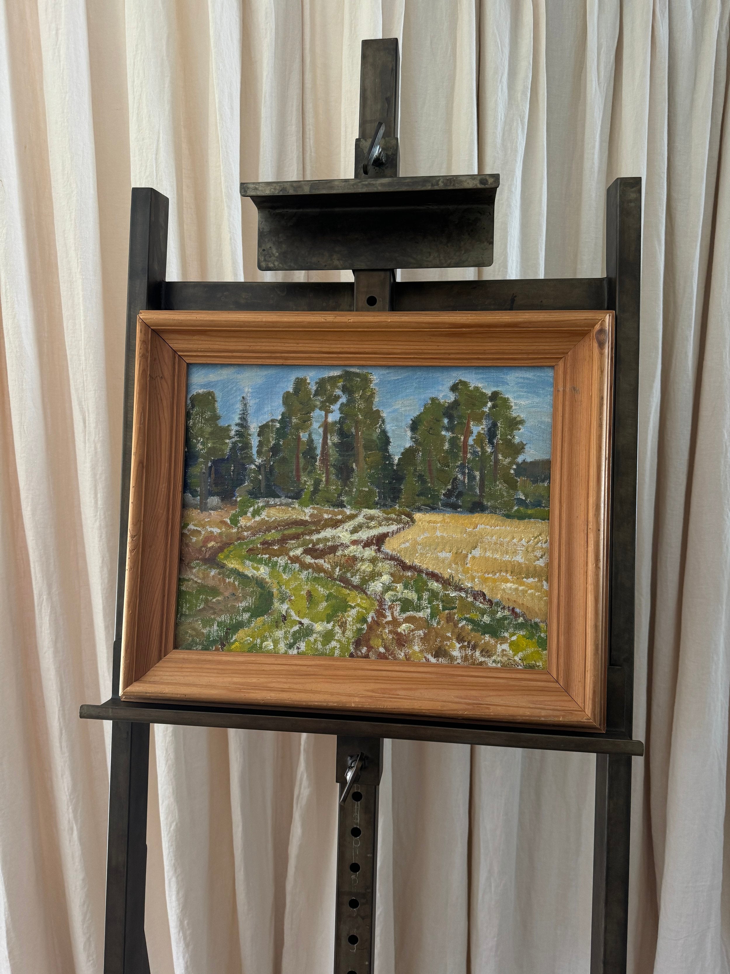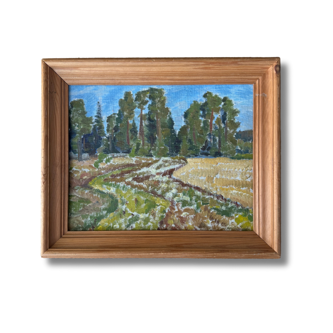 This charming Swedish midcentury oil on canvas captures the tranquil beauty of a countryside path winding through golden fields, framed by towering evergreens beneath a serene blue sky. The loose, textured brushwork and sunlit palette evoke a sense of nostalgia, transporting the viewer to a peaceful summer day. Its natural simplicity pairs beautifully with its clean-lined wooden original frame, which instantly adds a grounding tension to any room. The painting radiates warmth and authenticity, bringing nature inside.