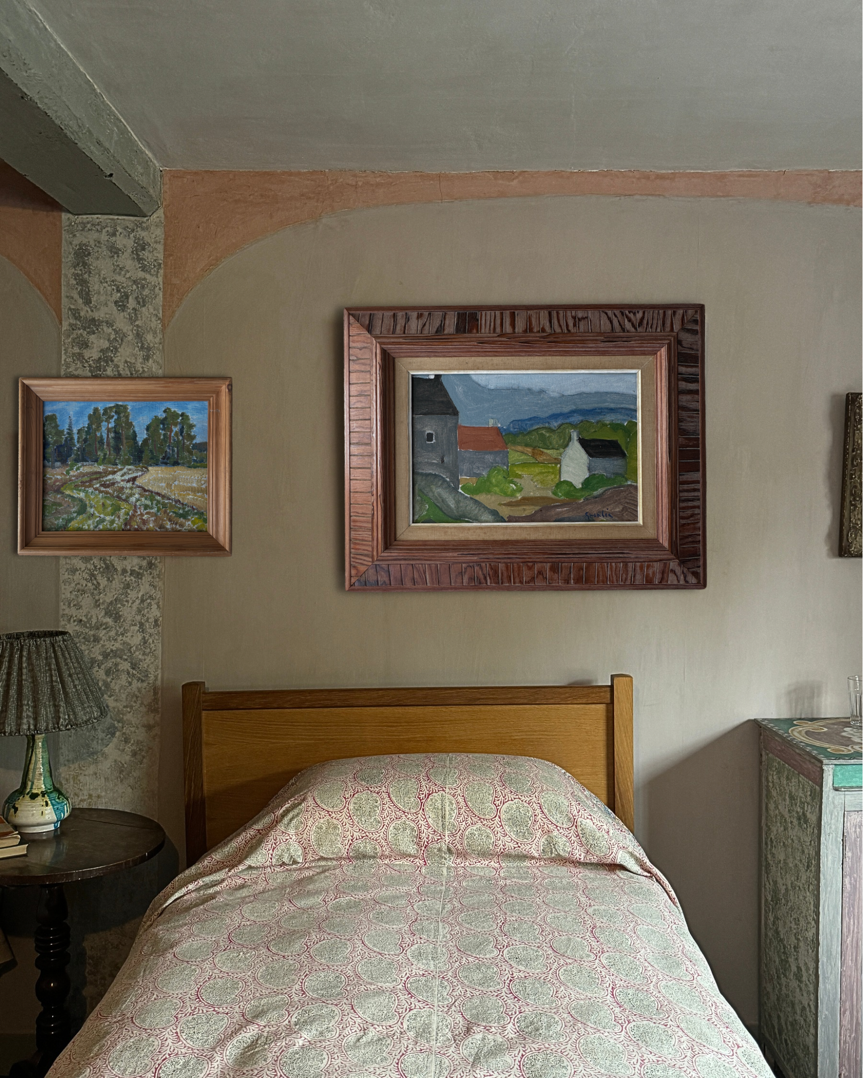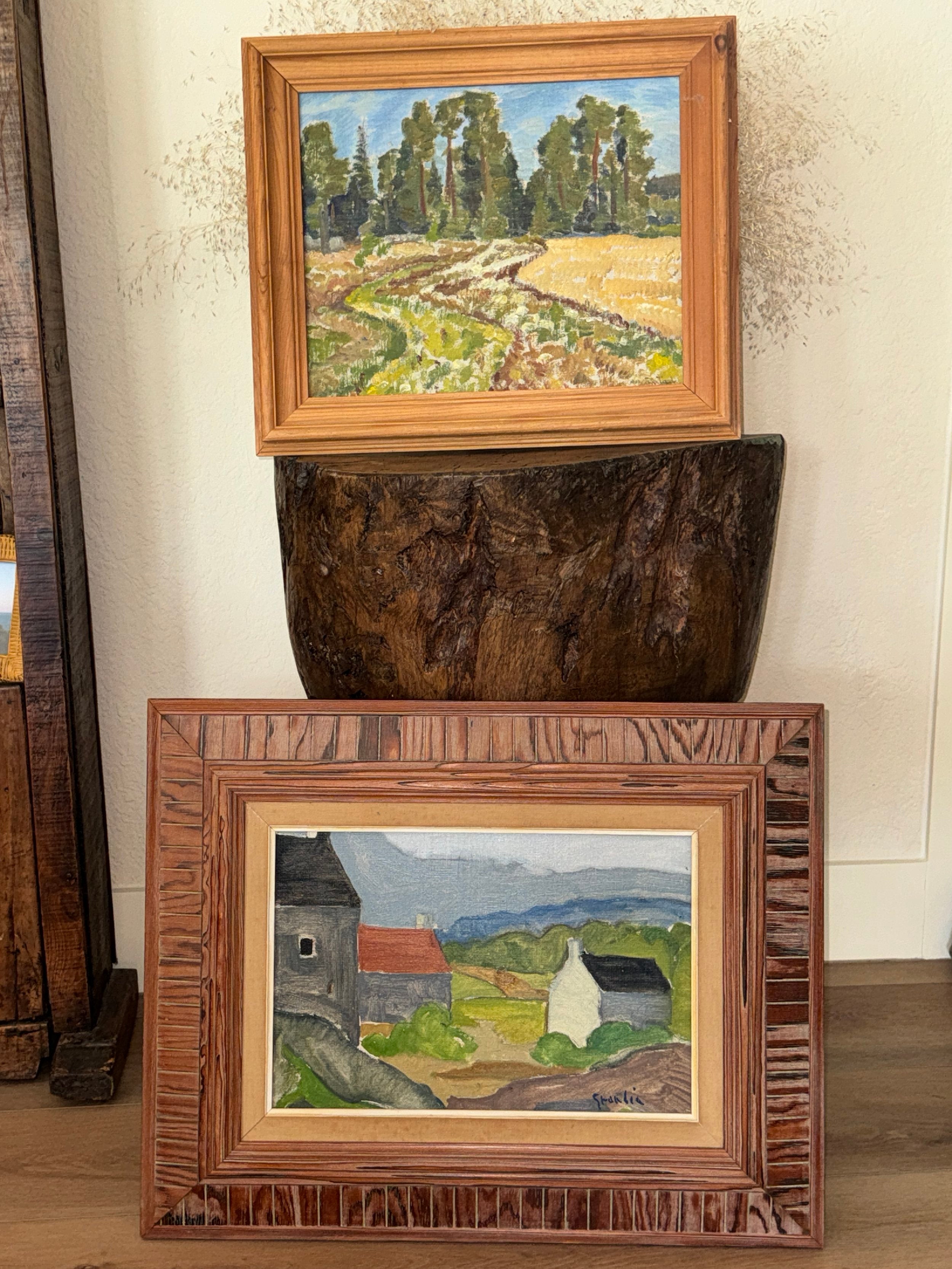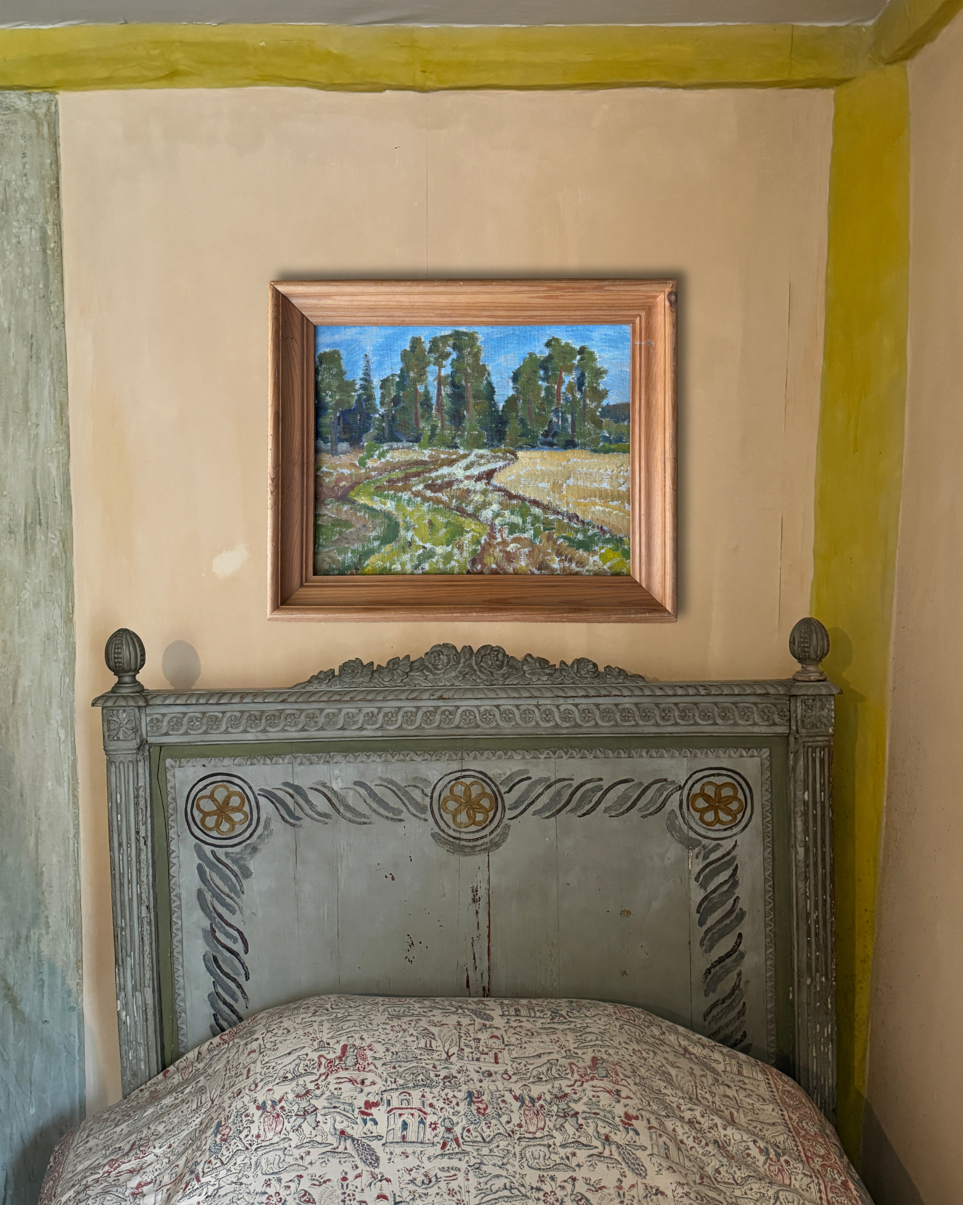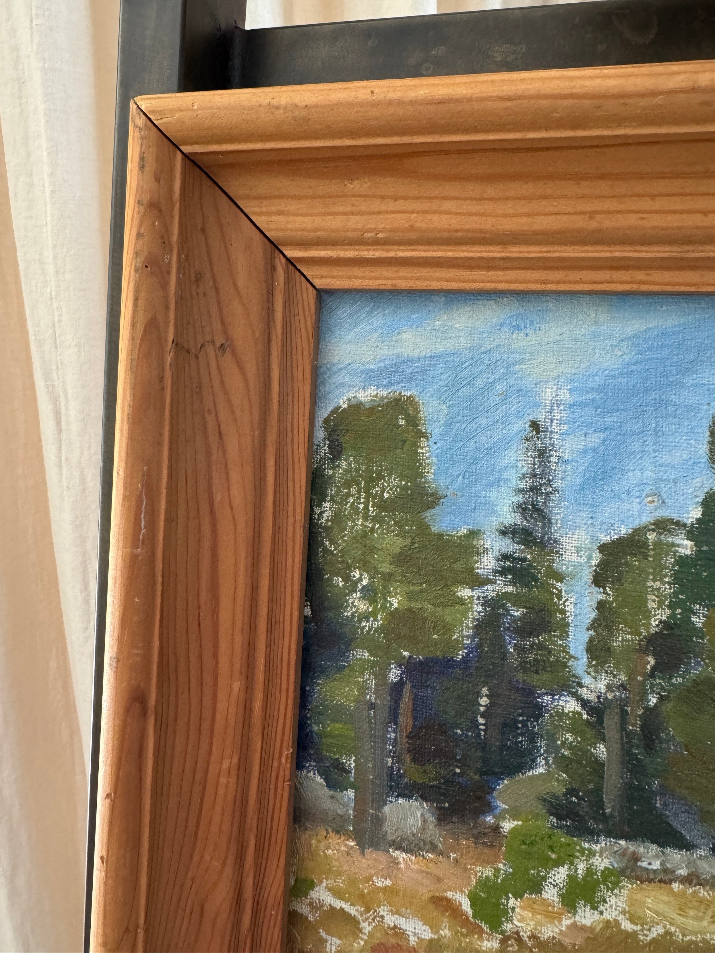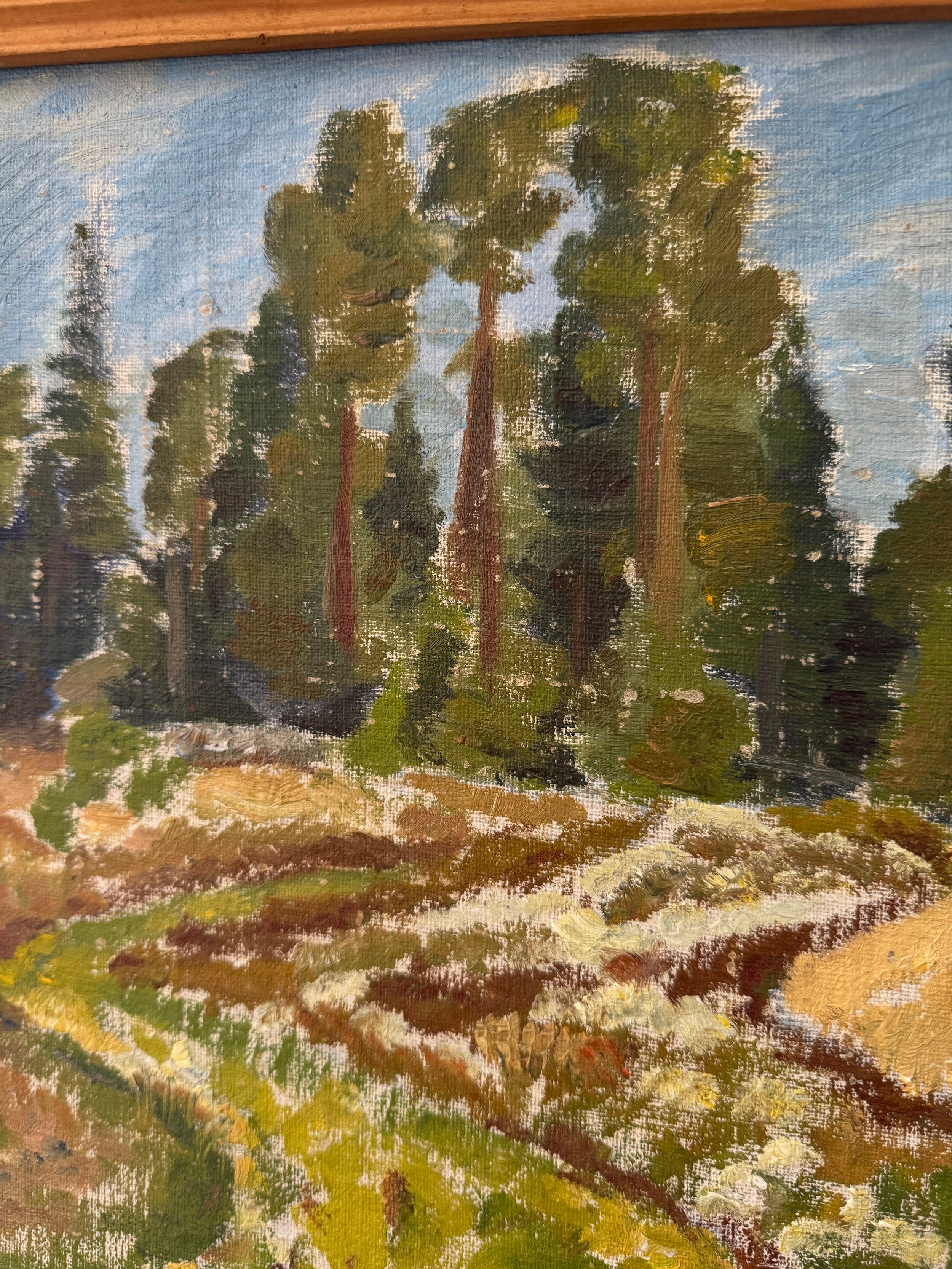 This charming Swedish midcentury oil on canvas captures the tranquil beauty of a countryside path winding through golden fields, framed by towering evergreens beneath a serene blue sky. The loose, textured brushwork and sunlit palette evoke a sense of nostalgia, transporting the viewer to a peaceful summer day. Its natural simplicity pairs beautifully with its clean-lined wooden original frame, which instantly adds a grounding tension to any room. The painting radiates warmth and authenticity, bringing nature inside.