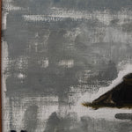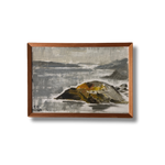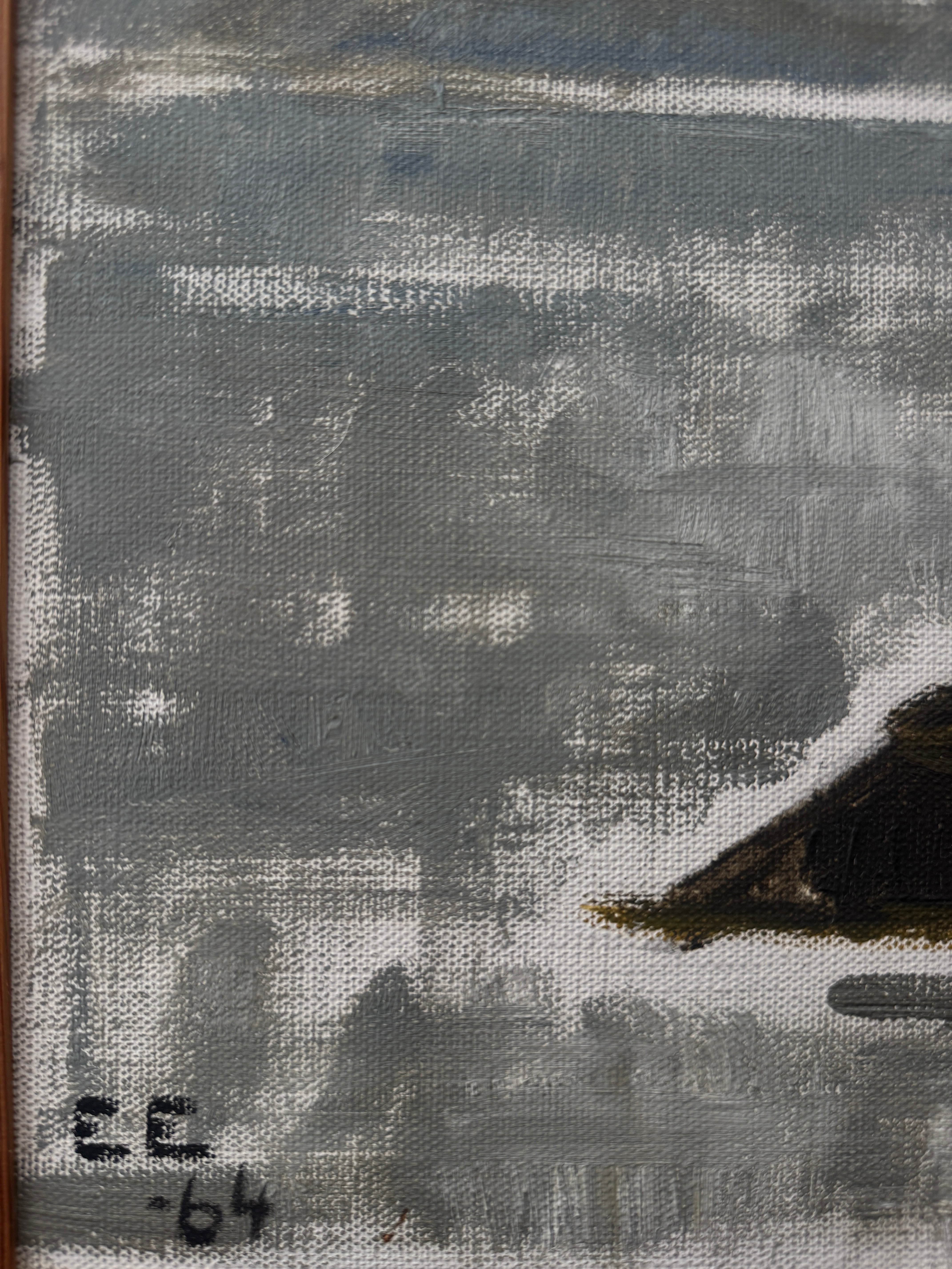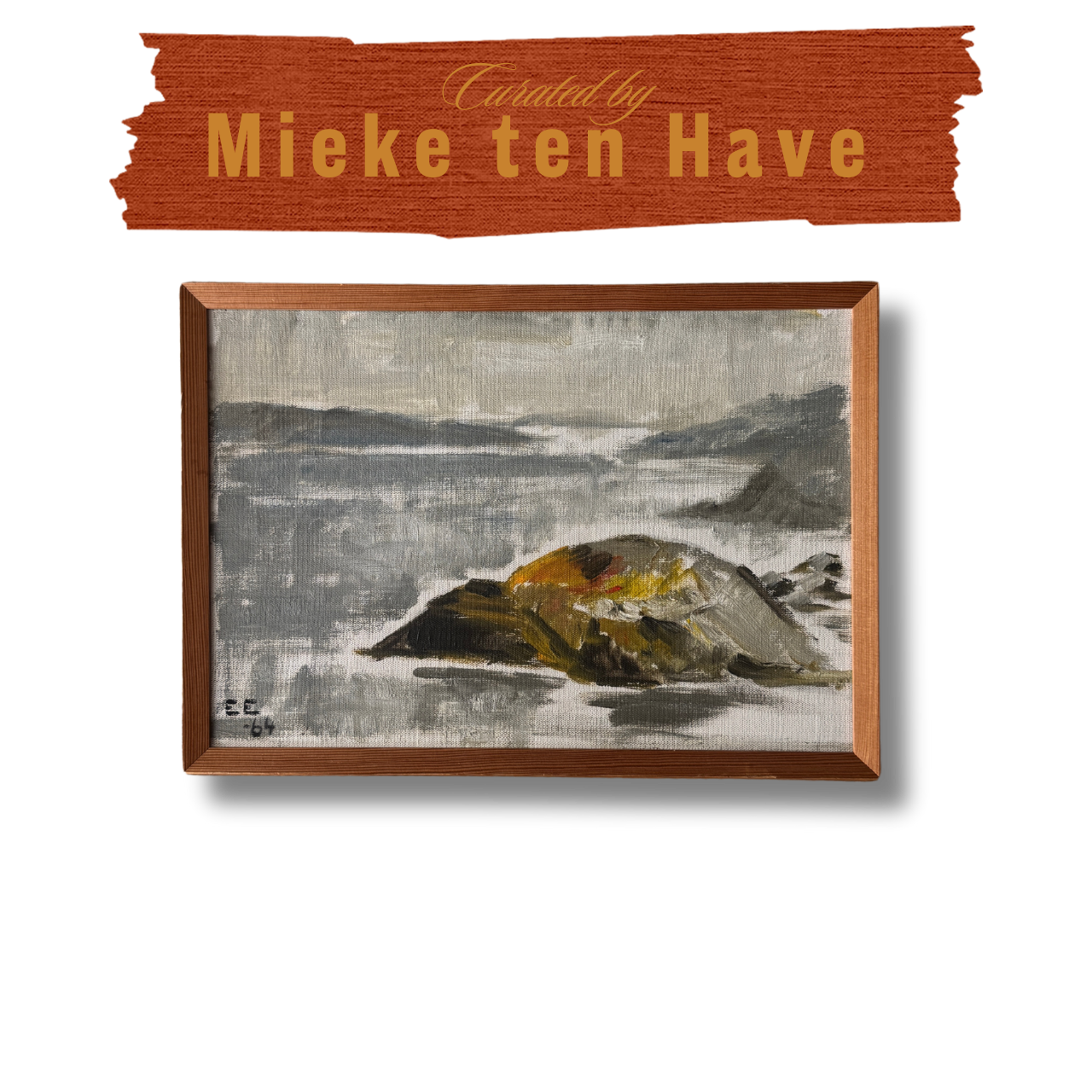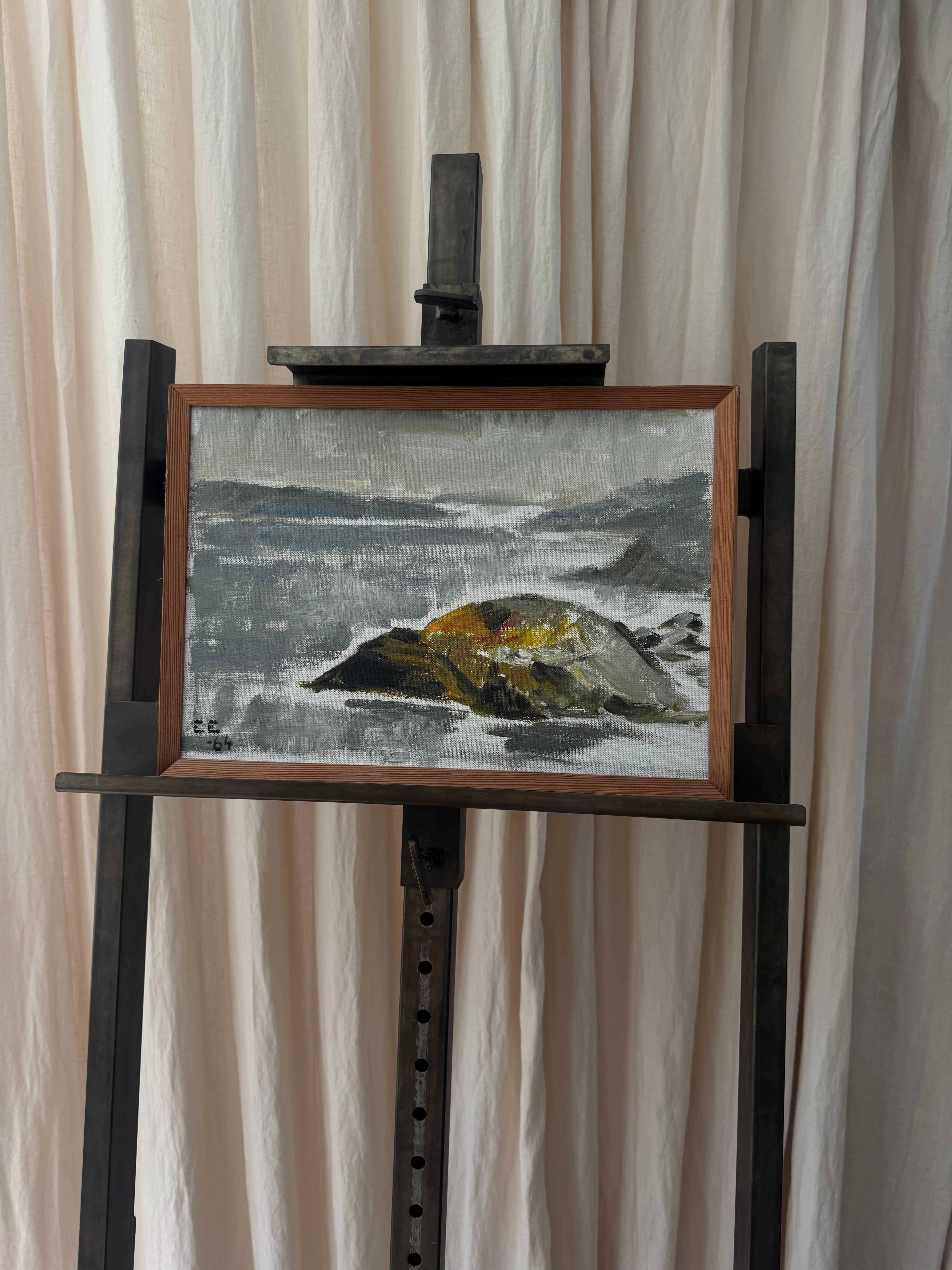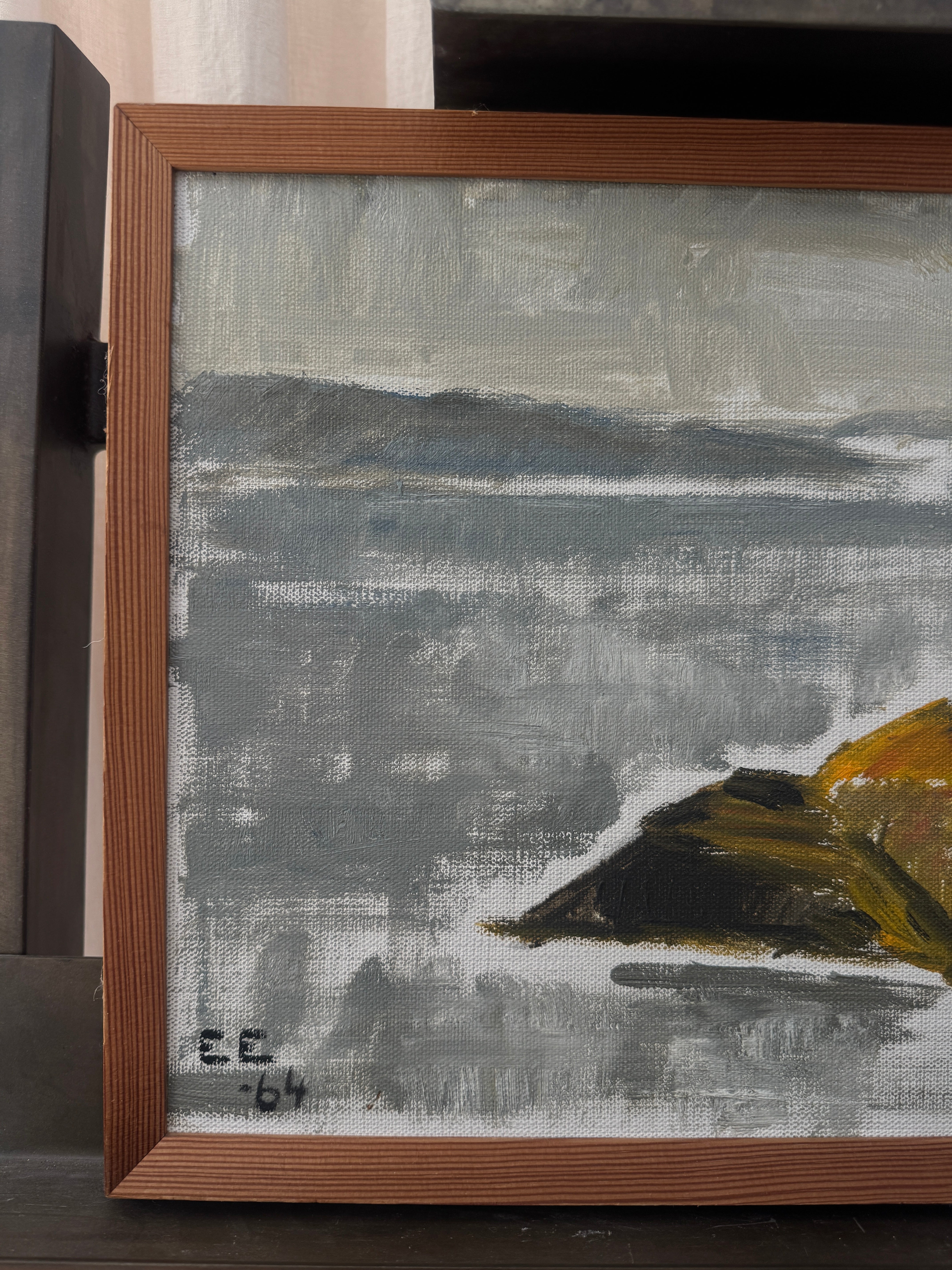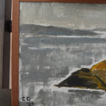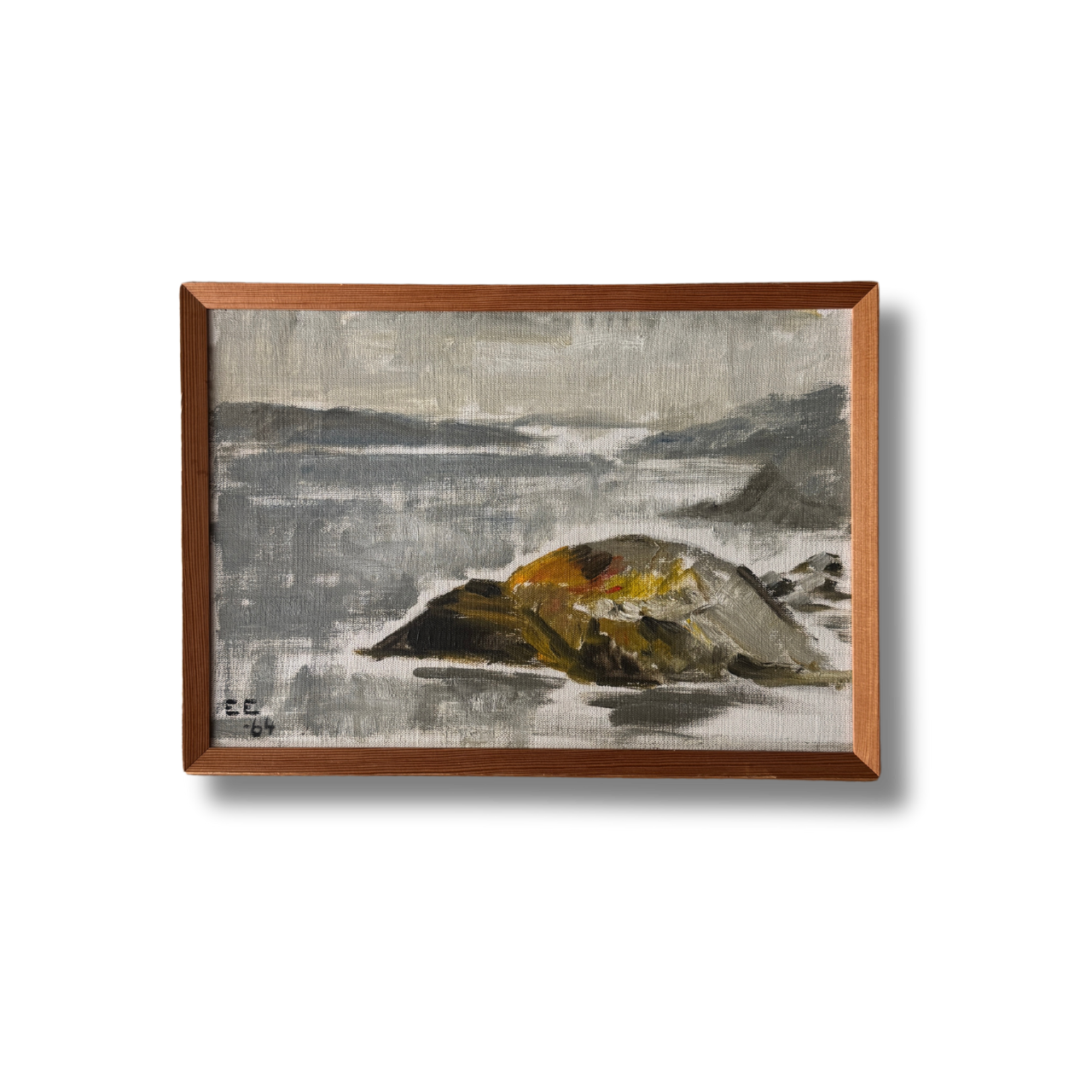 This quiet and unassuming midcentury Swedish oil from 1964 distills the landscape down to its most elemental mood...sea, stone, sky...rendered with restraint and confidence. A single rocky outcrop anchors the composition, its warm ochres and mossy greens pushing gently against a silvery-grey shoreline and misted horizon. The brushwork leans into the negative space with movement, allowing texture to do the emotional work: scraped paint suggests water in motion, while softened edges blur the boundary between land and air. There’s a sense of solitude here, almost meditative, as if the scene were painted from memory rather than observation.