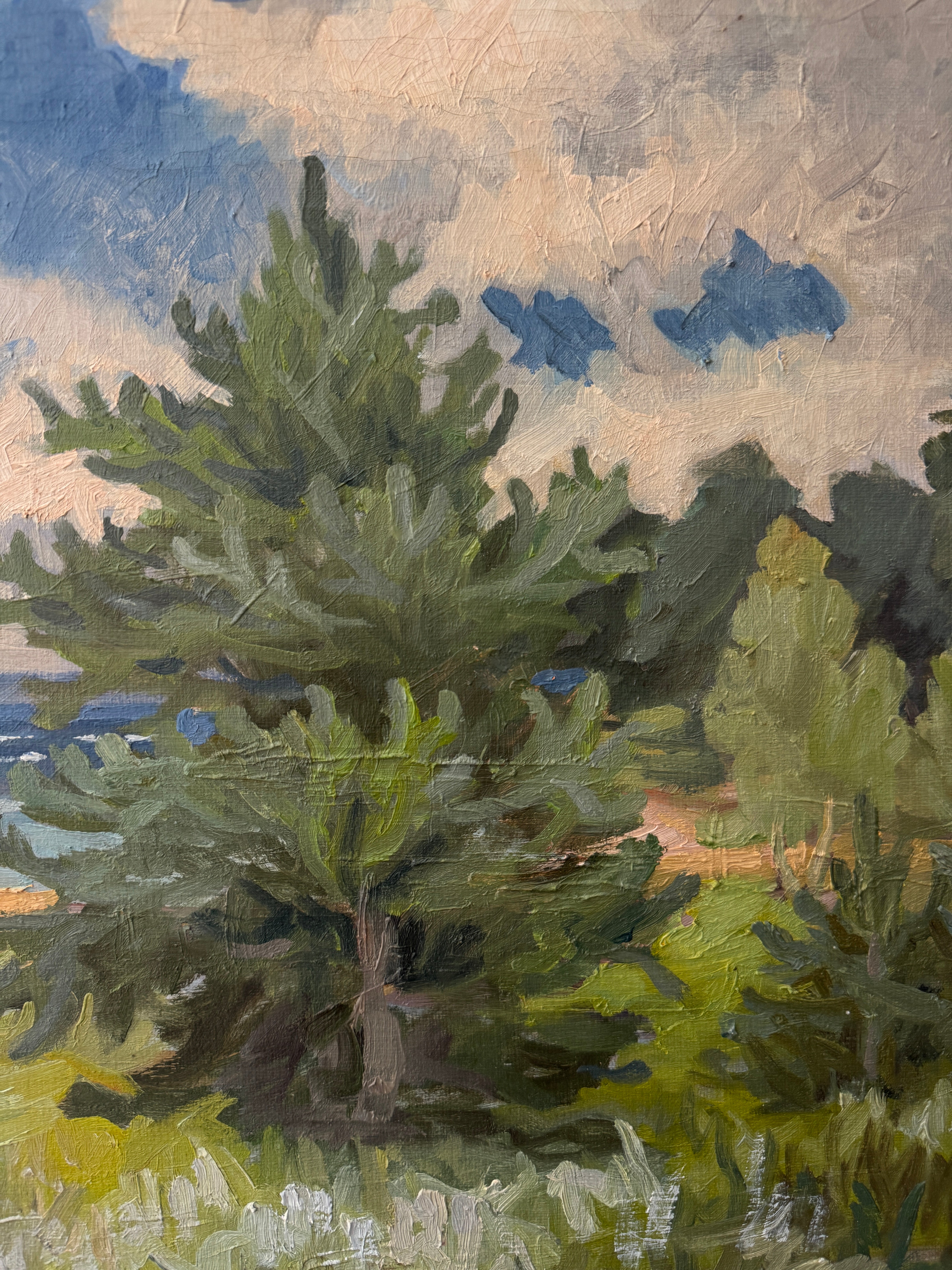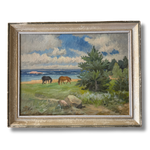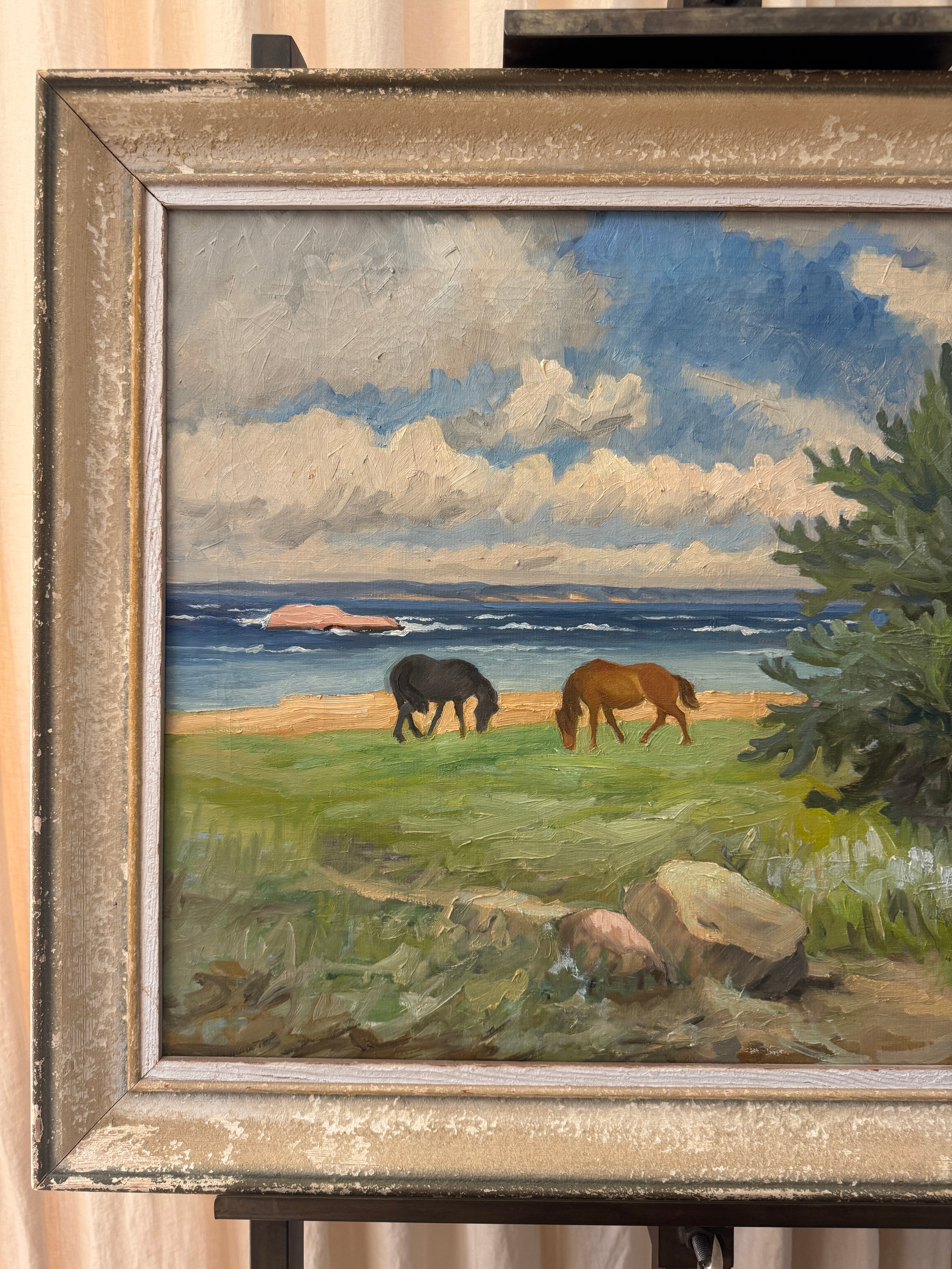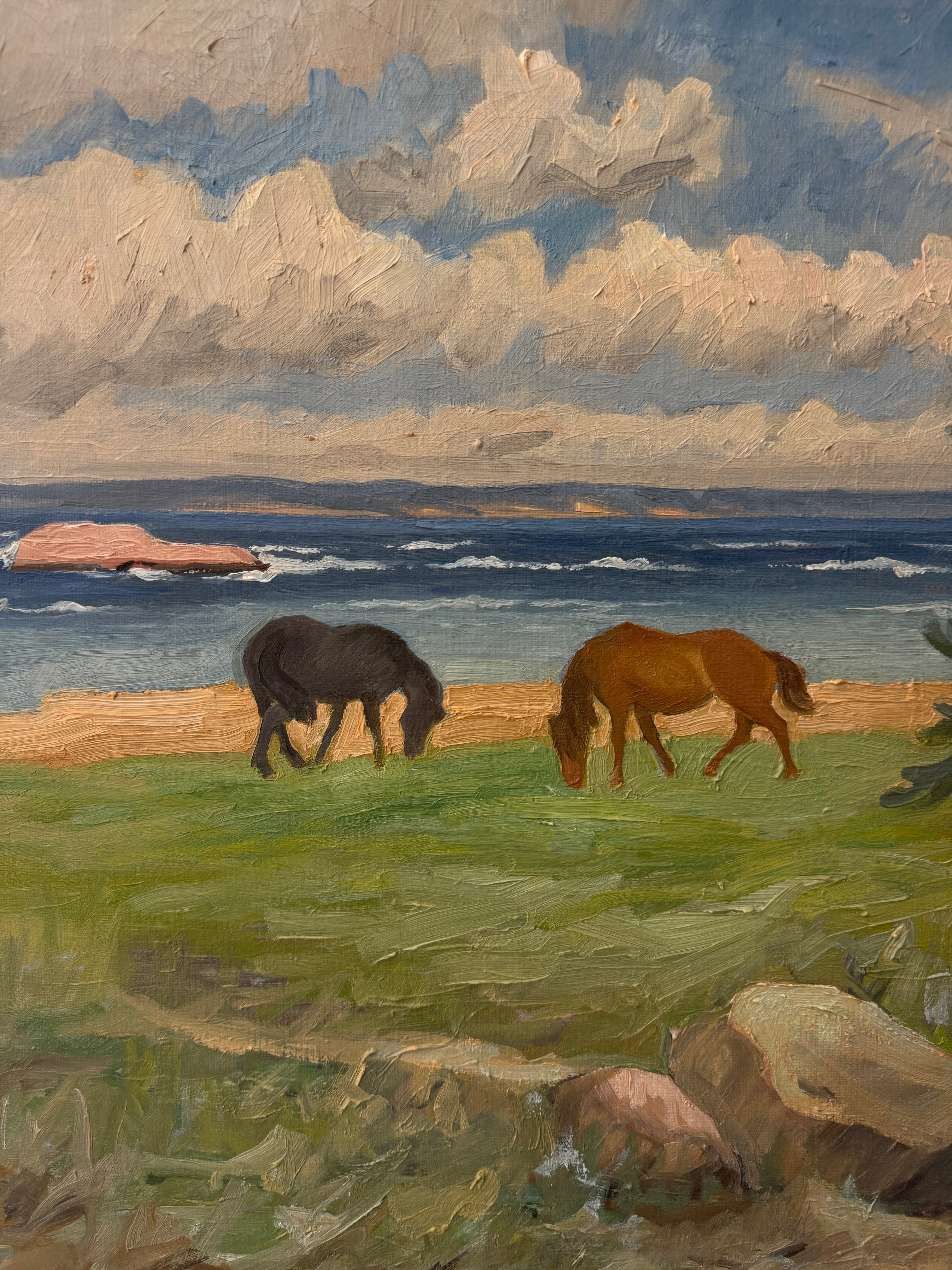 Two horses graze at the edge of the land, where the grass warms under the sun, the pines lean gently toward the sea, and the sky churns with drama and softness in equal measure. This painting captures that rare feeling of standing somewhere quiet and elemental, where the land opens and the horizon feels beautifully expansive. It’s a timeless, windswept dreamscape...alive with movement, light, and the calm certainty of nature doing what it’s always done.