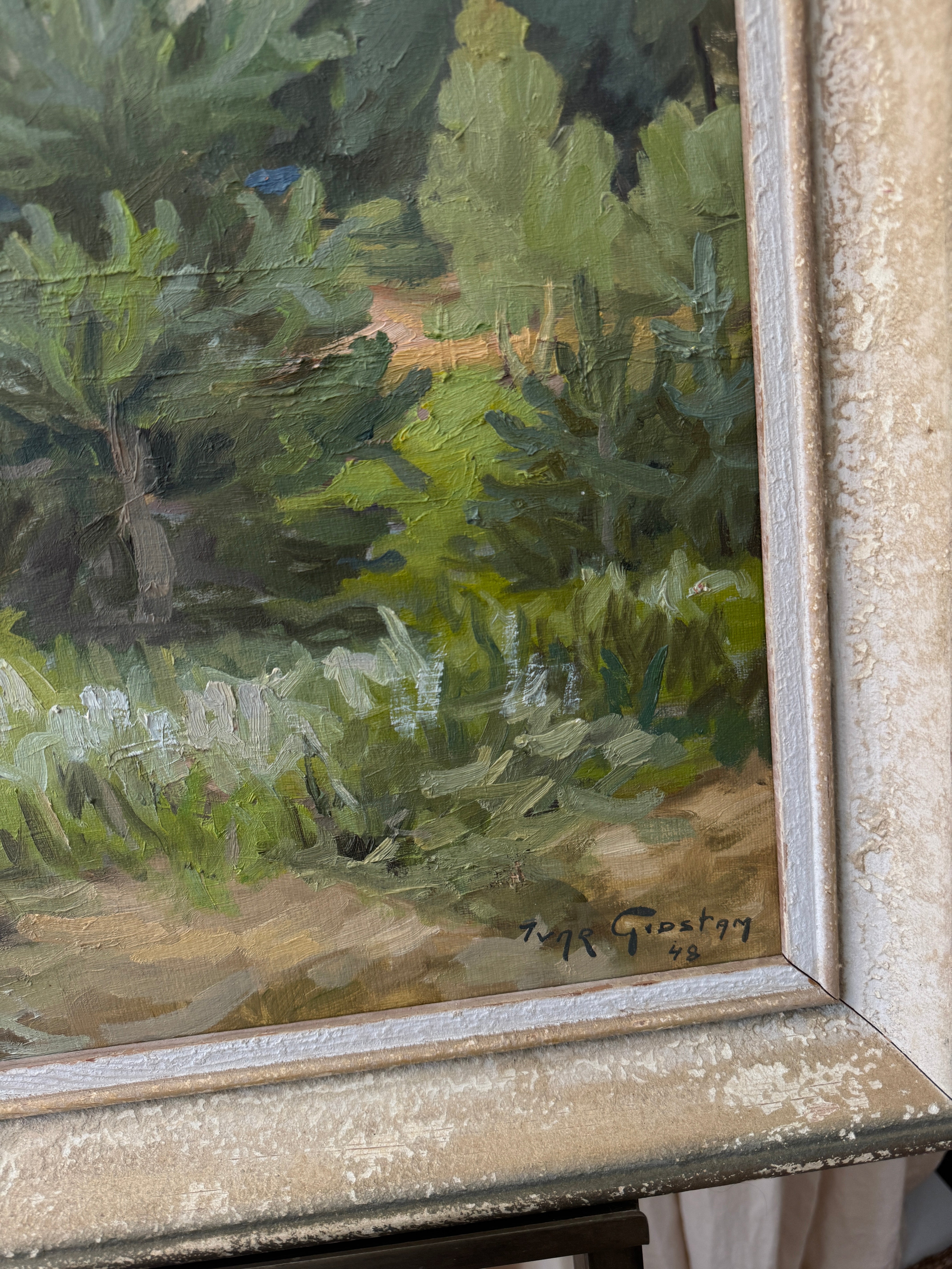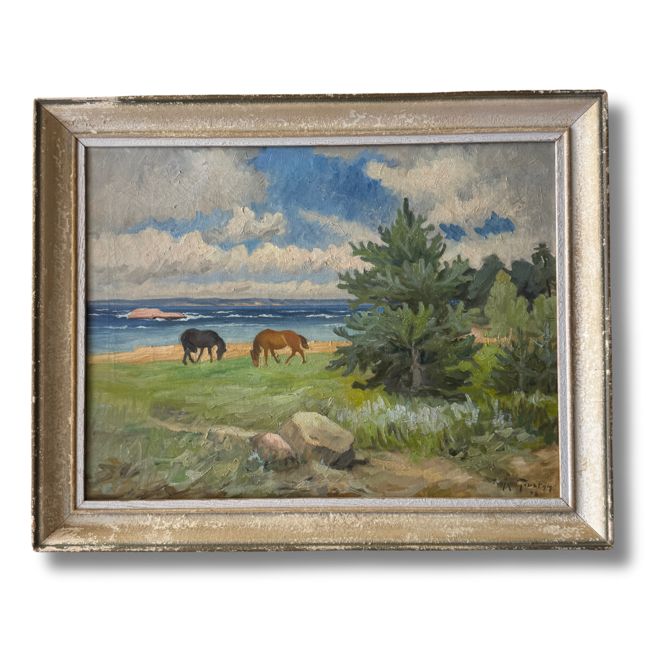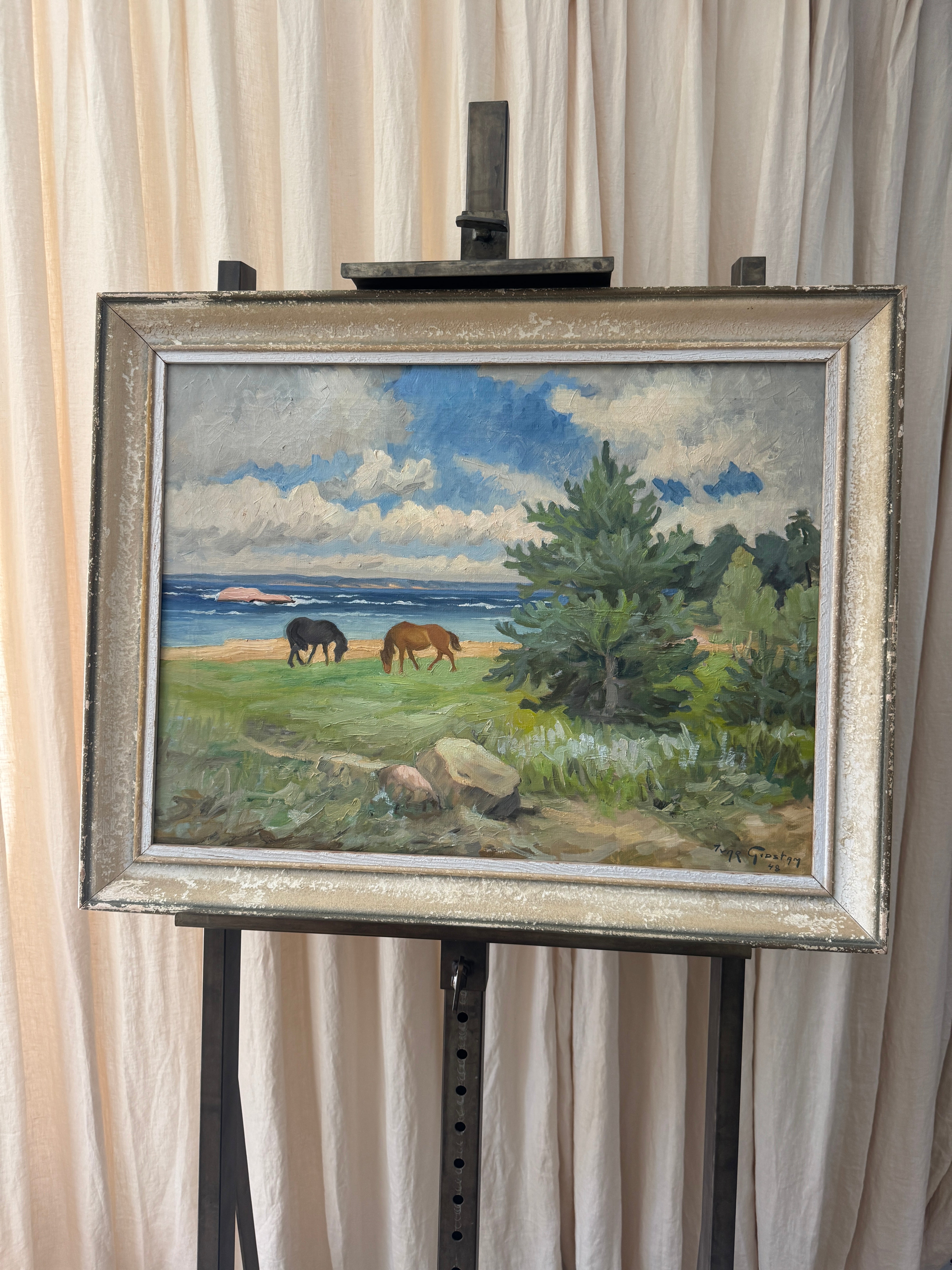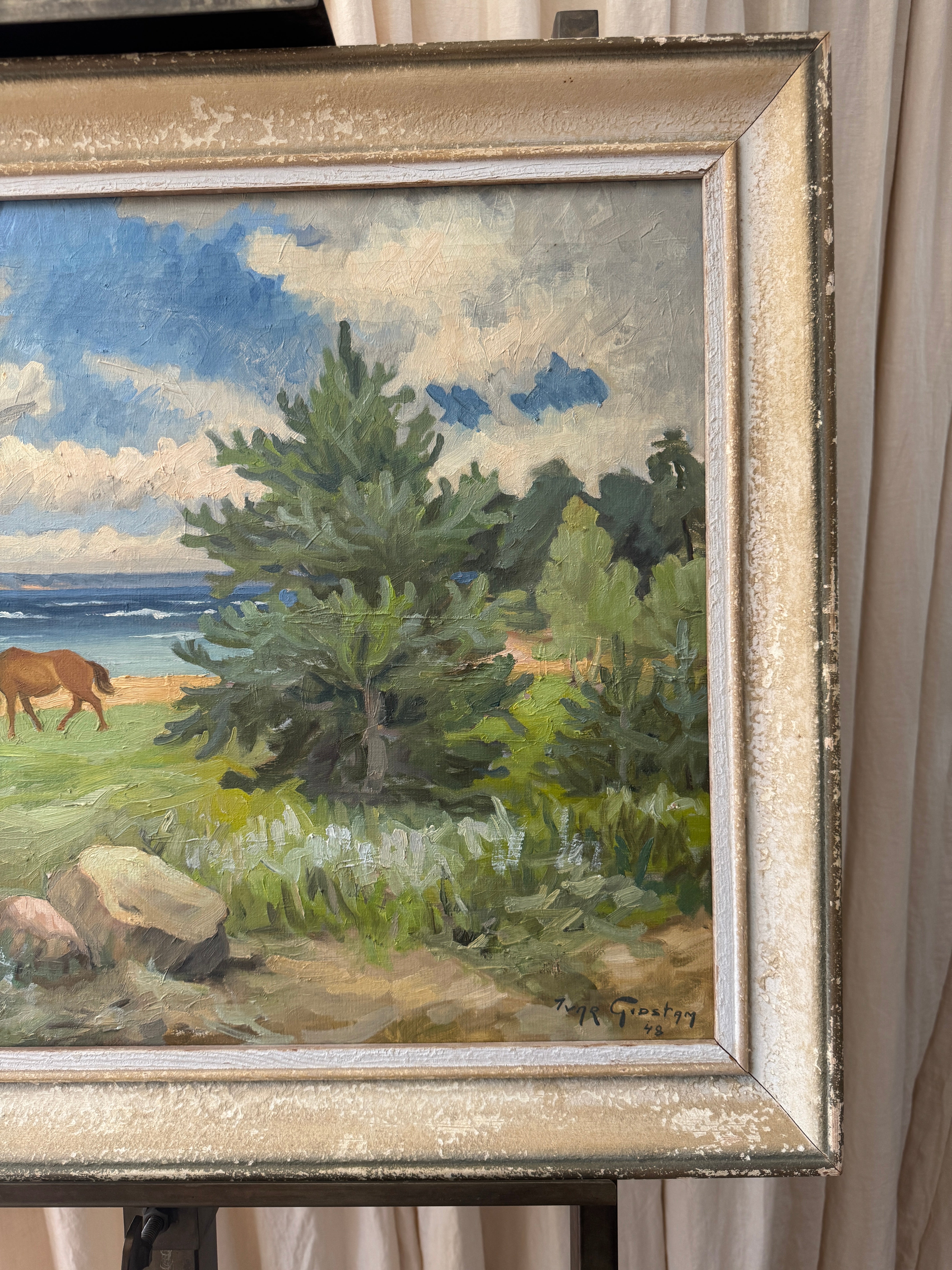 Two horses graze at the edge of the land, where the grass warms under the sun, the pines lean gently toward the sea, and the sky churns with drama and softness in equal measure. This painting captures that rare feeling of standing somewhere quiet and elemental, where the land opens and the horizon feels beautifully expansive. It’s a timeless, windswept dreamscape...alive with movement, light, and the calm certainty of nature doing what it’s always done.