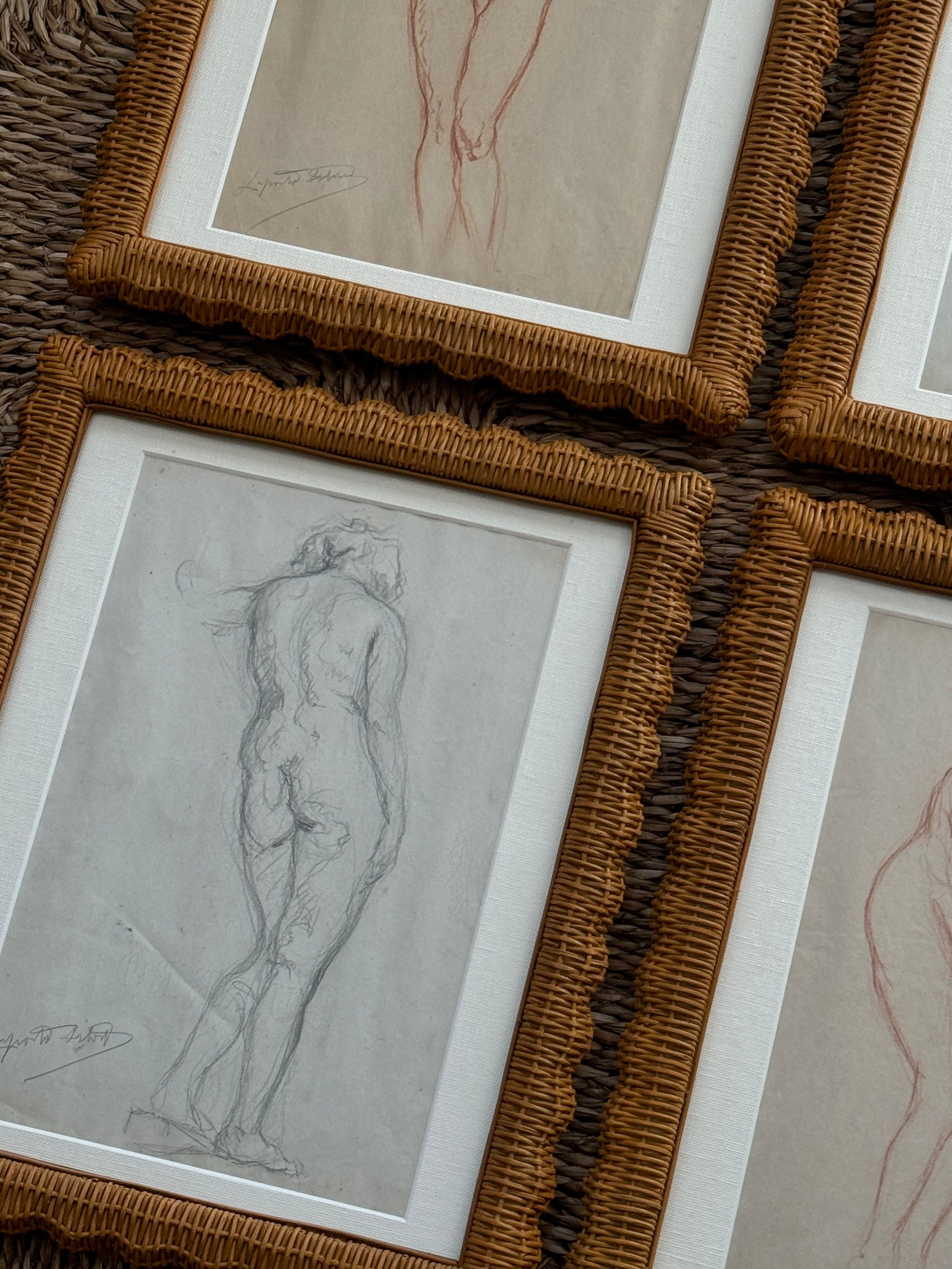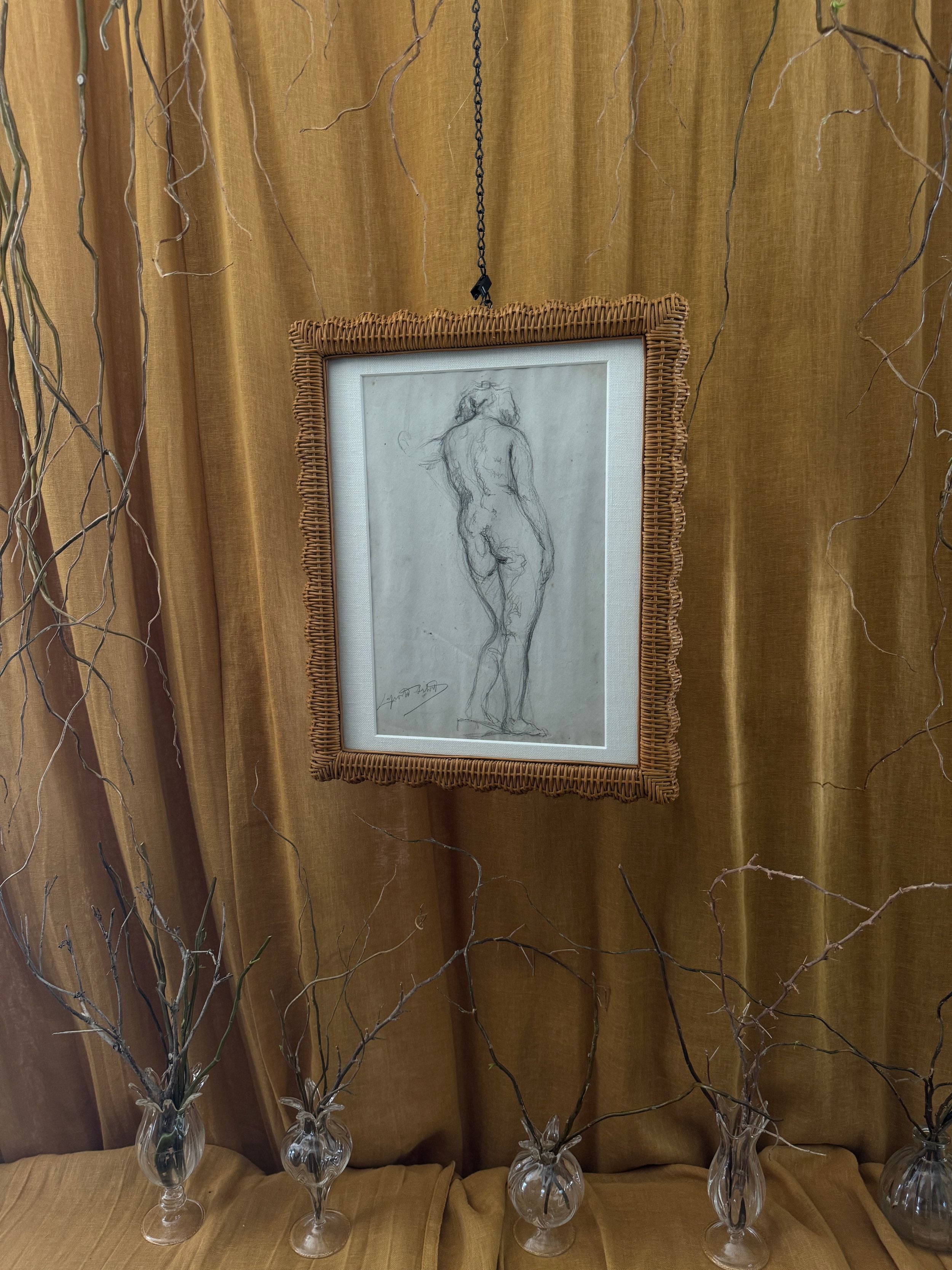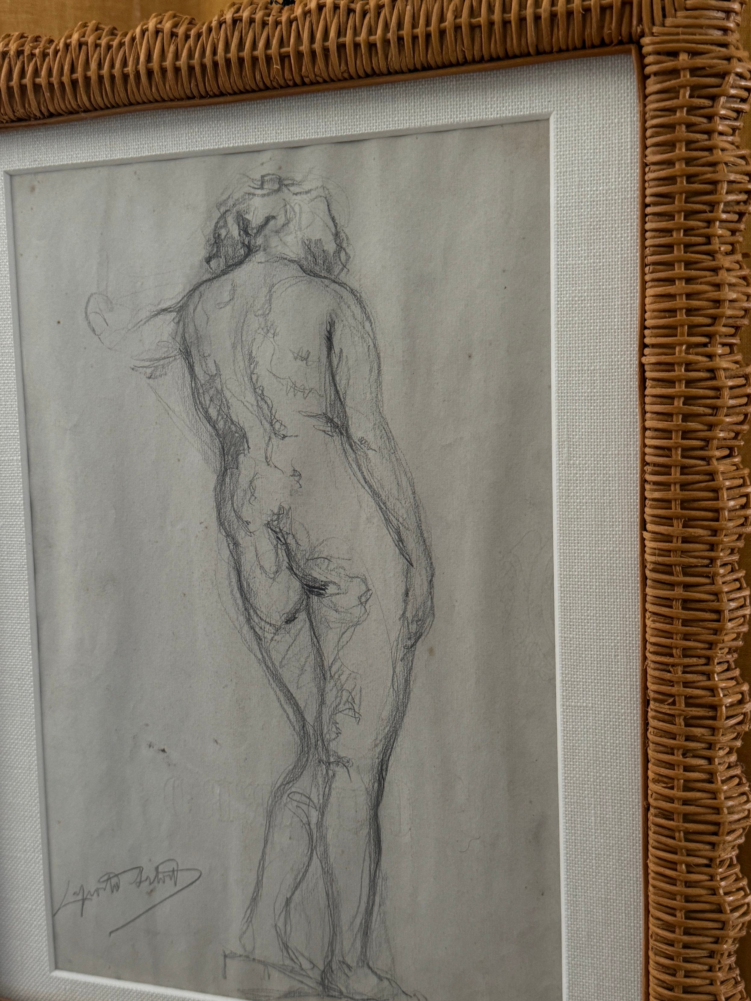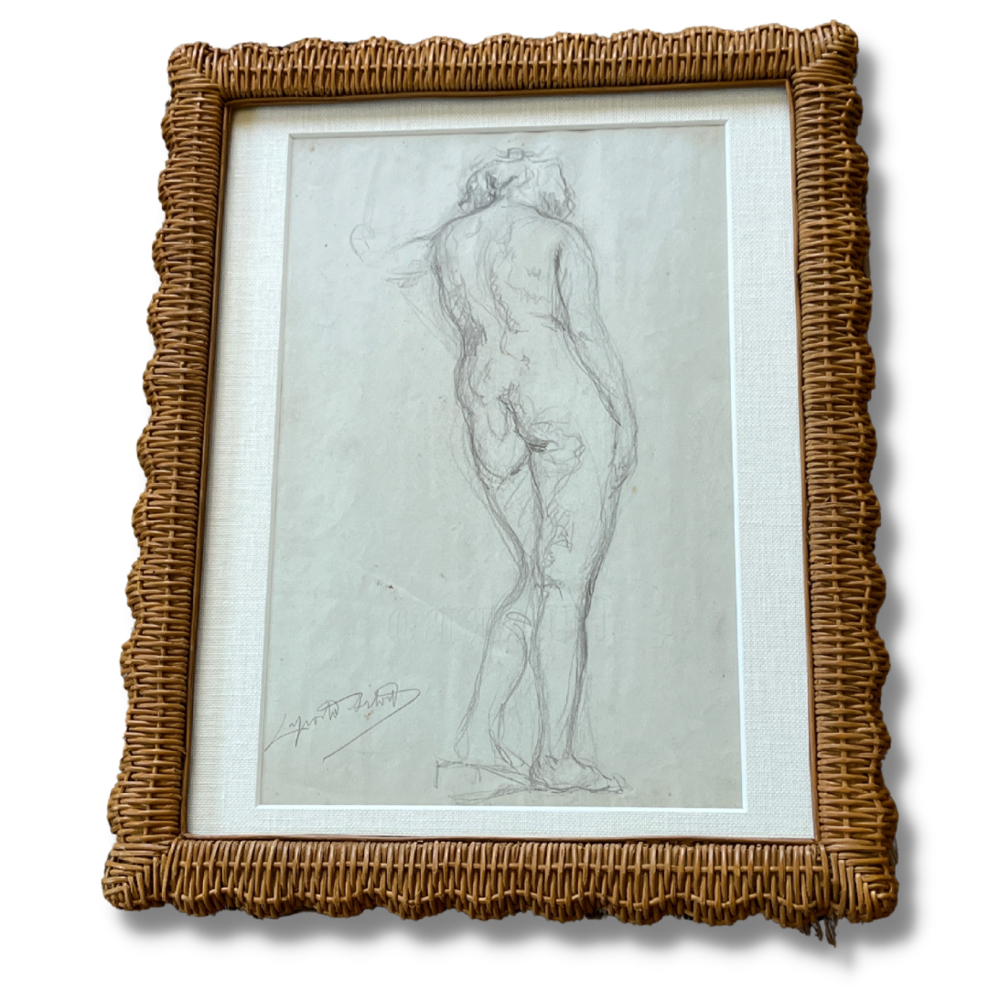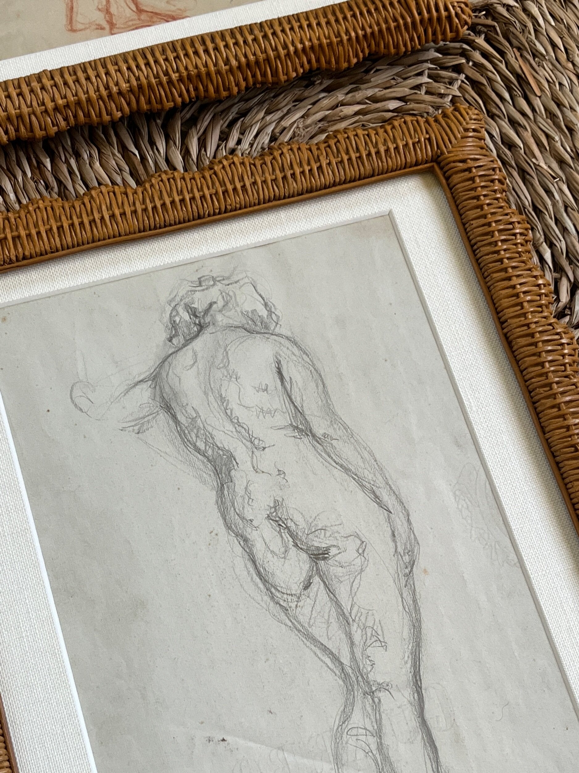 Surrounded by a rattan frame, this figure drawing from 1910 features a graceful nude depicted from behind, rendered with expressive and delicate lines in pencil. The artist captures the gentle curve of the spine and the natural contours of the back, hips, and legs. The slightly turned head suggests a moment of introspection or subtle movement, adding a dynamic element to the pose. The use of pencil or charcoal allows for soft shading that enhances the sense of depth and form.