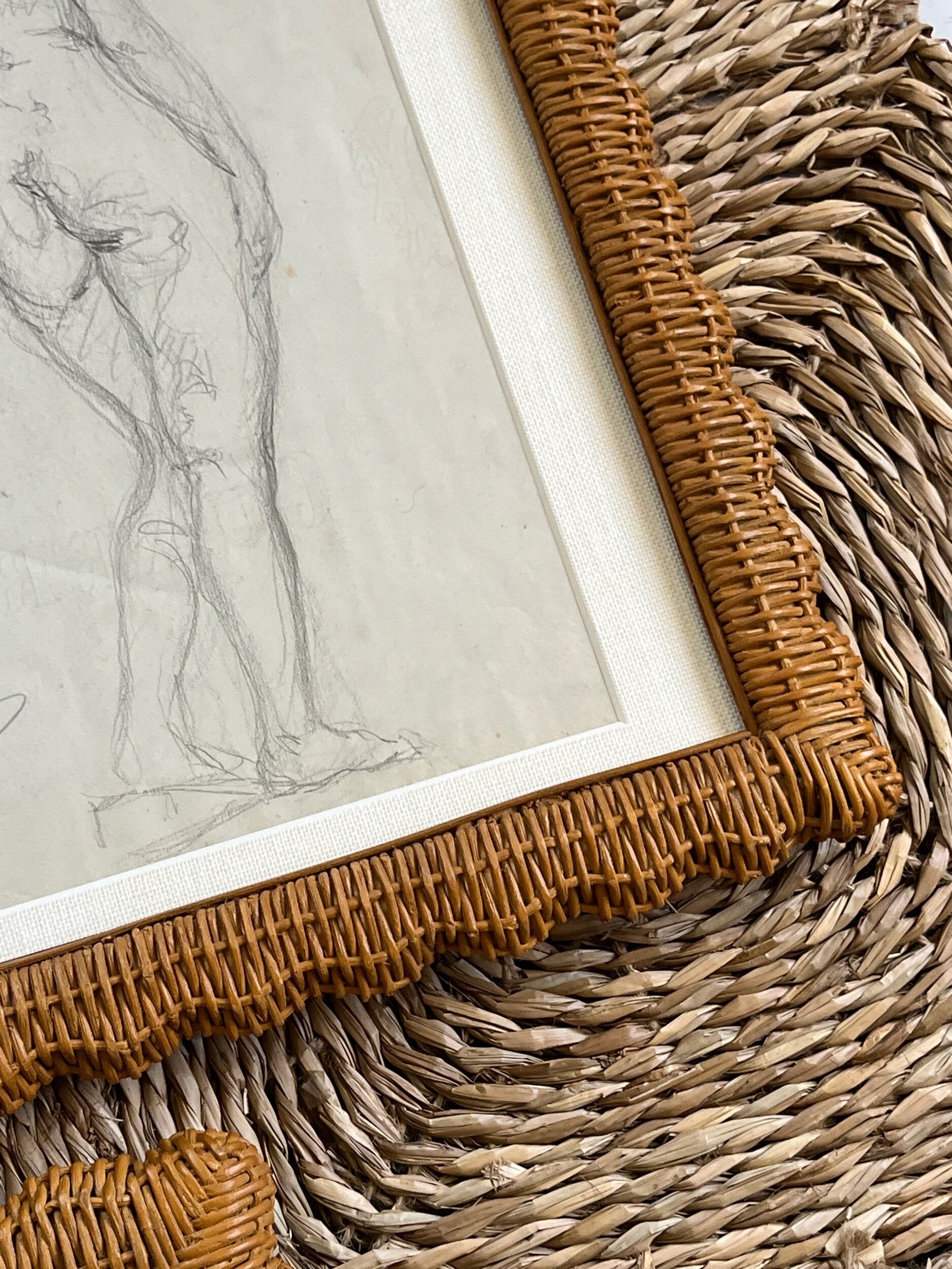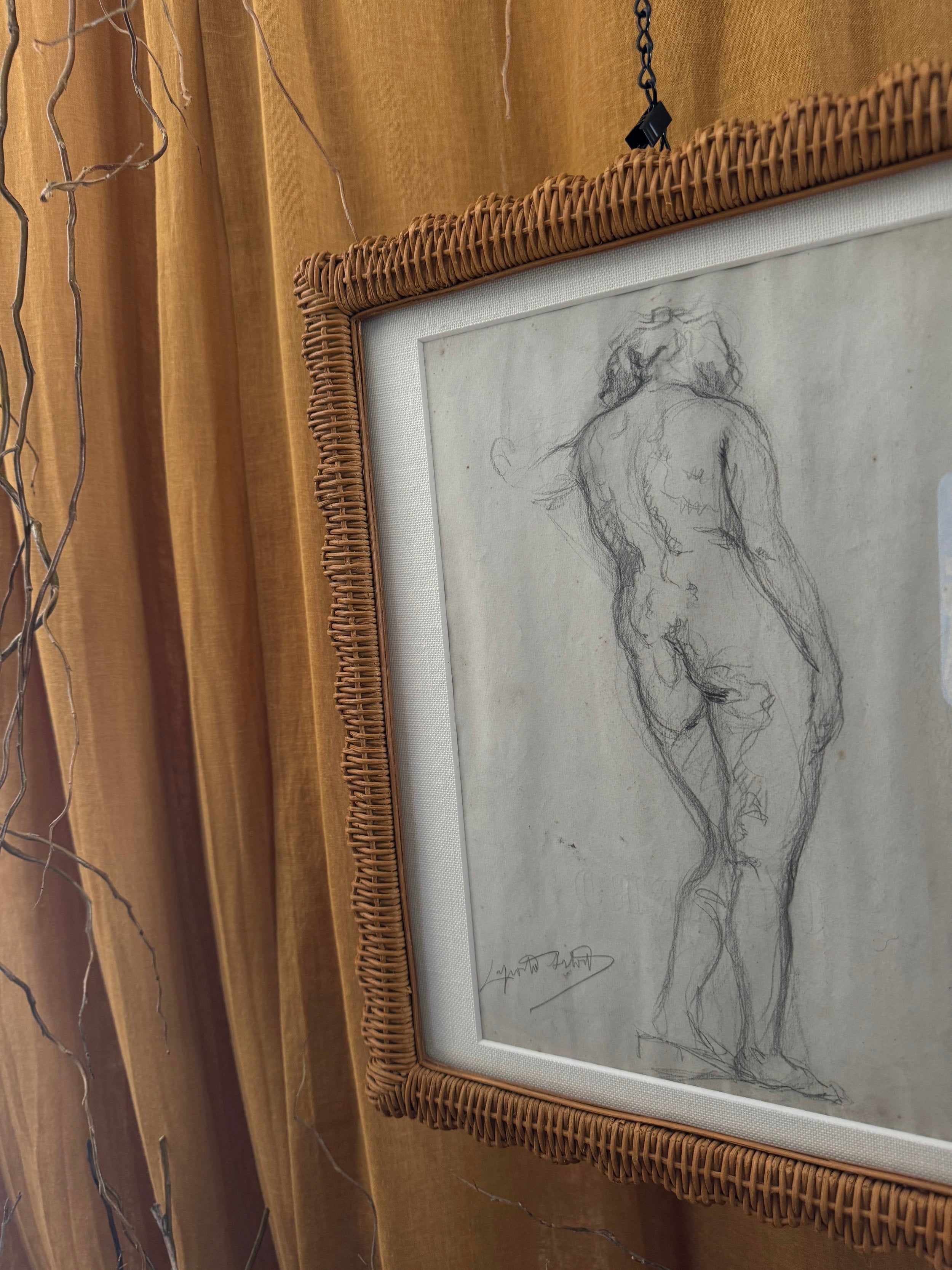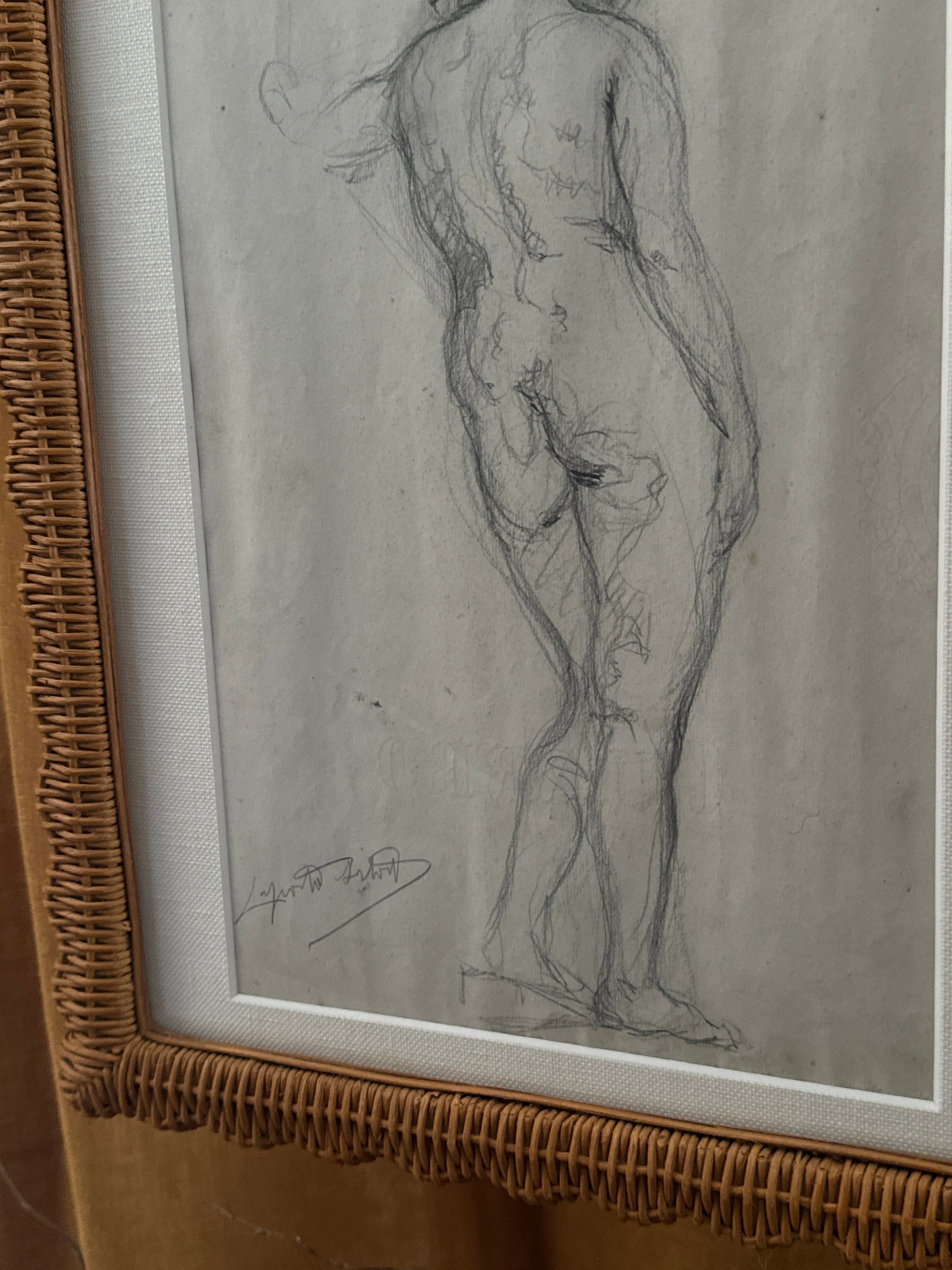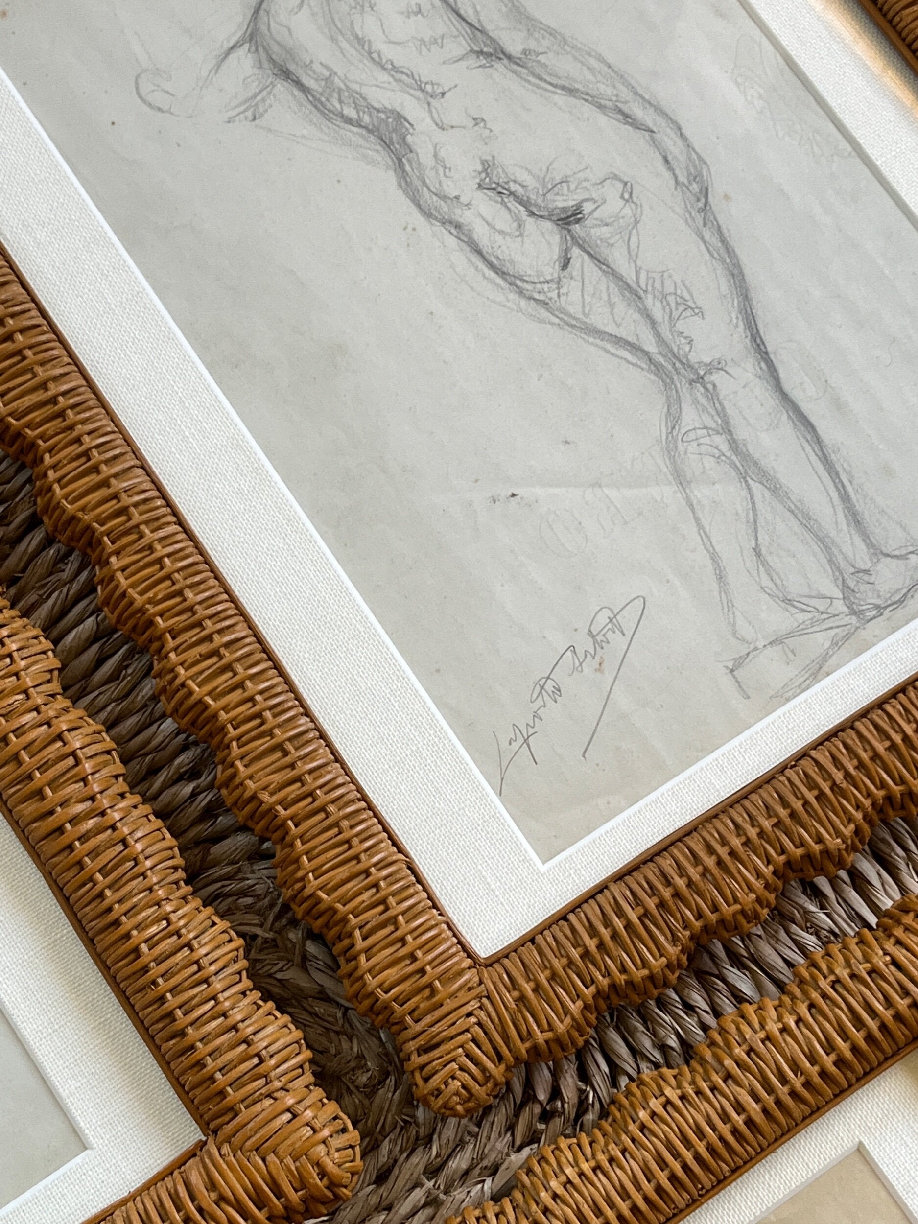 Surrounded by a rattan frame, this figure drawing from 1910 features a graceful nude depicted from behind, rendered with expressive and delicate lines in pencil. The artist captures the gentle curve of the spine and the natural contours of the back, hips, and legs. The slightly turned head suggests a moment of introspection or subtle movement, adding a dynamic element to the pose. The use of pencil or charcoal allows for soft shading that enhances the sense of depth and form.